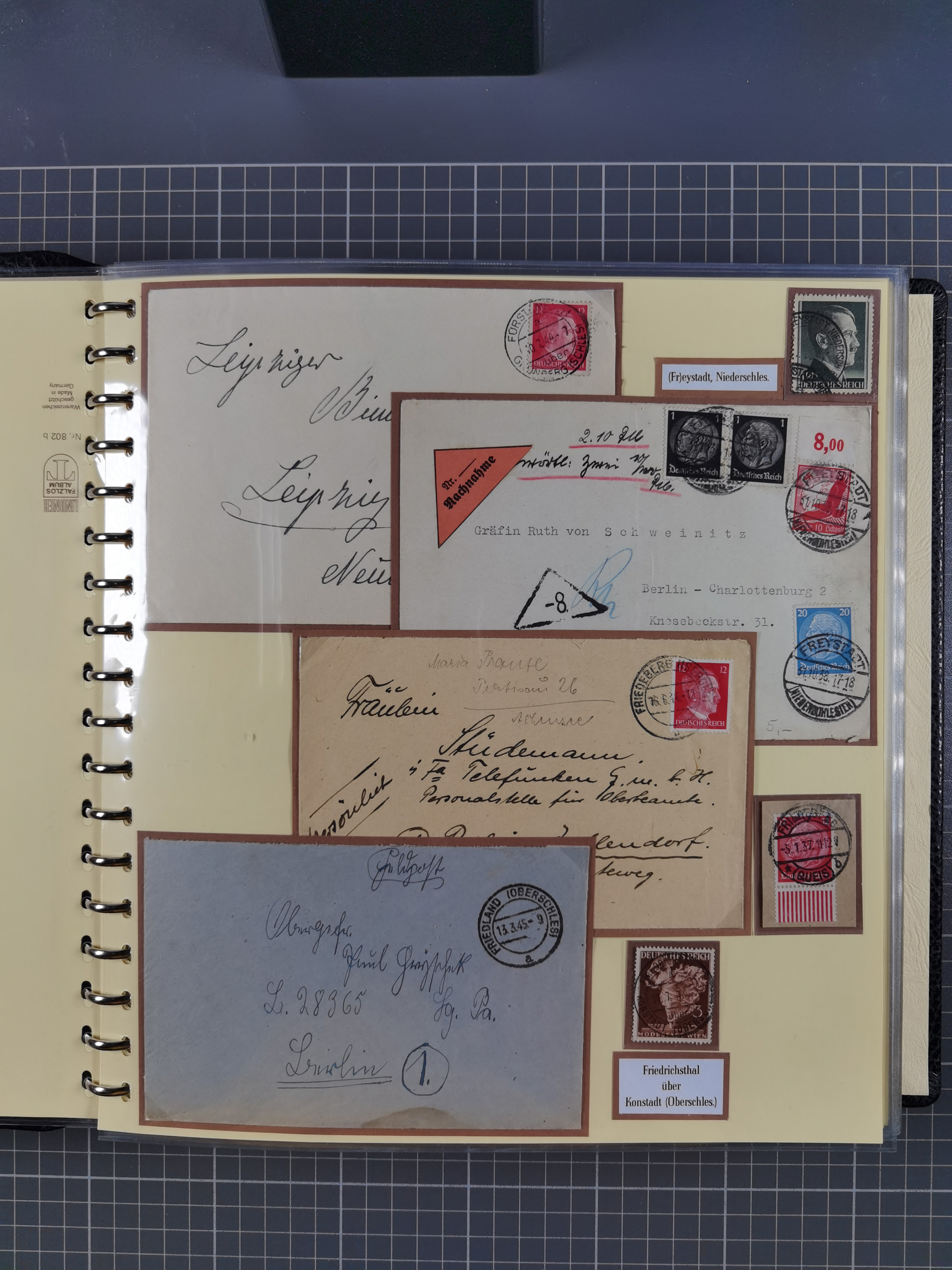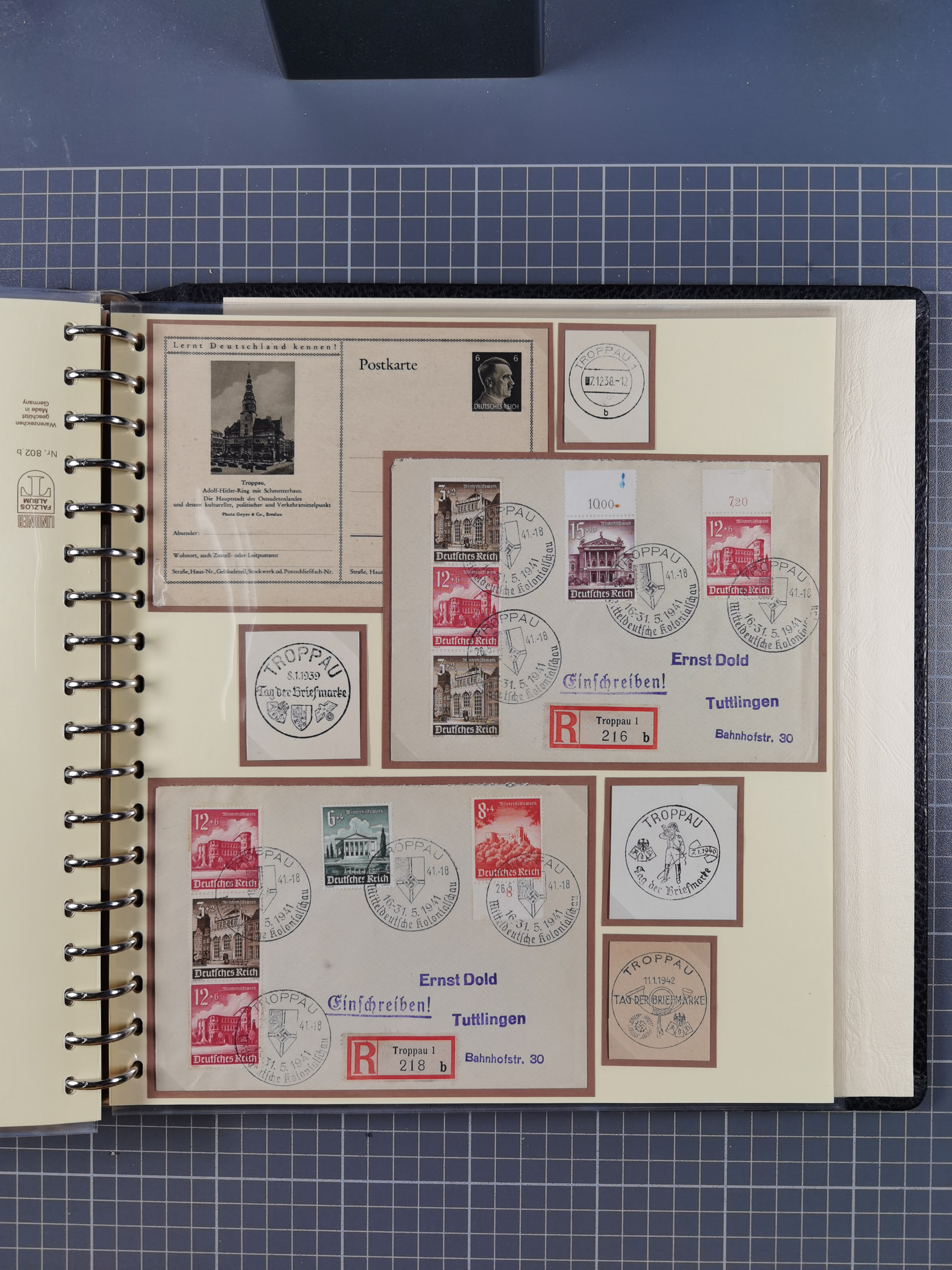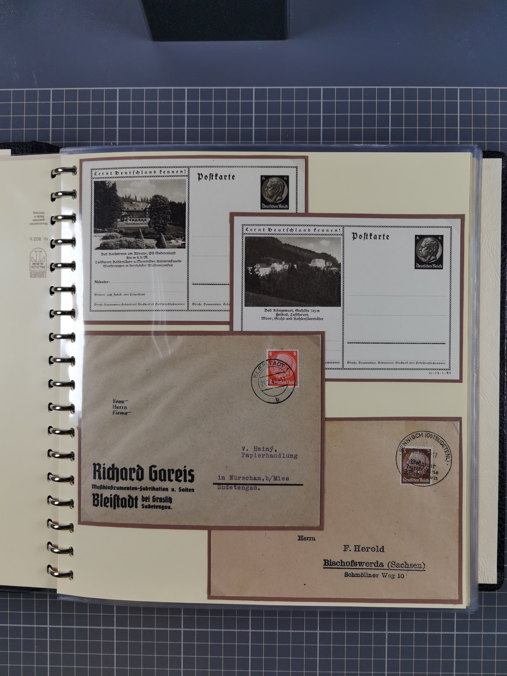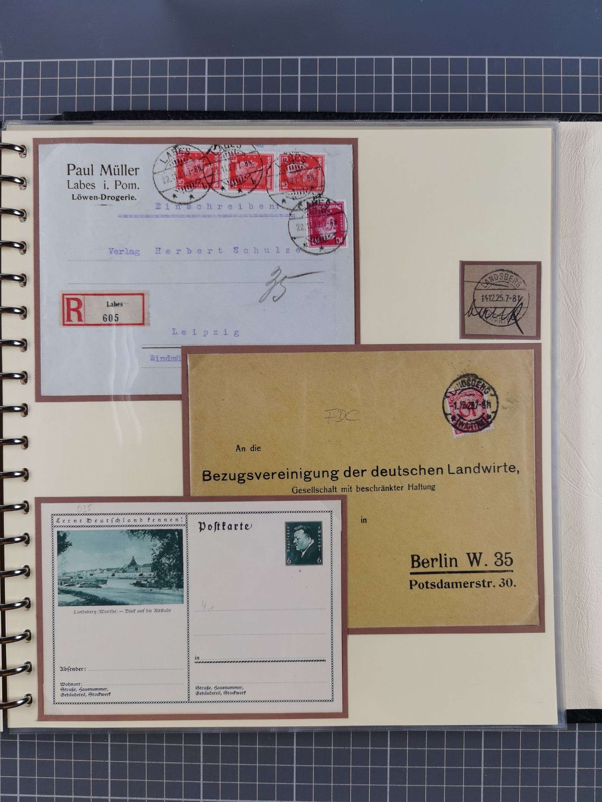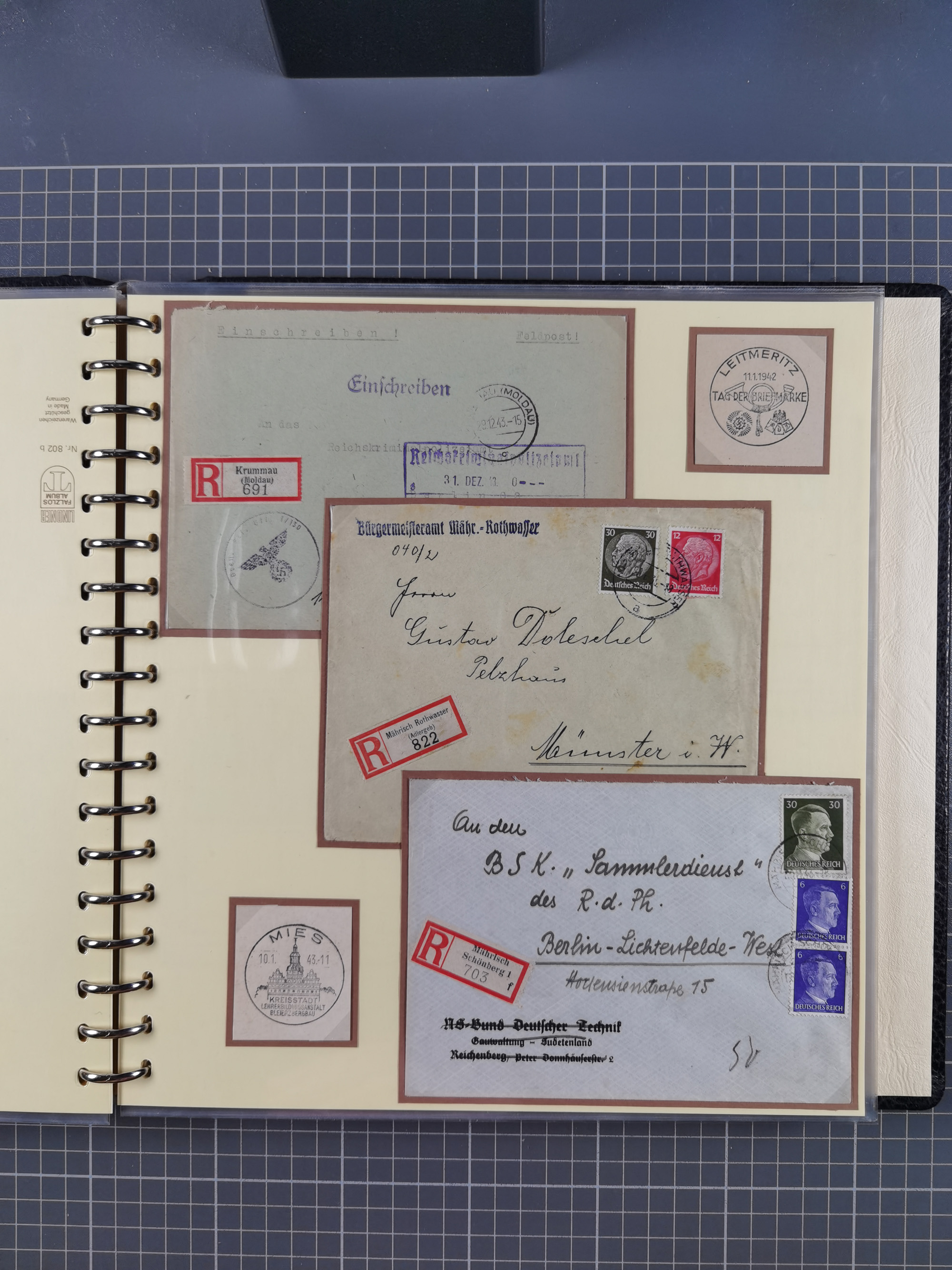 1865/1950 (ca.), Album mit 122 hochwertigen Belegen, diese einzeln vom Einlieferer beschrieben und nach Michel bewertet 15.000 €. Dazu ein Karton mit über 170 Briefen, Karten und Ganzsachen, dabei etliche interessante Belege, meist gute Erhaltung