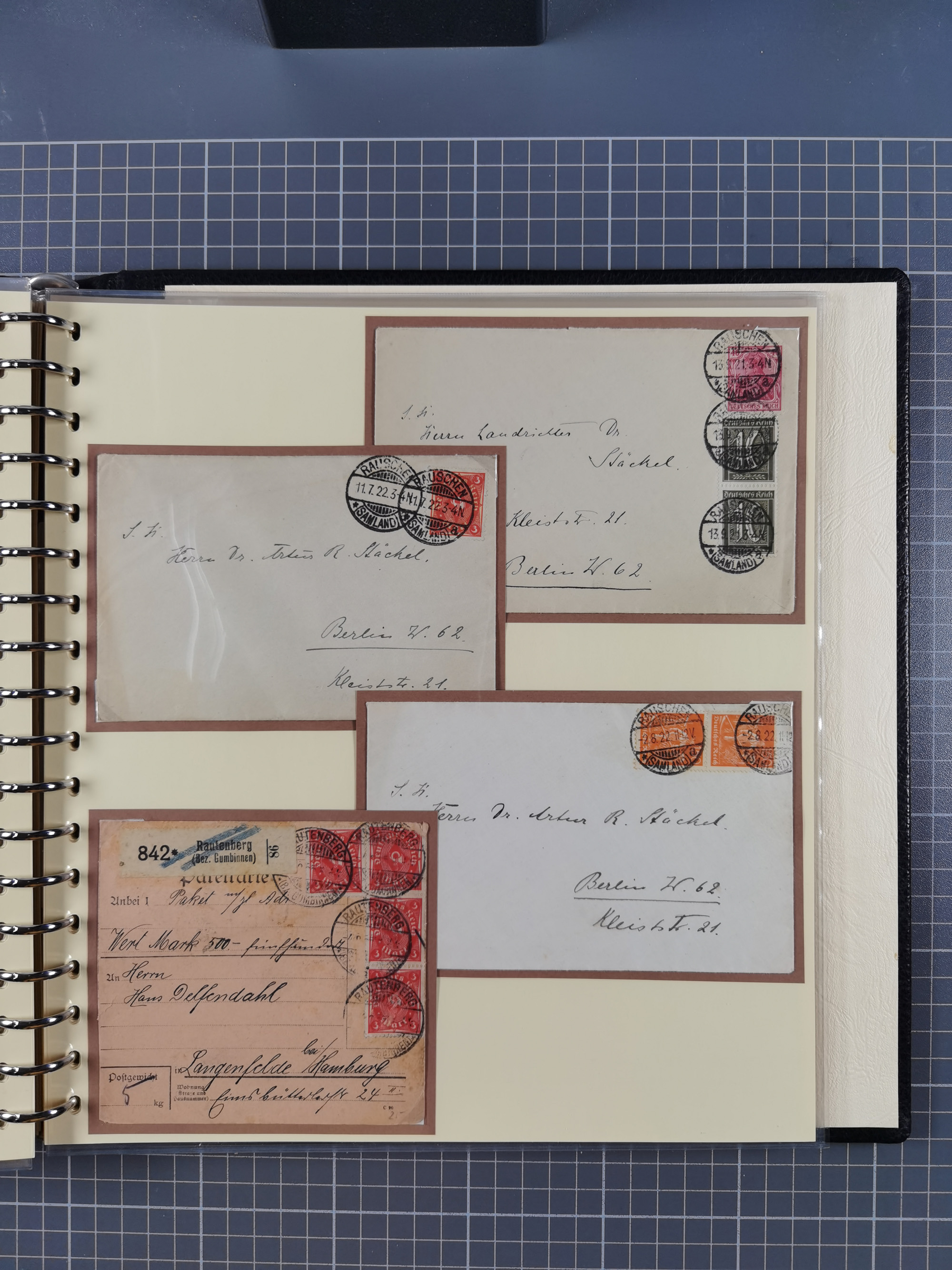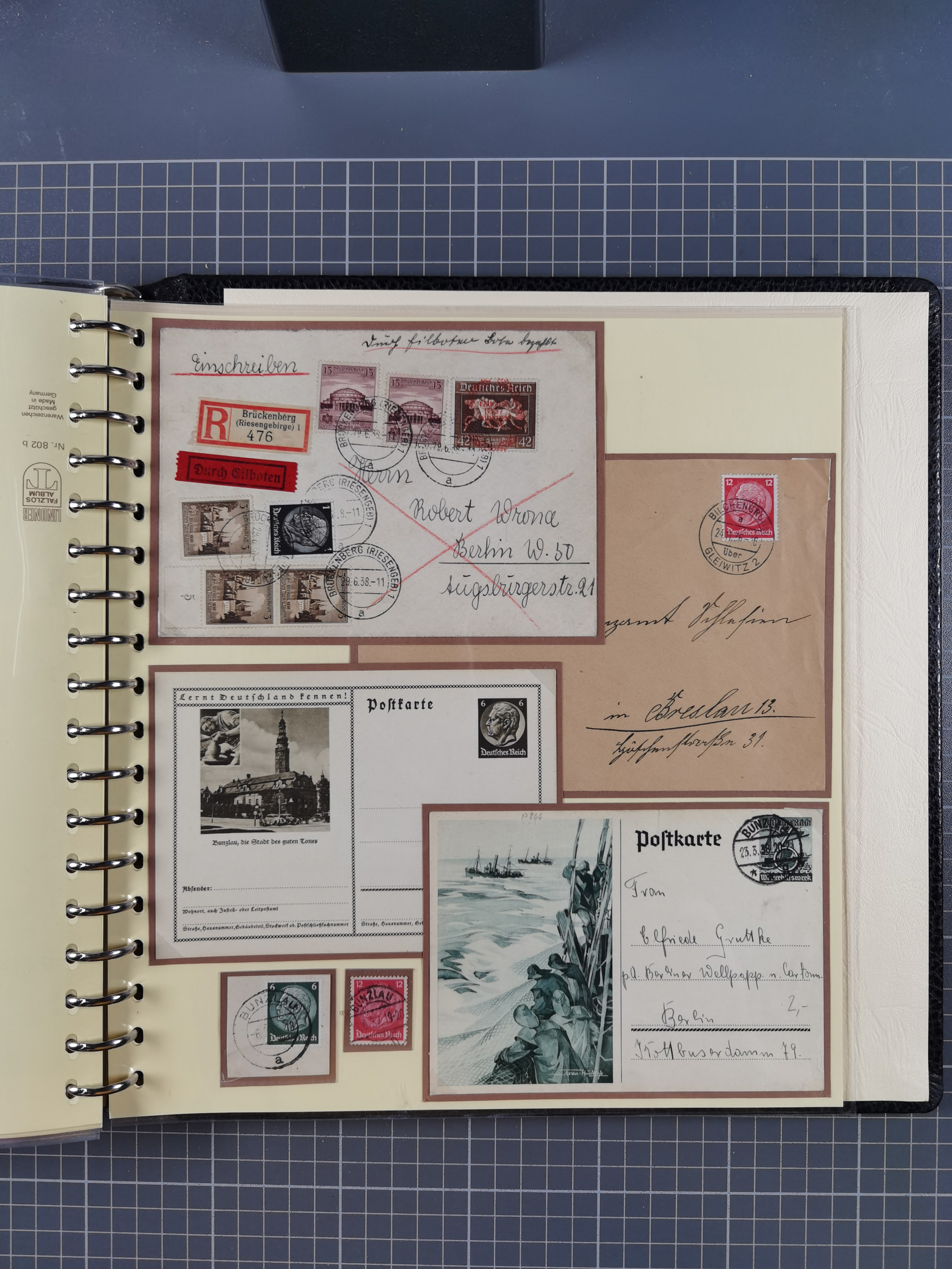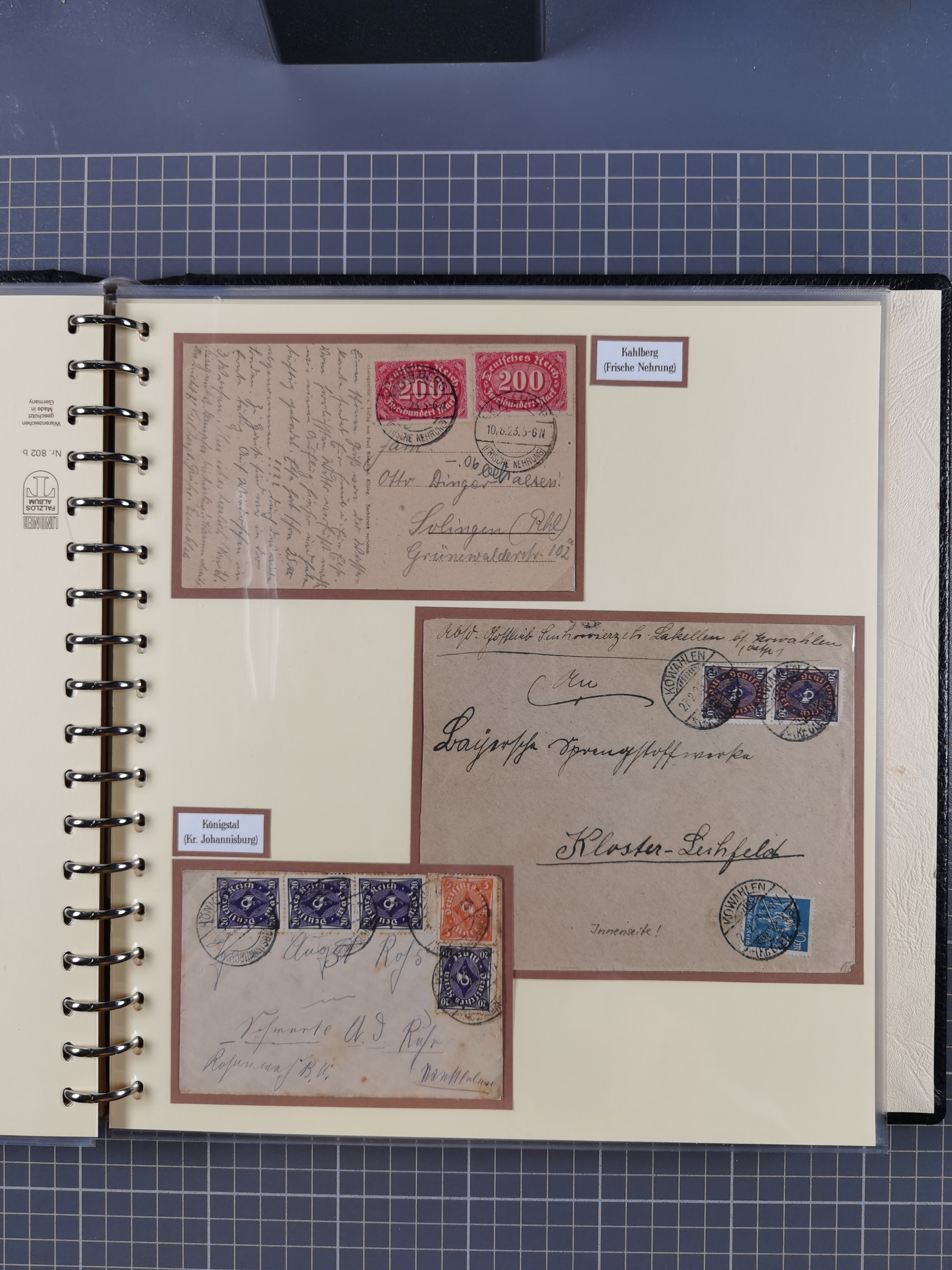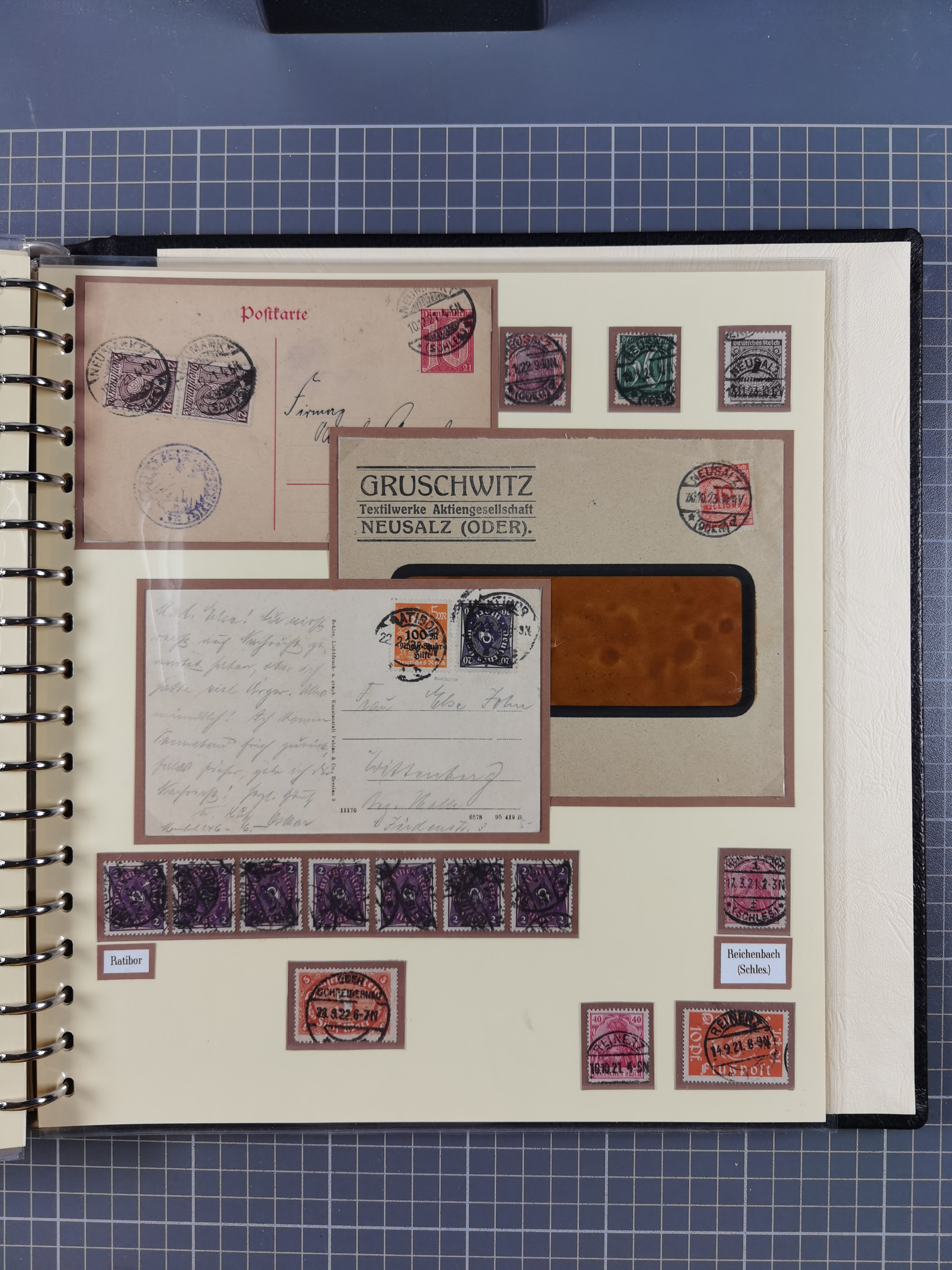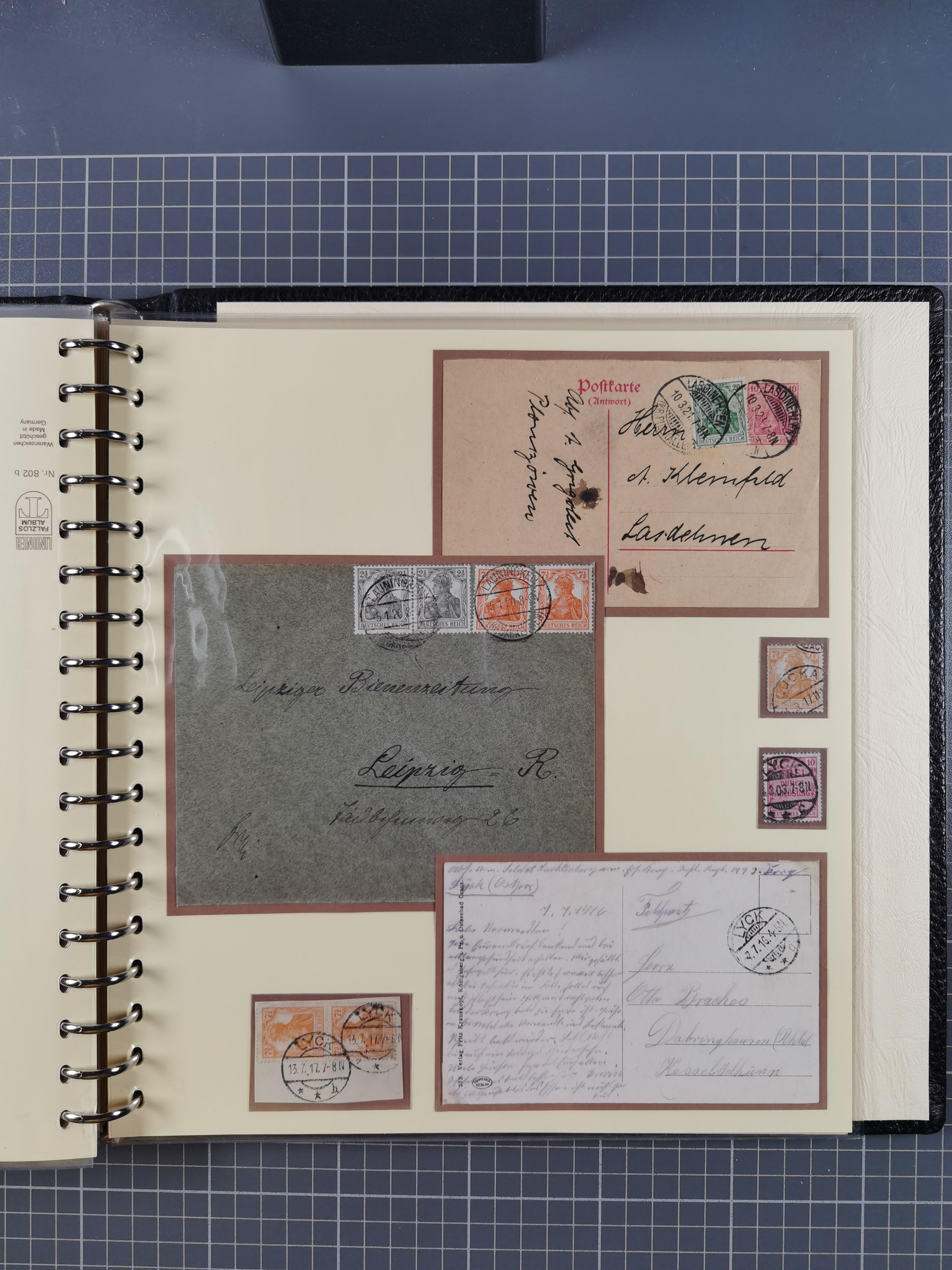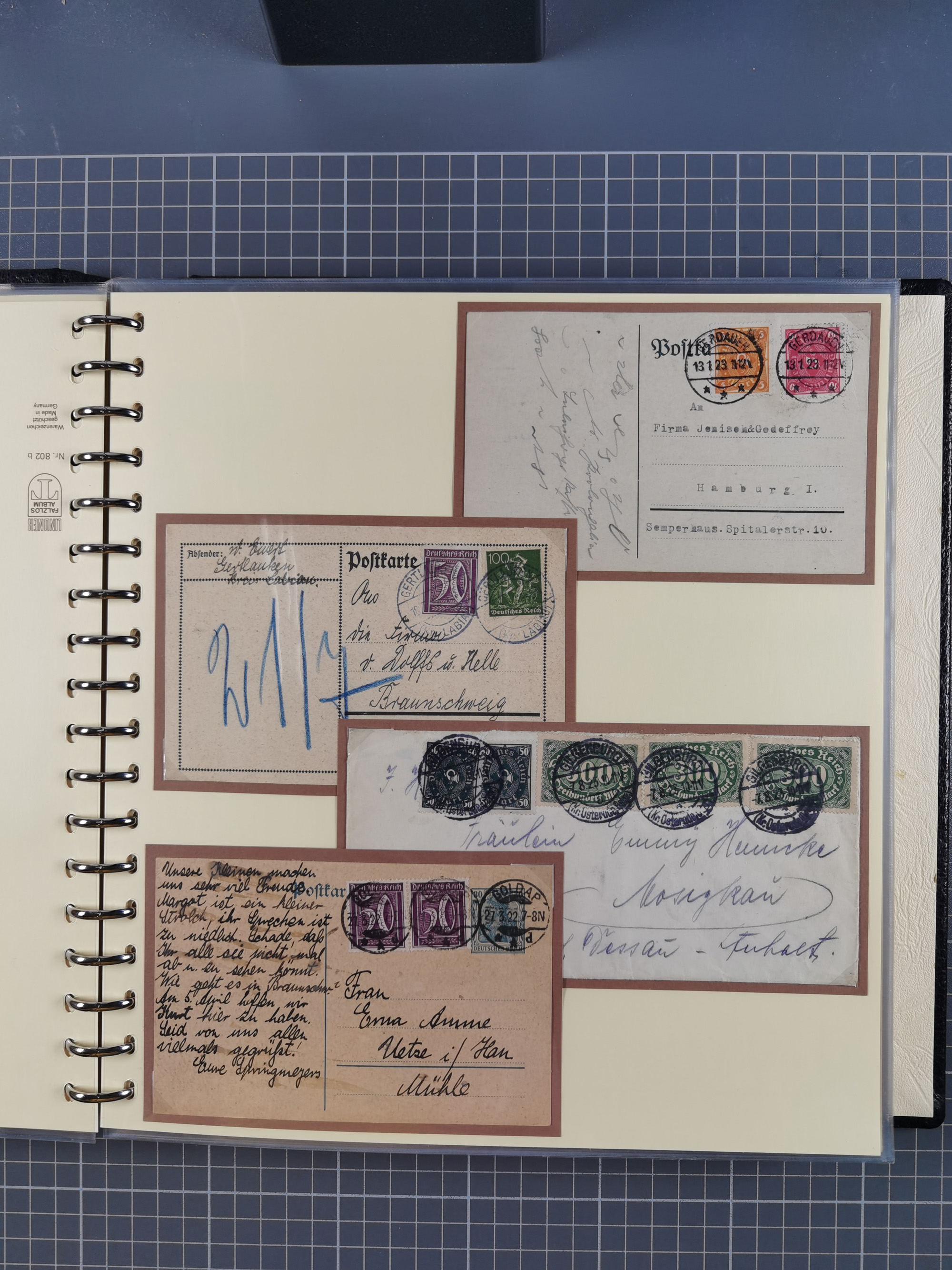 1865/1950 (ca.), Album mit 122 hochwertigen Belegen, diese einzeln vom Einlieferer beschrieben und nach Michel bewertet 15.000 €. Dazu ein Karton mit über 170 Briefen, Karten und Ganzsachen, dabei etliche interessante Belege, meist gute Erhaltung