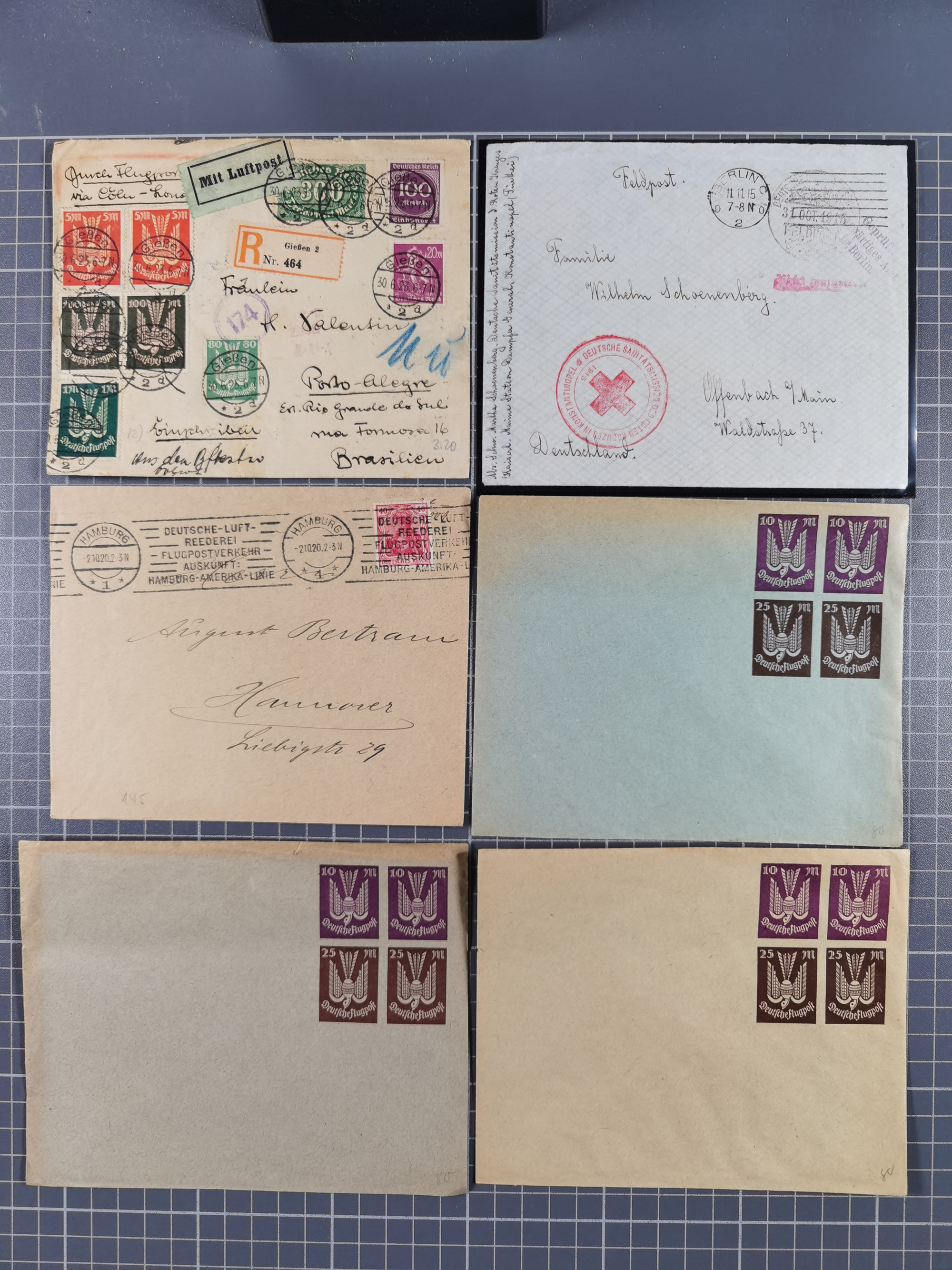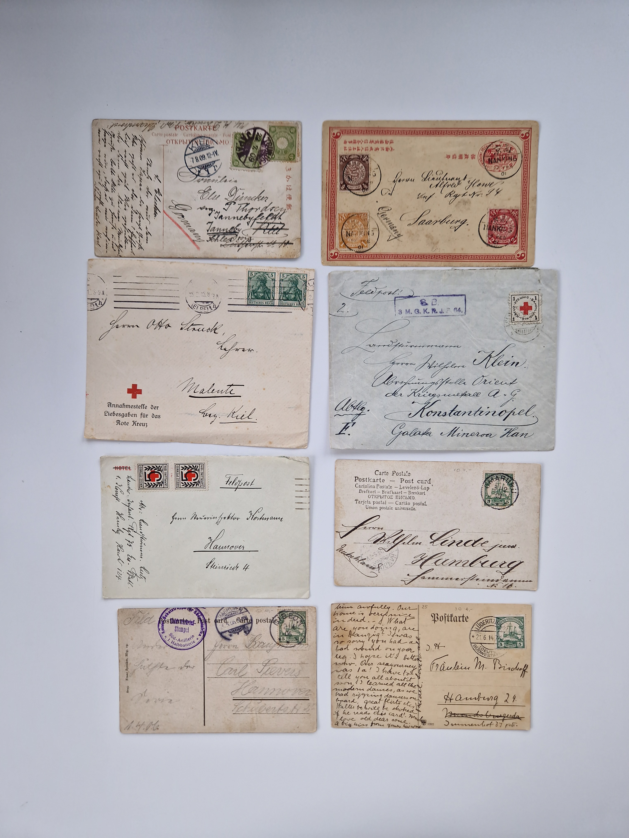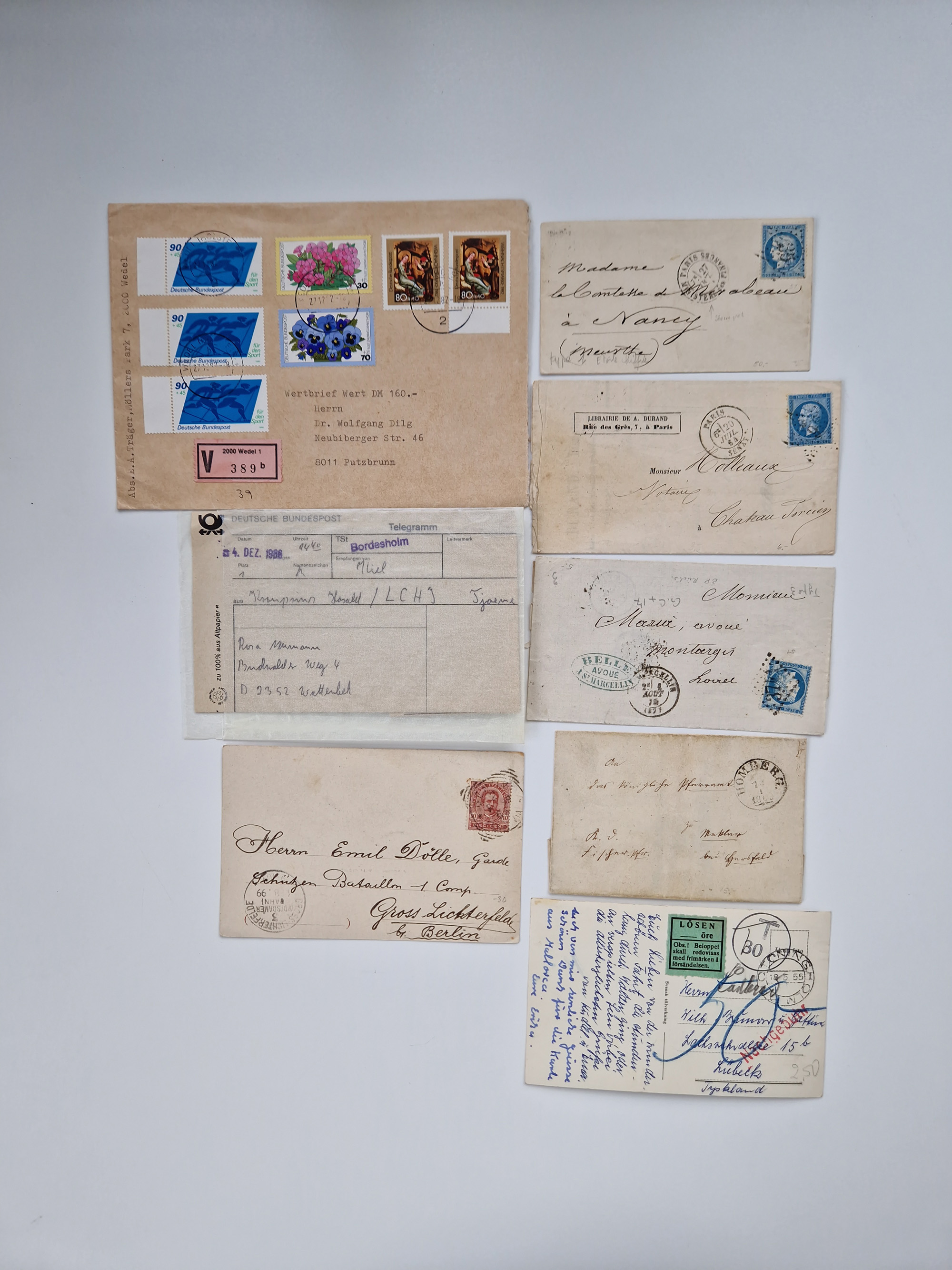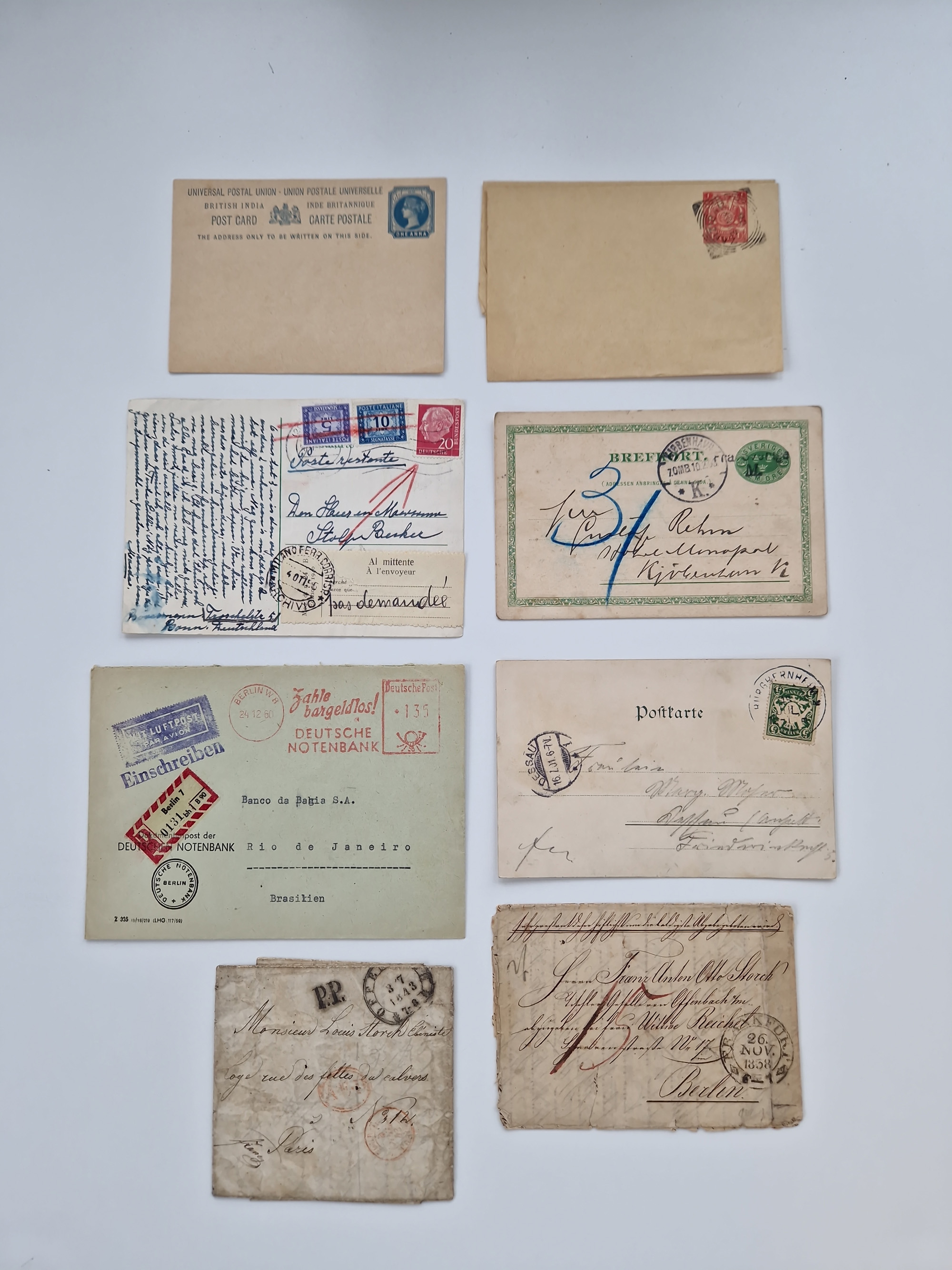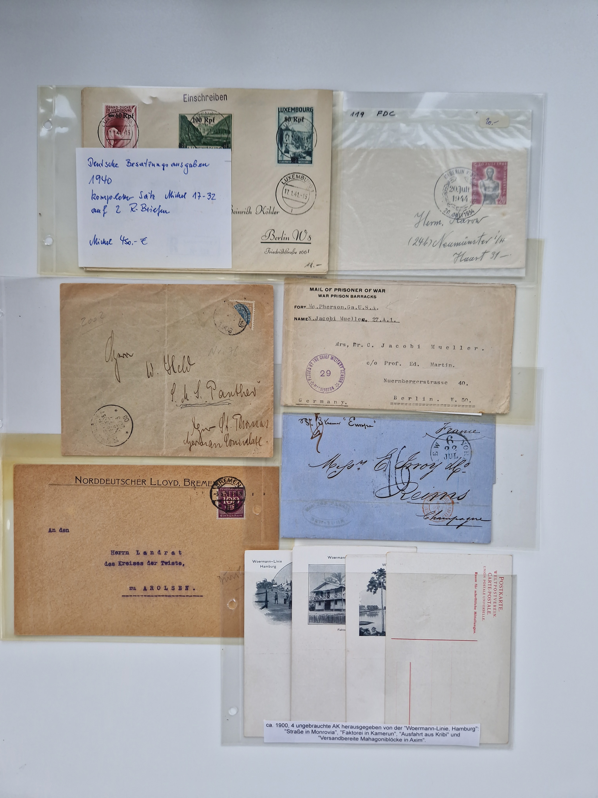 1826/1937 (ca.), umfangreiche Partie mit rund 40 Belegen, inkl. Deutsche Kolonie und WWI Besetzungen, interessante Einzel-, Mehrfach- und Mischfrankaturen, dabei u.a. Brustschild + Frankreich auf Faltbrief, Teil Stempel mit blauem “AUS DAENEMARK”, “LINIE HAMBURG WESTAFRIKA”, “LOME”, etc., etwas unterschiedlich, meist in guter Gesamterhaltung