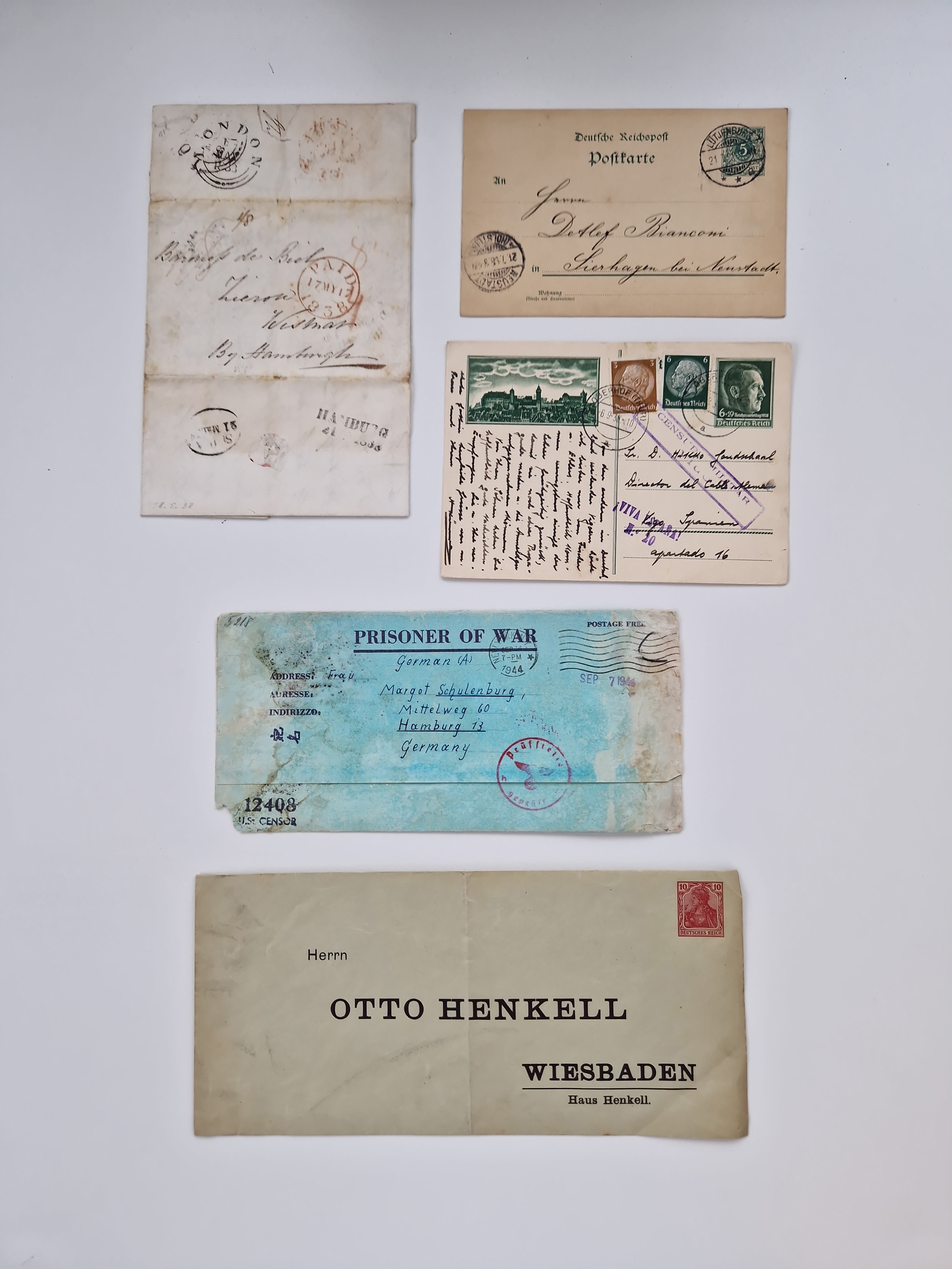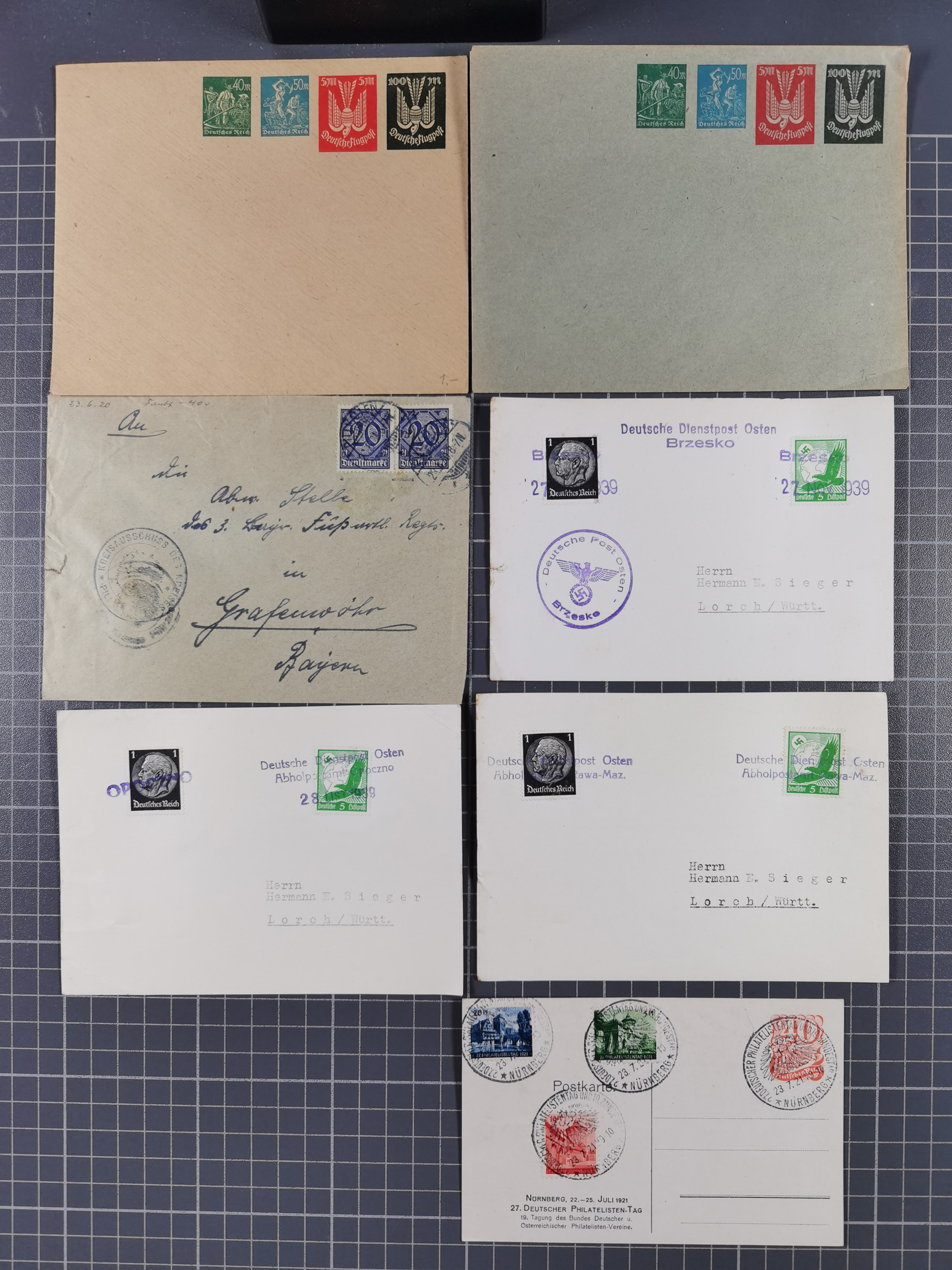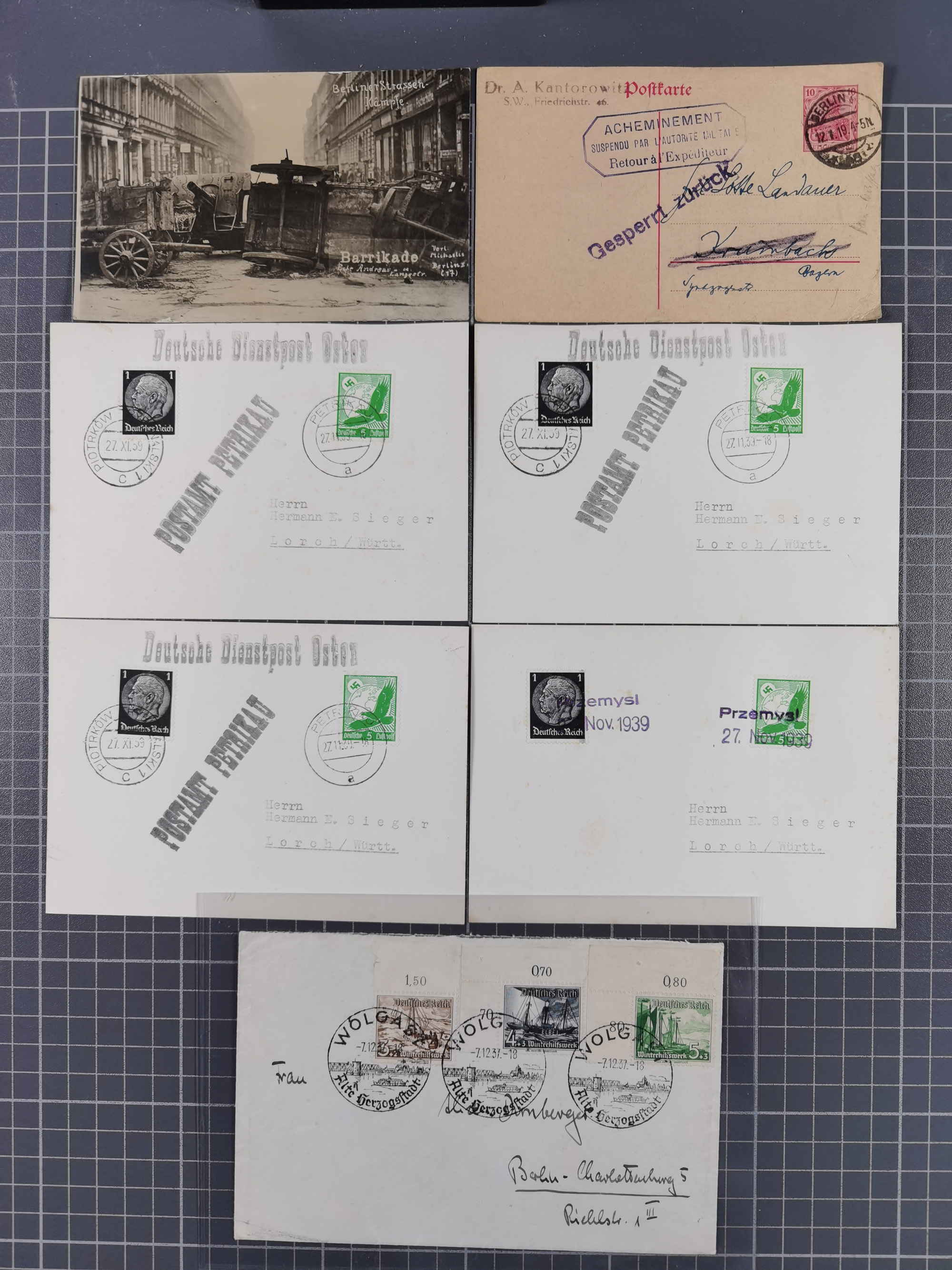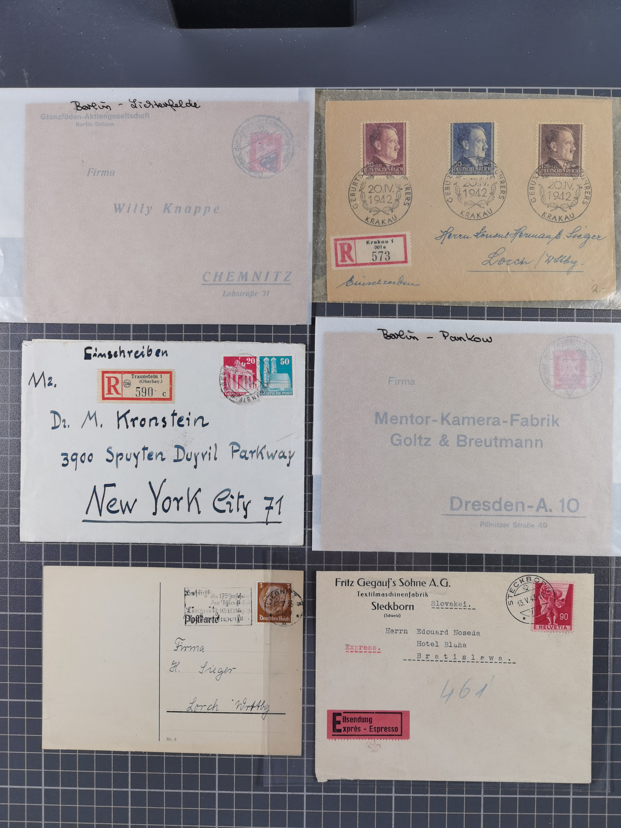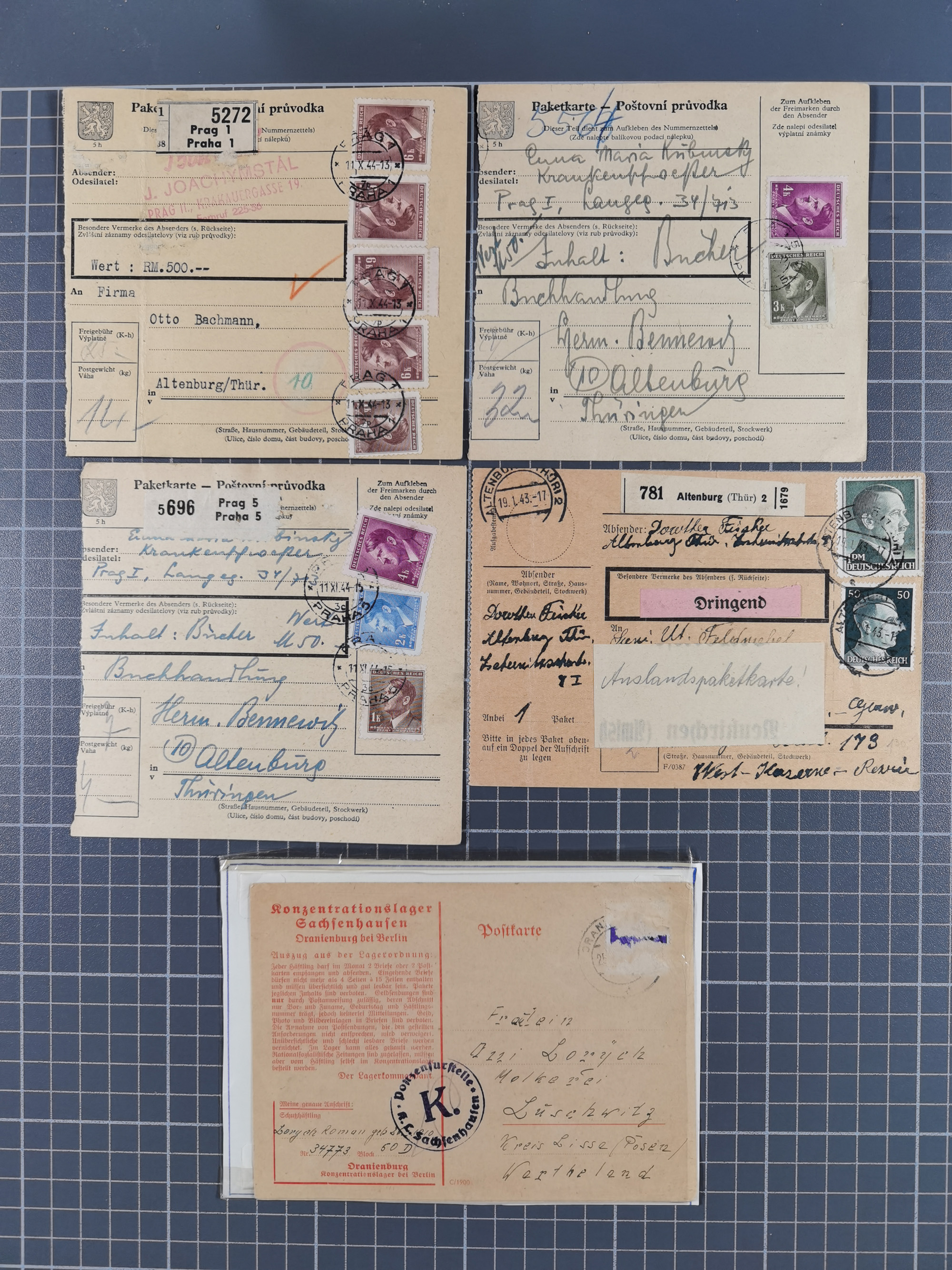 1709/1950, über 130 Briefe, Karten und Ganzsachen mit früher Botenpost, ca. 35 KZ- und Ghettopost-Belege mit u.a. zwei Kartenbriefen von Stutthof, Brief mit Stempel “BAYRISCHER KURIER-FLUGPOSTDIENST” 1919 und weitere Besonderheiten