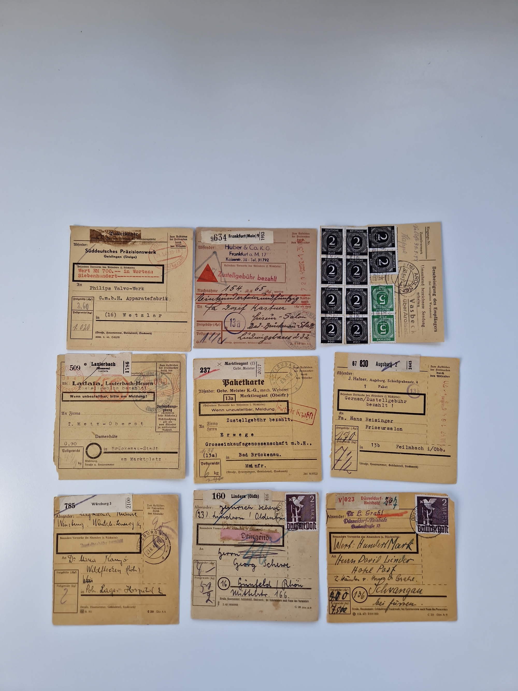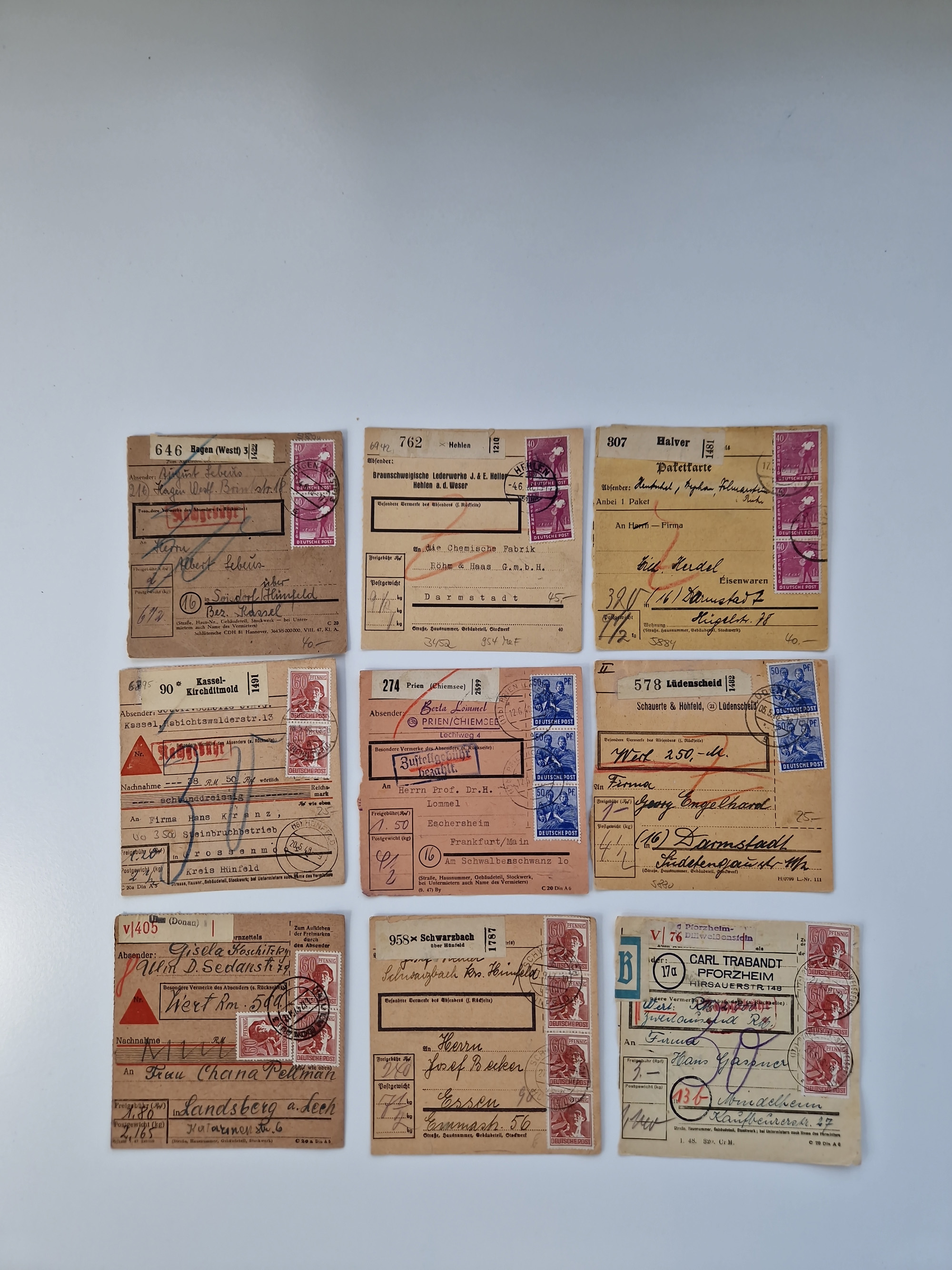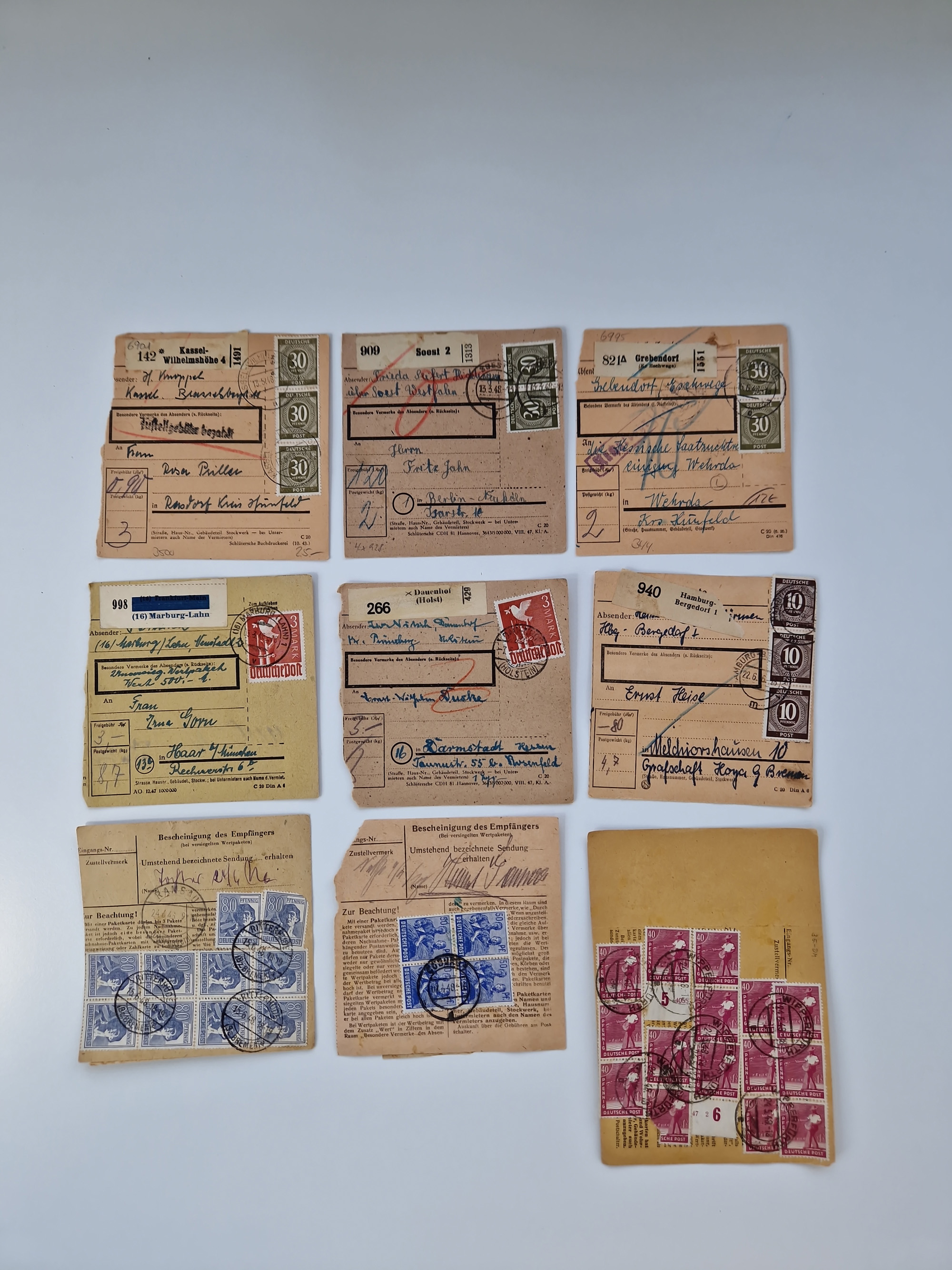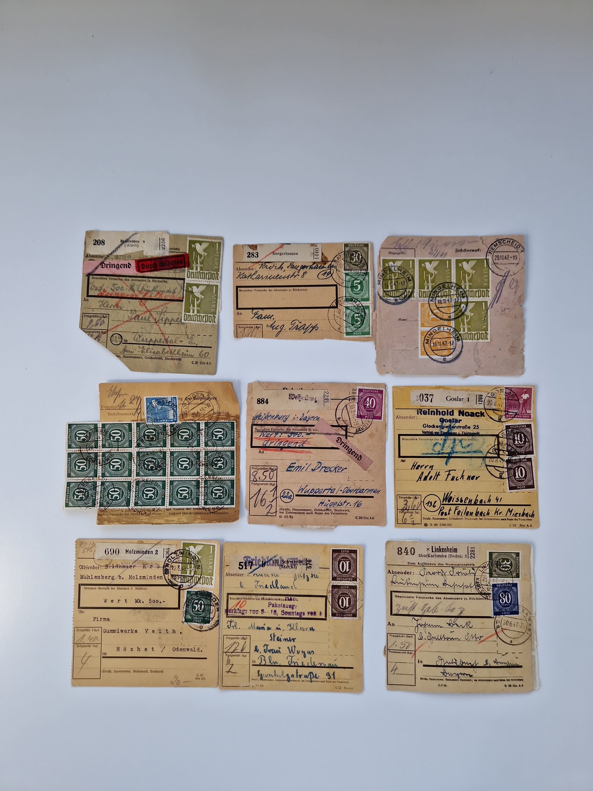 1946/47, interessanter Sammlungsposten mit über 100 Paketkarten mit vielen Einzel- und Mehrfachfrankaturen, interessanten Verwendungen, Not-Paketkarten (u.a. Ganzsachenkarte 45 Pfg. mit Anker-Paketkartenfreistempel, drei späteren Paketkarten und weiteren Besonderheiten, dabei u.a. Mi.-Nr. 922 MEF8, 931 MEF6, 932 MEF(10), 933 MEF6, 934 MEF4, 935 MEF6, 937 MEF7, 948 MEF8, 954 MEF18, 955 MEF6, 957 MEF13 und zwei Einzelfrankaturen Mi.-Nr. 961