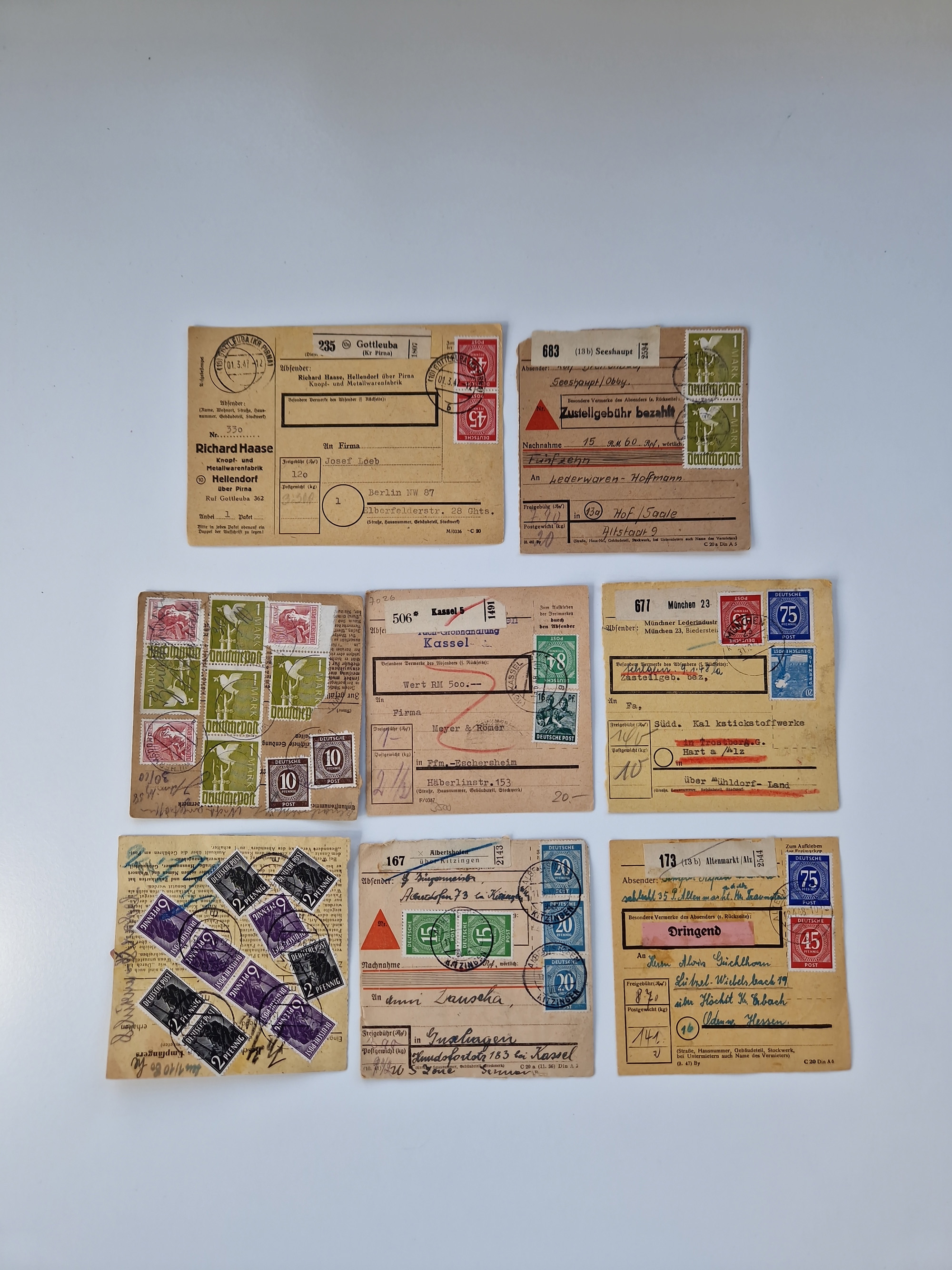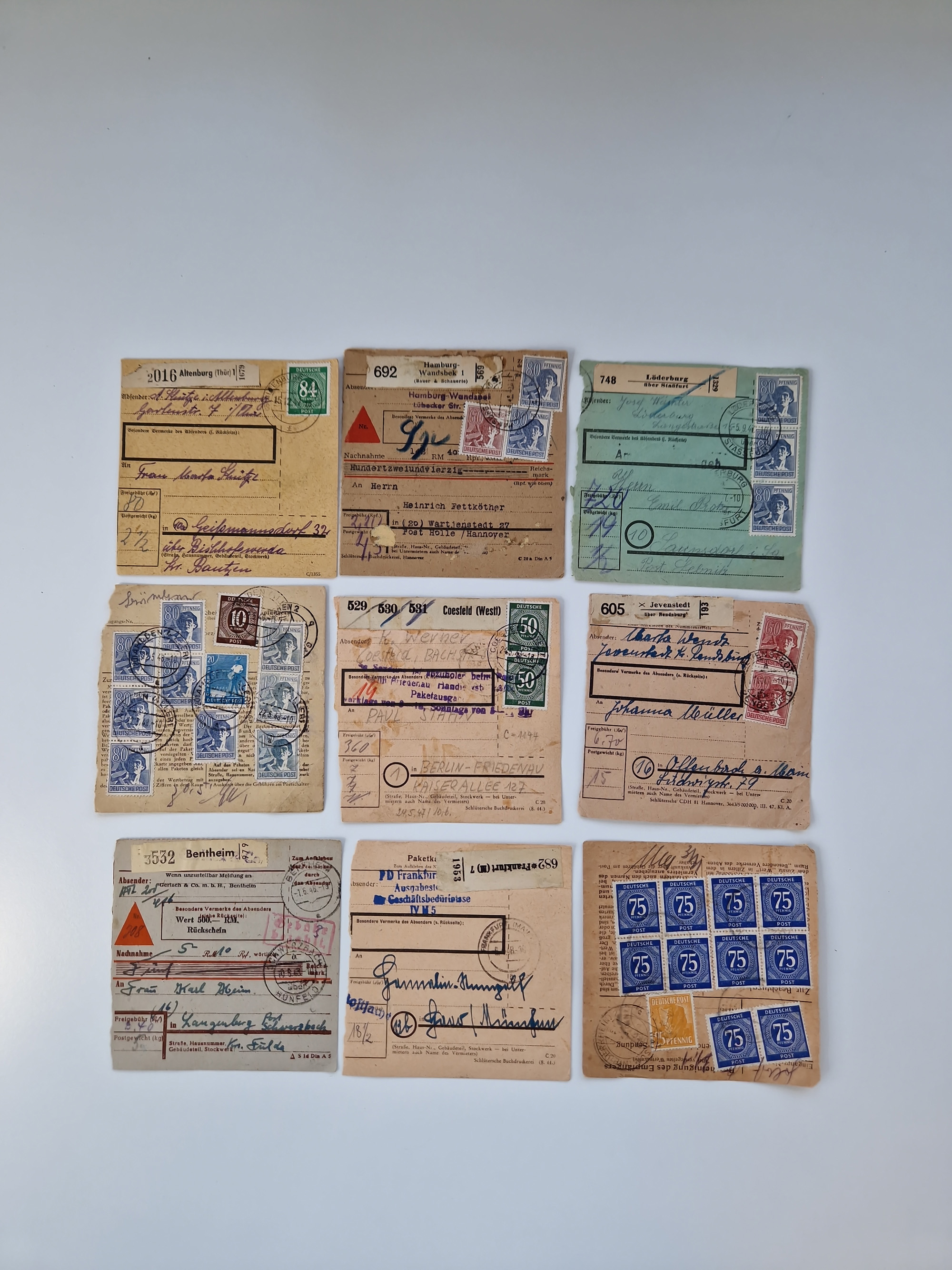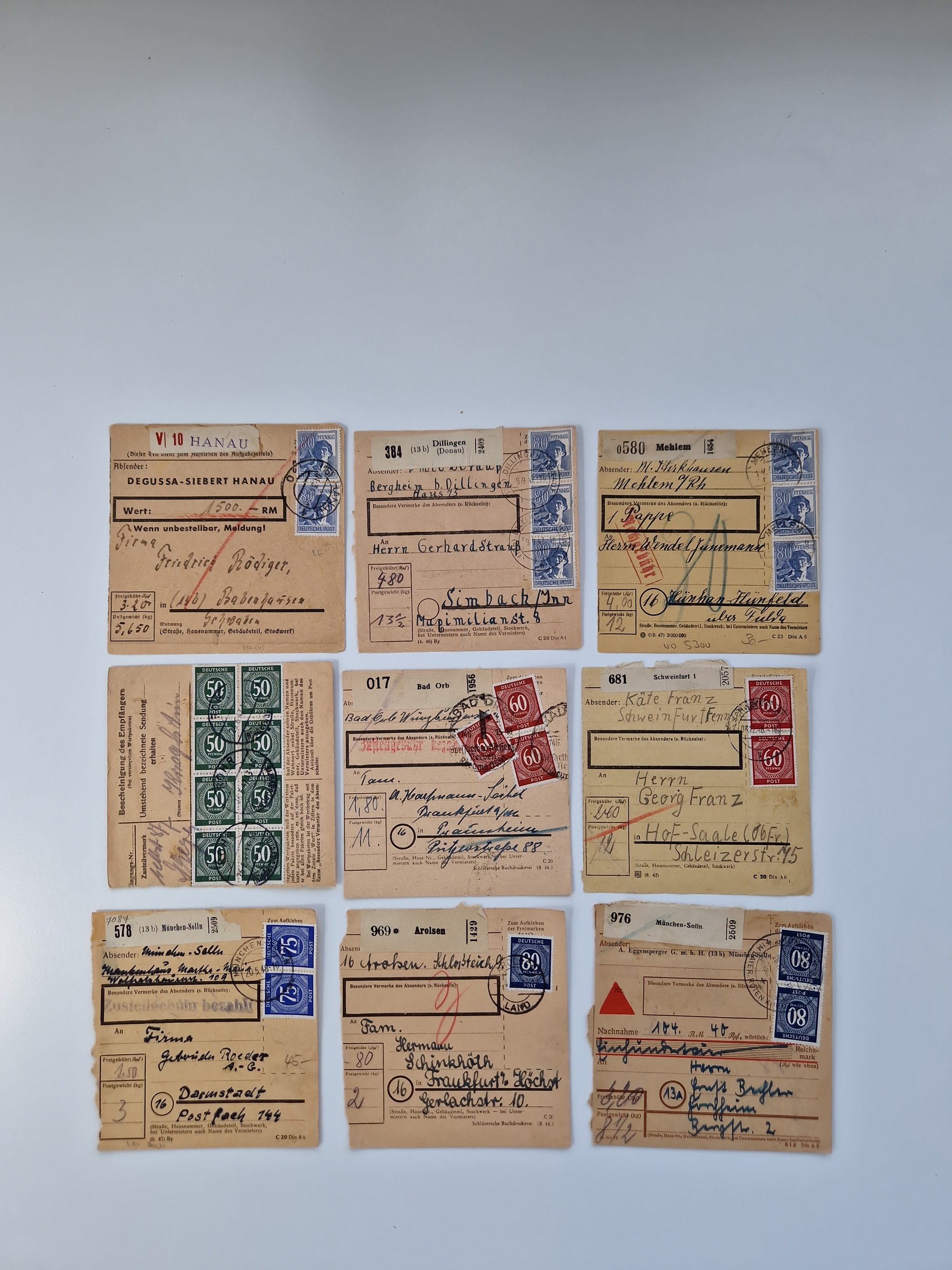 1946/47, interessanter Sammlungsposten mit über 100 Paketkarten mit vielen Einzel- und Mehrfachfrankaturen, interessanten Verwendungen, Not-Paketkarten (u.a. Ganzsachenkarte 45 Pfg. mit Anker-Paketkartenfreistempel, drei späteren Paketkarten und weiteren Besonderheiten, dabei u.a. Mi.-Nr. 922 MEF8, 931 MEF6, 932 MEF(10), 933 MEF6, 934 MEF4, 935 MEF6, 937 MEF7, 948 MEF8, 954 MEF18, 955 MEF6, 957 MEF13 und zwei Einzelfrankaturen Mi.-Nr. 961