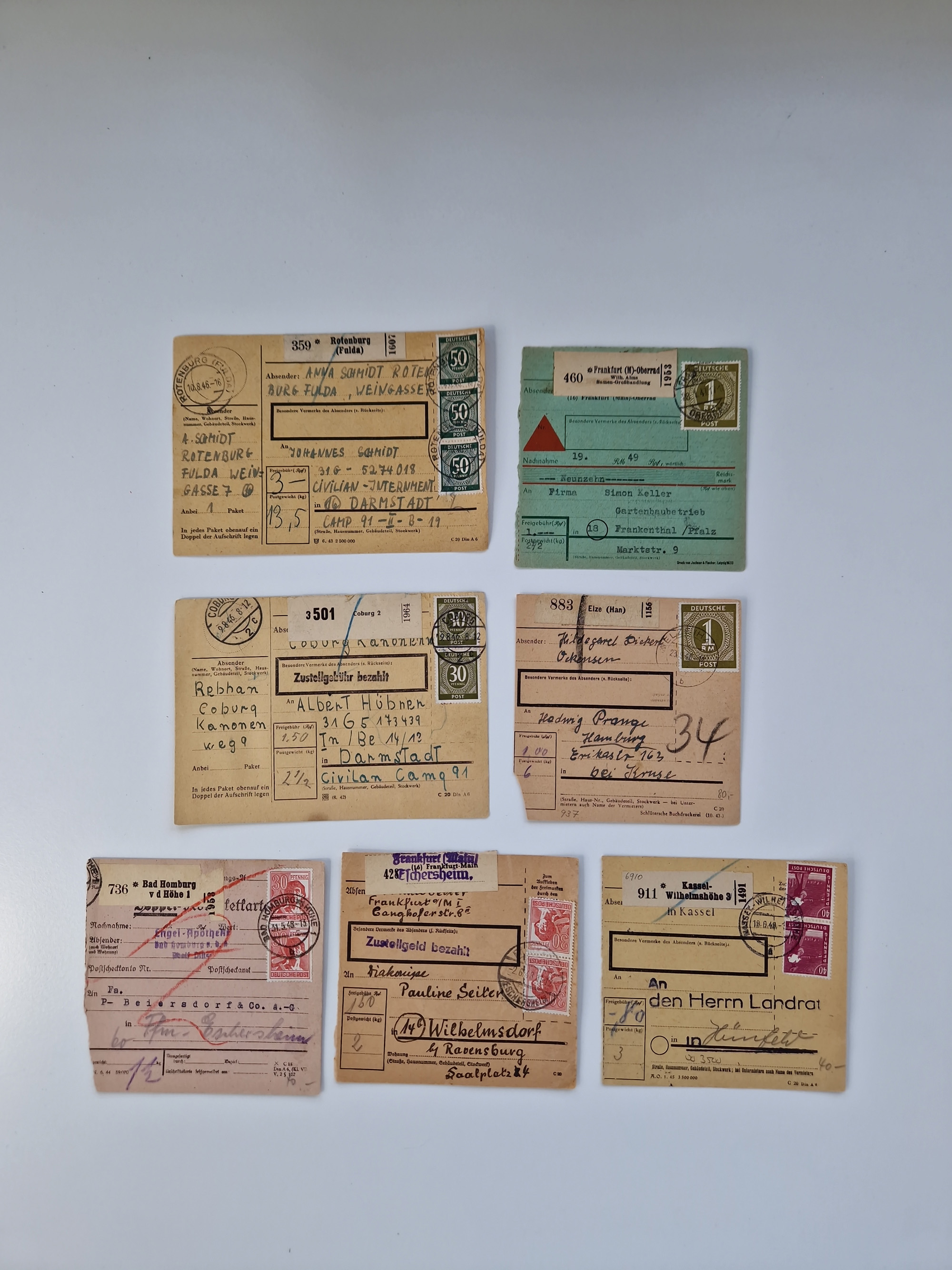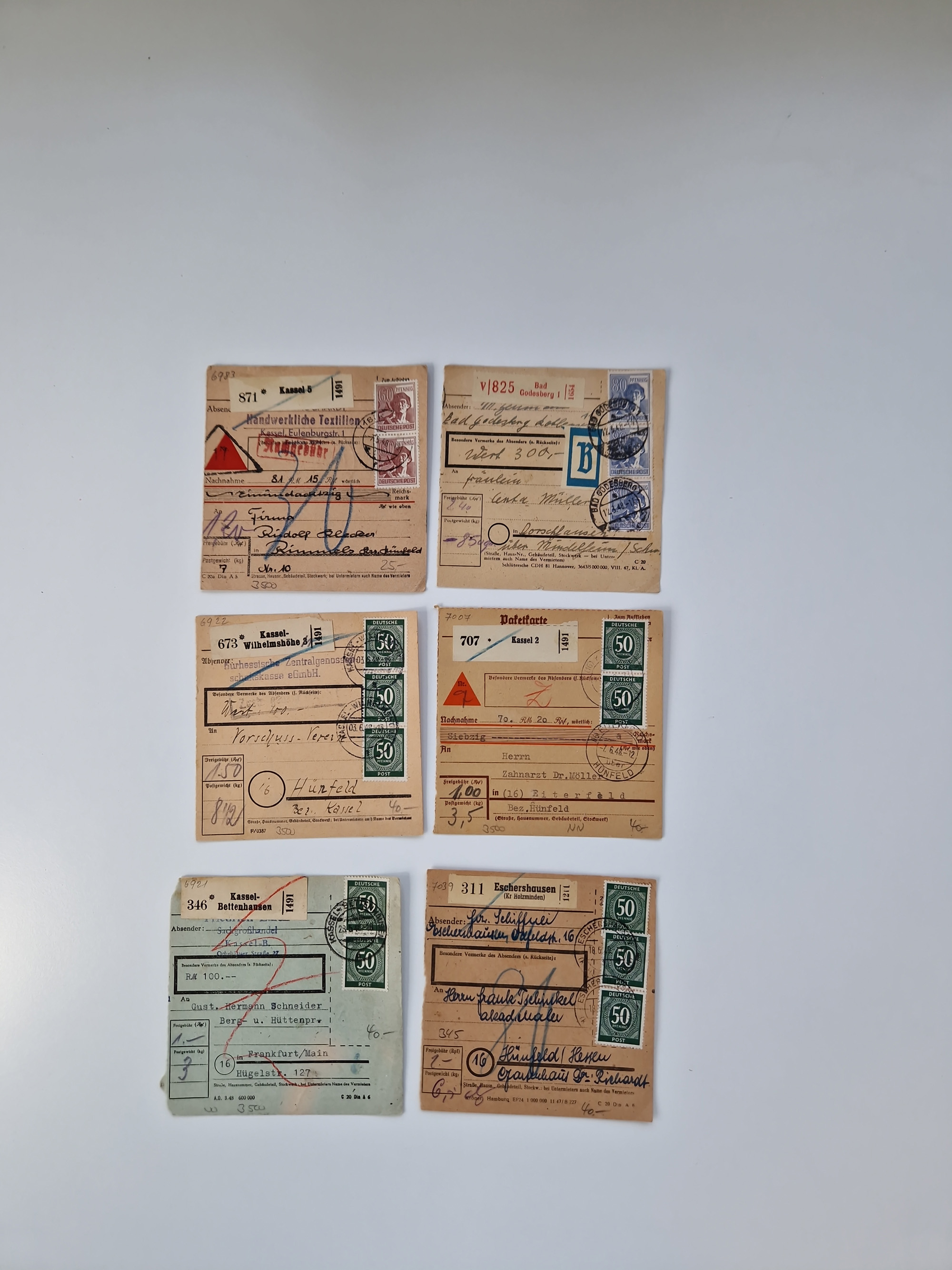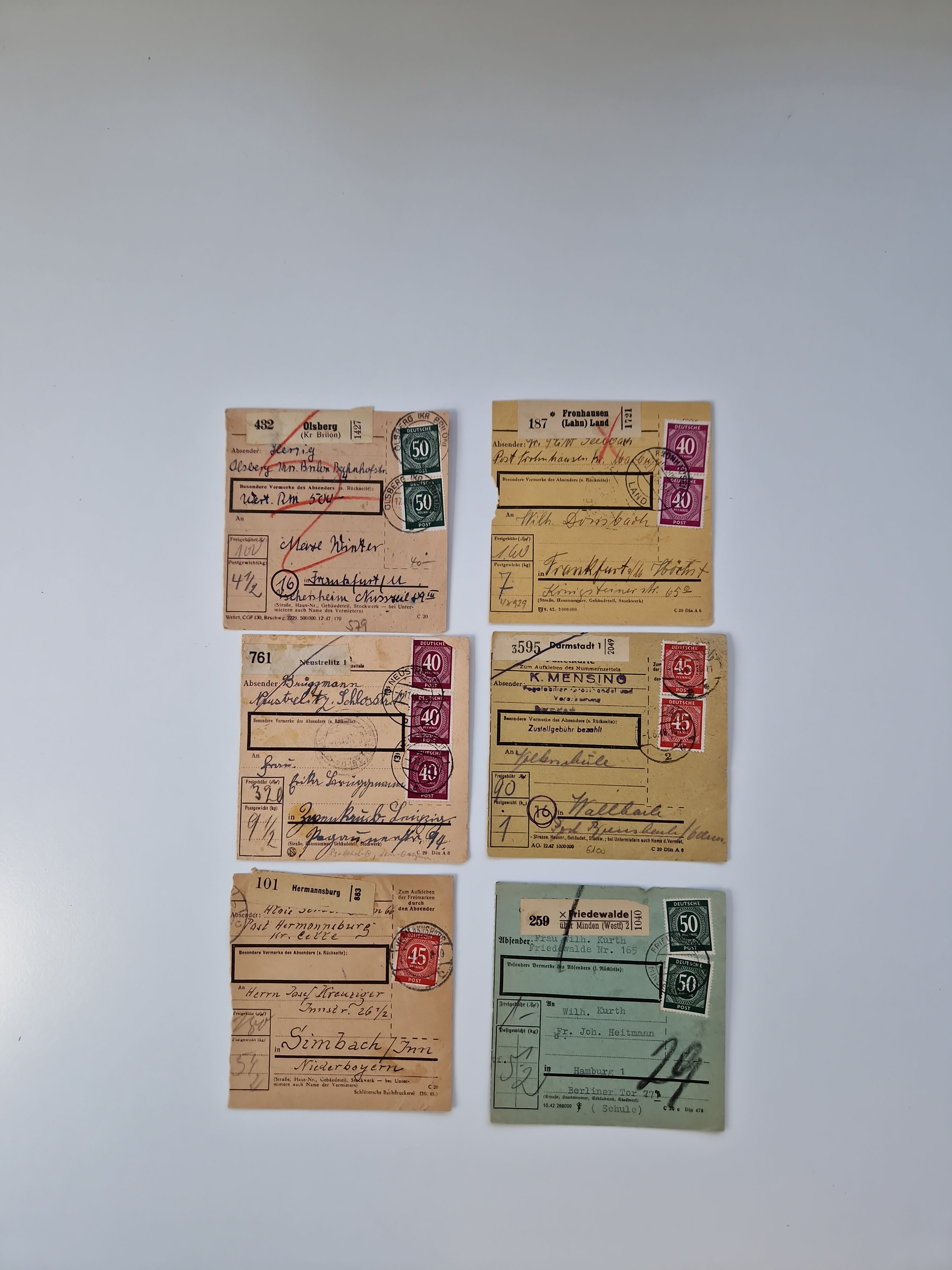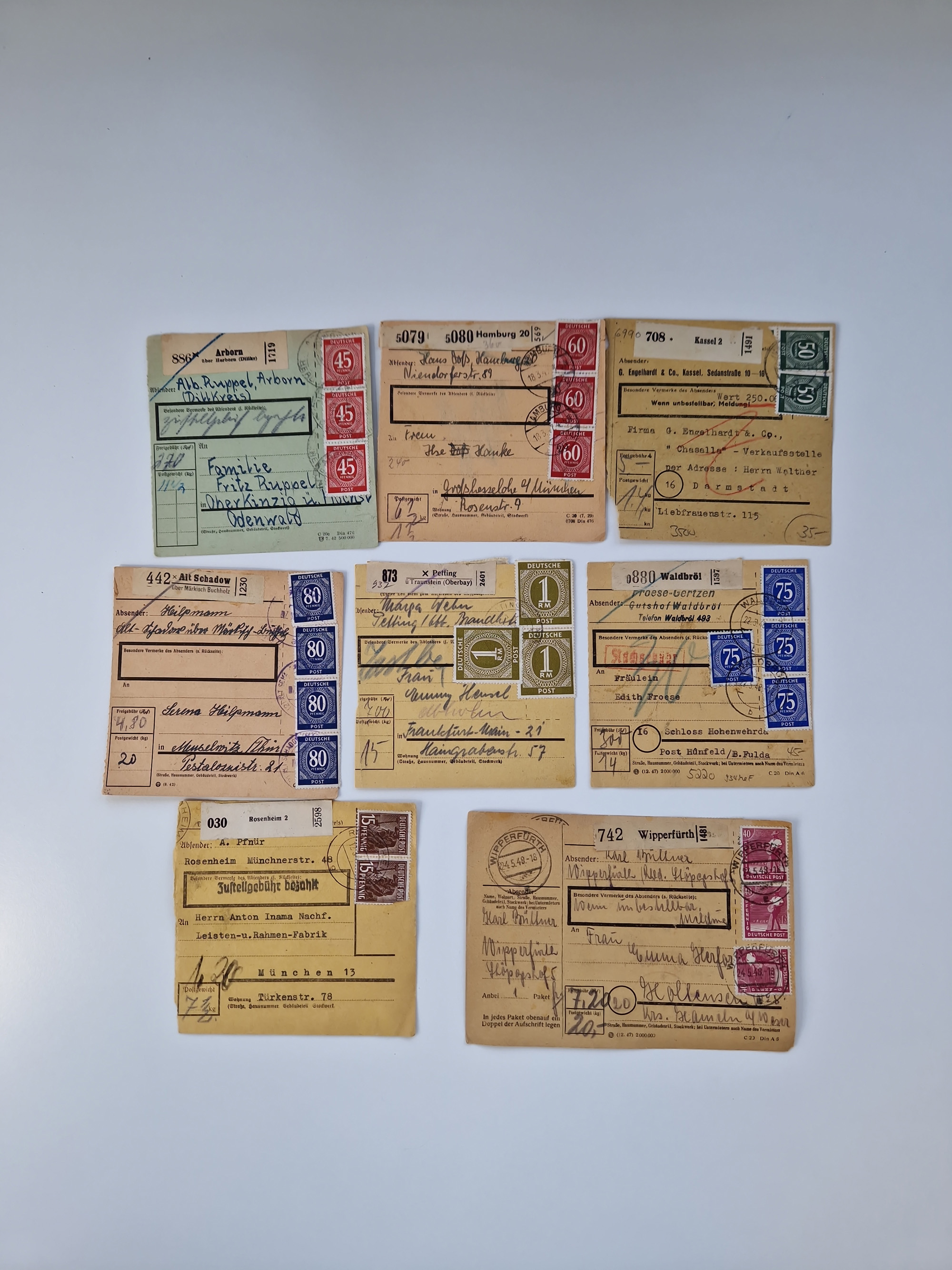 1946/47, interessanter Sammlungsposten mit über 100 Paketkarten mit vielen Einzel- und Mehrfachfrankaturen, interessanten Verwendungen, Not-Paketkarten (u.a. Ganzsachenkarte 45 Pfg. mit Anker-Paketkartenfreistempel, drei späteren Paketkarten und weiteren Besonderheiten, dabei u.a. Mi.-Nr. 922 MEF8, 931 MEF6, 932 MEF(10), 933 MEF6, 934 MEF4, 935 MEF6, 937 MEF7, 948 MEF8, 954 MEF18, 955 MEF6, 957 MEF13 und zwei Einzelfrankaturen Mi.-Nr. 961