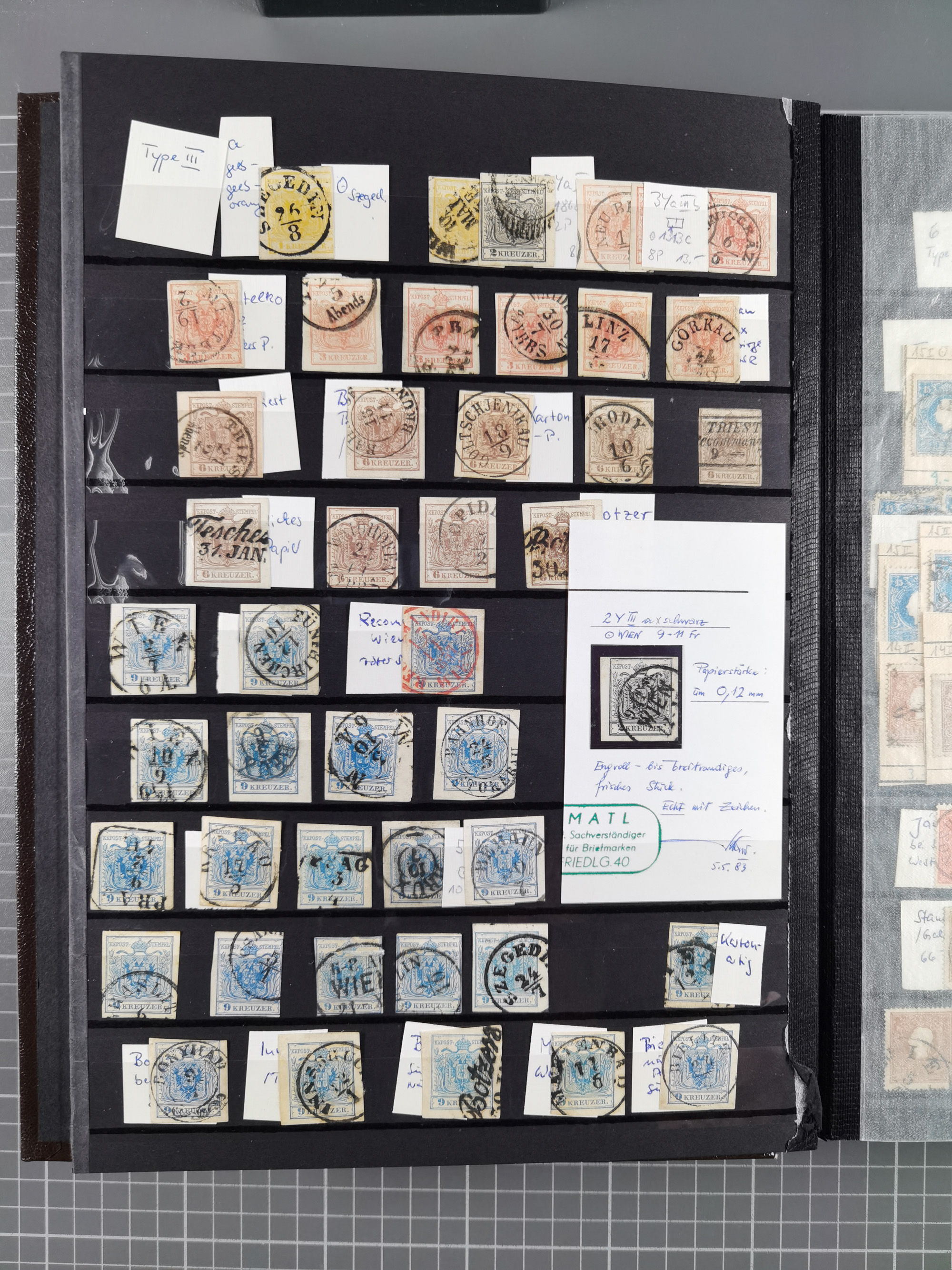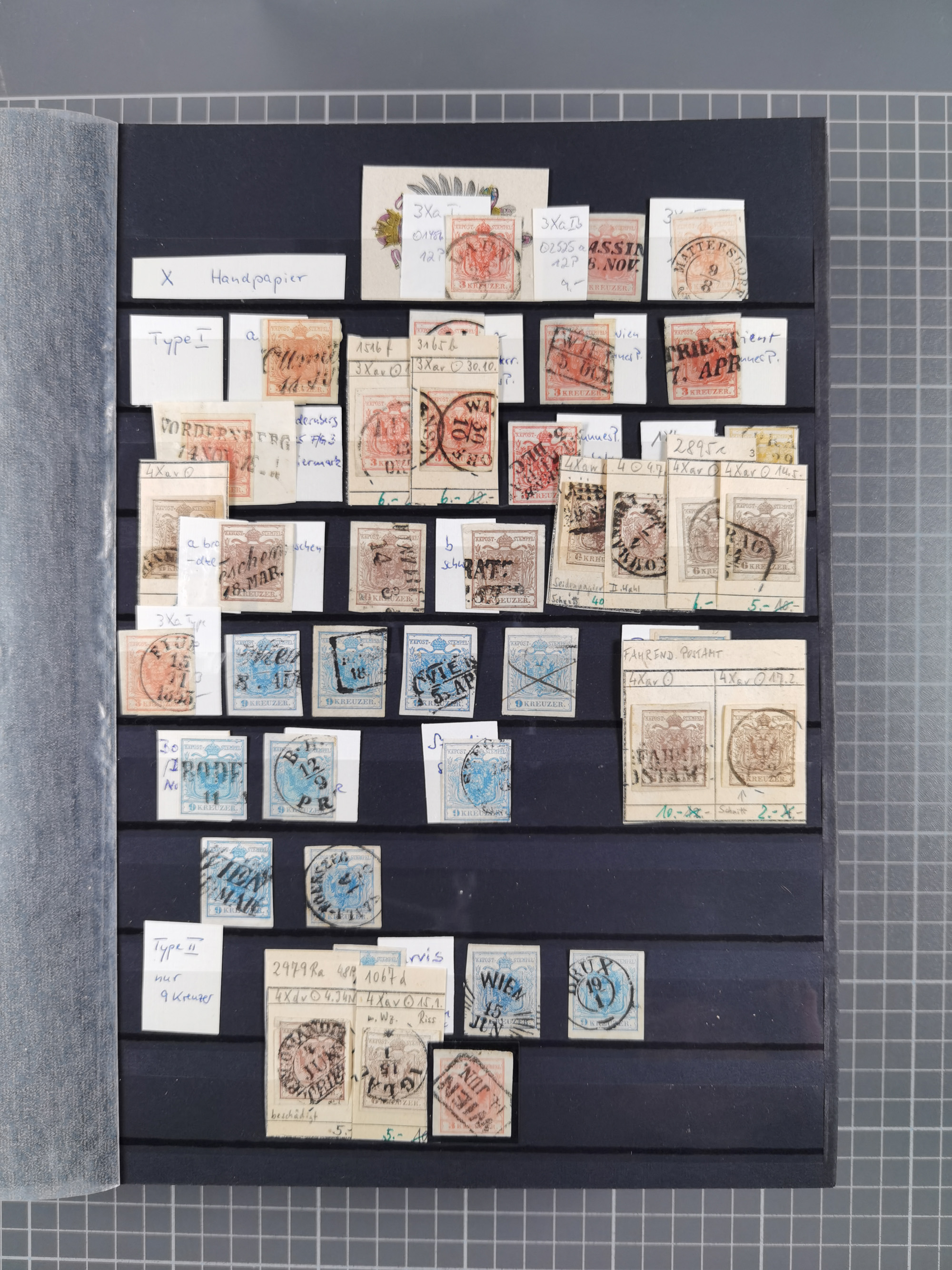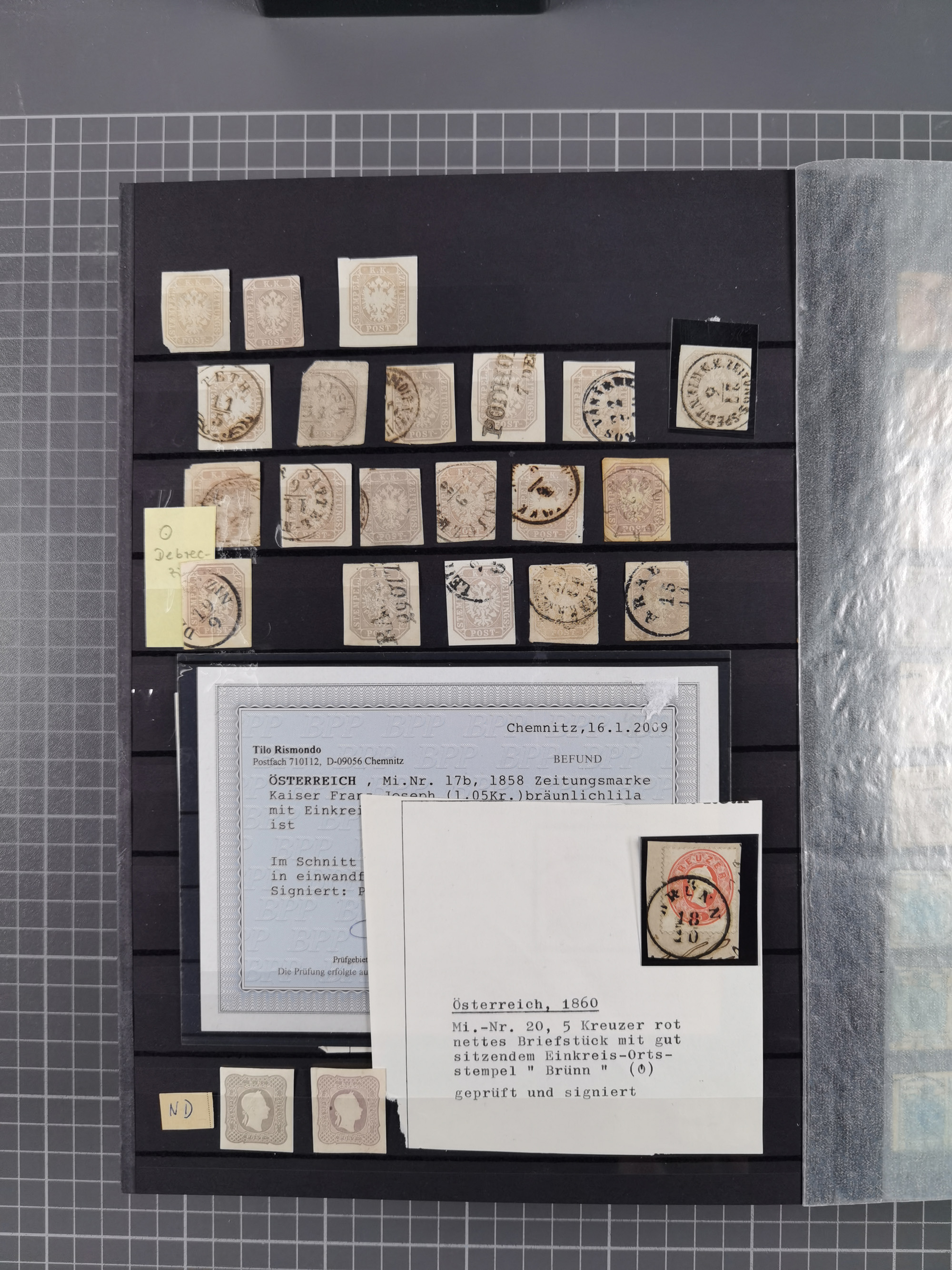 1850/54, 1. Ausgabe, 5 Briefe und 2 Briefstücke, dabei Fahnenstempel von Grinzing und Perchtoldsdorf je auf Brief, blauer L1 Meidling auf Avis und 3 Stücke Post in Rumänien bzw. Serbien. Ein Attest und 3 Befunde.
