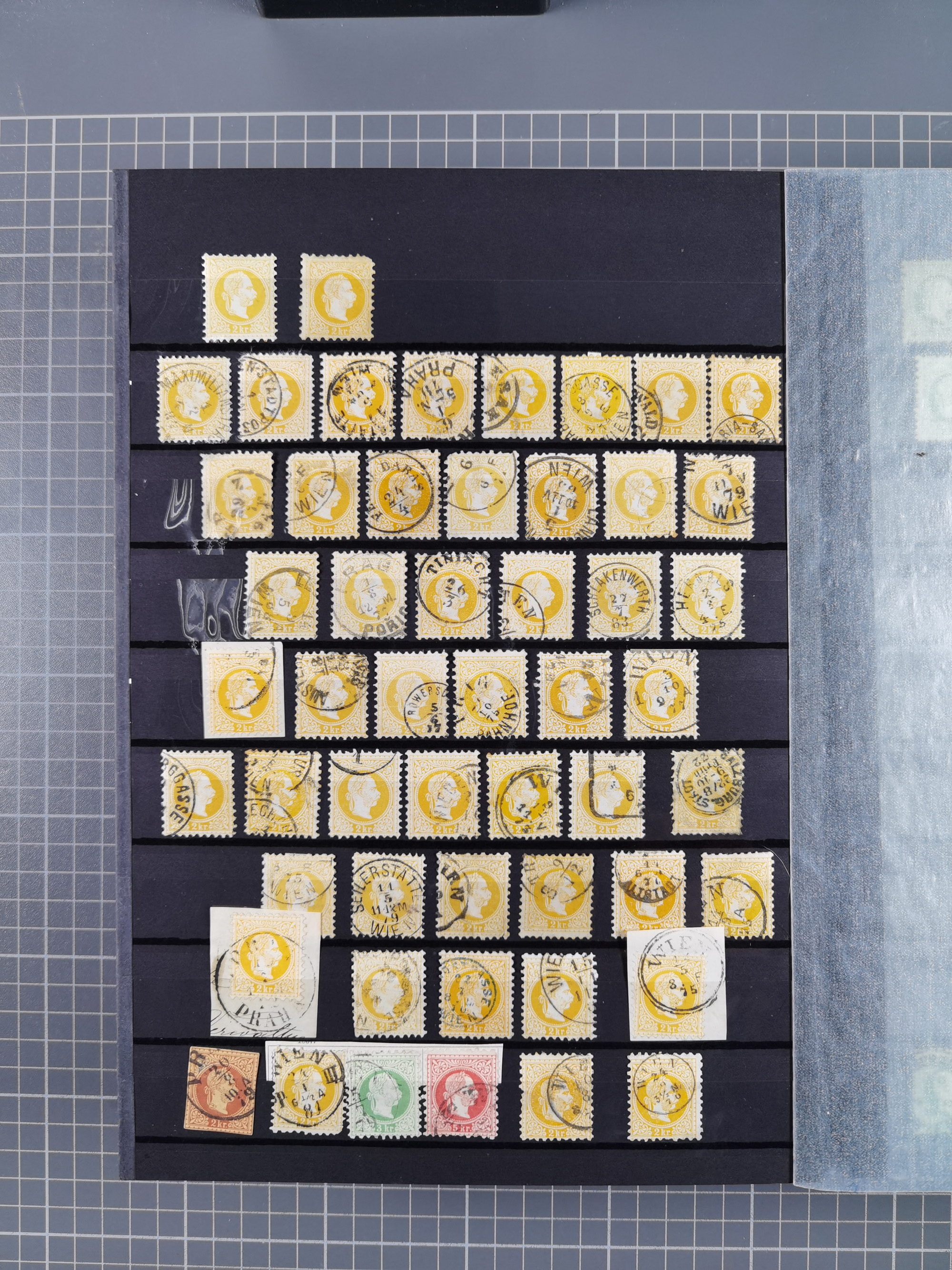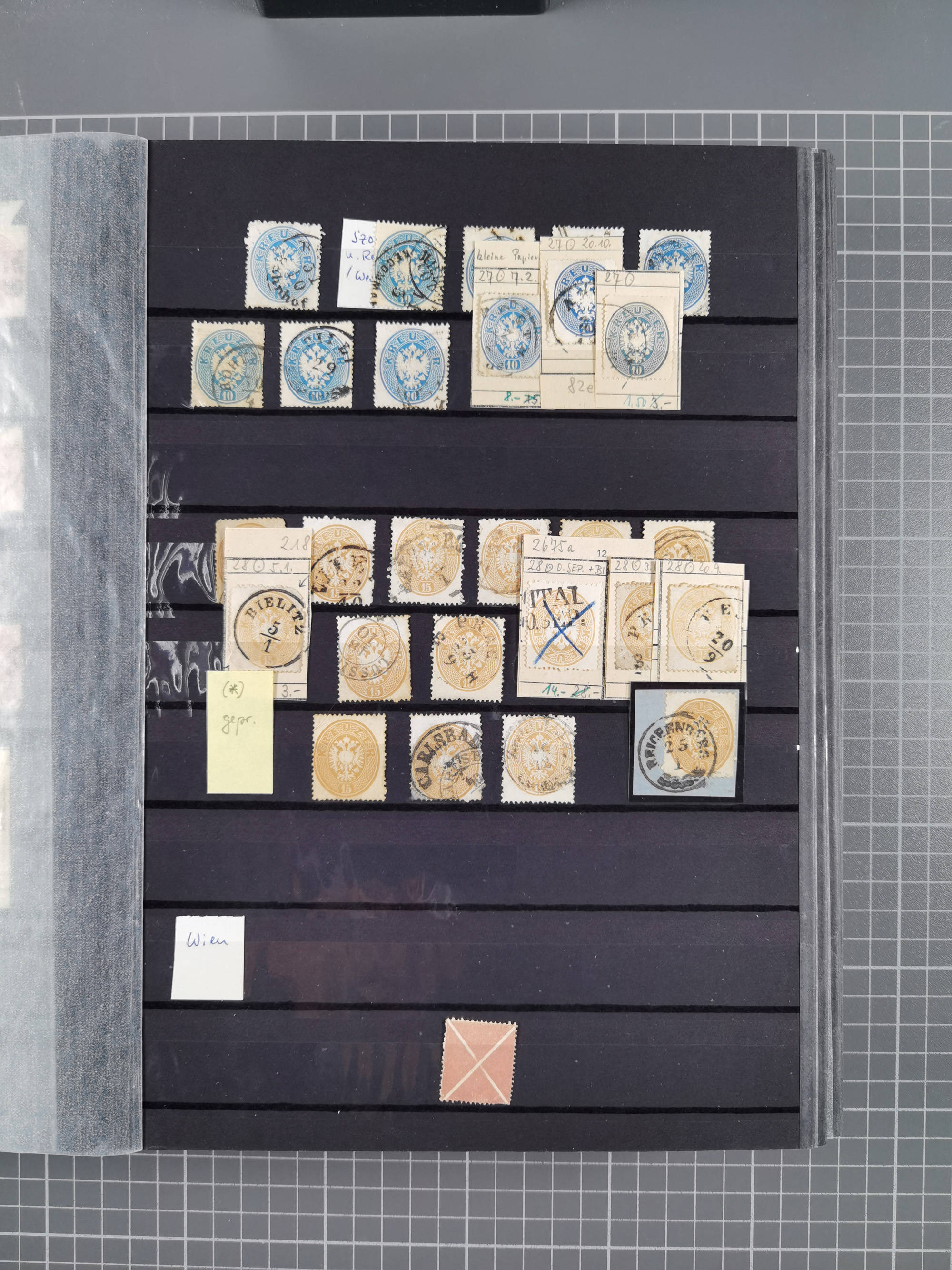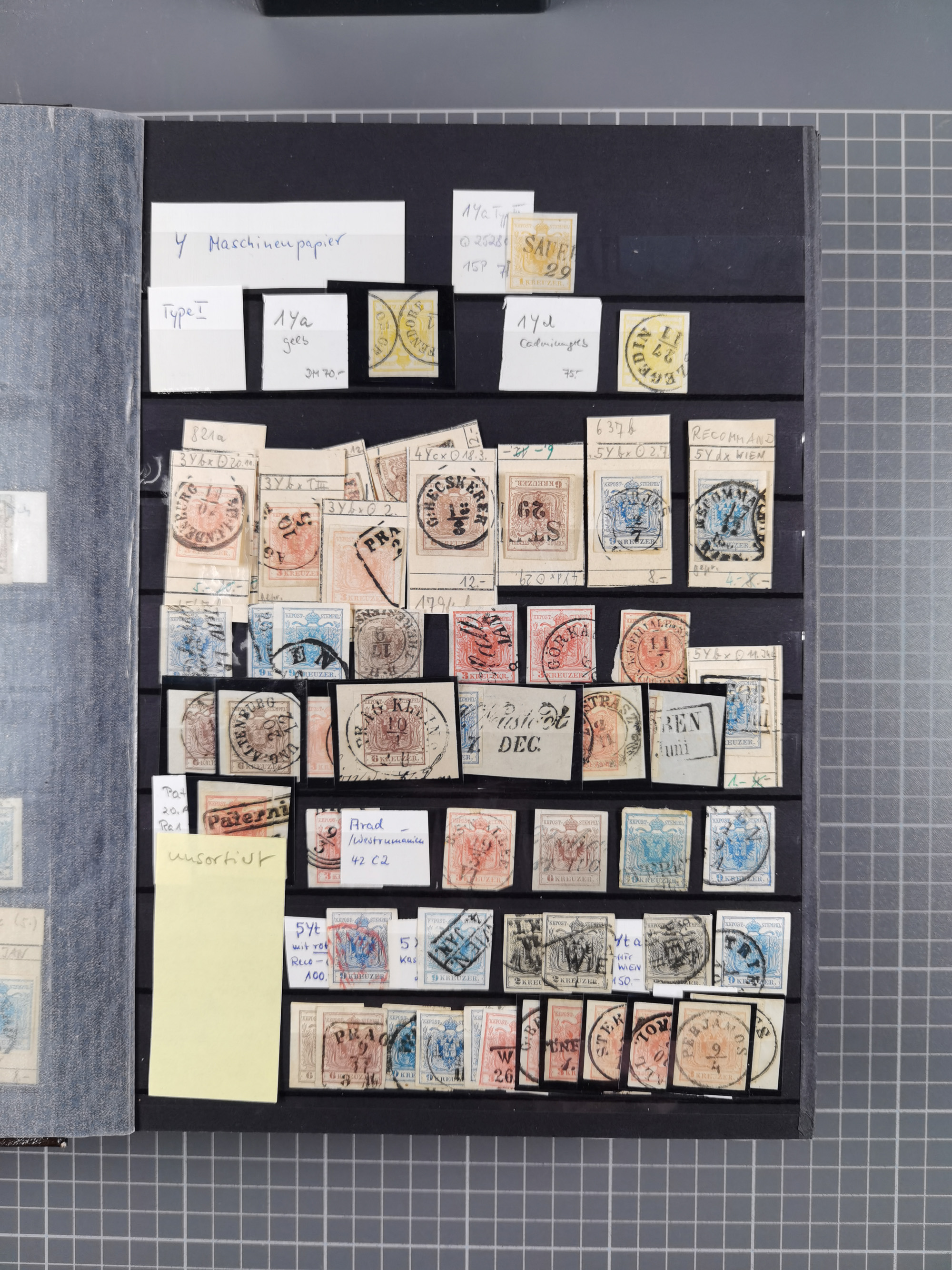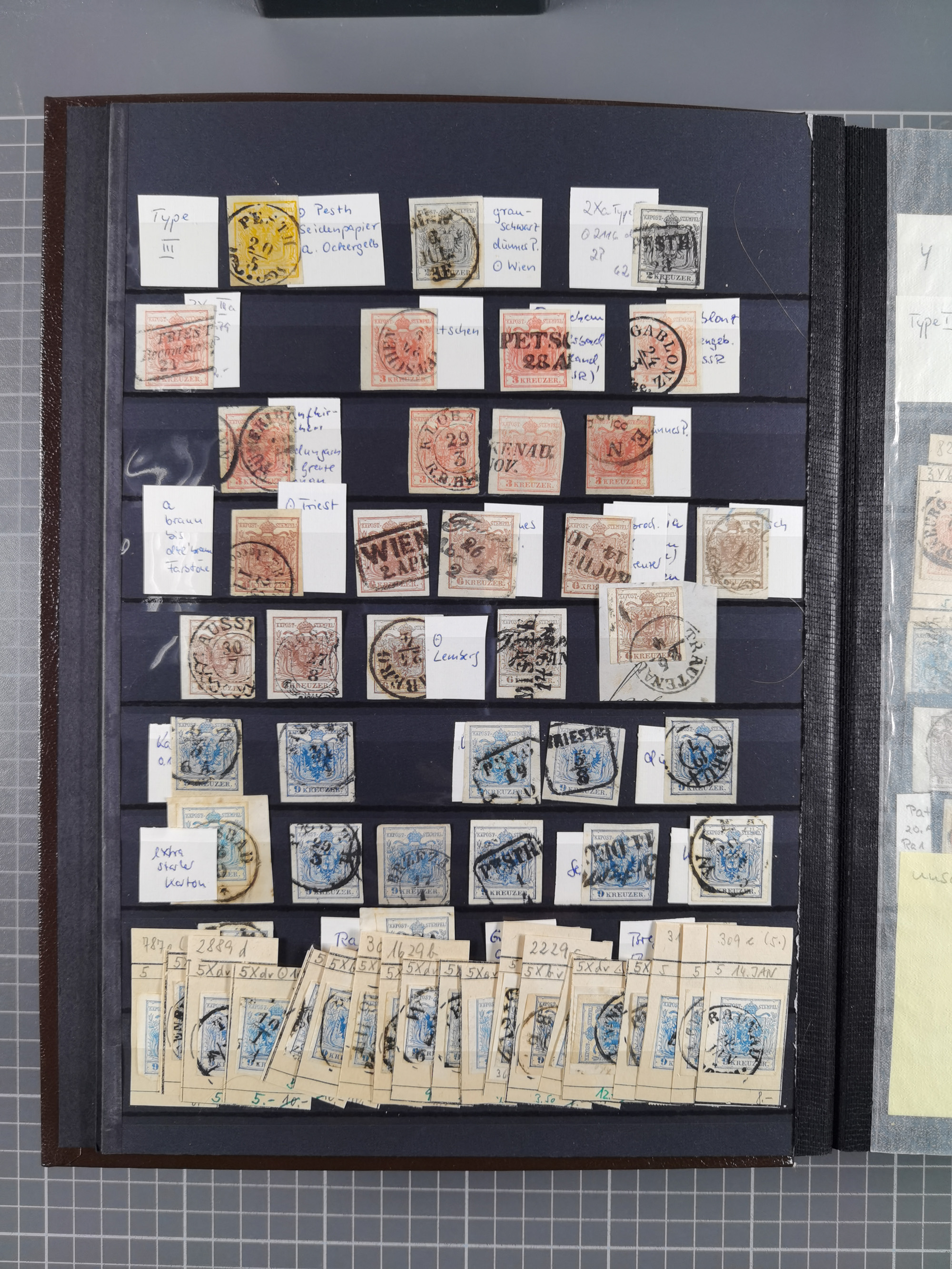 1850/54, 1. Ausgabe, 5 Briefe und 2 Briefstücke, dabei Fahnenstempel von Grinzing und Perchtoldsdorf je auf Brief, blauer L1 Meidling auf Avis und 3 Stücke Post in Rumänien bzw. Serbien. Ein Attest und 3 Befunde.
