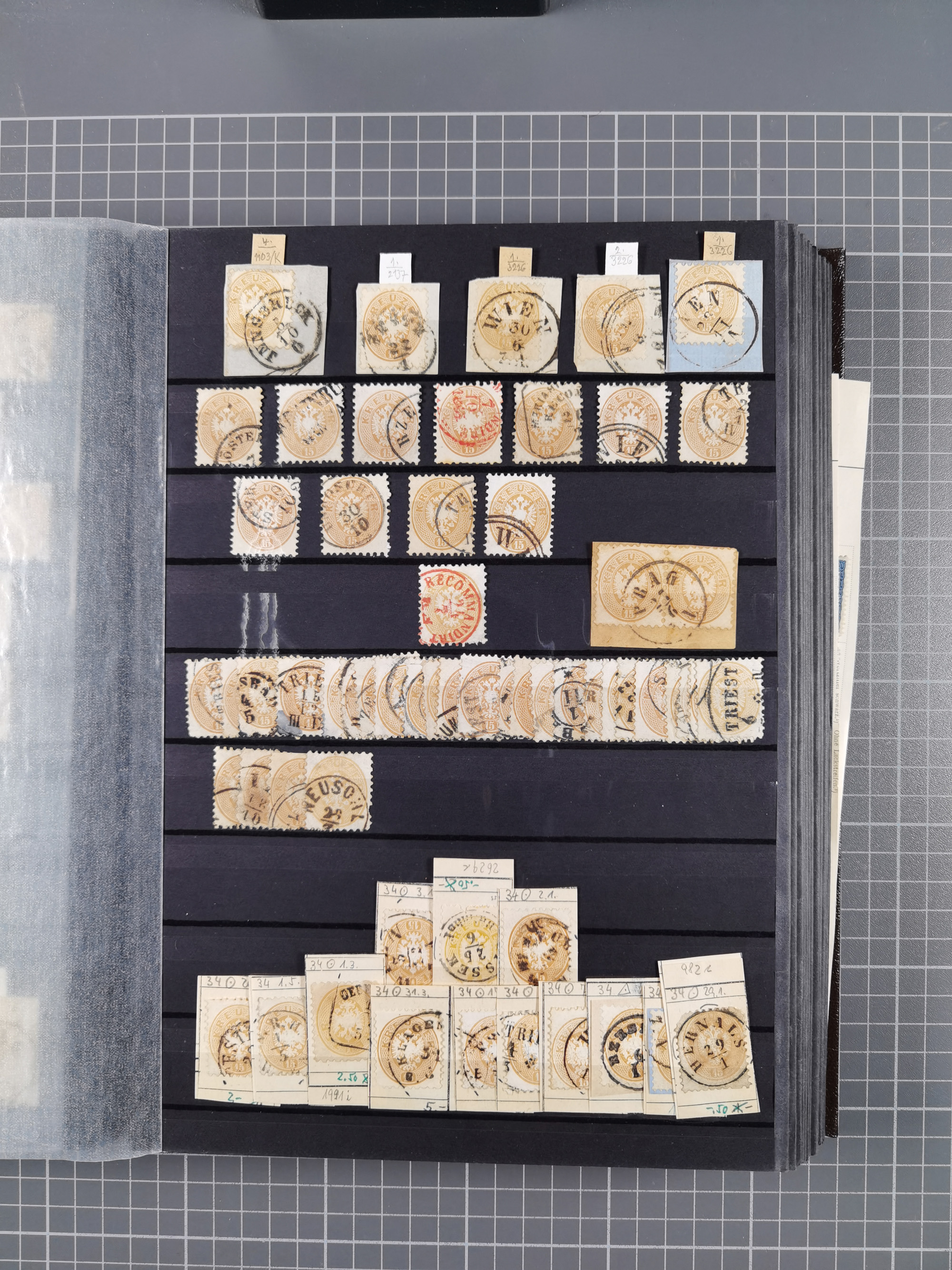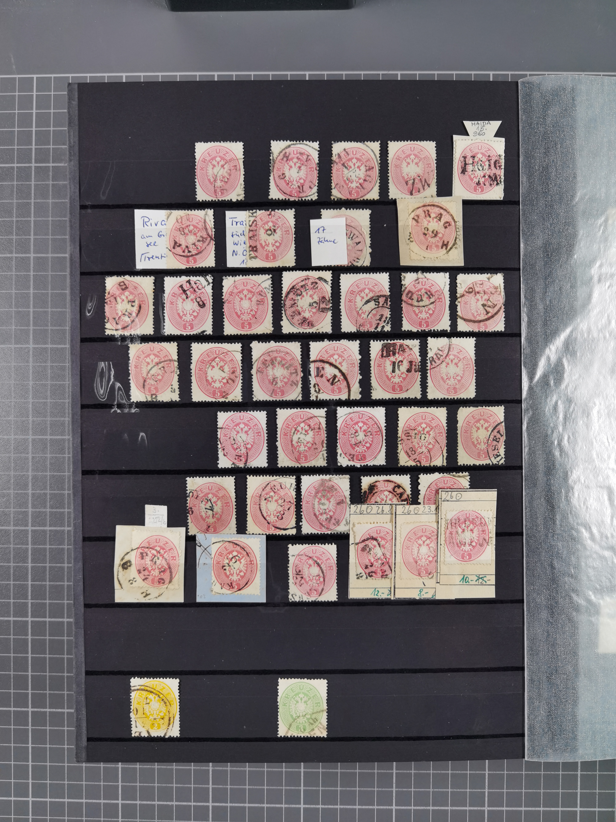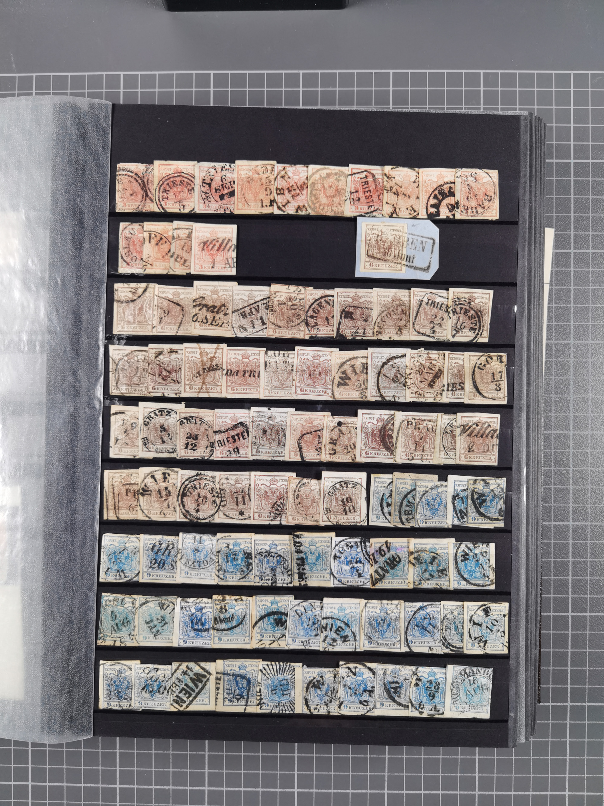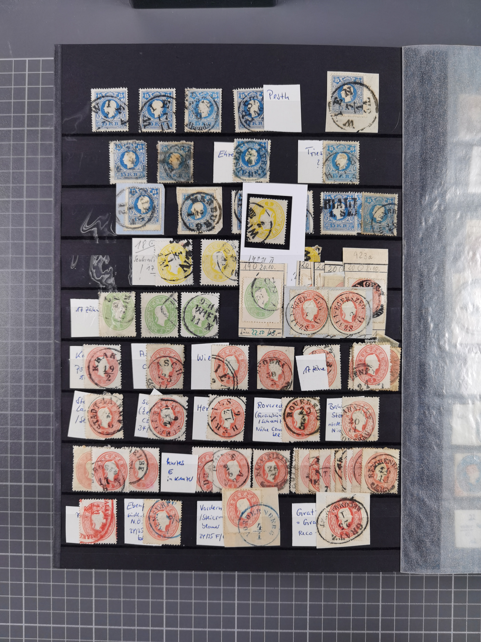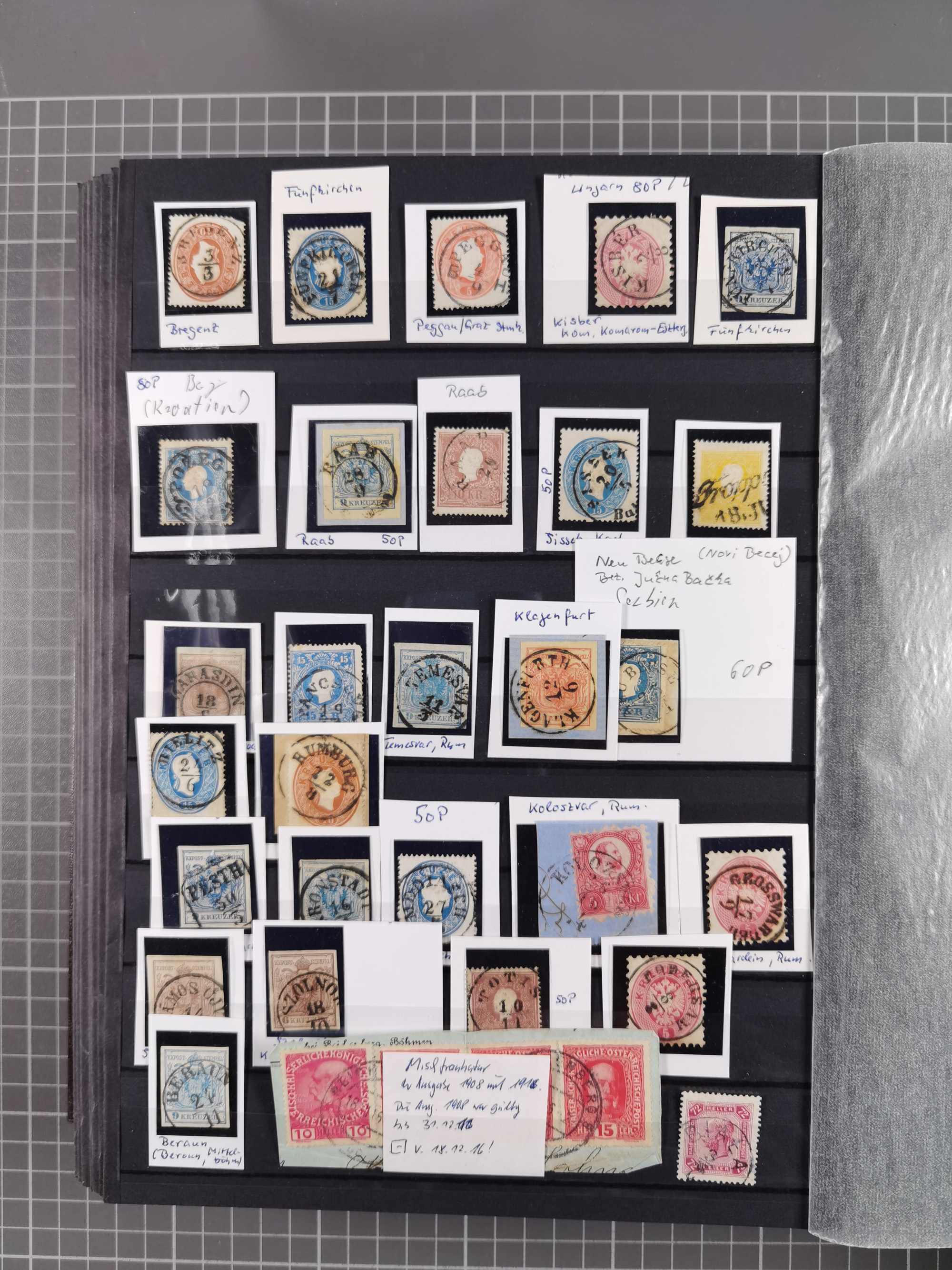 1850/1914, kleine gestempelte Partie mit 16 Briefen und Karten, dabei bessere Stücke mit u.a. Mi.-Nr. 3X (gefaltet) mit “LEOBEN 4. JUNI (1850)” auf Faltbrief nach Vordernberg (erste Woche der Verwendung), Mi.-Nr. 1 mit blauem “HRASTINGO” auf Drucksache-Streifband nach Pesth, Schiffspost mit “METKOVIC-TRIEST 16 III 14 32” auf R-zettel auf Umschlag nach Triest, etc., die Erhaltung etwas leicht unterschiedlich