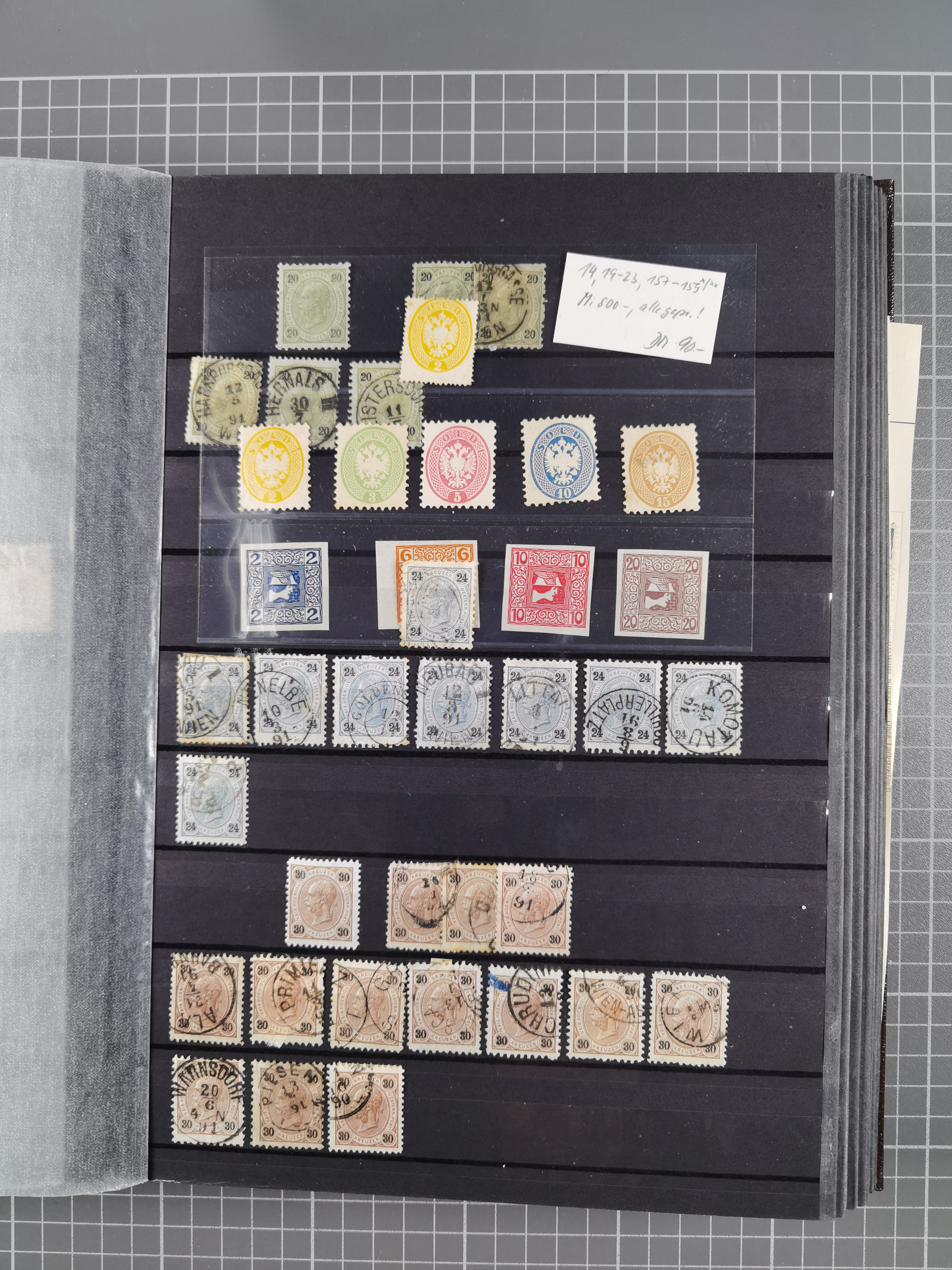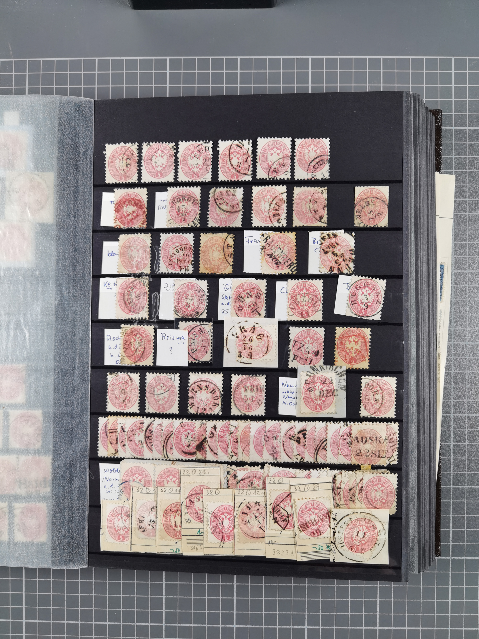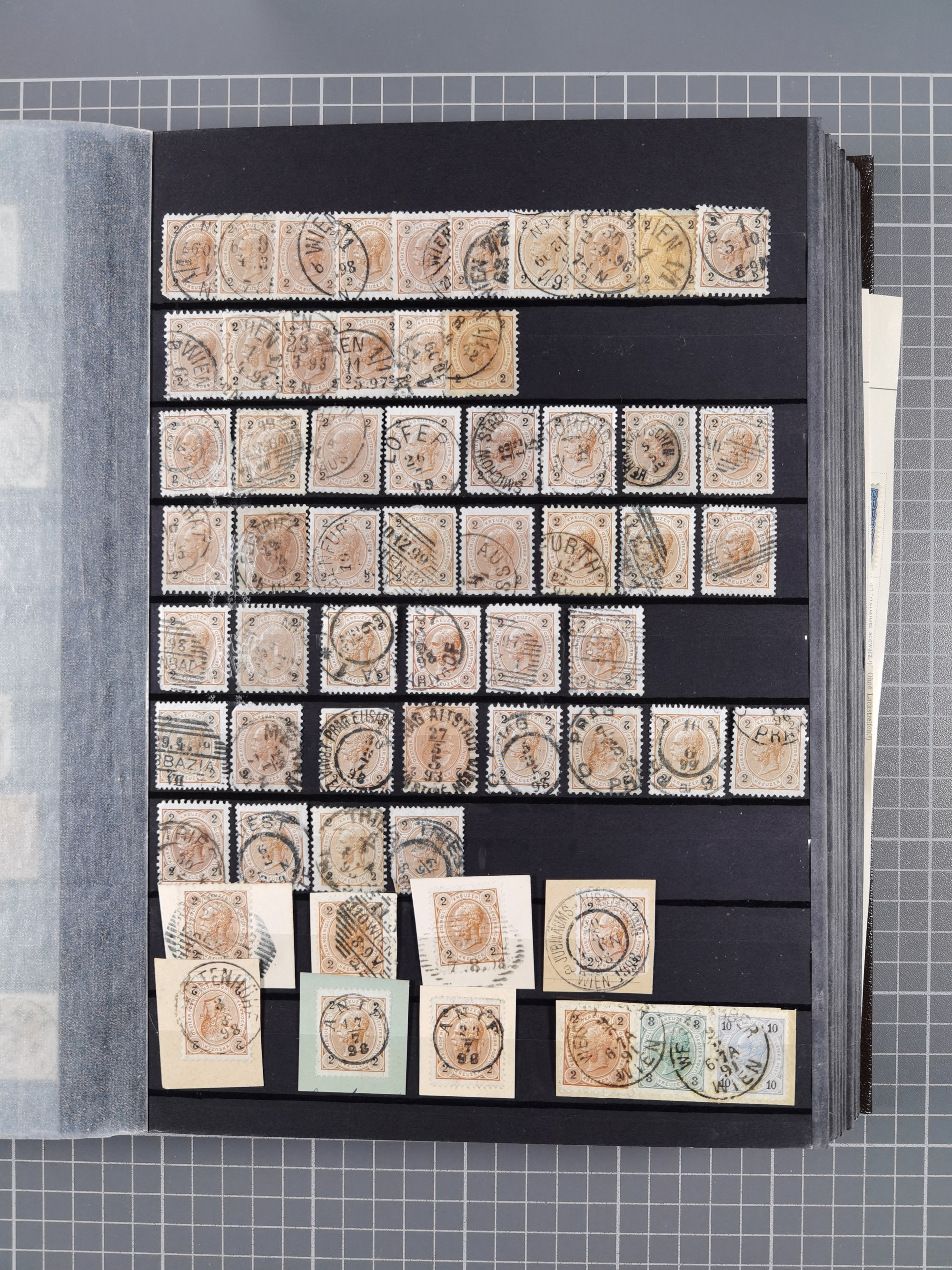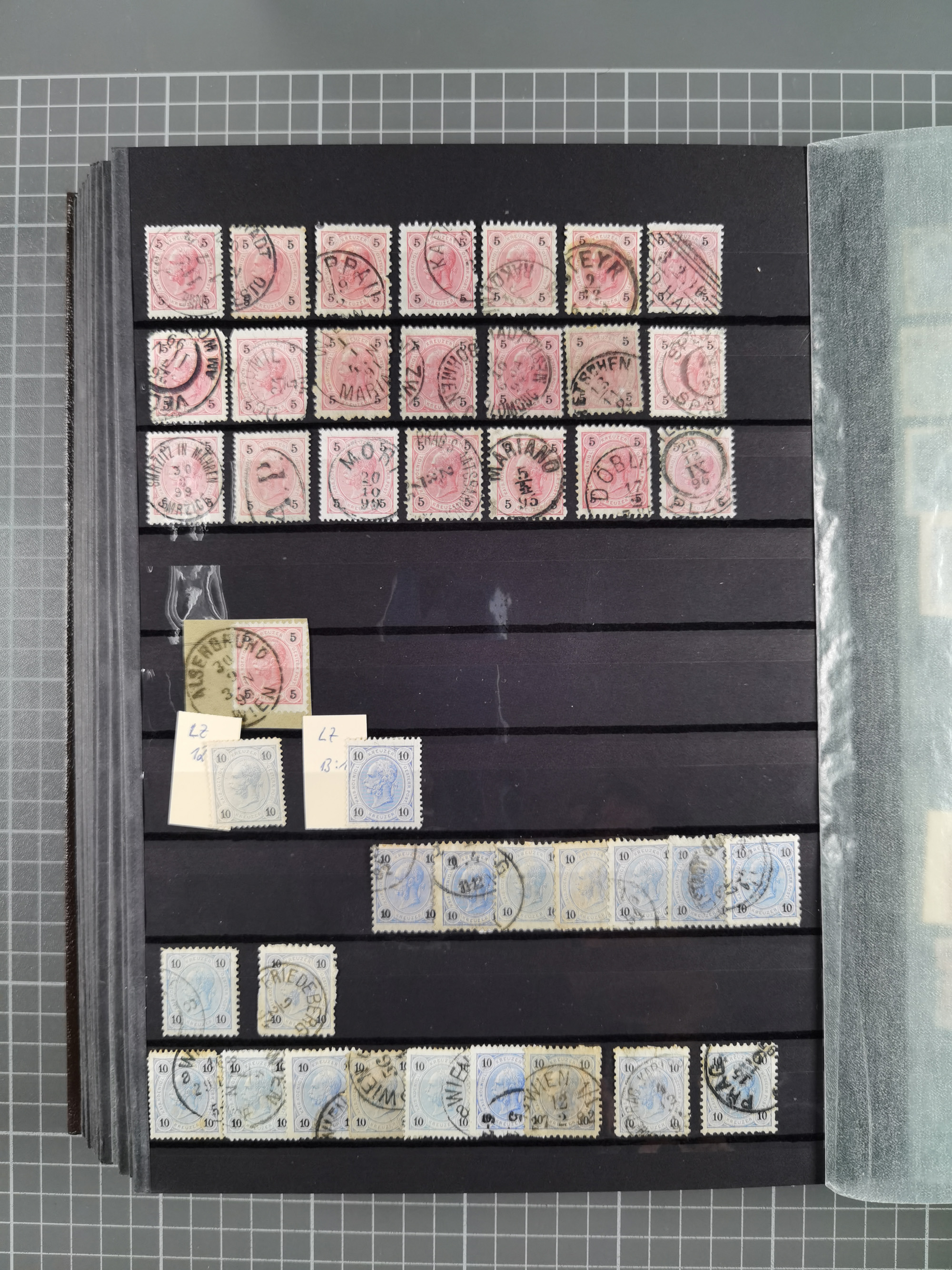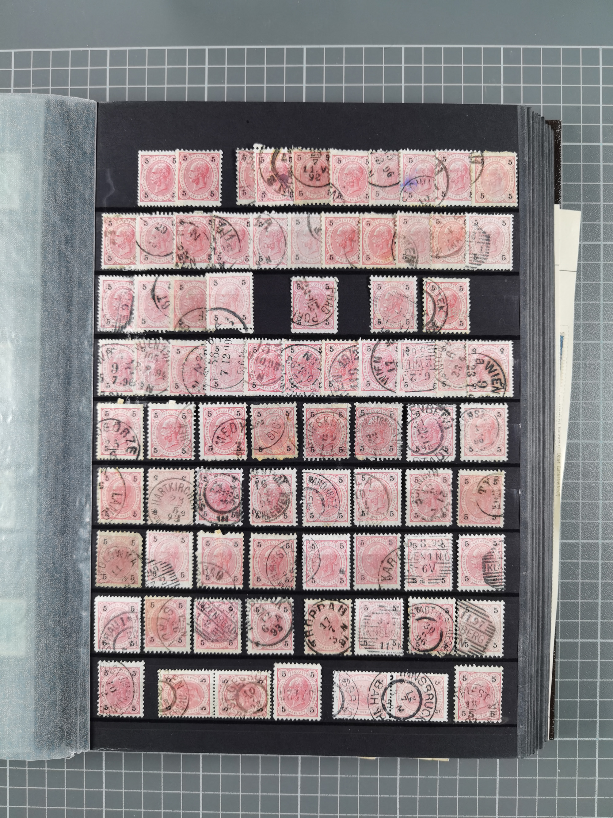 1883/90 (ca.), große aufgezogene Sammlung “Stempeltypen auf den Ausgaben 1883/90” mit über 320 Briefen und Karten, viele lose Marken und Briefstücke mit meist klaren Abstempelungen, dabei u.a. Langstempeln mit “KORSZÓW” in blau auf Briefstück, Ovalstempel “K.K. POSTAMT WOLFSBERG” auf 5 Kr. auf Brief nach Graz, “DNESPEK” auf Briefstück, etc., schöne Auswahl an Fingerhutstempeln, einige R-Briefe. Ein interessantes Objekt, sauber sortiert auf selbst gestalteten Albenblättern, in 4 Alben