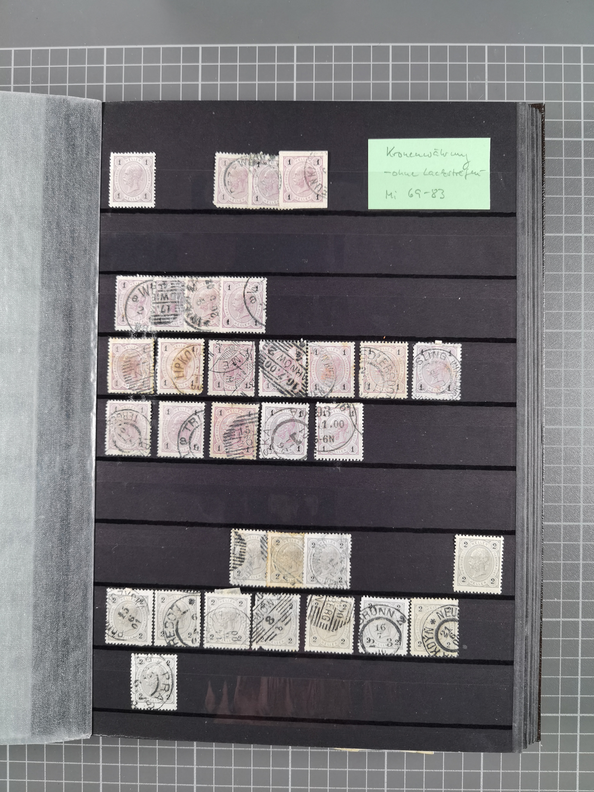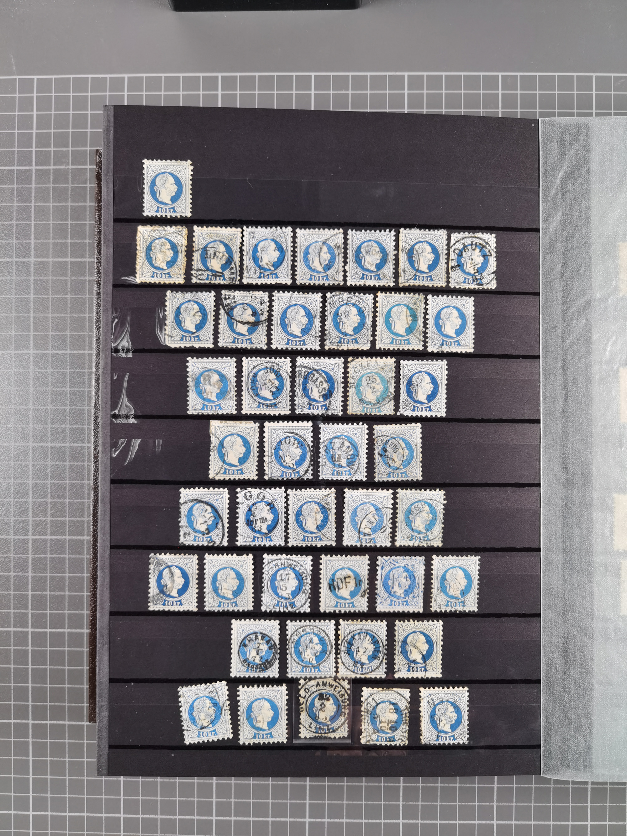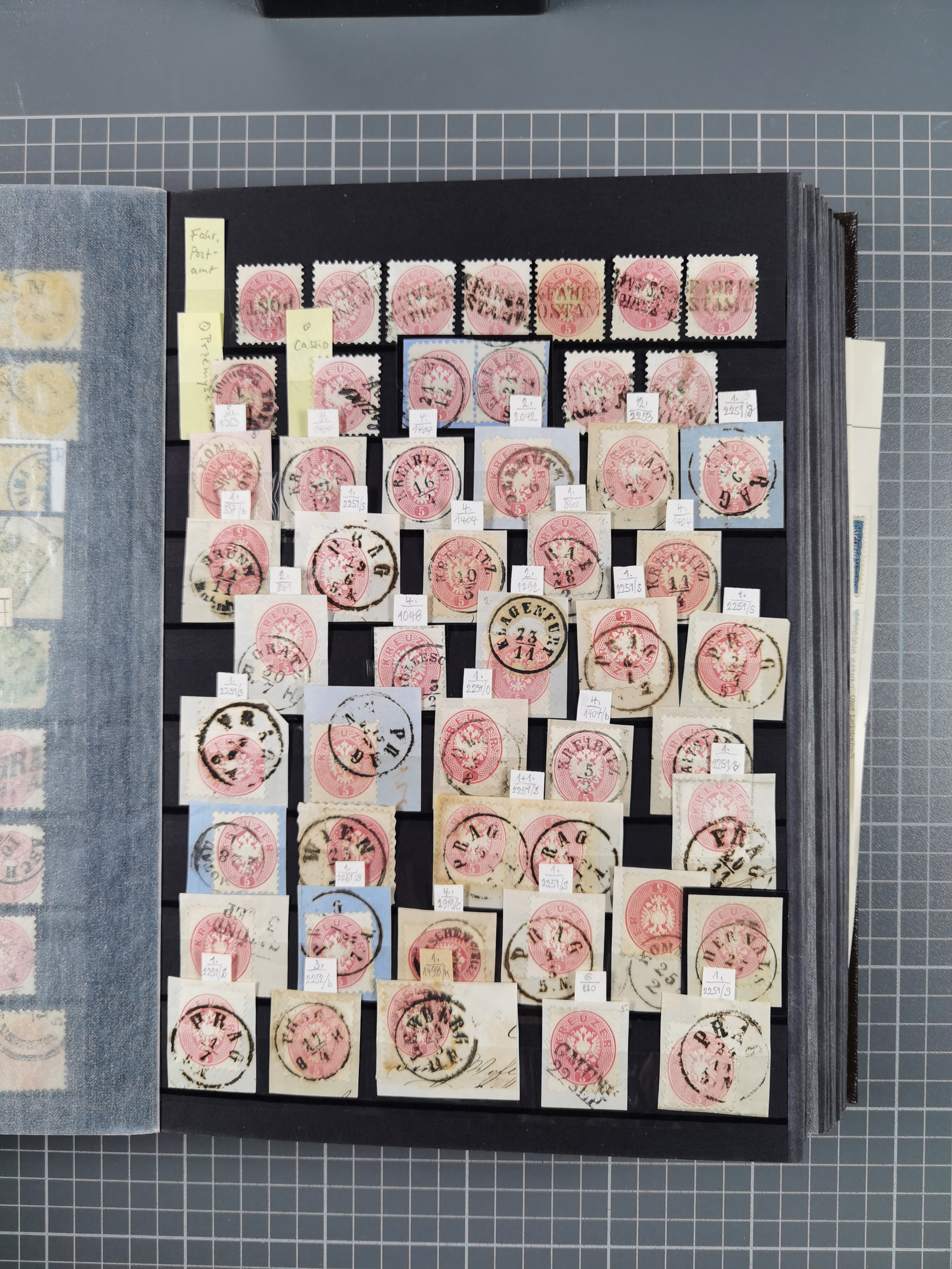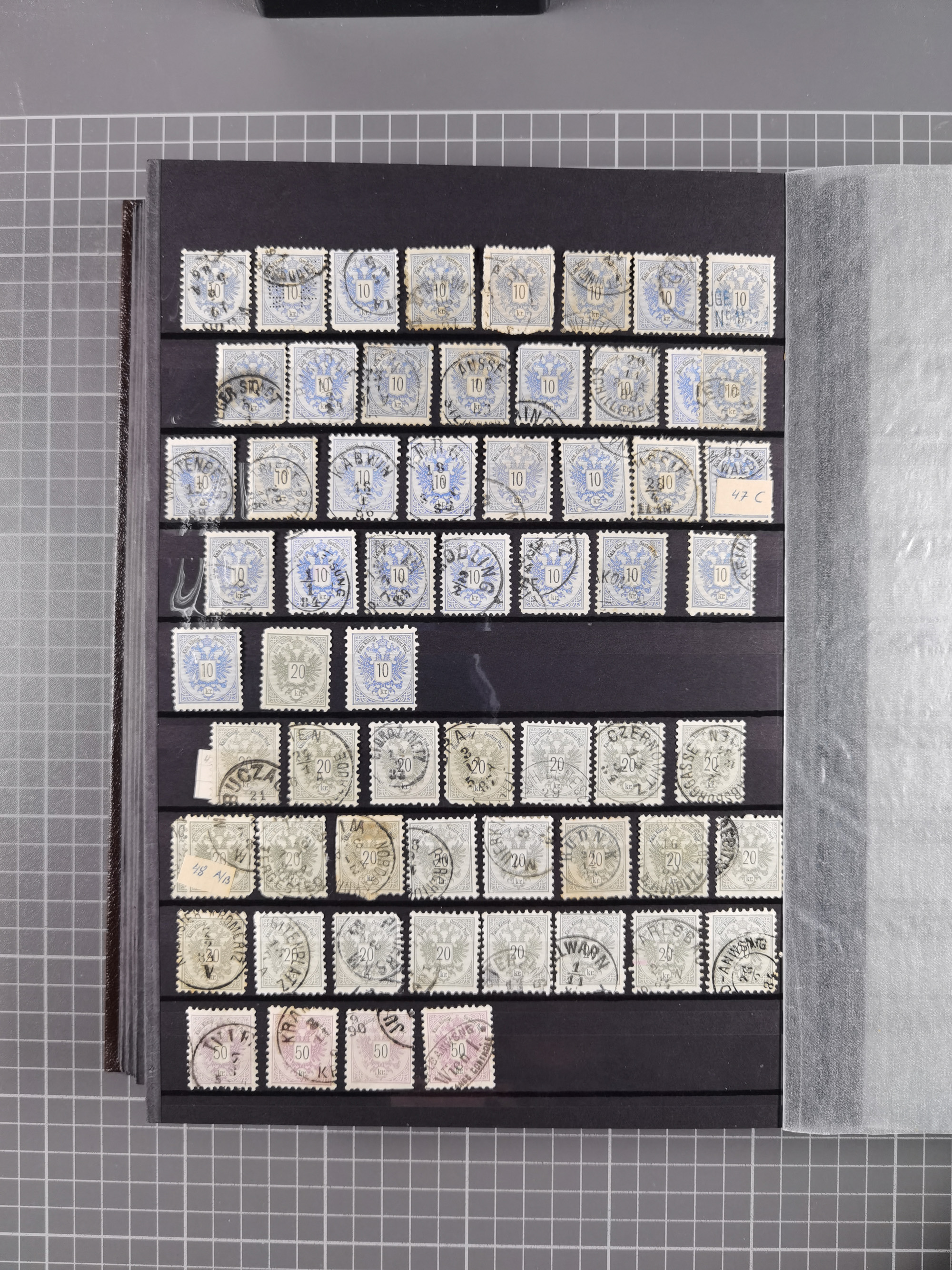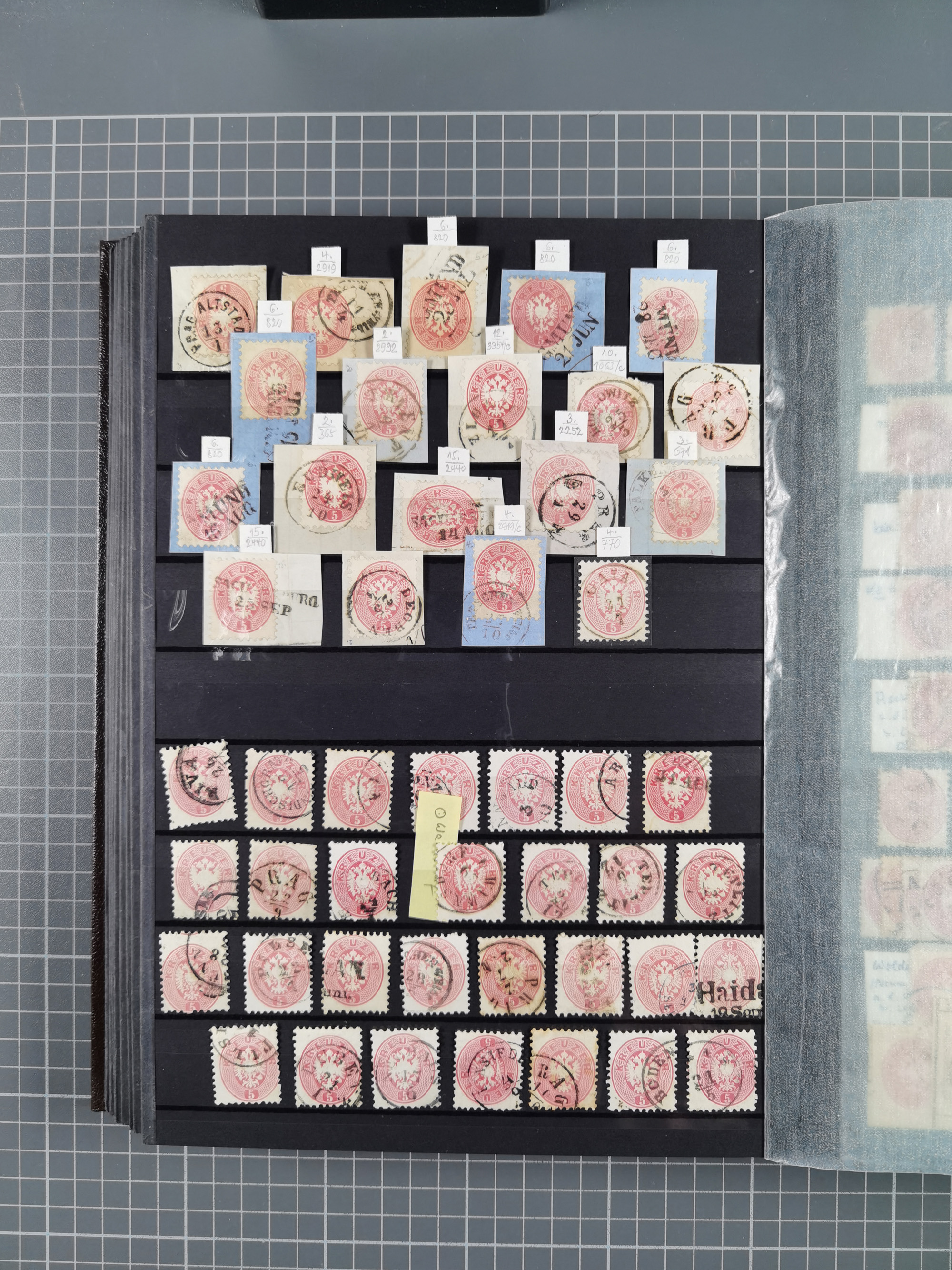 1883/90 (ca.), große aufgezogene Sammlung “Stempeltypen auf den Ausgaben 1883/90” mit über 320 Briefen und Karten, viele lose Marken und Briefstücke mit meist klaren Abstempelungen, dabei u.a. Langstempeln mit “KORSZÓW” in blau auf Briefstück, Ovalstempel “K.K. POSTAMT WOLFSBERG” auf 5 Kr. auf Brief nach Graz, “DNESPEK” auf Briefstück, etc., schöne Auswahl an Fingerhutstempeln, einige R-Briefe. Ein interessantes Objekt, sauber sortiert auf selbst gestalteten Albenblättern, in 4 Alben