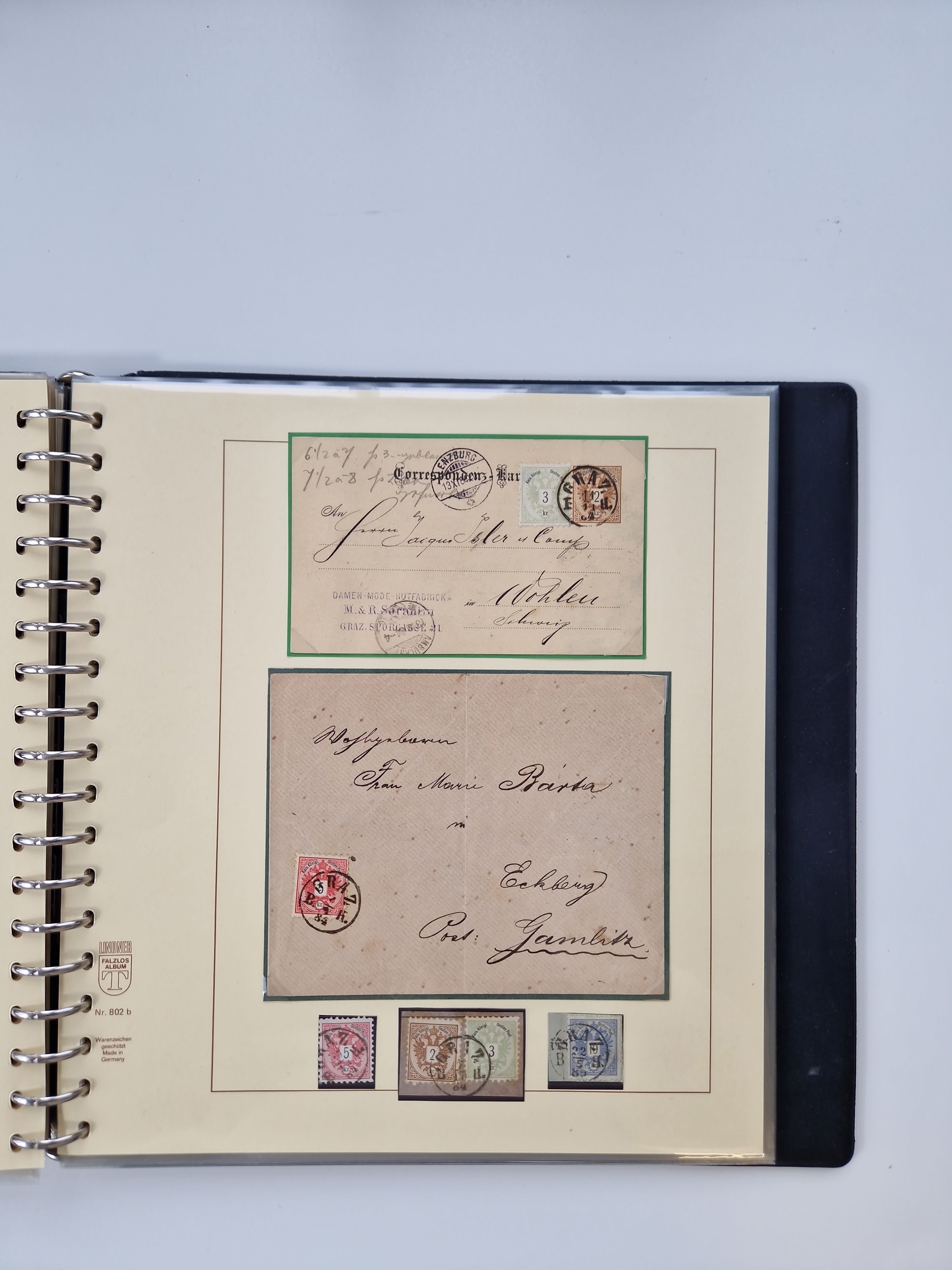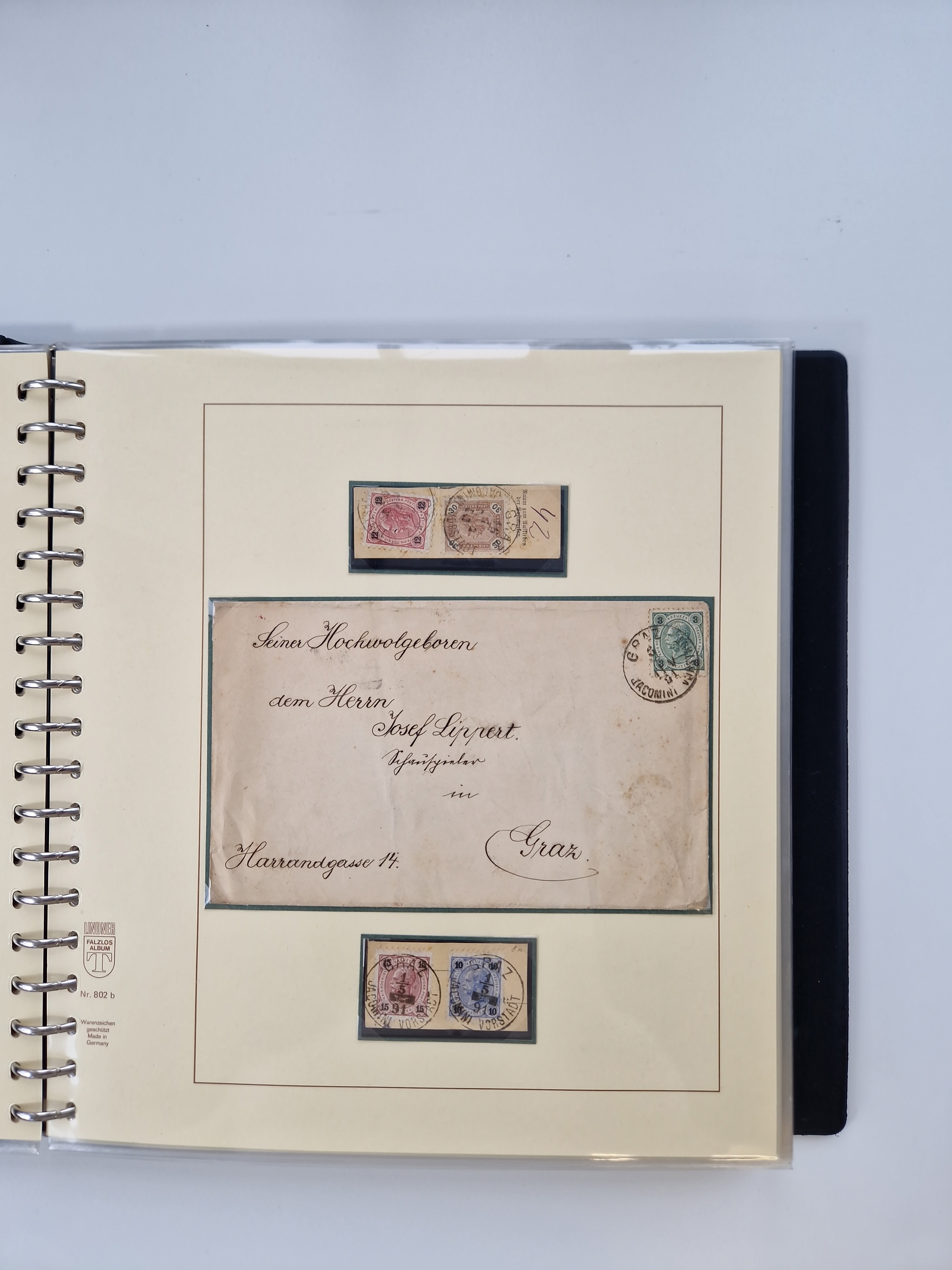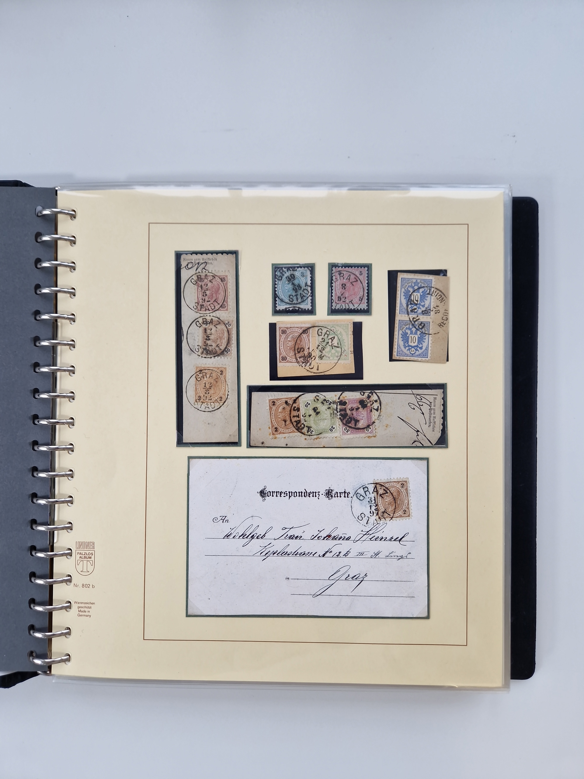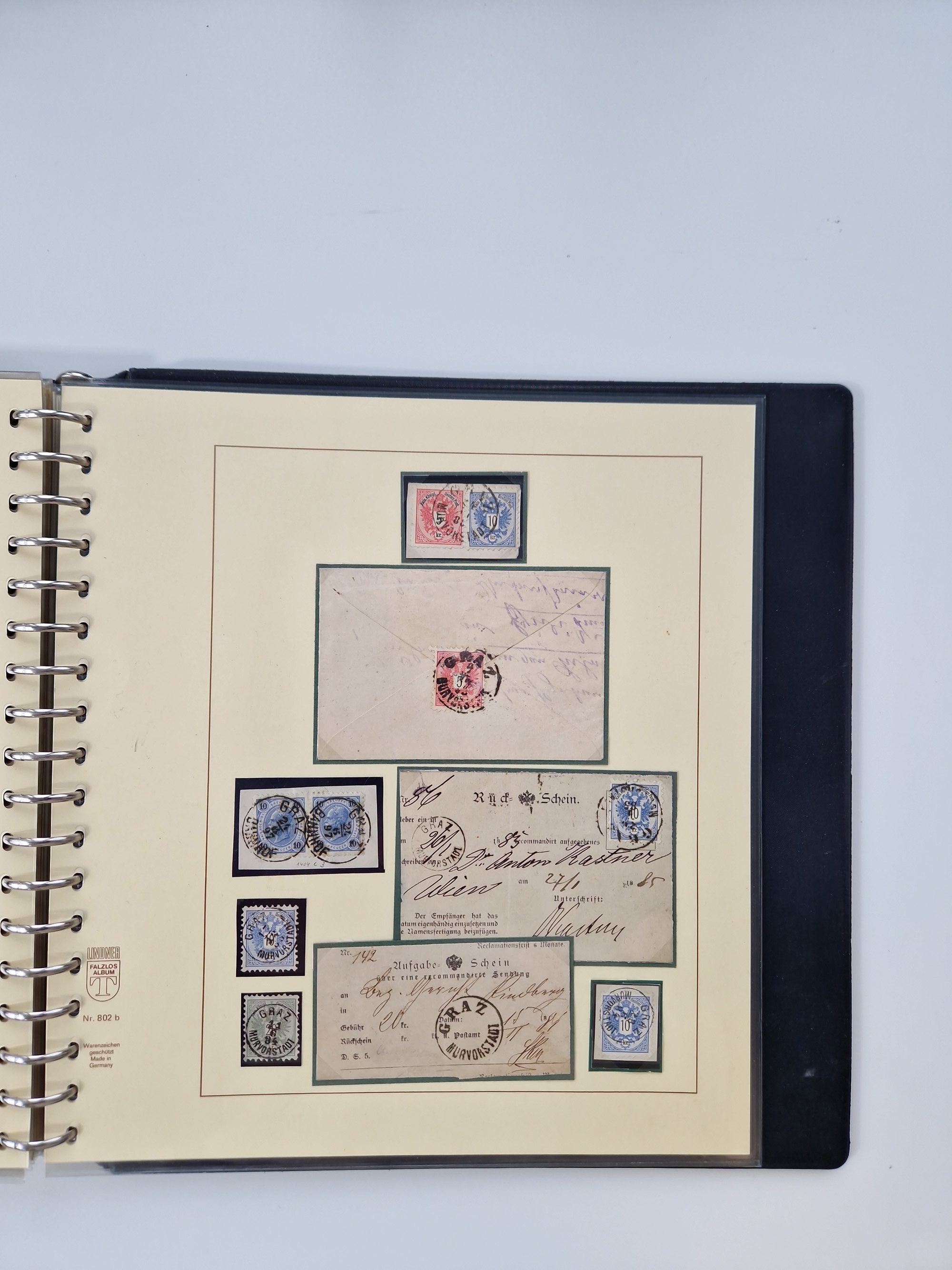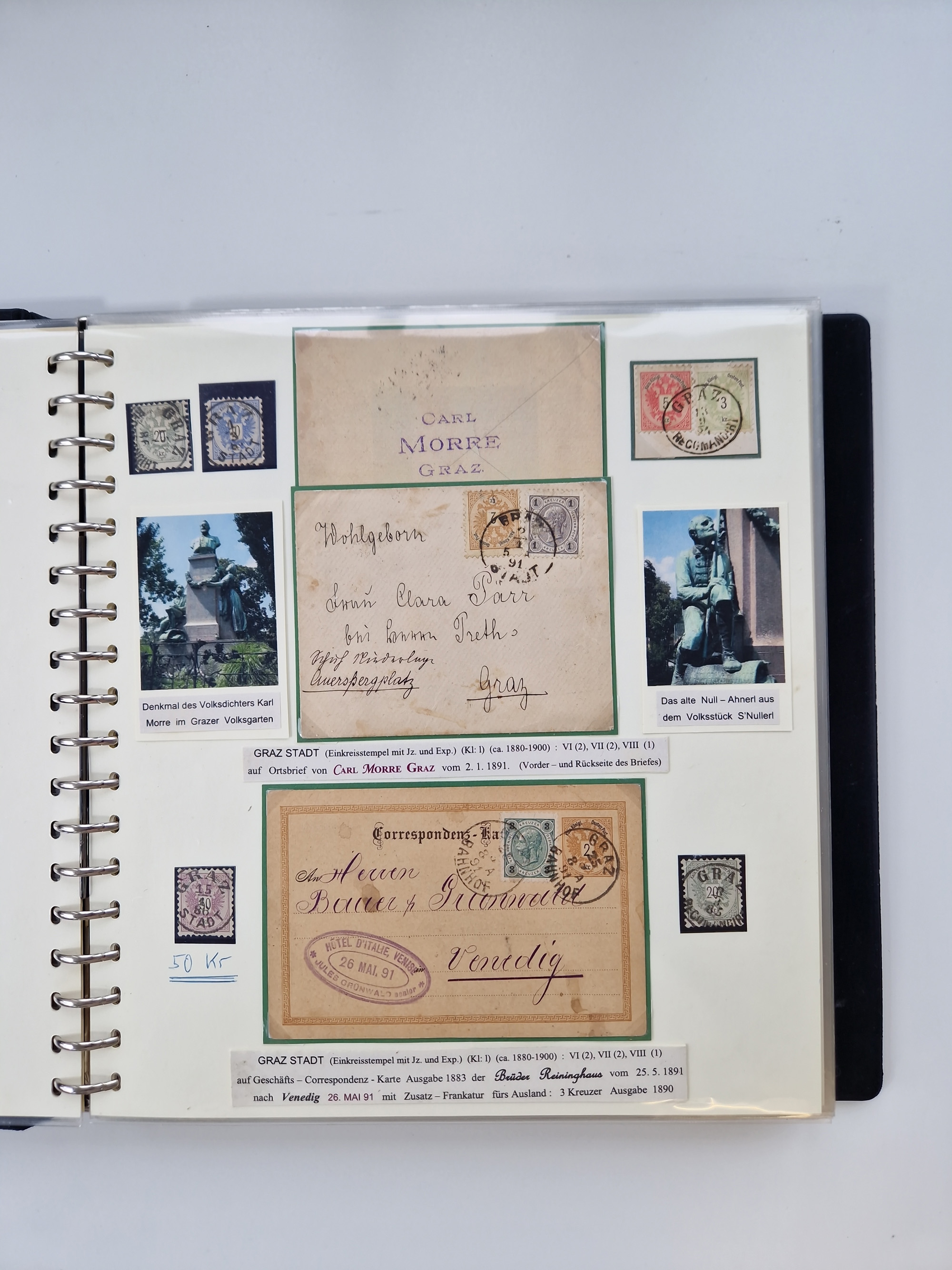 1850/1919 (ca.), zahlreiche aufgezogene Heimat-Sammlung “GRAZ” und Umgebung Andritz bis Zettling, mit über 220 Briefen und Karten, besseren Einzel- und Mehrfachfrankaturen, Buntfrankaturen sowie R-Briefen, Ansichtkarten mit Lithos und weiteren Besonderheiten, Schwerpunkt bei den Ausgaben 1883 bis 1899, dabei u.a. Destination Finnland, 1897 R-Brief auf “BRUXELLES” nach Graz weitergeleitet mit Mischfrankatur, ferner lose Marken und Briefstücke ab Ausgabe 1850 mit meist klaren Stempel-Abschlägen, “PUNTIGEN” auf 6 Kr. (Müller.-Nr. 2276a, 150 Punkte), etc., dabei auch Postscheine, Postanweisungen, Paketkarten oder Recepissen. Ein außerordentlich reichaltiges und interessantes Objekt, zusammen in 4 Alben