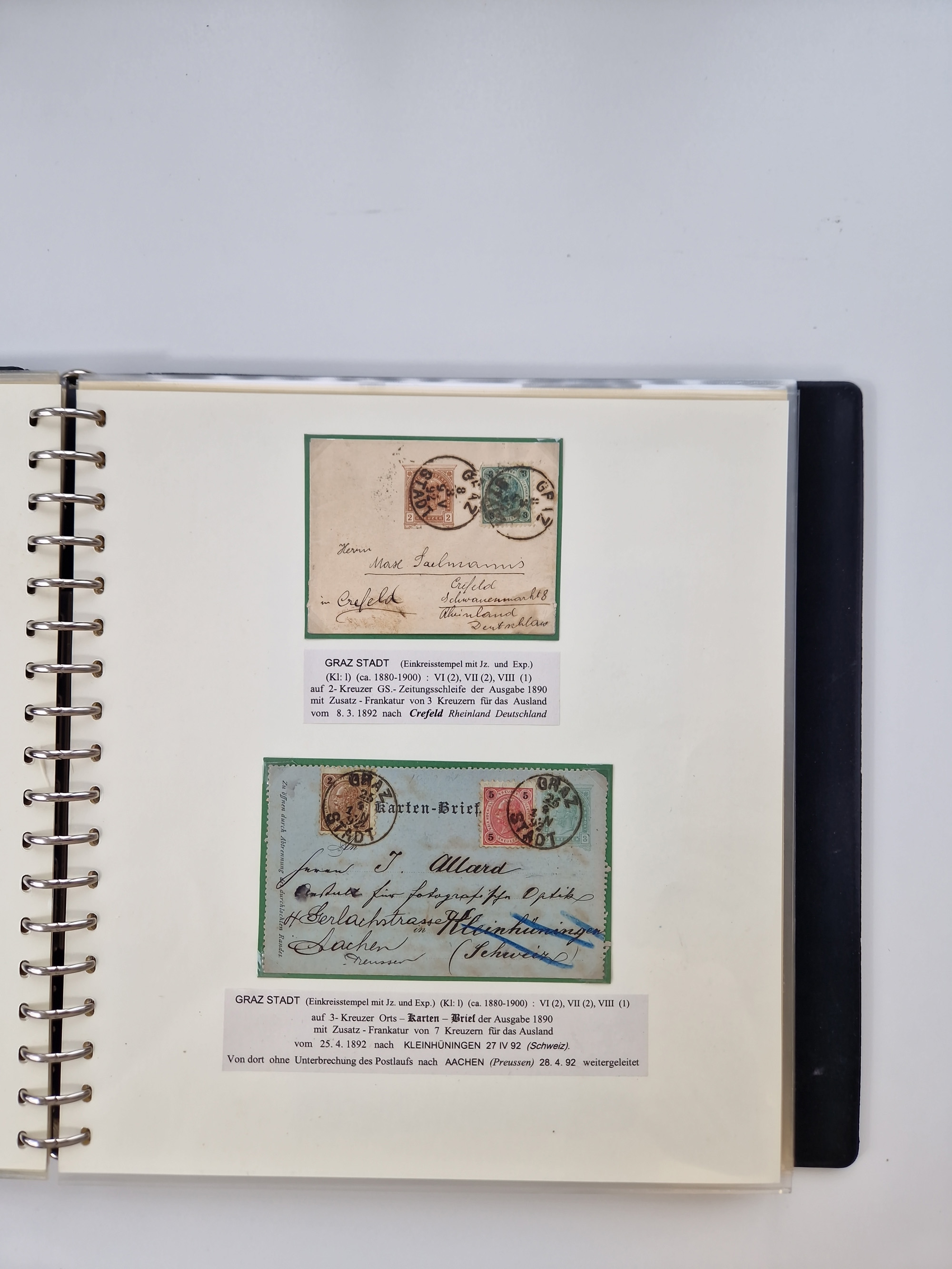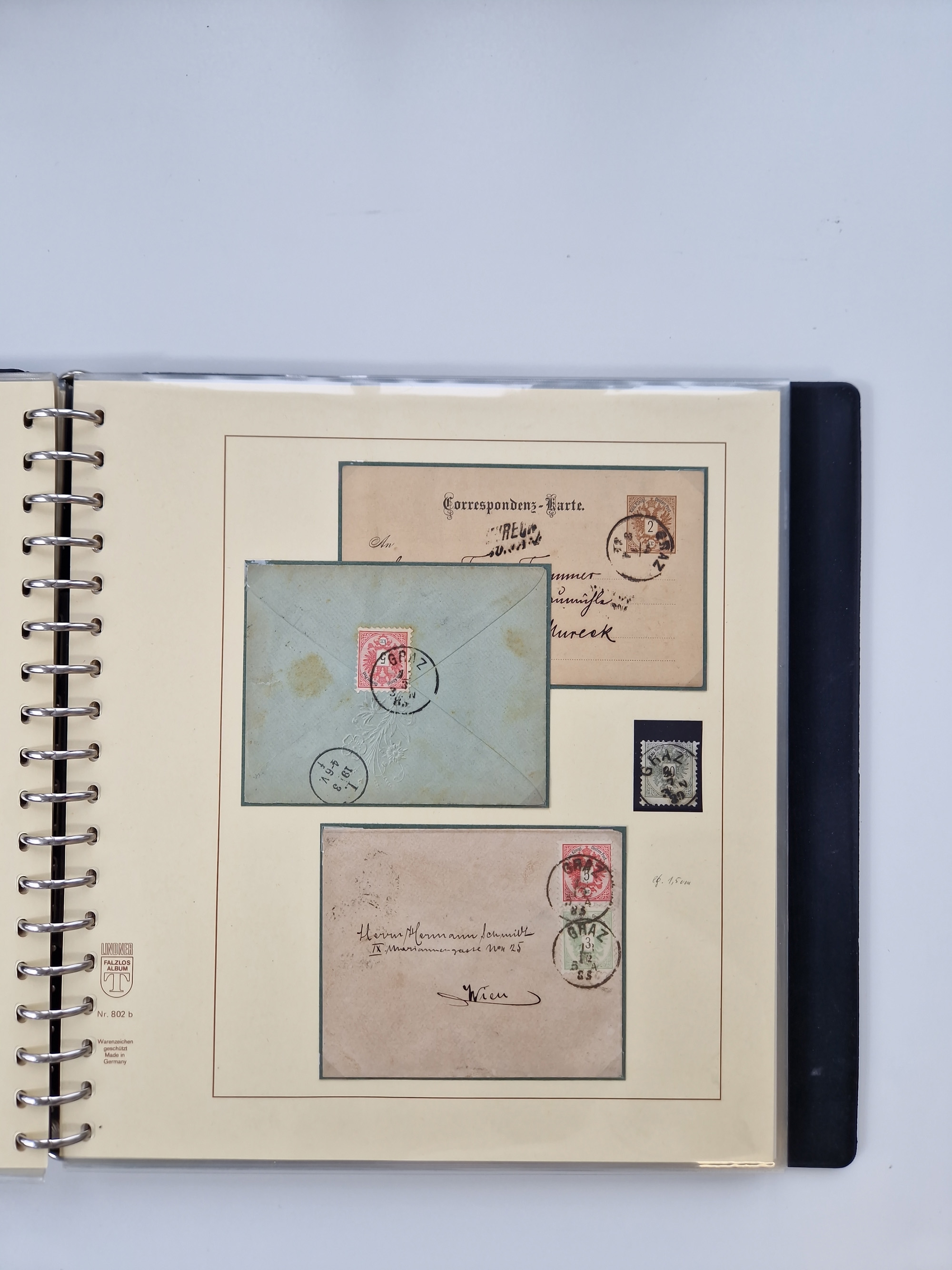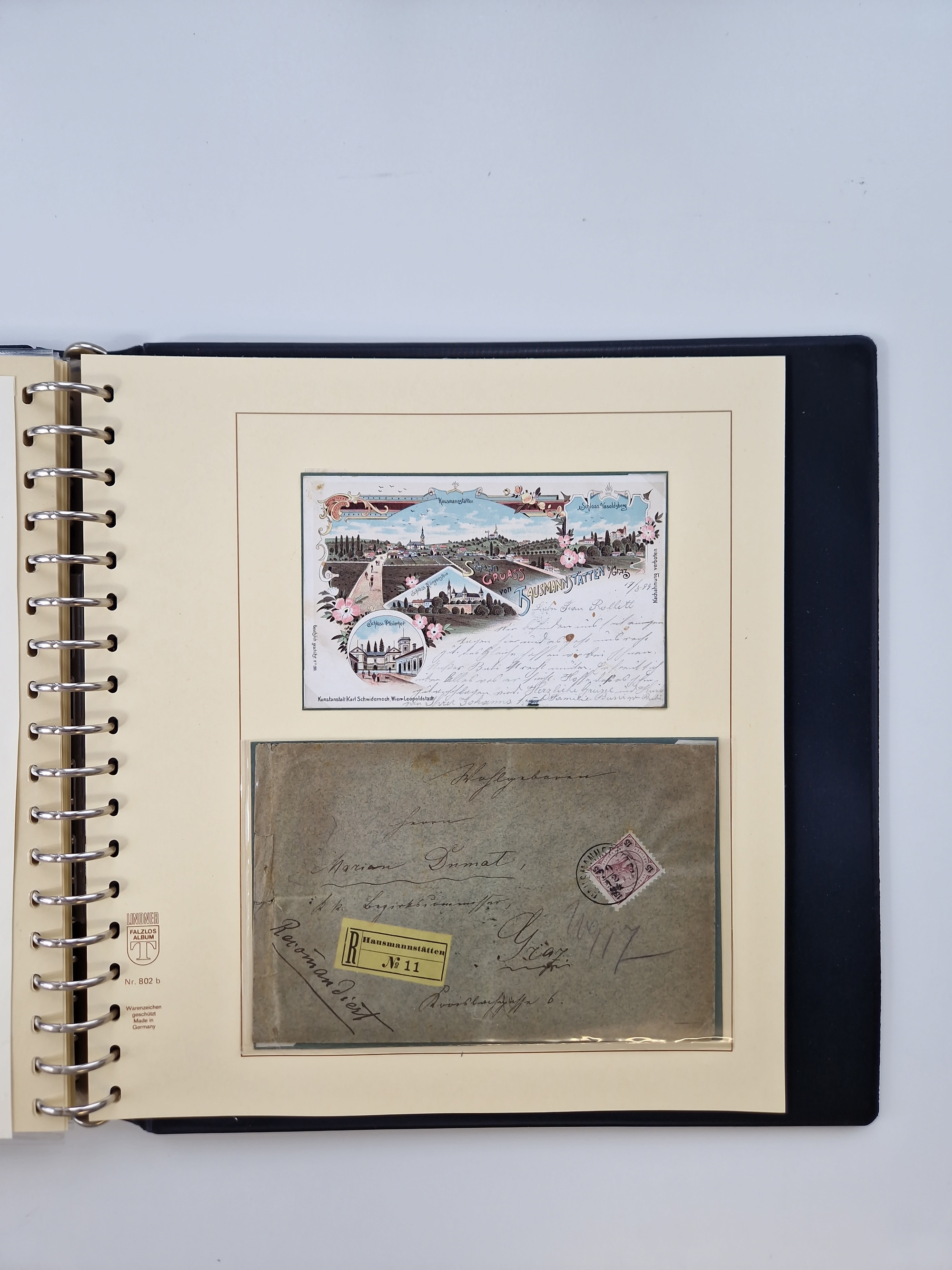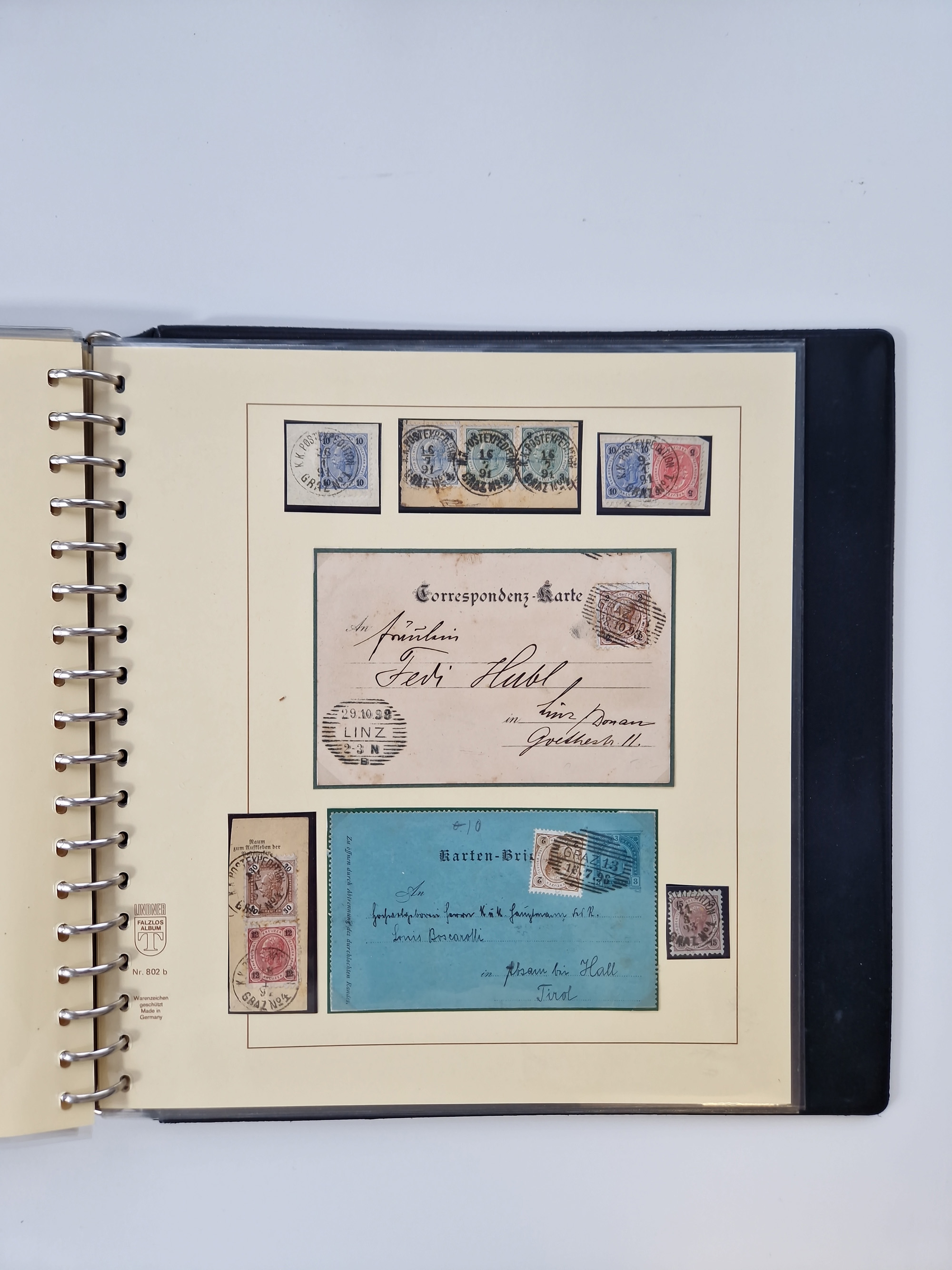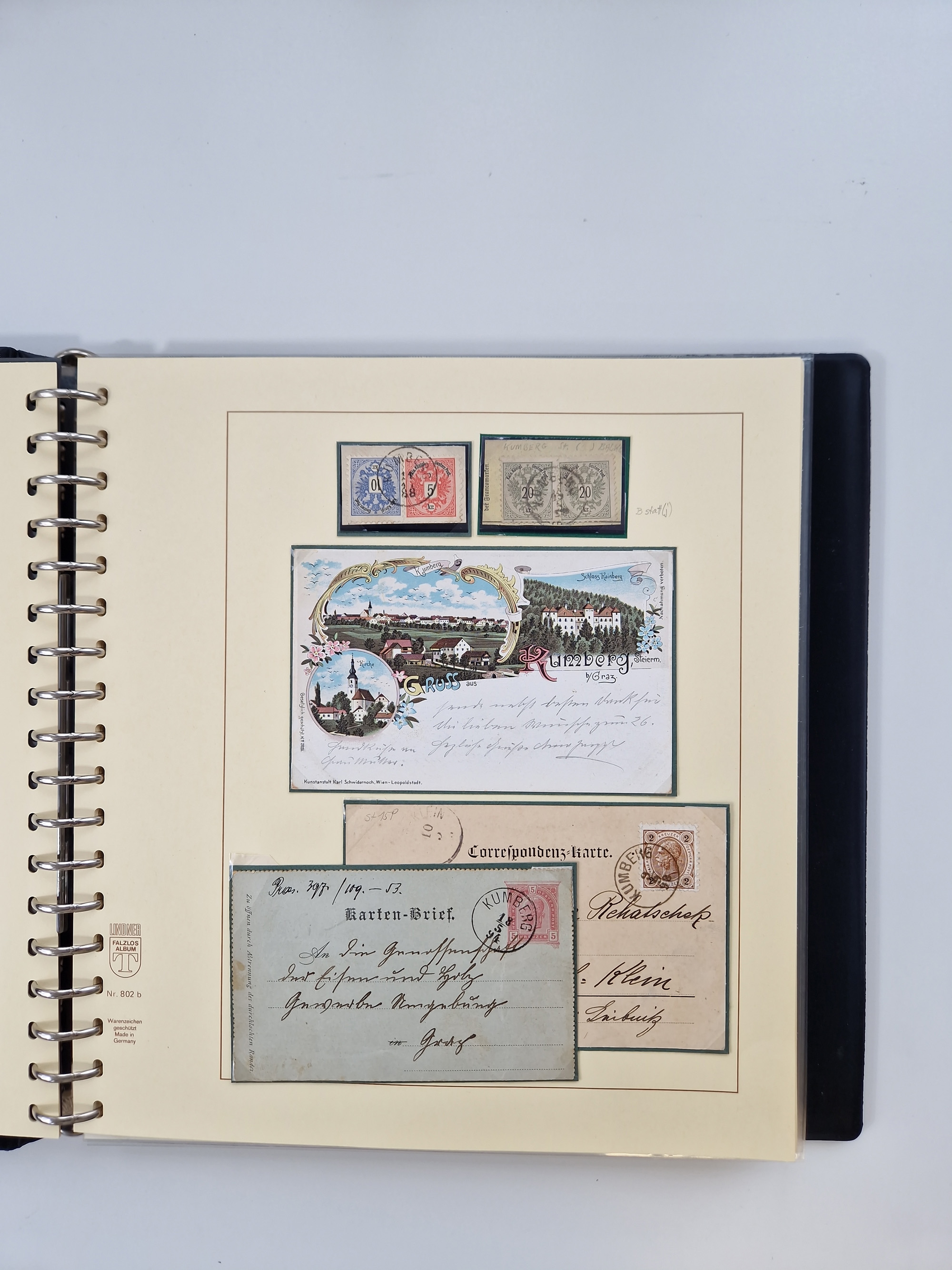 1850/1919 (ca.), zahlreiche aufgezogene Heimat-Sammlung “GRAZ” und Umgebung Andritz bis Zettling, mit über 220 Briefen und Karten, besseren Einzel- und Mehrfachfrankaturen, Buntfrankaturen sowie R-Briefen, Ansichtkarten mit Lithos und weiteren Besonderheiten, Schwerpunkt bei den Ausgaben 1883 bis 1899, dabei u.a. Destination Finnland, 1897 R-Brief auf “BRUXELLES” nach Graz weitergeleitet mit Mischfrankatur, ferner lose Marken und Briefstücke ab Ausgabe 1850 mit meist klaren Stempel-Abschlägen, “PUNTIGEN” auf 6 Kr. (Müller.-Nr. 2276a, 150 Punkte), etc., dabei auch Postscheine, Postanweisungen, Paketkarten oder Recepissen. Ein außerordentlich reichaltiges und interessantes Objekt, zusammen in 4 Alben