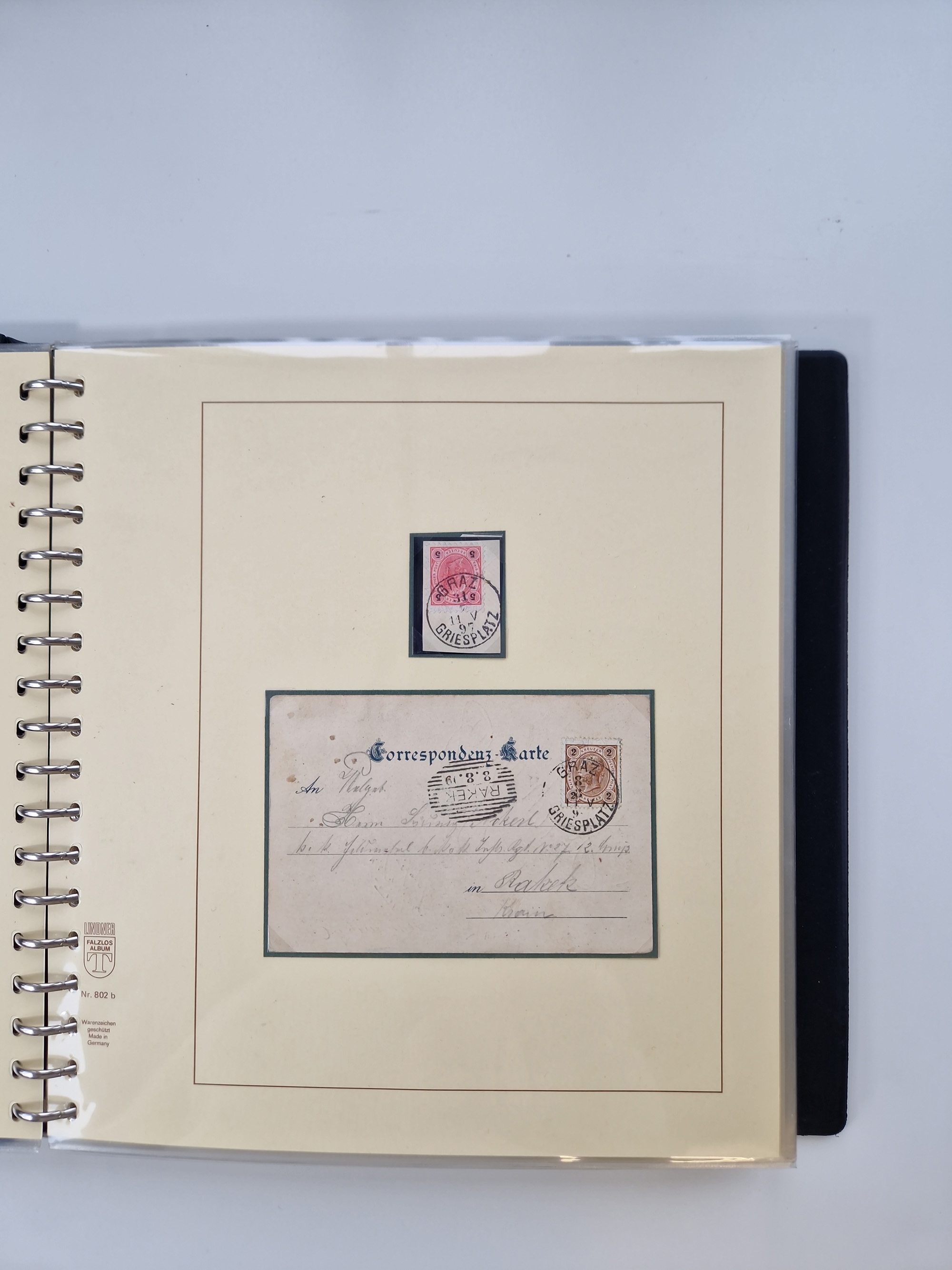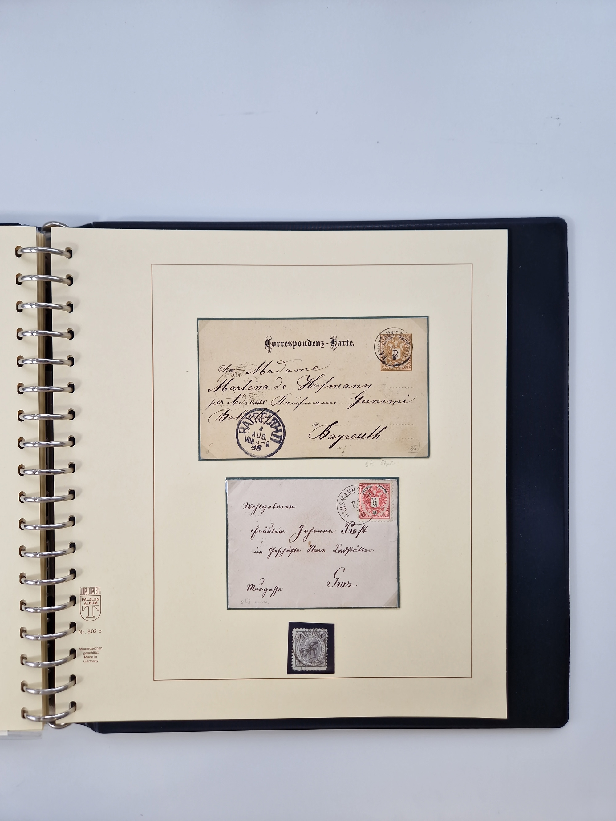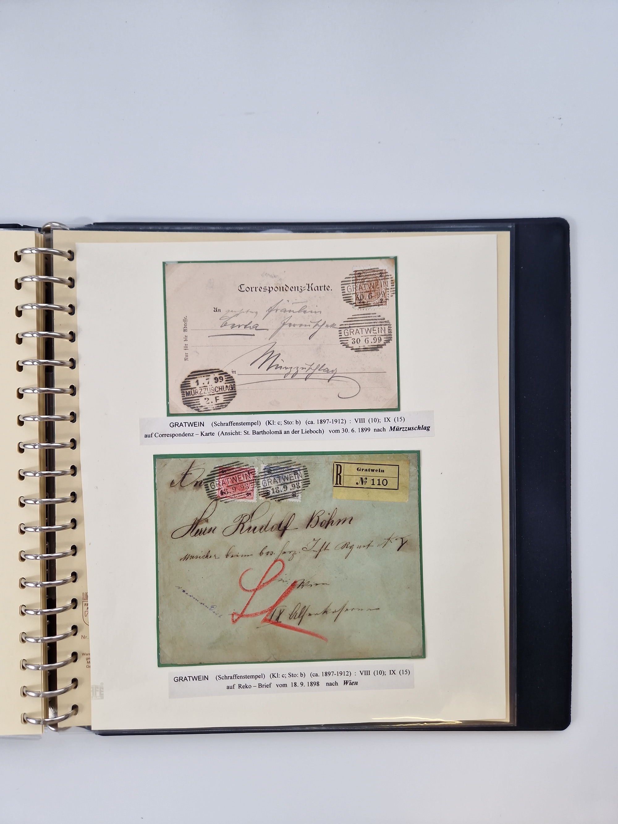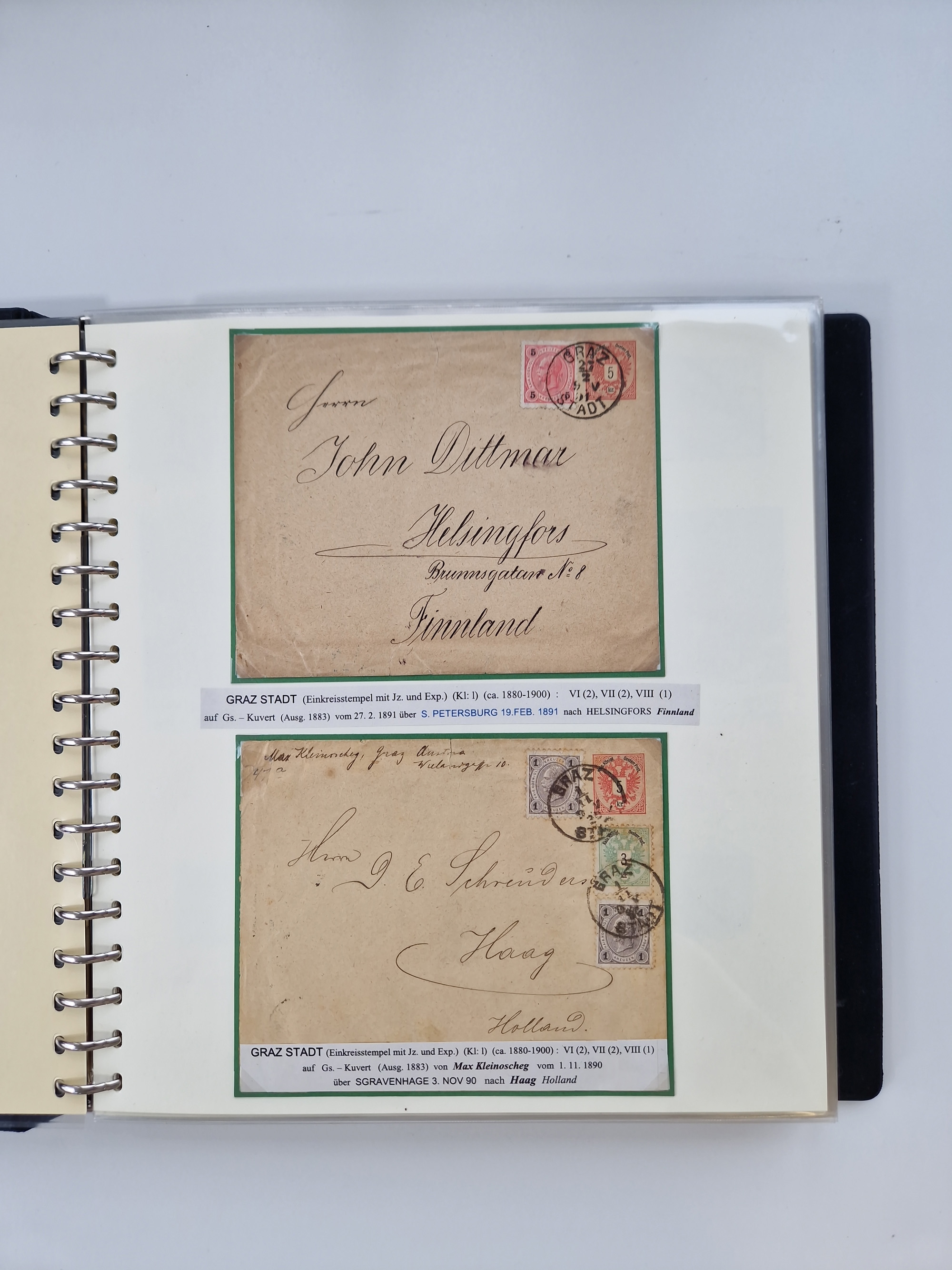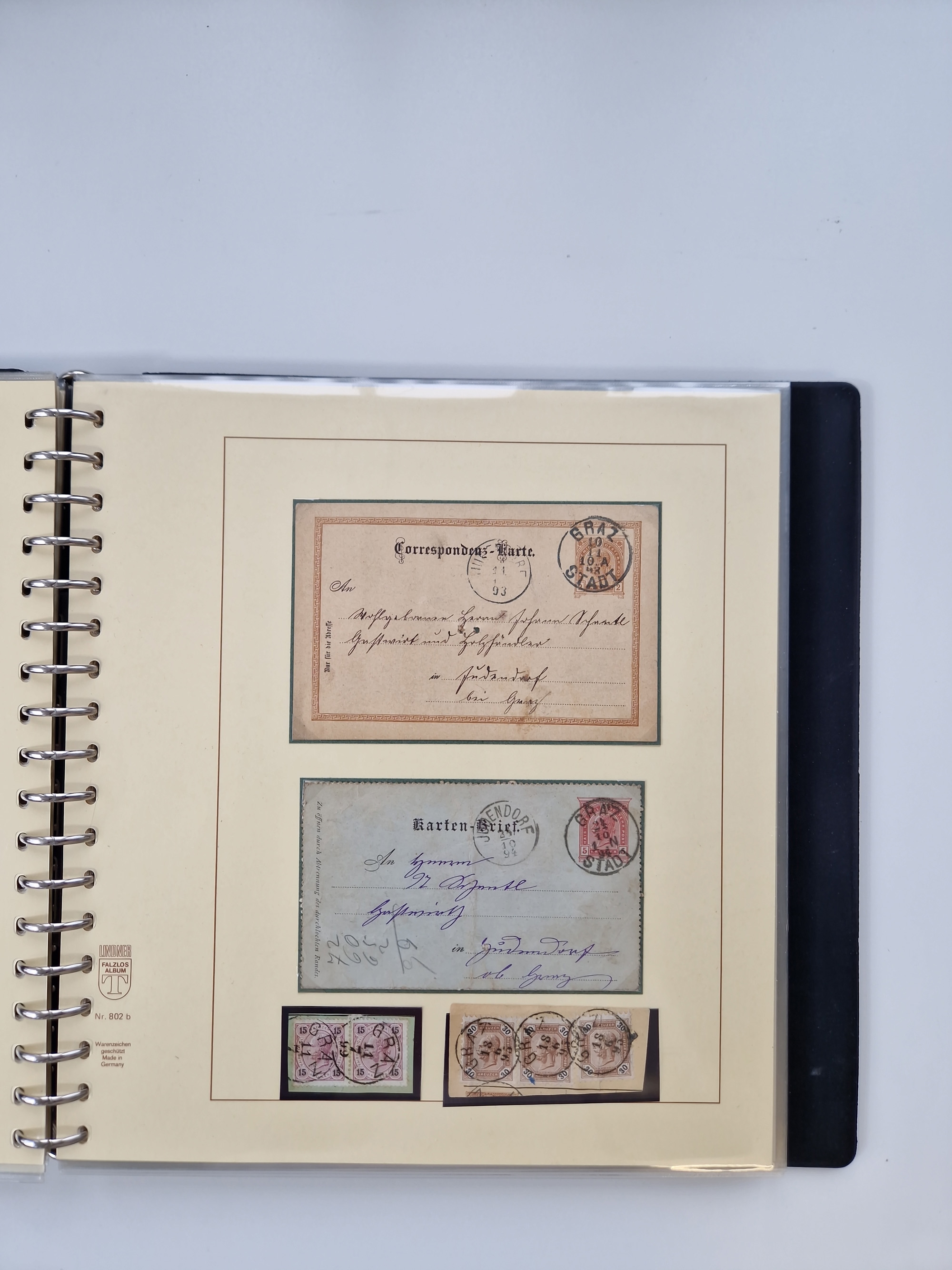 1850/1919 (ca.), zahlreiche aufgezogene Heimat-Sammlung “GRAZ” und Umgebung Andritz bis Zettling, mit über 220 Briefen und Karten, besseren Einzel- und Mehrfachfrankaturen, Buntfrankaturen sowie R-Briefen, Ansichtkarten mit Lithos und weiteren Besonderheiten, Schwerpunkt bei den Ausgaben 1883 bis 1899, dabei u.a. Destination Finnland, 1897 R-Brief auf “BRUXELLES” nach Graz weitergeleitet mit Mischfrankatur, ferner lose Marken und Briefstücke ab Ausgabe 1850 mit meist klaren Stempel-Abschlägen, “PUNTIGEN” auf 6 Kr. (Müller.-Nr. 2276a, 150 Punkte), etc., dabei auch Postscheine, Postanweisungen, Paketkarten oder Recepissen. Ein außerordentlich reichaltiges und interessantes Objekt, zusammen in 4 Alben