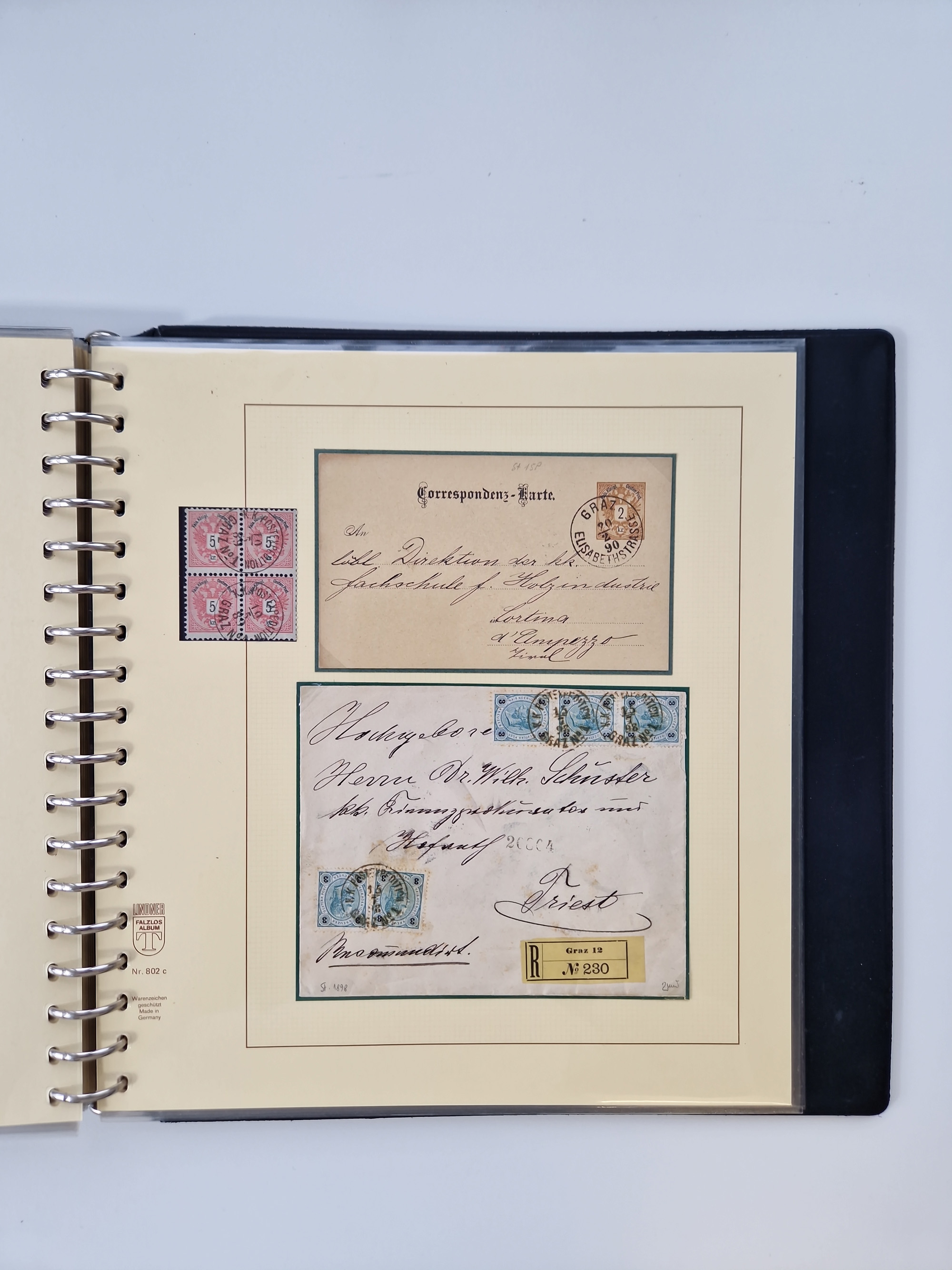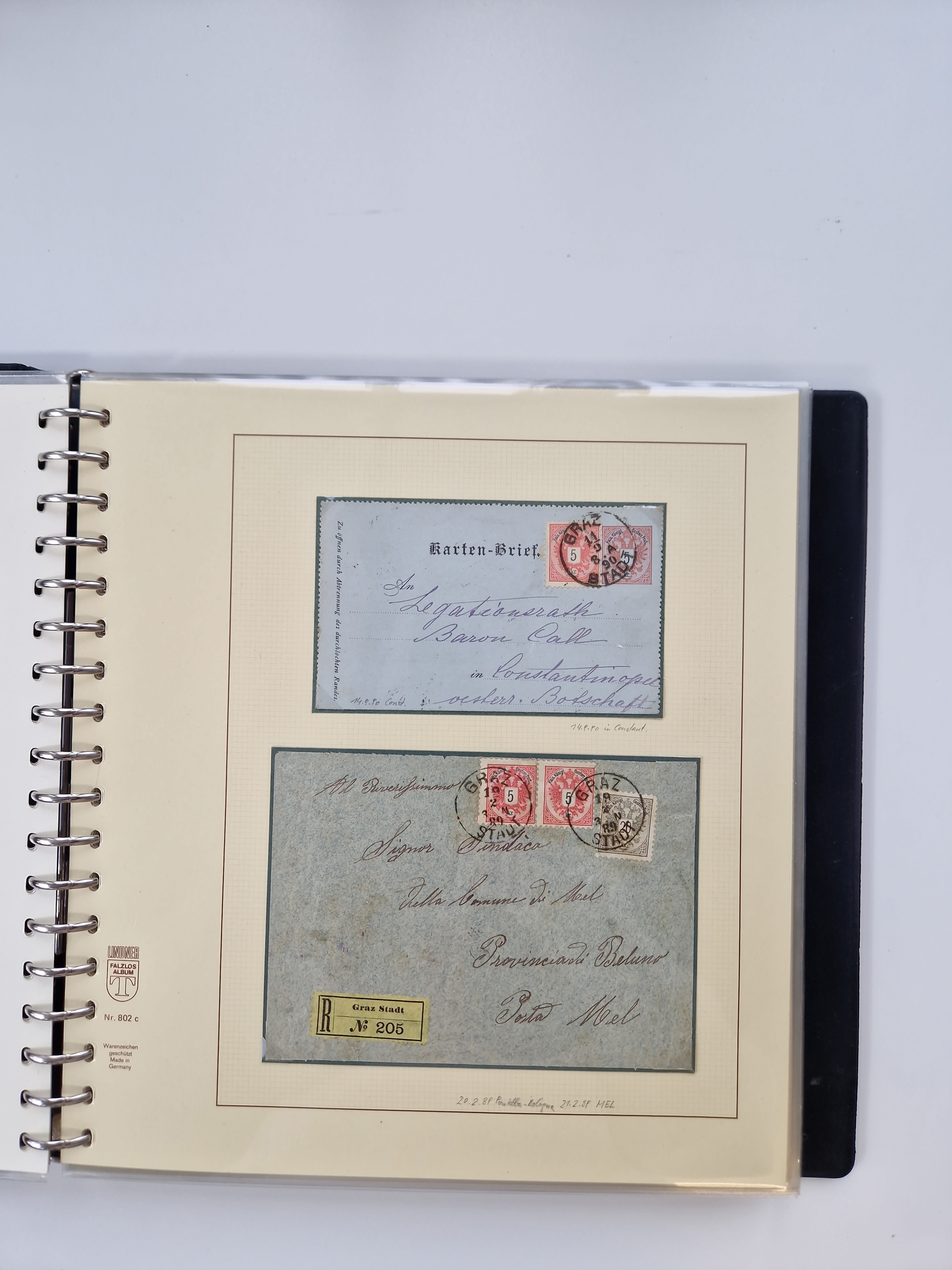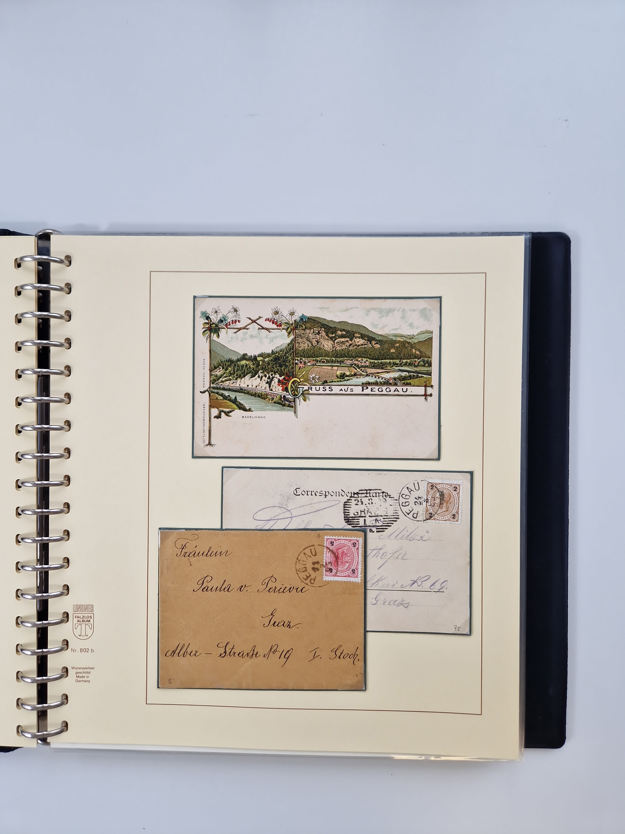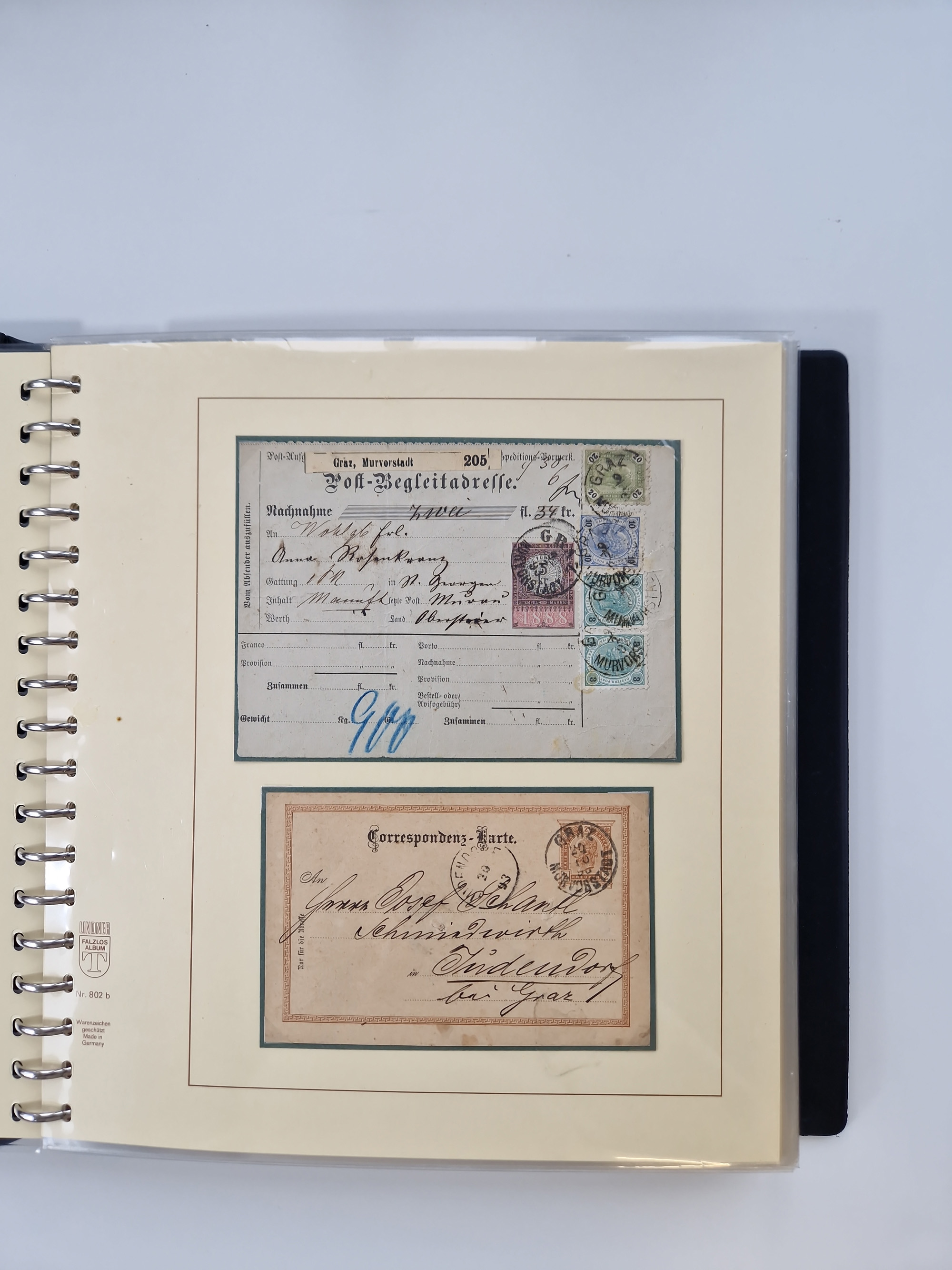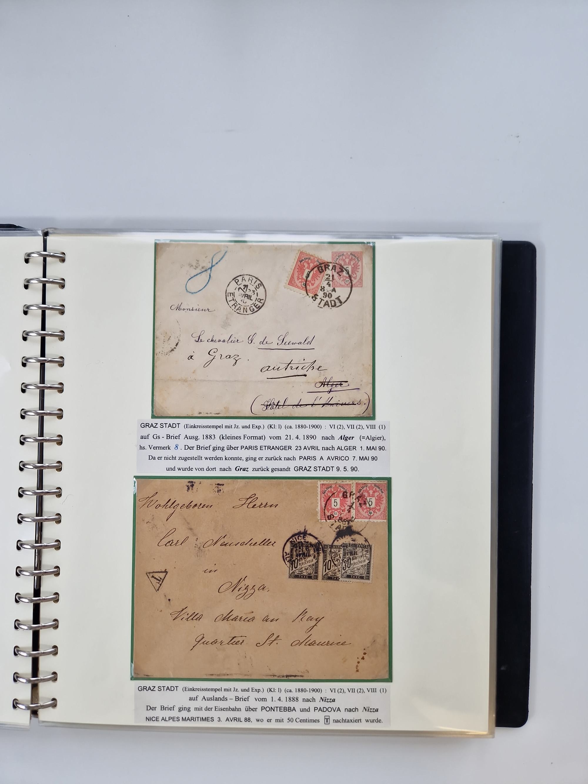 1850/1919 (ca.), zahlreiche aufgezogene Heimat-Sammlung “GRAZ” und Umgebung Andritz bis Zettling, mit über 220 Briefen und Karten, besseren Einzel- und Mehrfachfrankaturen, Buntfrankaturen sowie R-Briefen, Ansichtkarten mit Lithos und weiteren Besonderheiten, Schwerpunkt bei den Ausgaben 1883 bis 1899, dabei u.a. Destination Finnland, 1897 R-Brief auf “BRUXELLES” nach Graz weitergeleitet mit Mischfrankatur, ferner lose Marken und Briefstücke ab Ausgabe 1850 mit meist klaren Stempel-Abschlägen, “PUNTIGEN” auf 6 Kr. (Müller.-Nr. 2276a, 150 Punkte), etc., dabei auch Postscheine, Postanweisungen, Paketkarten oder Recepissen. Ein außerordentlich reichaltiges und interessantes Objekt, zusammen in 4 Alben
