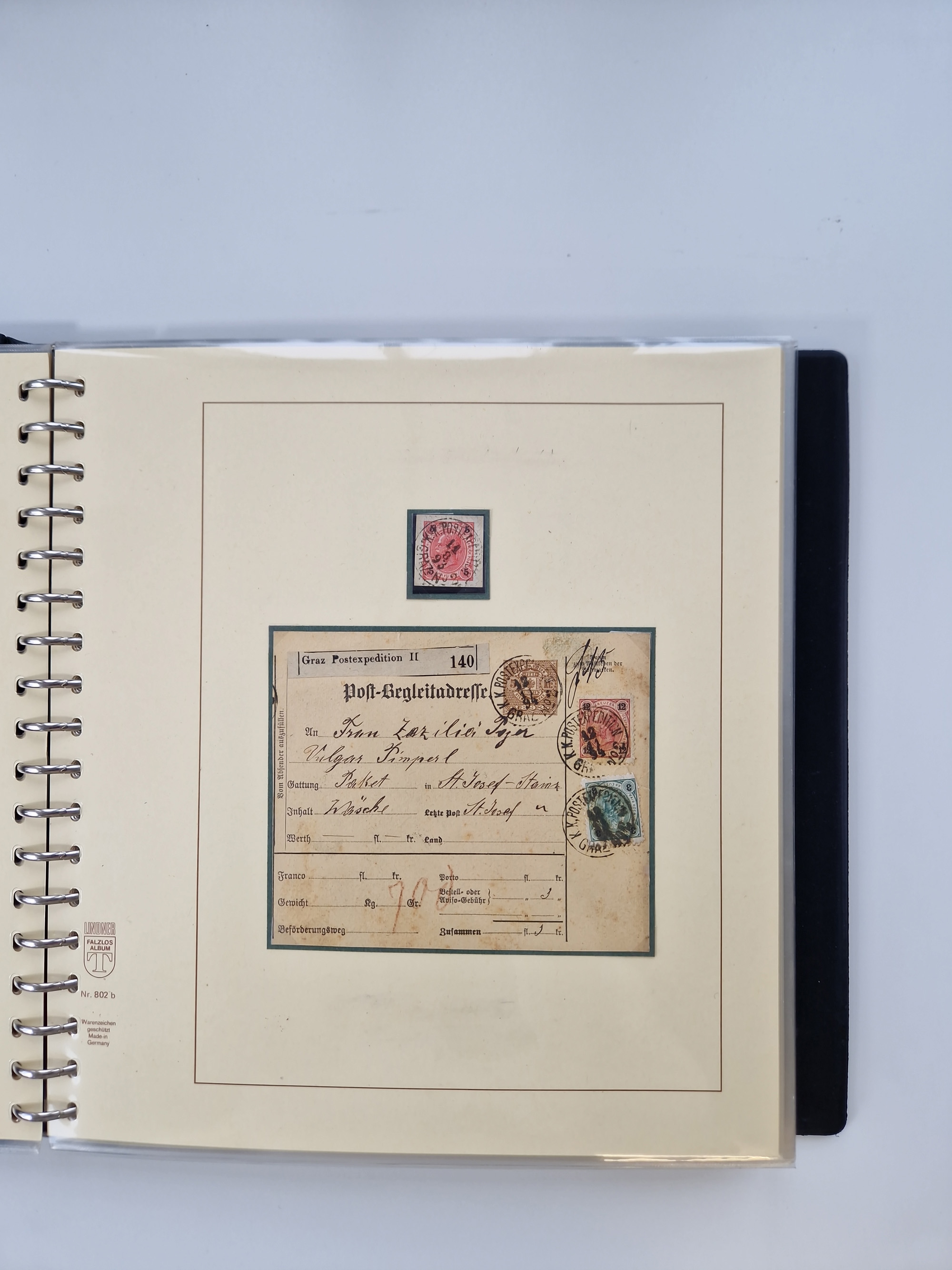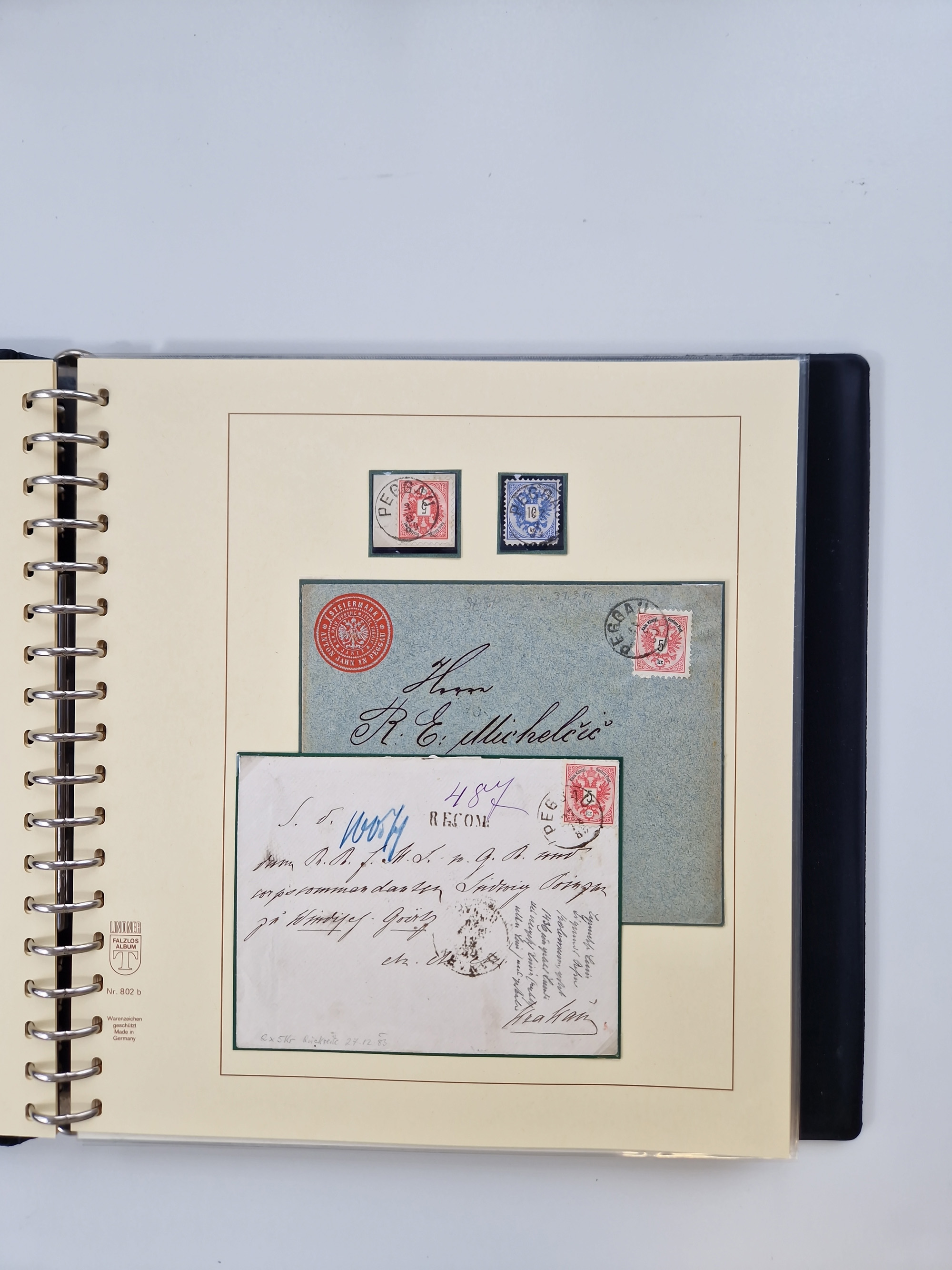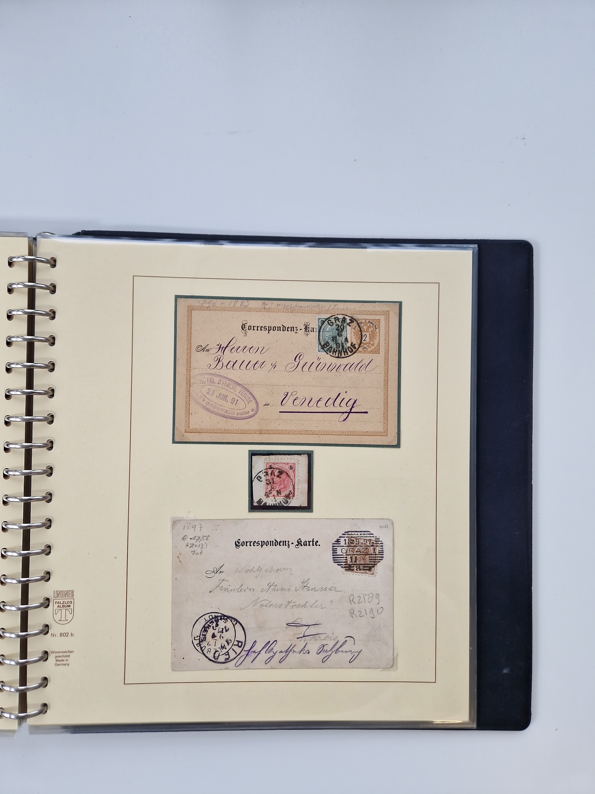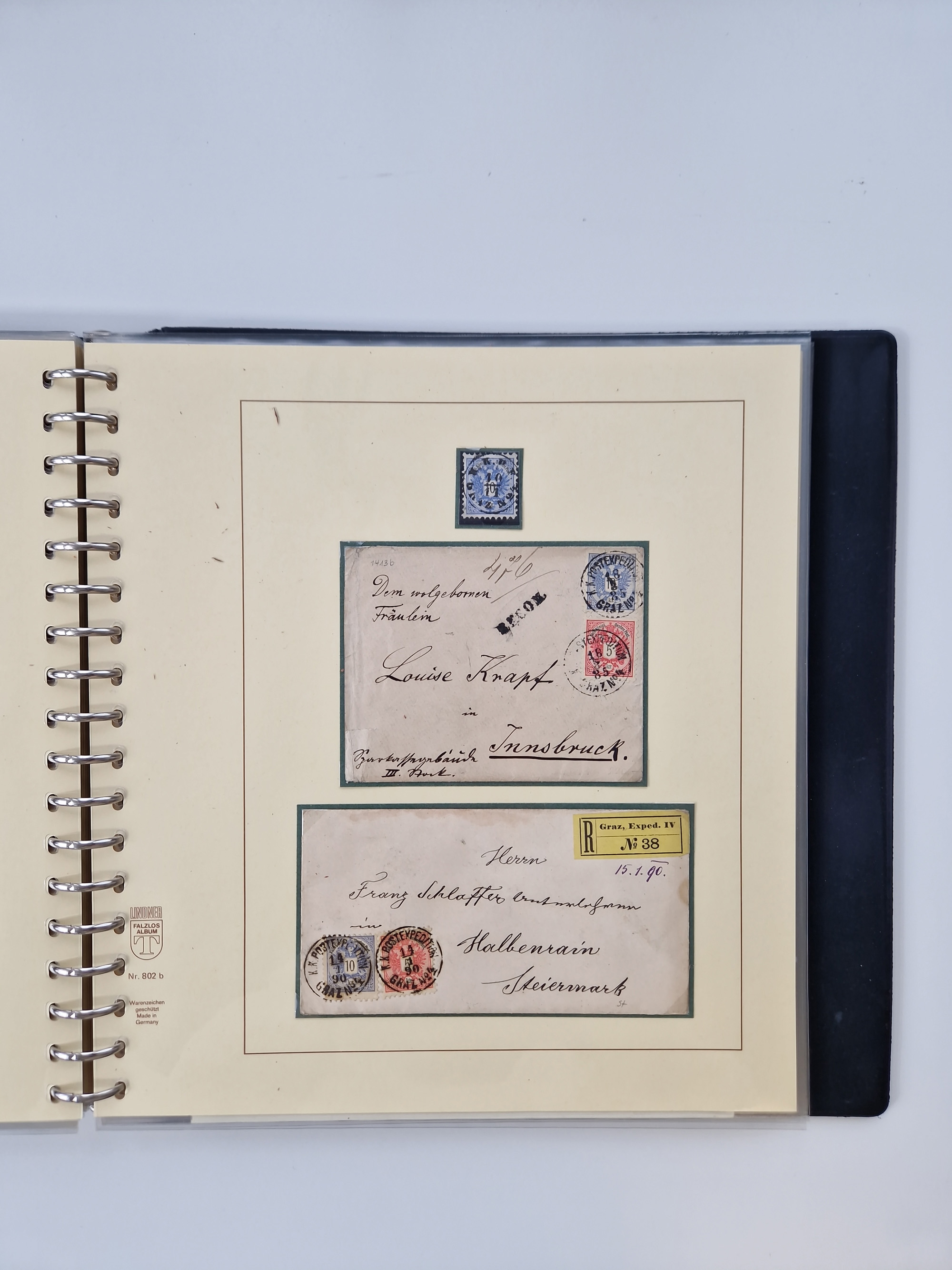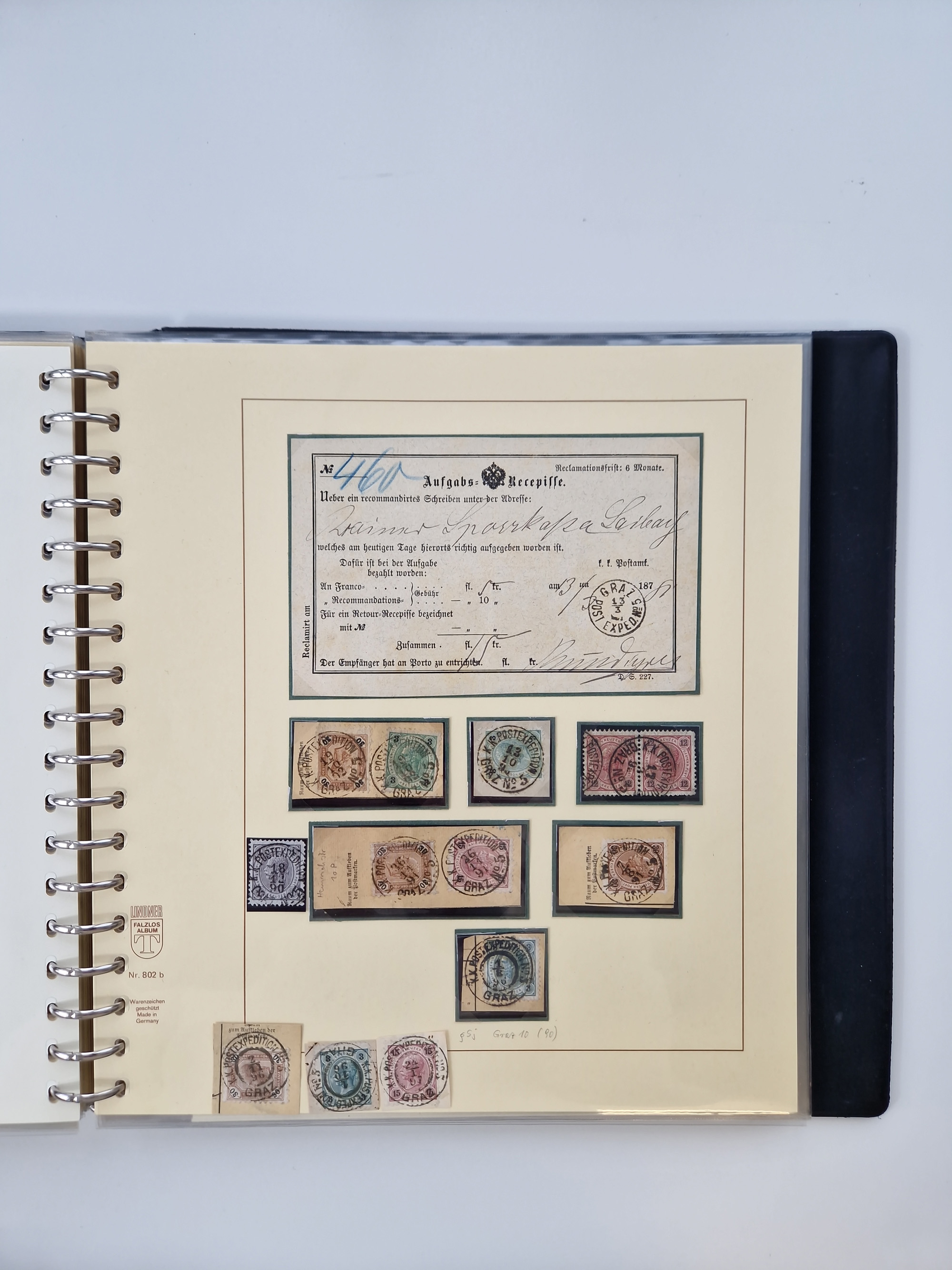 1850/1919 (ca.), zahlreiche aufgezogene Heimat-Sammlung “GRAZ” und Umgebung Andritz bis Zettling, mit über 220 Briefen und Karten, besseren Einzel- und Mehrfachfrankaturen, Buntfrankaturen sowie R-Briefen, Ansichtkarten mit Lithos und weiteren Besonderheiten, Schwerpunkt bei den Ausgaben 1883 bis 1899, dabei u.a. Destination Finnland, 1897 R-Brief auf “BRUXELLES” nach Graz weitergeleitet mit Mischfrankatur, ferner lose Marken und Briefstücke ab Ausgabe 1850 mit meist klaren Stempel-Abschlägen, “PUNTIGEN” auf 6 Kr. (Müller.-Nr. 2276a, 150 Punkte), etc., dabei auch Postscheine, Postanweisungen, Paketkarten oder Recepissen. Ein außerordentlich reichaltiges und interessantes Objekt, zusammen in 4 Alben