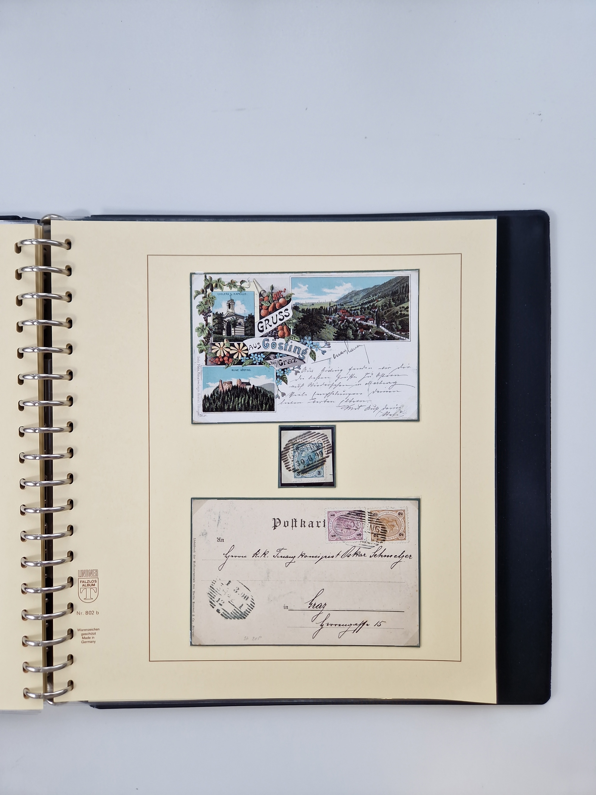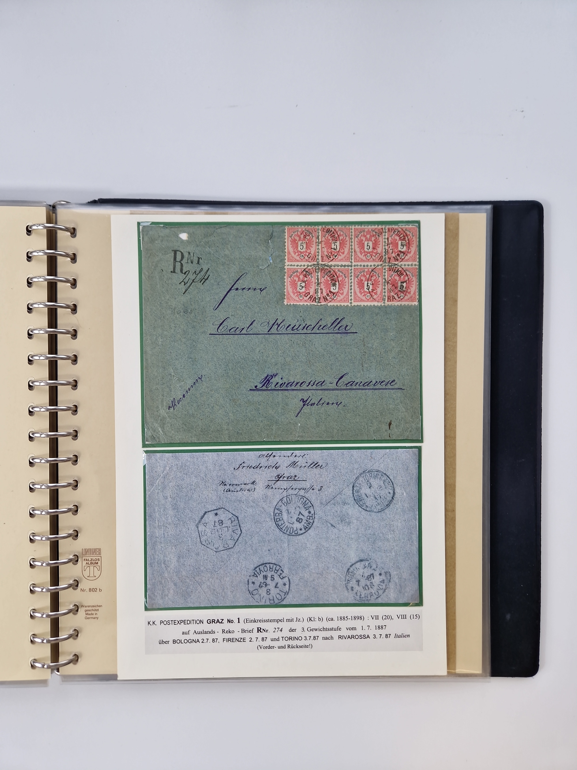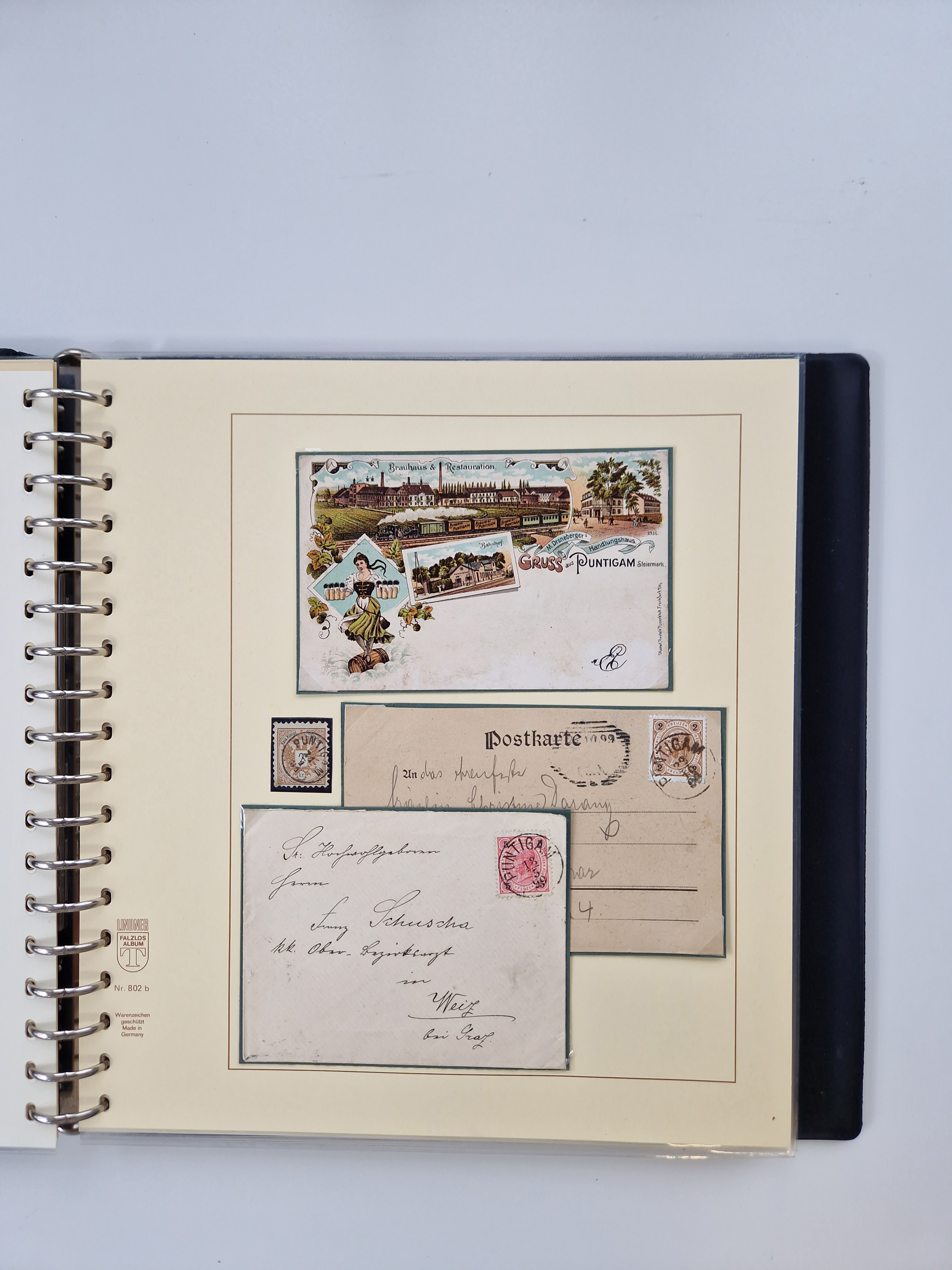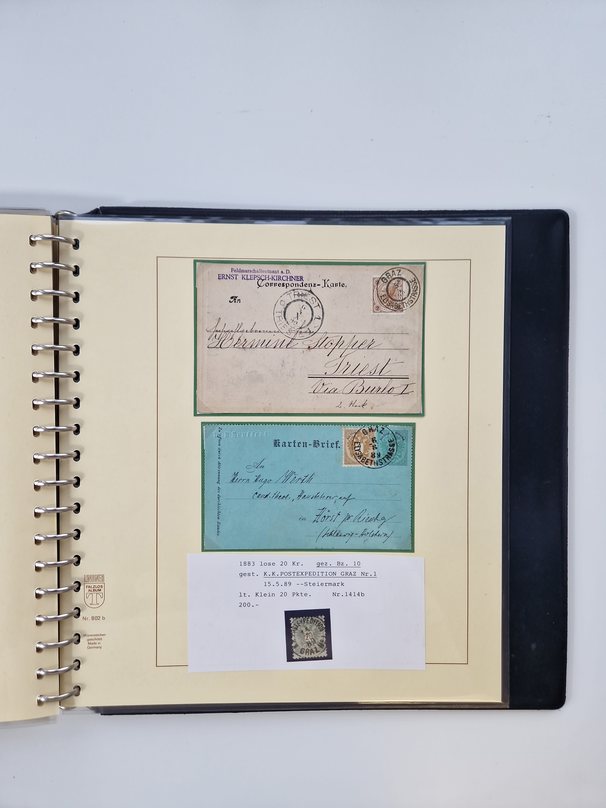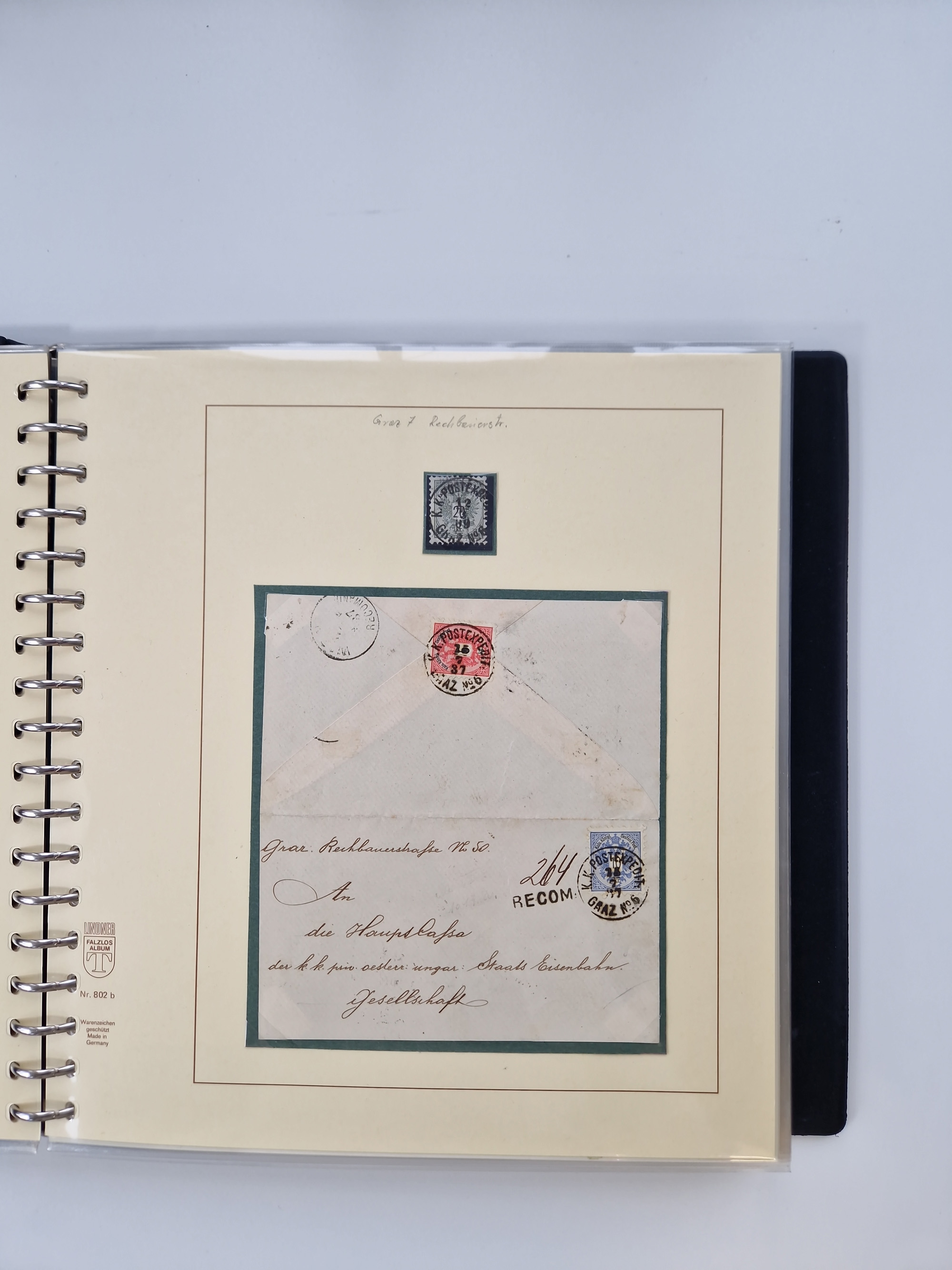 1850/1919 (ca.), zahlreiche aufgezogene Heimat-Sammlung “GRAZ” und Umgebung Andritz bis Zettling, mit über 220 Briefen und Karten, besseren Einzel- und Mehrfachfrankaturen, Buntfrankaturen sowie R-Briefen, Ansichtkarten mit Lithos und weiteren Besonderheiten, Schwerpunkt bei den Ausgaben 1883 bis 1899, dabei u.a. Destination Finnland, 1897 R-Brief auf “BRUXELLES” nach Graz weitergeleitet mit Mischfrankatur, ferner lose Marken und Briefstücke ab Ausgabe 1850 mit meist klaren Stempel-Abschlägen, “PUNTIGEN” auf 6 Kr. (Müller.-Nr. 2276a, 150 Punkte), etc., dabei auch Postscheine, Postanweisungen, Paketkarten oder Recepissen. Ein außerordentlich reichaltiges und interessantes Objekt, zusammen in 4 Alben