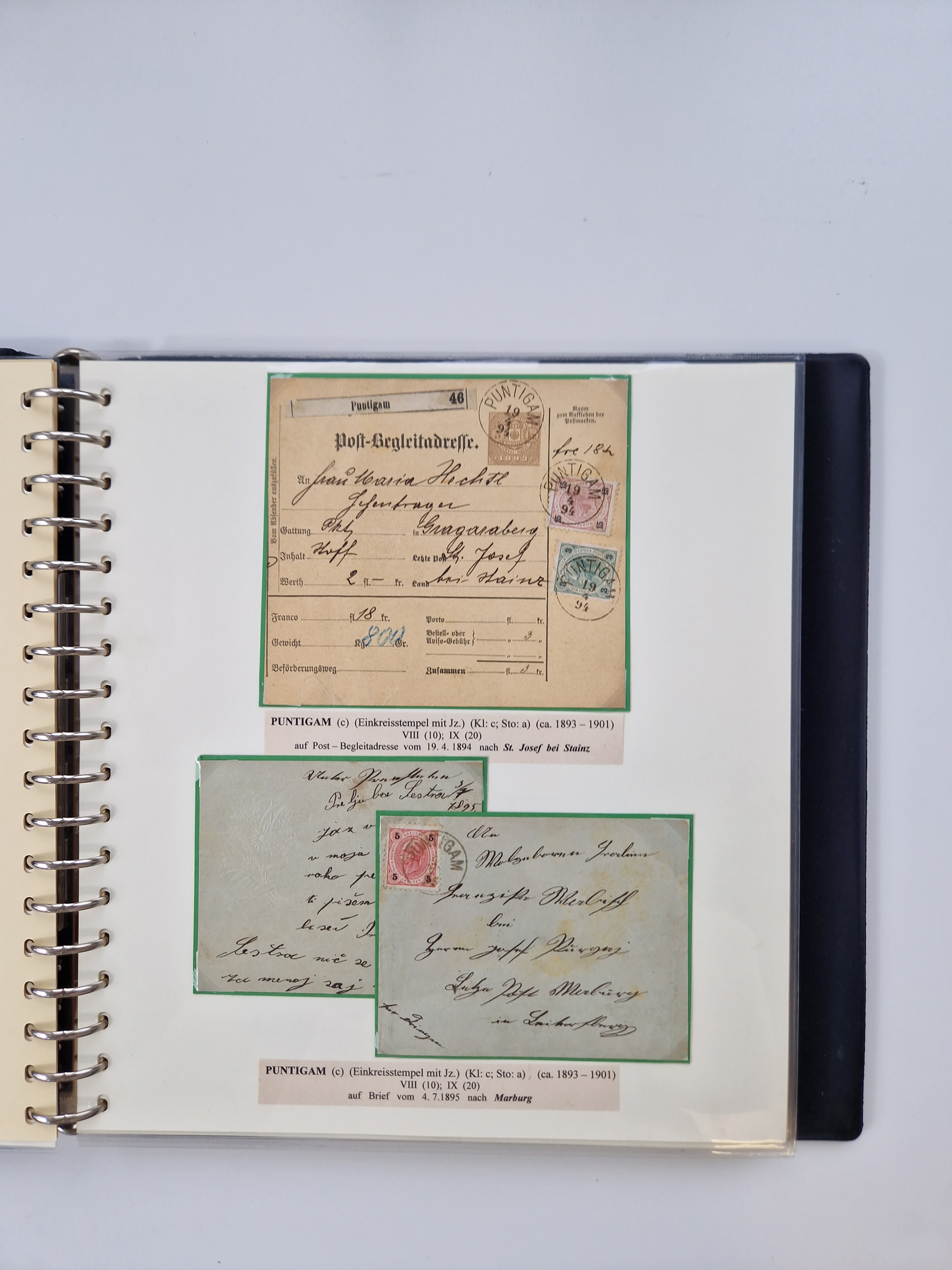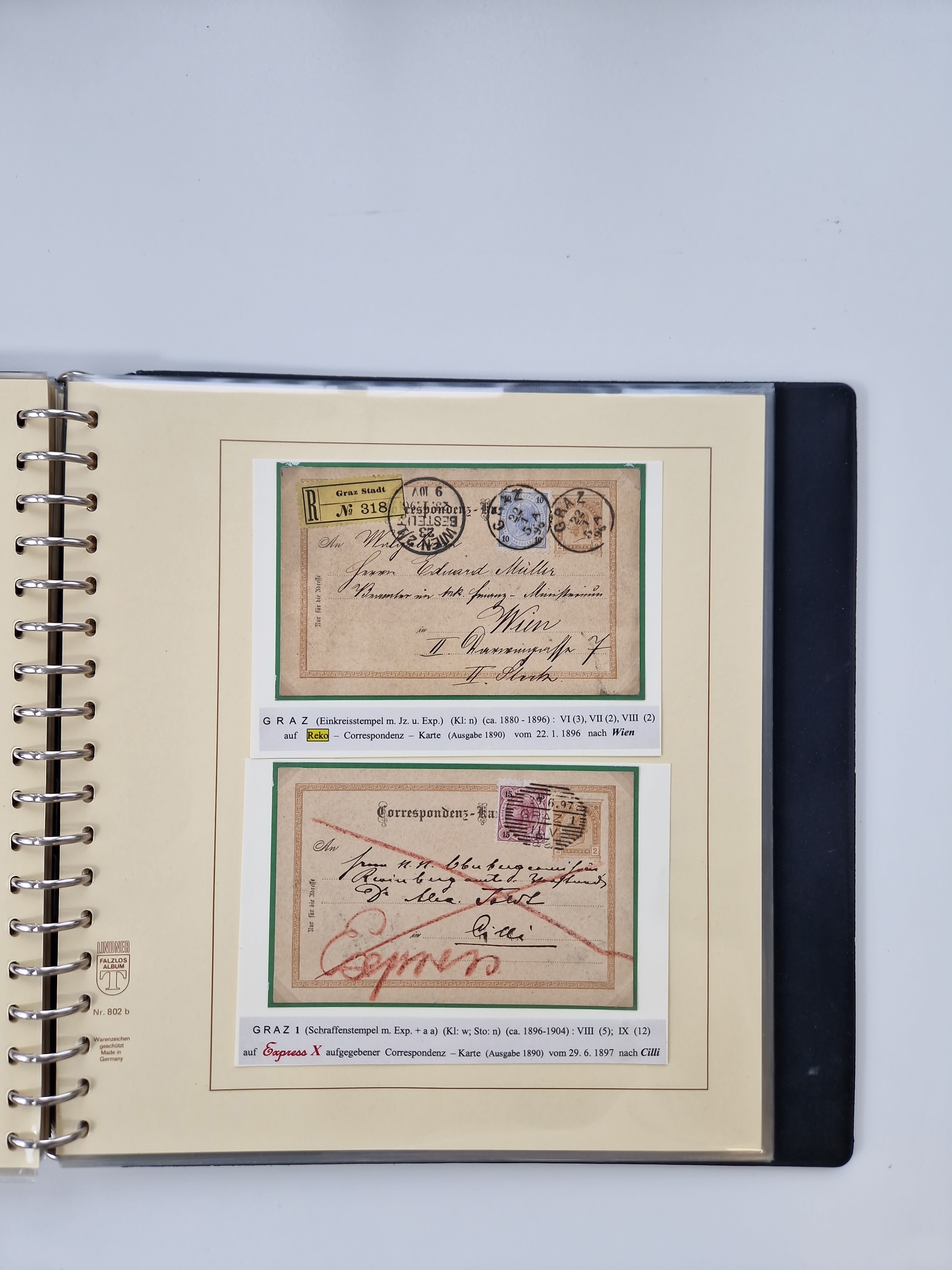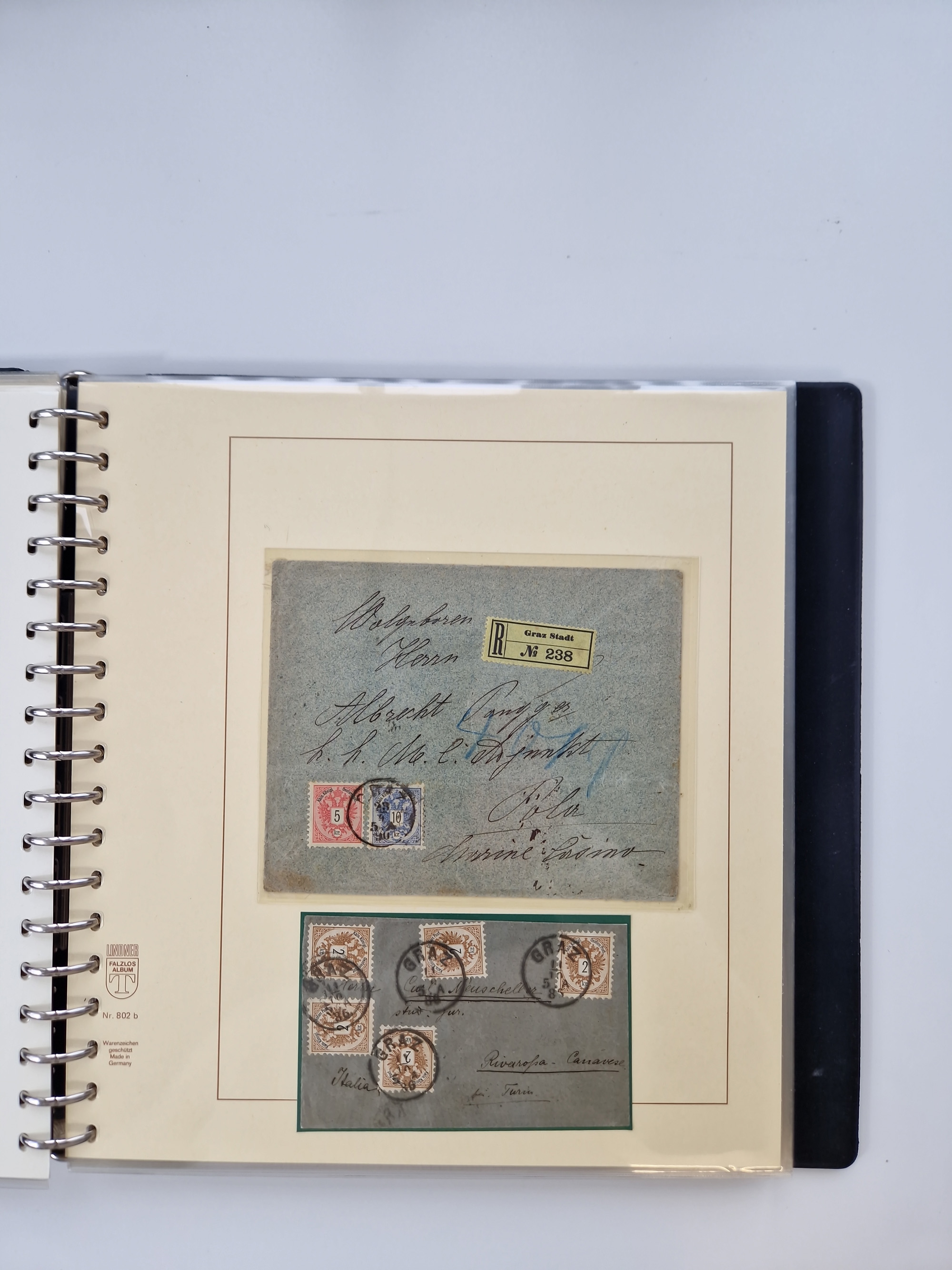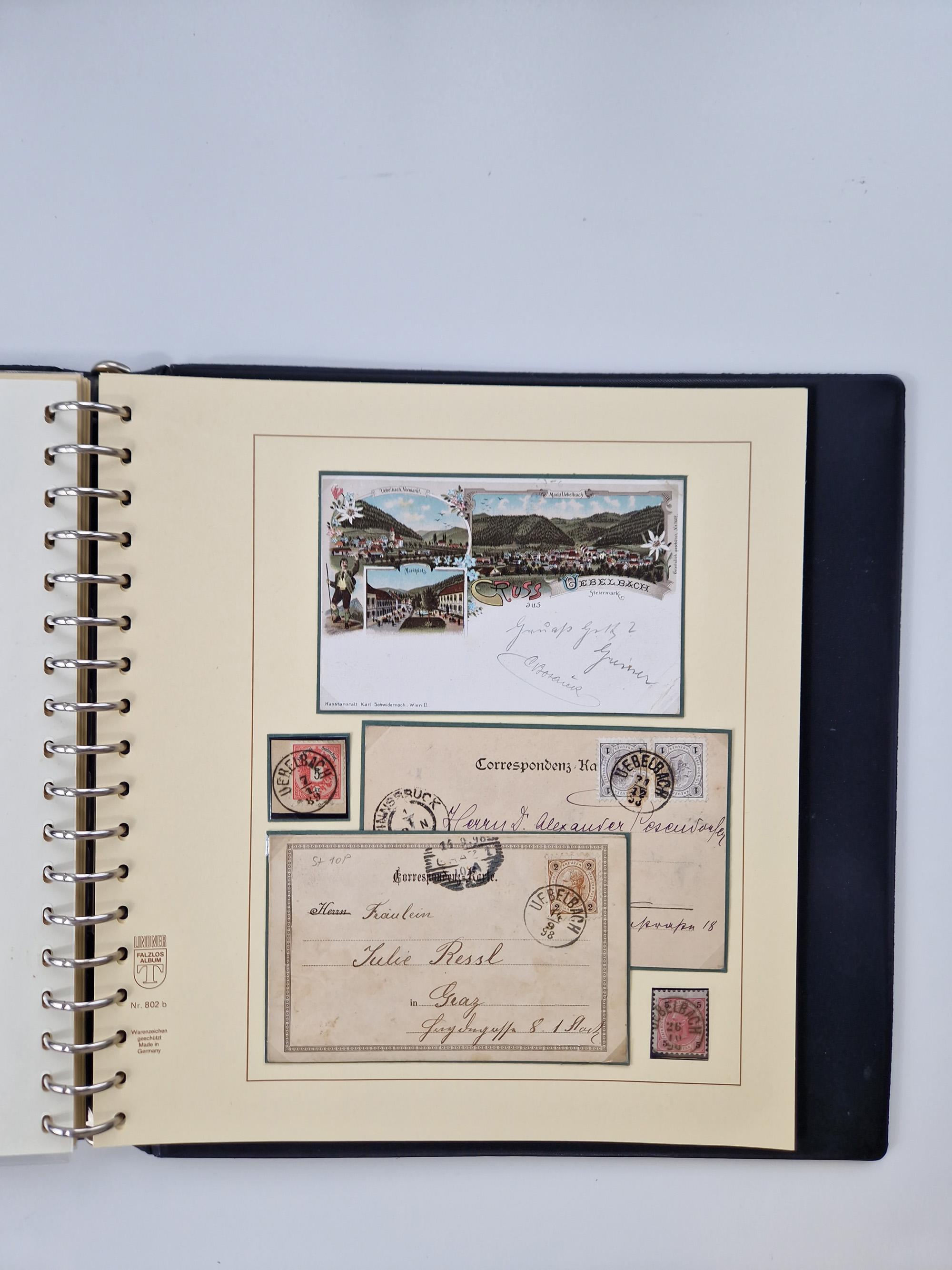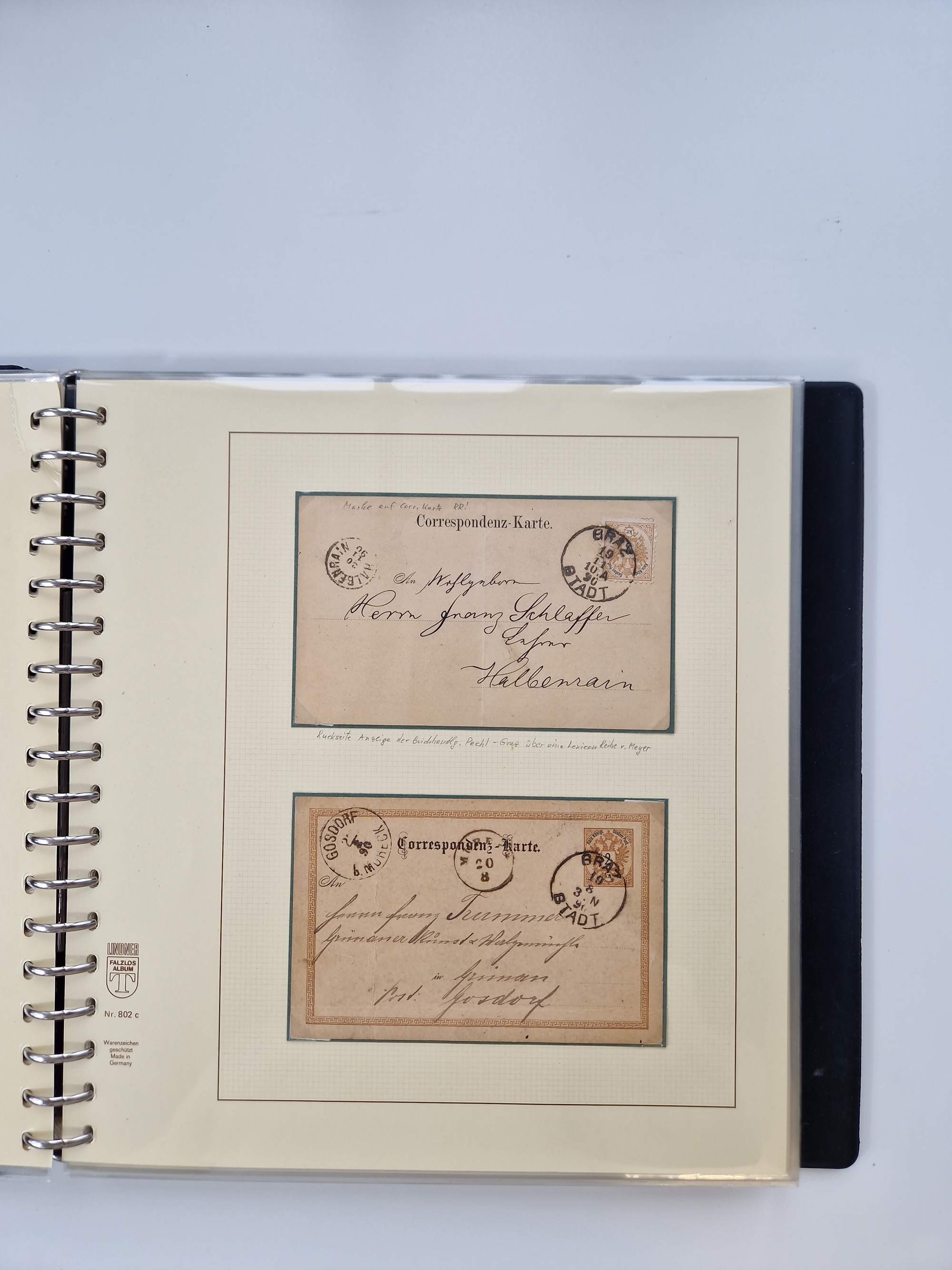1850/1919 (ca.), zahlreiche aufgezogene Heimat-Sammlung “GRAZ” und Umgebung Andritz bis Zettling, mit über 220 Briefen und Karten, besseren Einzel- und Mehrfachfrankaturen, Buntfrankaturen sowie R-Briefen, Ansichtkarten mit Lithos und weiteren Besonderheiten, Schwerpunkt bei den Ausgaben 1883 bis 1899, dabei u.a. Destination Finnland, 1897 R-Brief auf “BRUXELLES” nach Graz weitergeleitet mit Mischfrankatur, ferner lose Marken und Briefstücke ab Ausgabe 1850 mit meist klaren Stempel-Abschlägen, “PUNTIGEN” auf 6 Kr. (Müller.-Nr. 2276a, 150 Punkte), etc., dabei auch Postscheine, Postanweisungen, Paketkarten oder Recepissen. Ein außerordentlich reichaltiges und interessantes Objekt, zusammen in 4 Alben