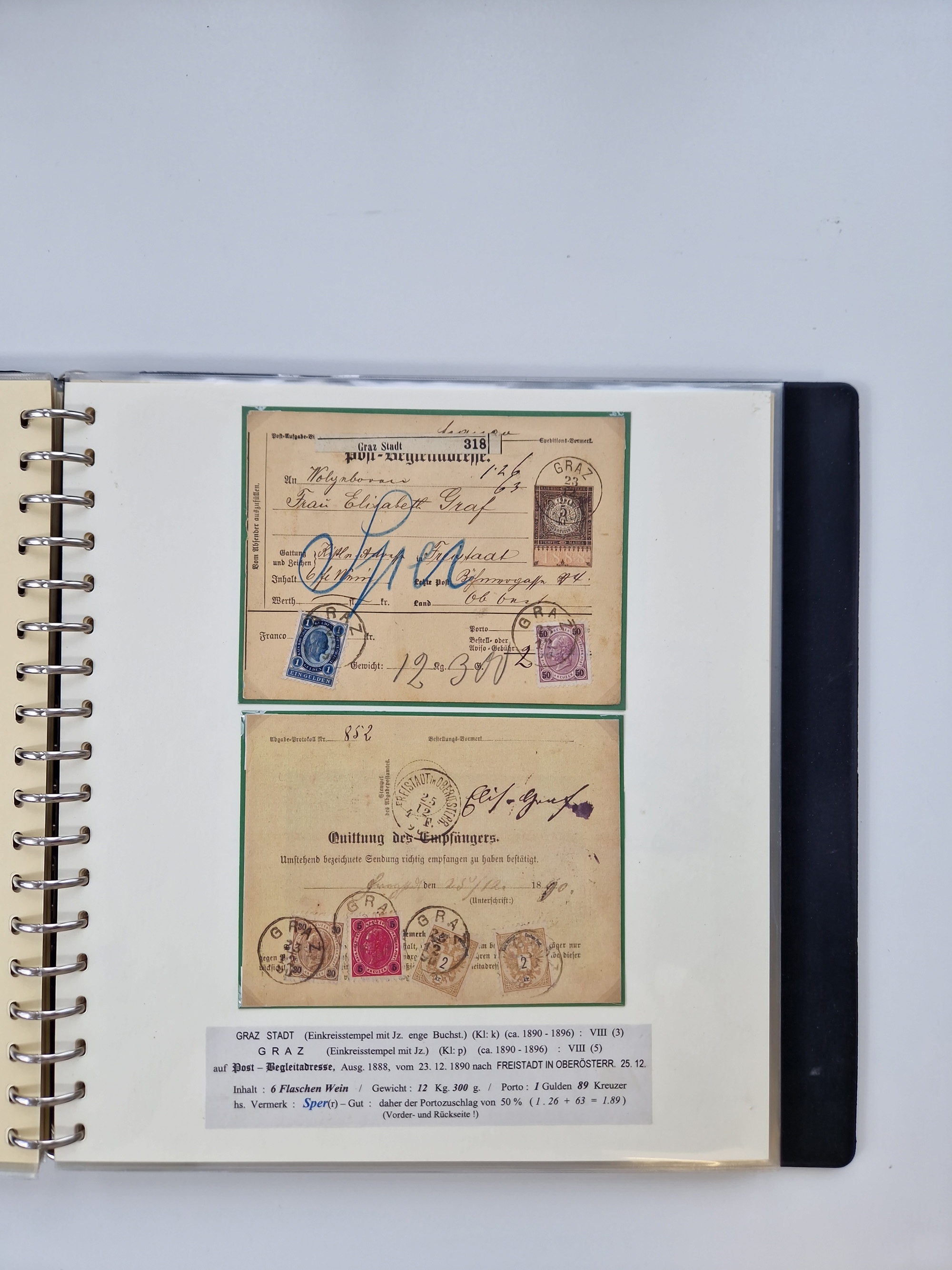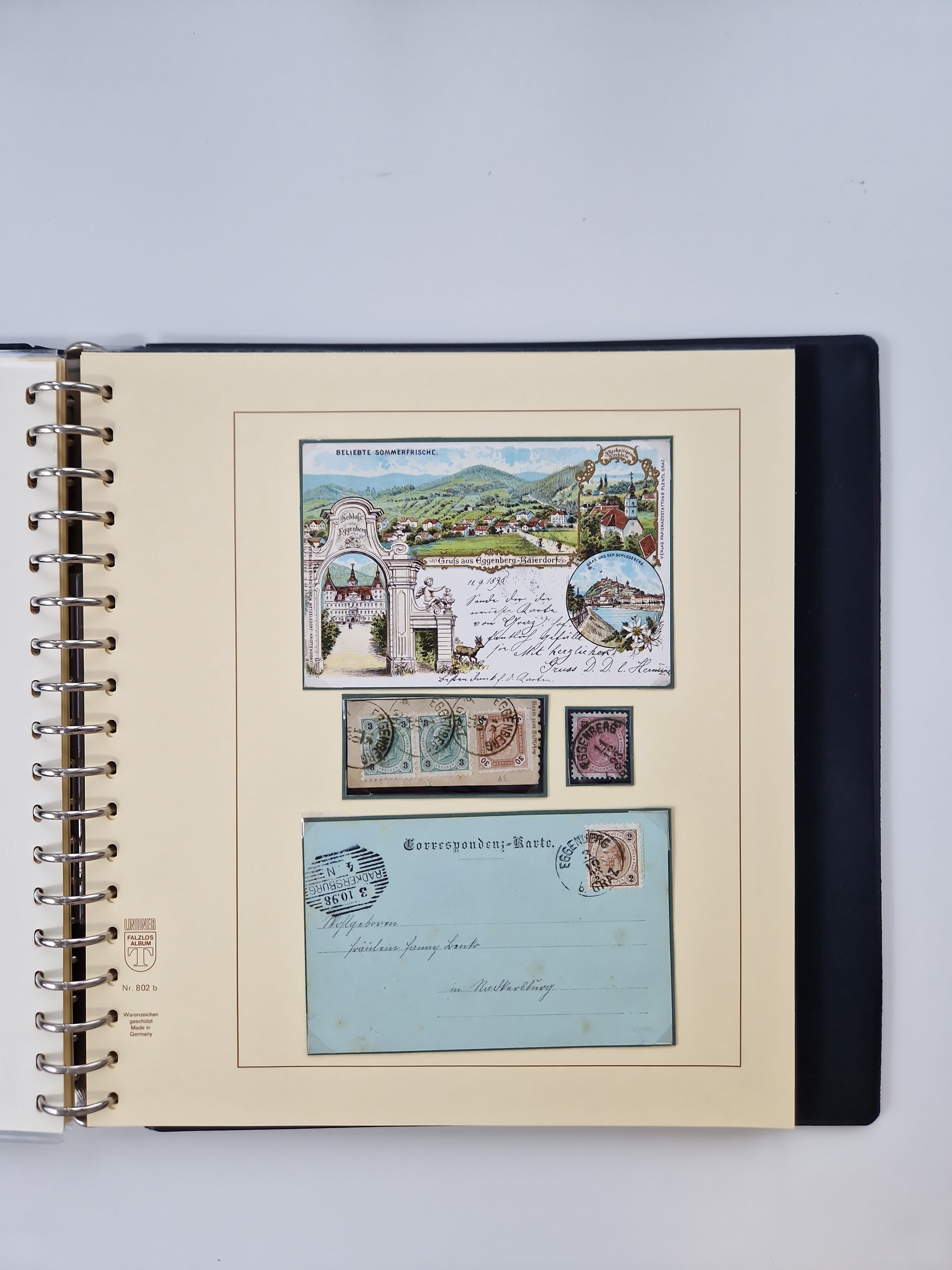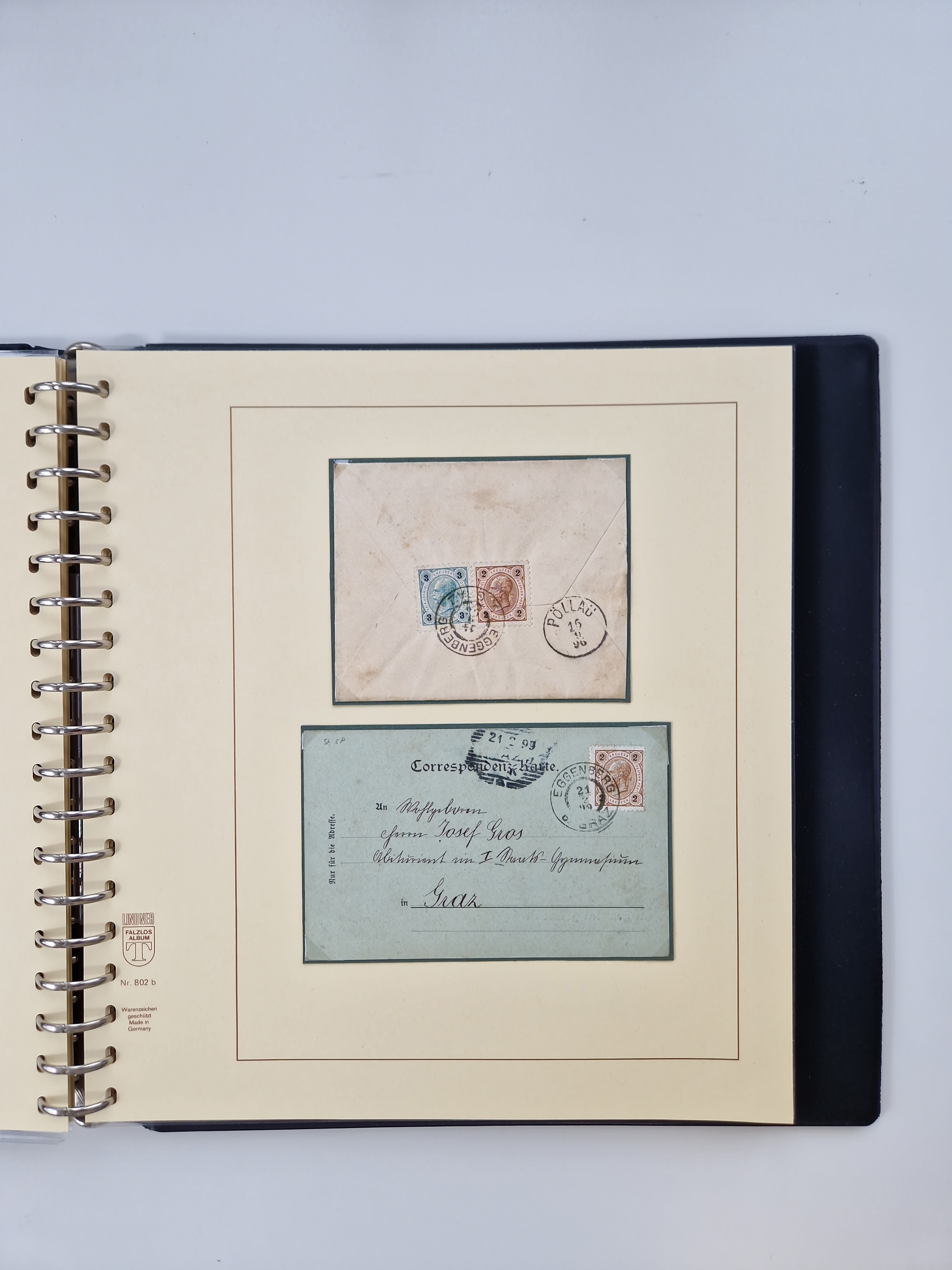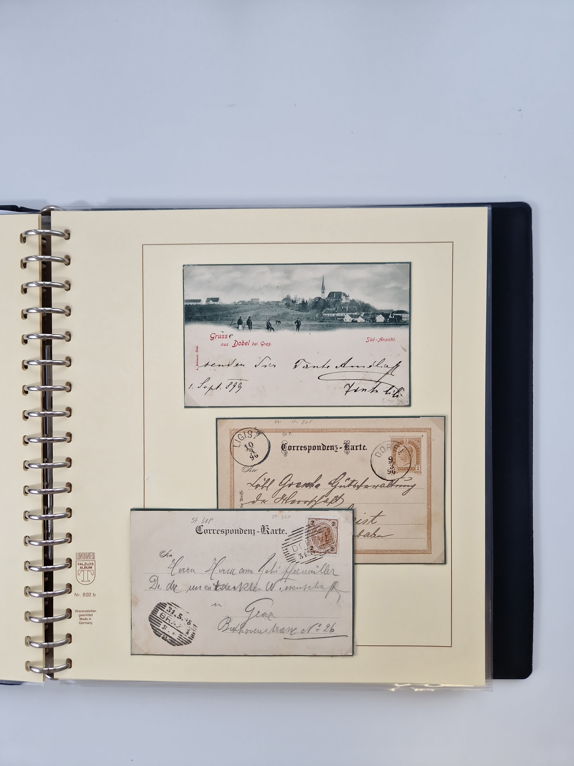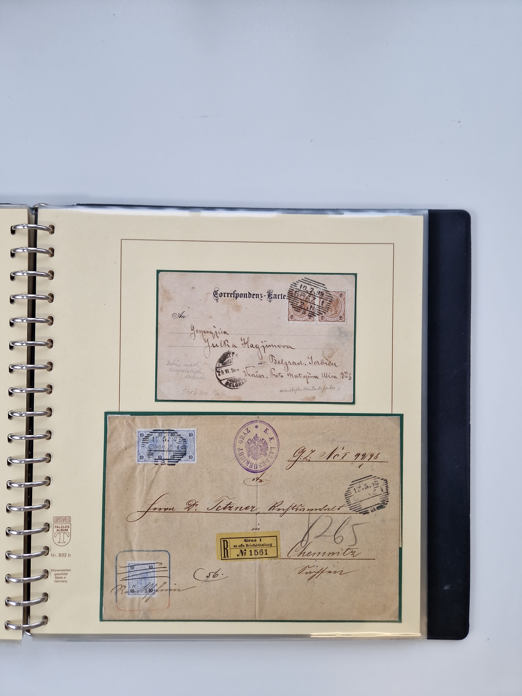 1850/1919 (ca.), zahlreiche aufgezogene Heimat-Sammlung “GRAZ” und Umgebung Andritz bis Zettling, mit über 220 Briefen und Karten, besseren Einzel- und Mehrfachfrankaturen, Buntfrankaturen sowie R-Briefen, Ansichtkarten mit Lithos und weiteren Besonderheiten, Schwerpunkt bei den Ausgaben 1883 bis 1899, dabei u.a. Destination Finnland, 1897 R-Brief auf “BRUXELLES” nach Graz weitergeleitet mit Mischfrankatur, ferner lose Marken und Briefstücke ab Ausgabe 1850 mit meist klaren Stempel-Abschlägen, “PUNTIGEN” auf 6 Kr. (Müller.-Nr. 2276a, 150 Punkte), etc., dabei auch Postscheine, Postanweisungen, Paketkarten oder Recepissen. Ein außerordentlich reichaltiges und interessantes Objekt, zusammen in 4 Alben