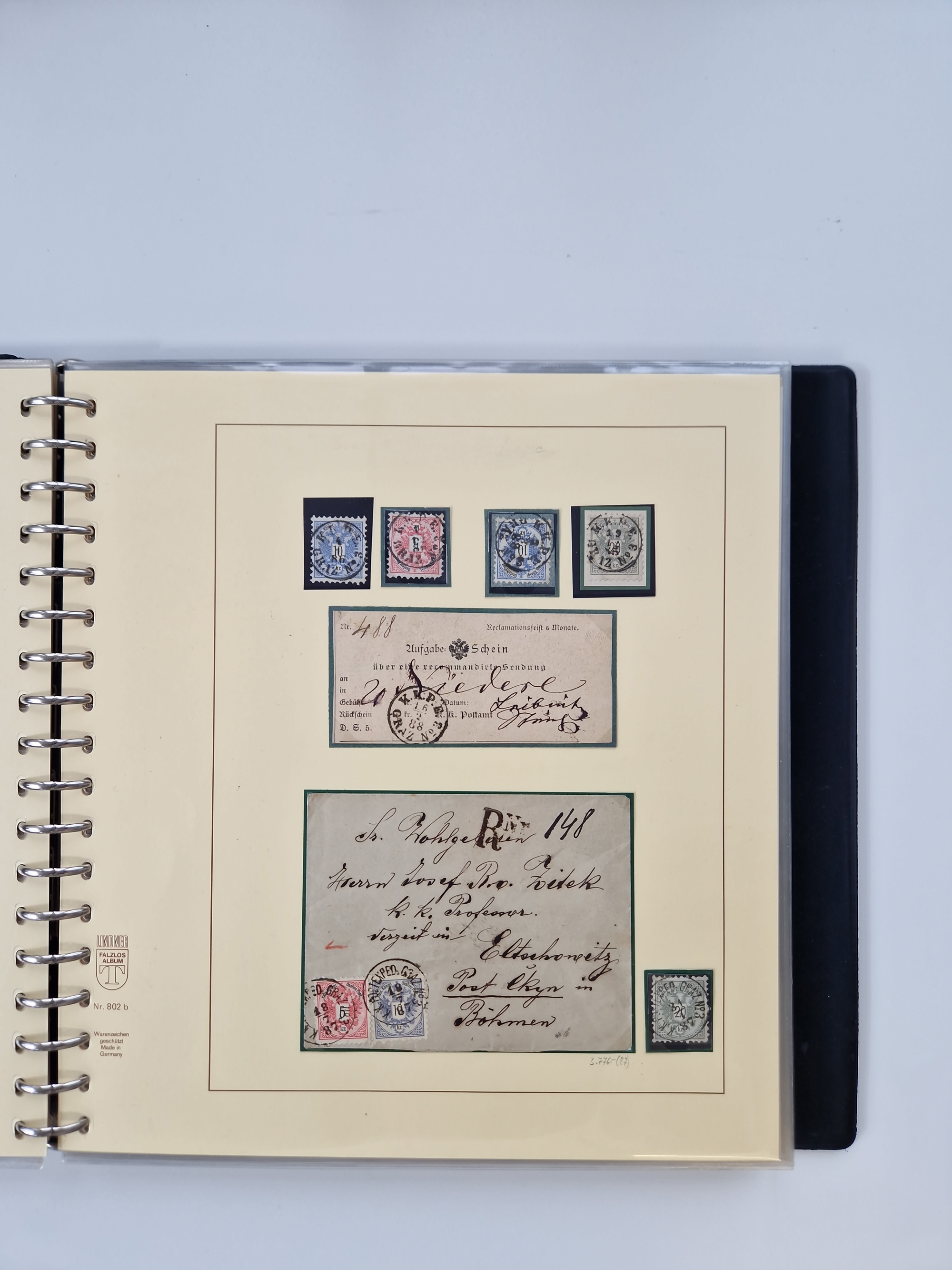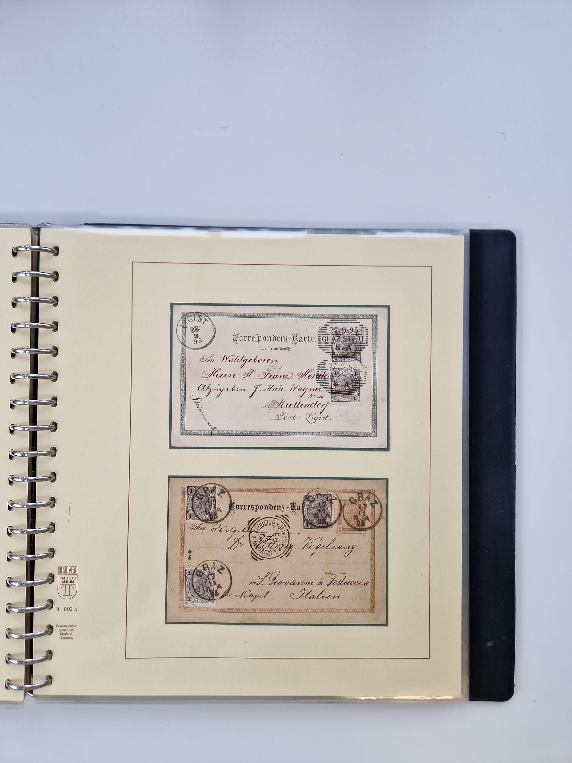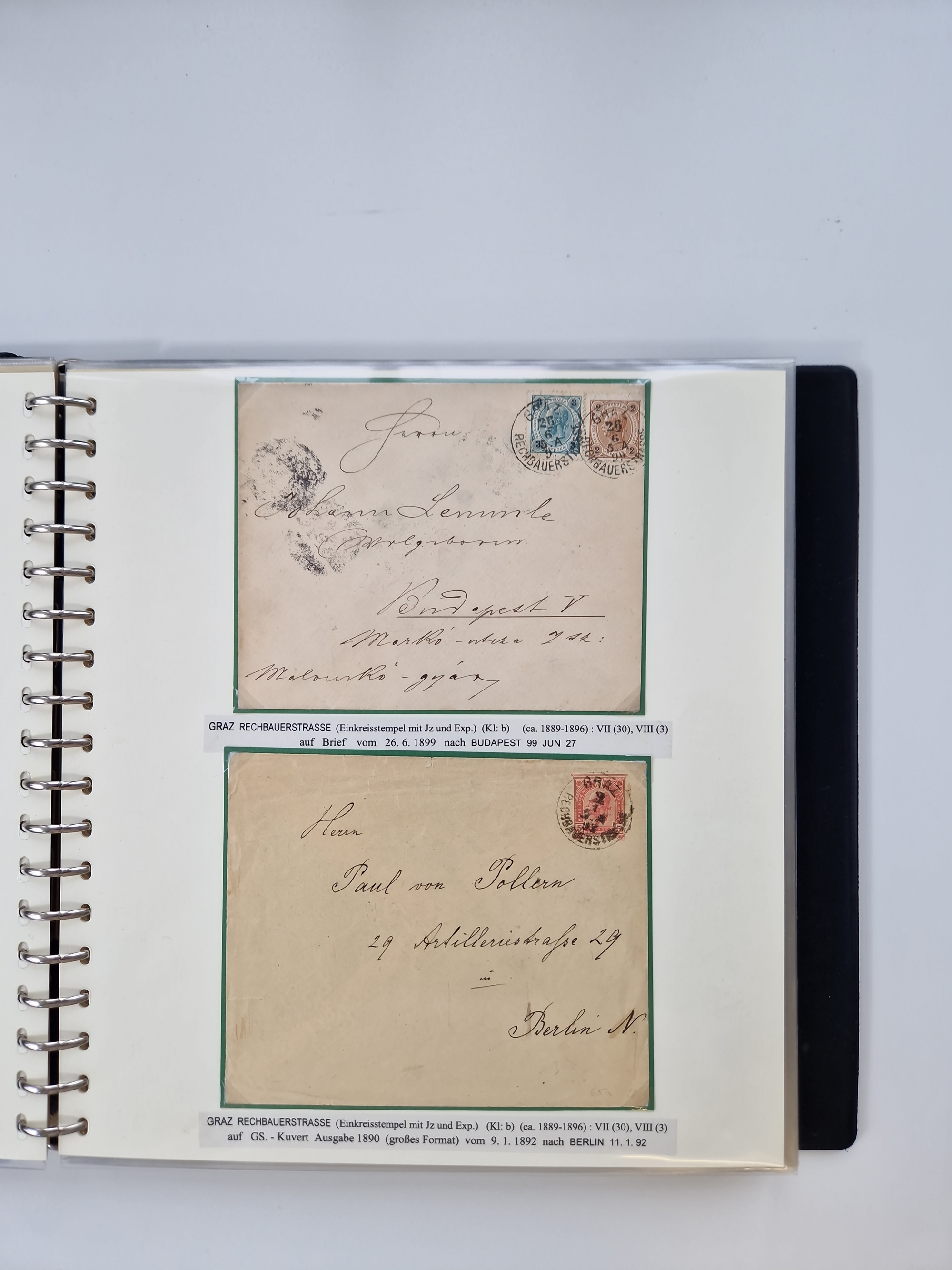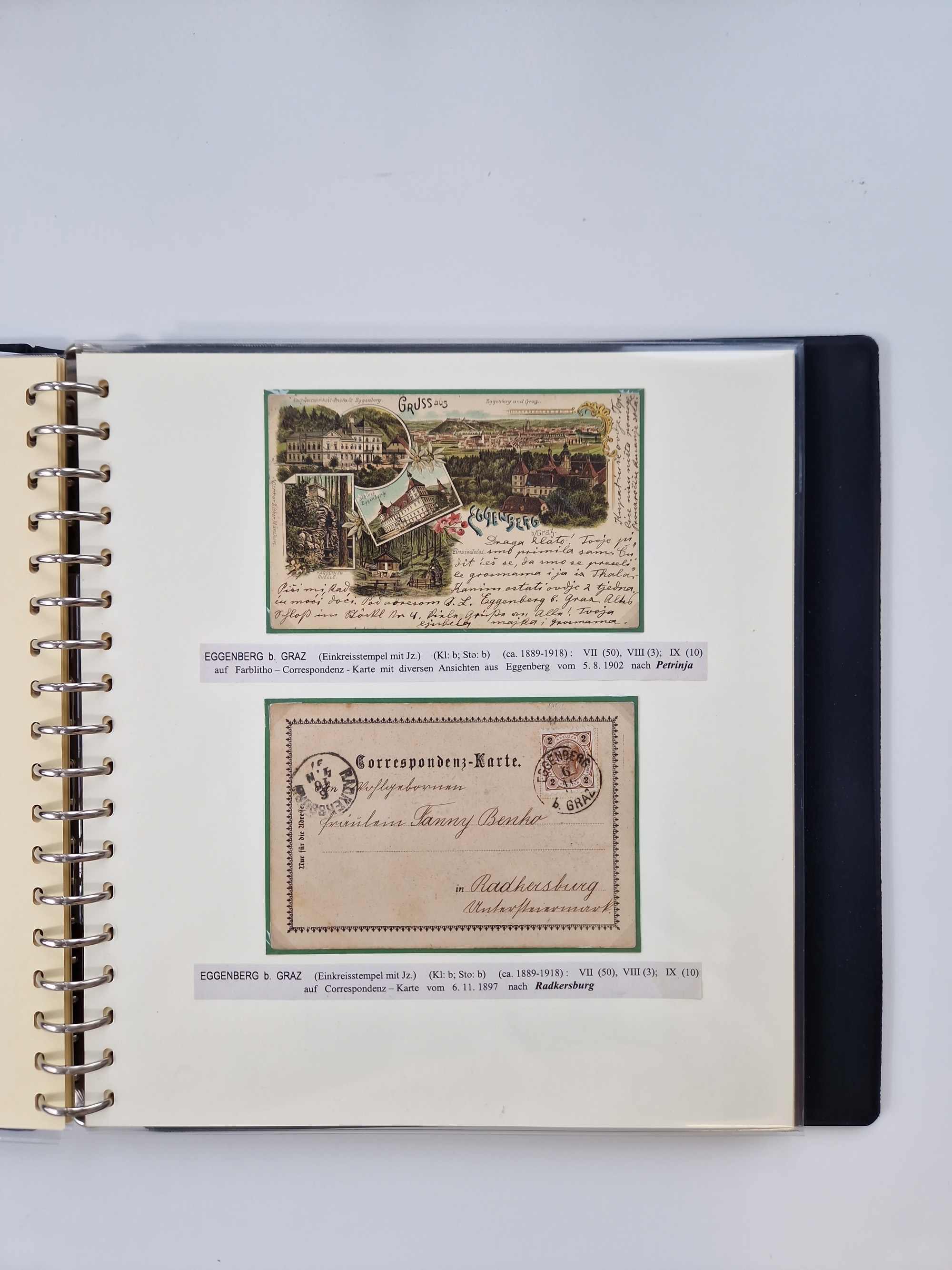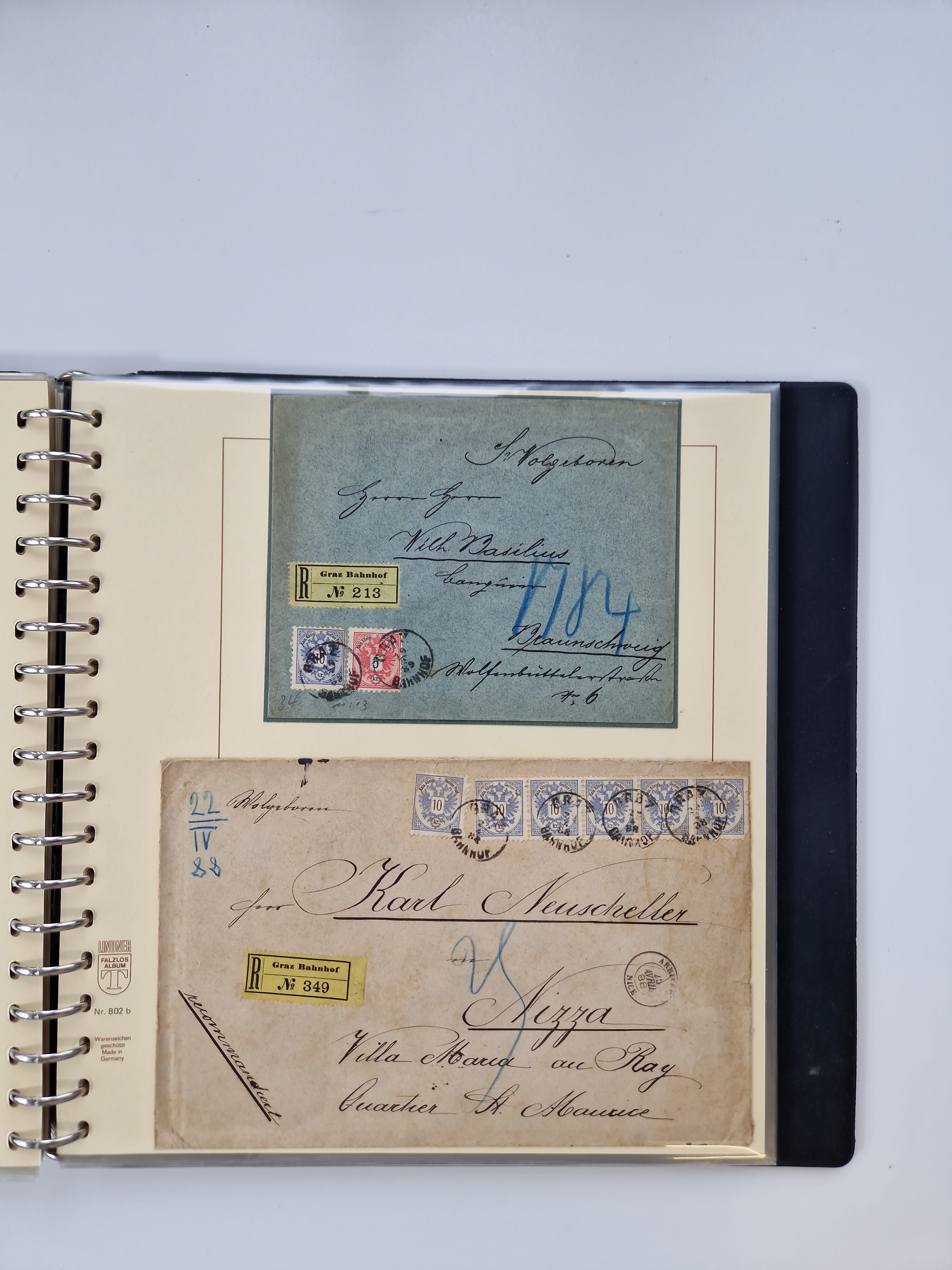 1850/1919 (ca.), zahlreiche aufgezogene Heimat-Sammlung “GRAZ” und Umgebung Andritz bis Zettling, mit über 220 Briefen und Karten, besseren Einzel- und Mehrfachfrankaturen, Buntfrankaturen sowie R-Briefen, Ansichtkarten mit Lithos und weiteren Besonderheiten, Schwerpunkt bei den Ausgaben 1883 bis 1899, dabei u.a. Destination Finnland, 1897 R-Brief auf “BRUXELLES” nach Graz weitergeleitet mit Mischfrankatur, ferner lose Marken und Briefstücke ab Ausgabe 1850 mit meist klaren Stempel-Abschlägen, “PUNTIGEN” auf 6 Kr. (Müller.-Nr. 2276a, 150 Punkte), etc., dabei auch Postscheine, Postanweisungen, Paketkarten oder Recepissen. Ein außerordentlich reichaltiges und interessantes Objekt, zusammen in 4 Alben