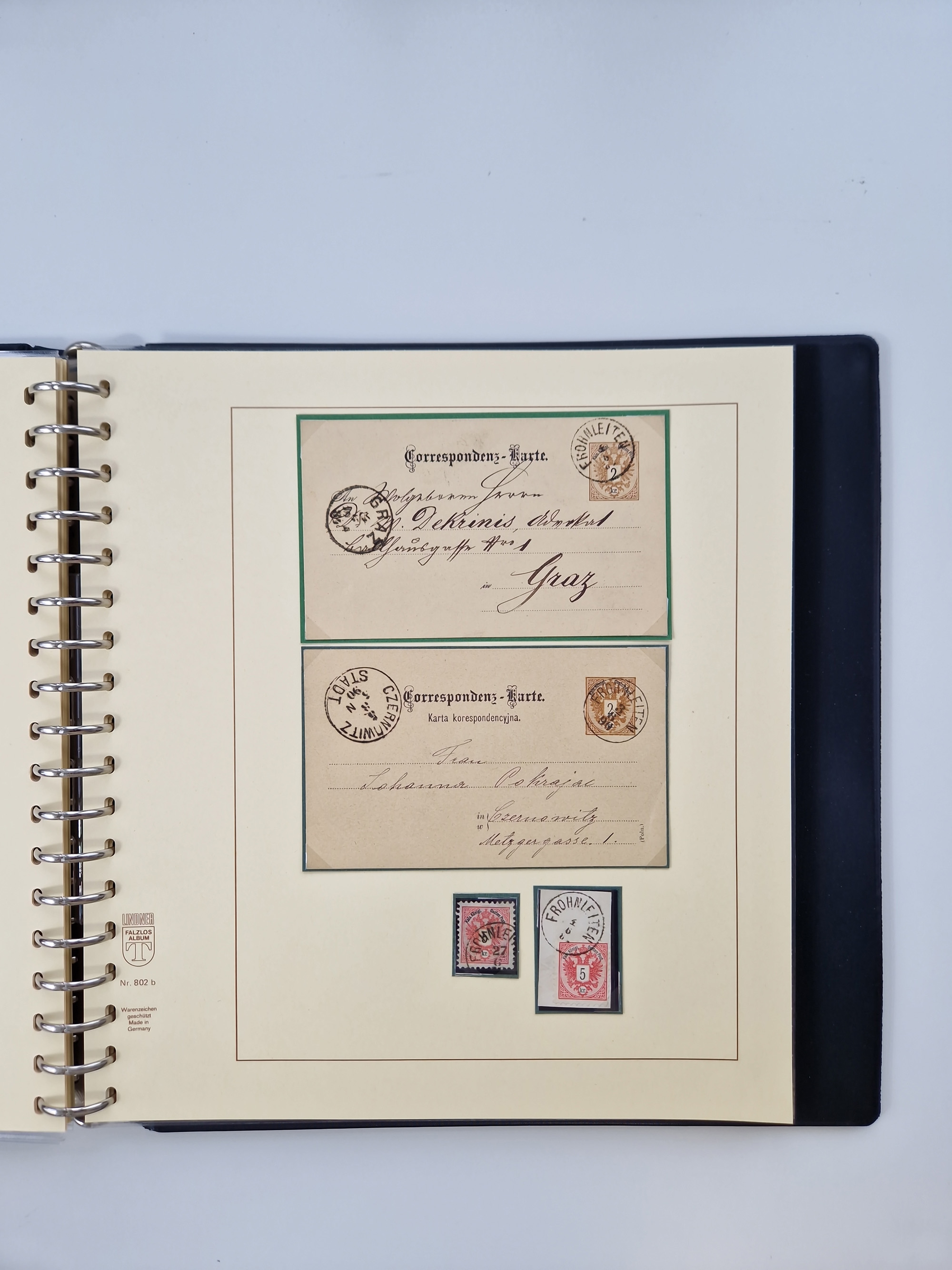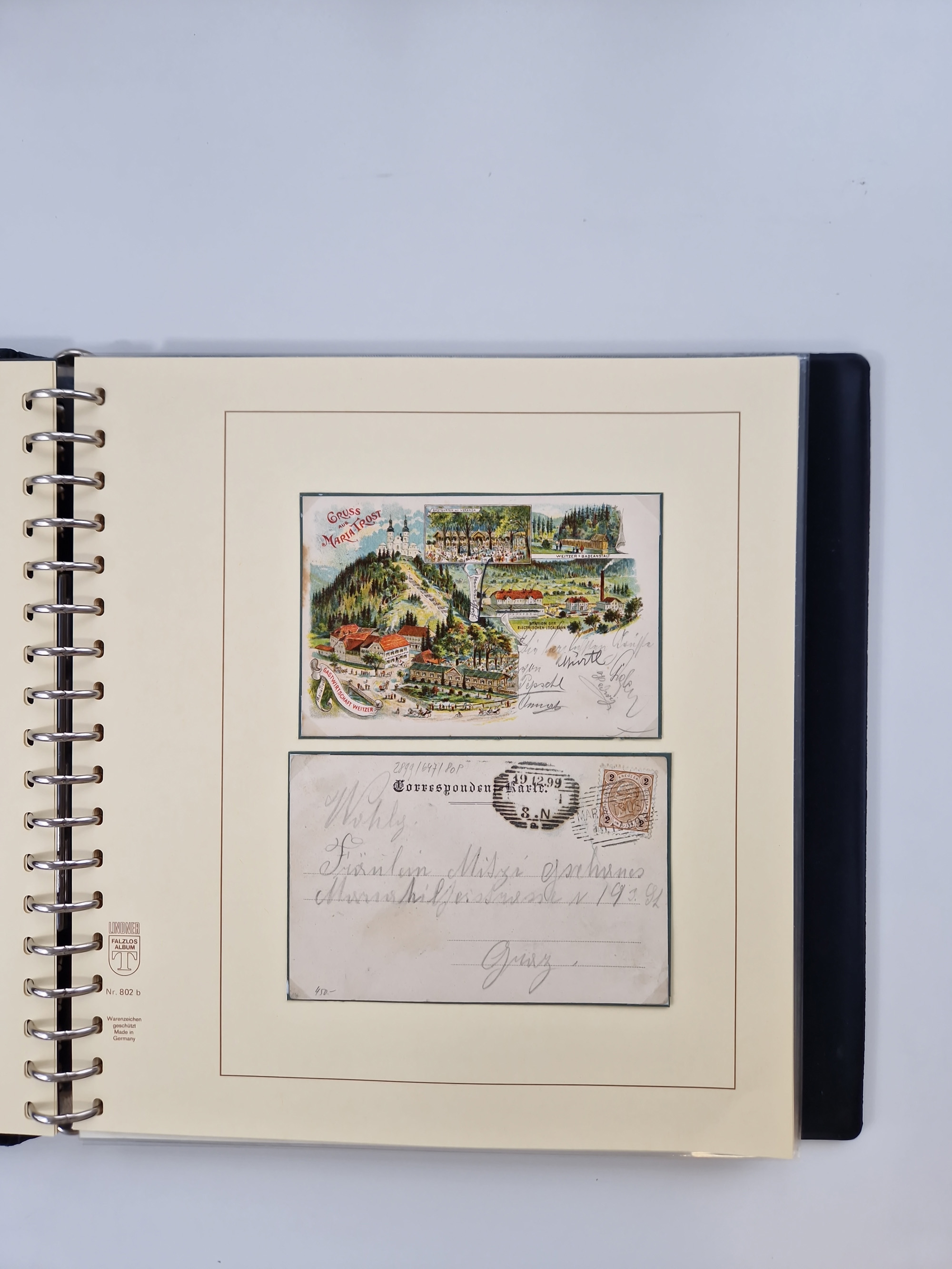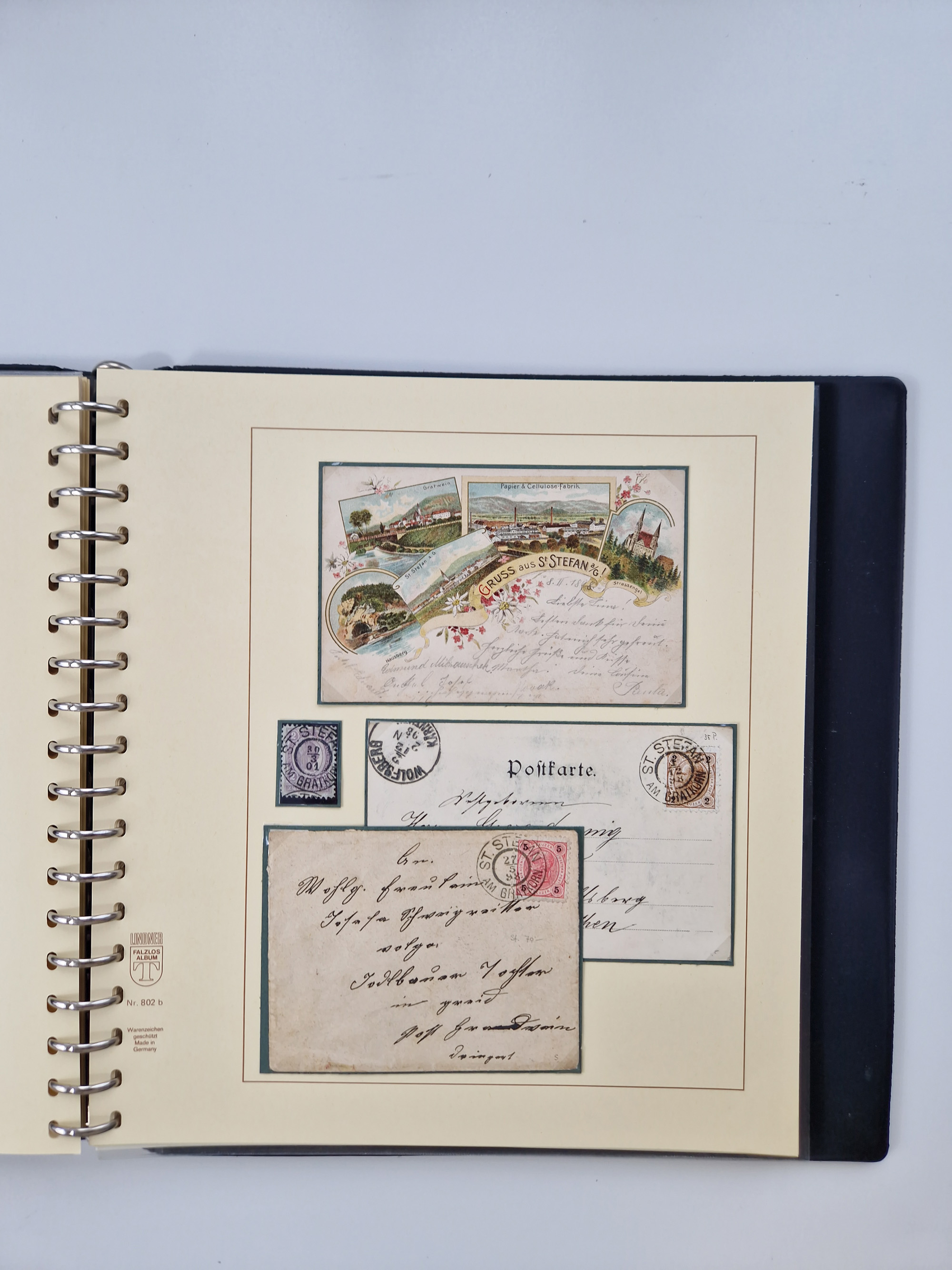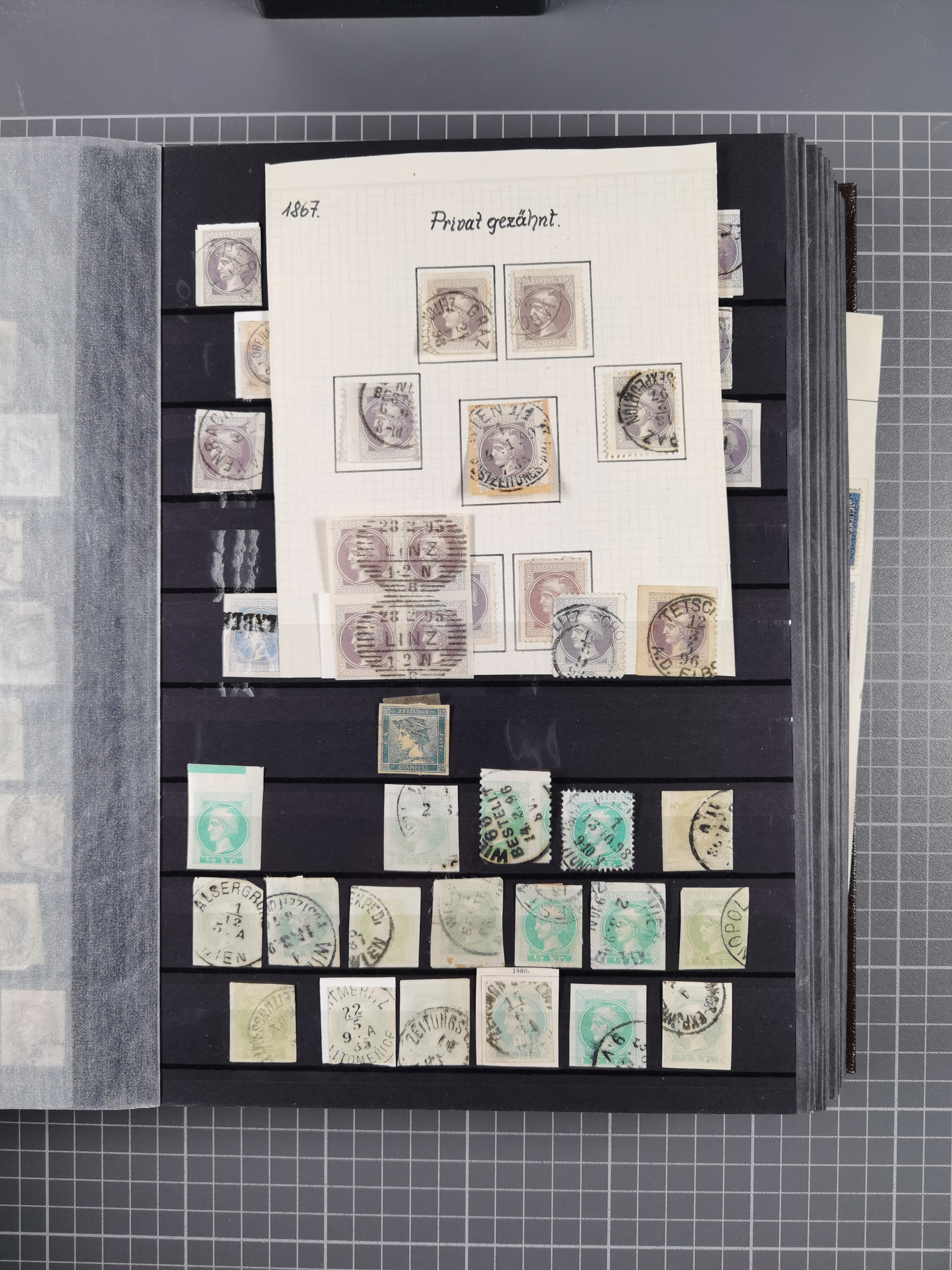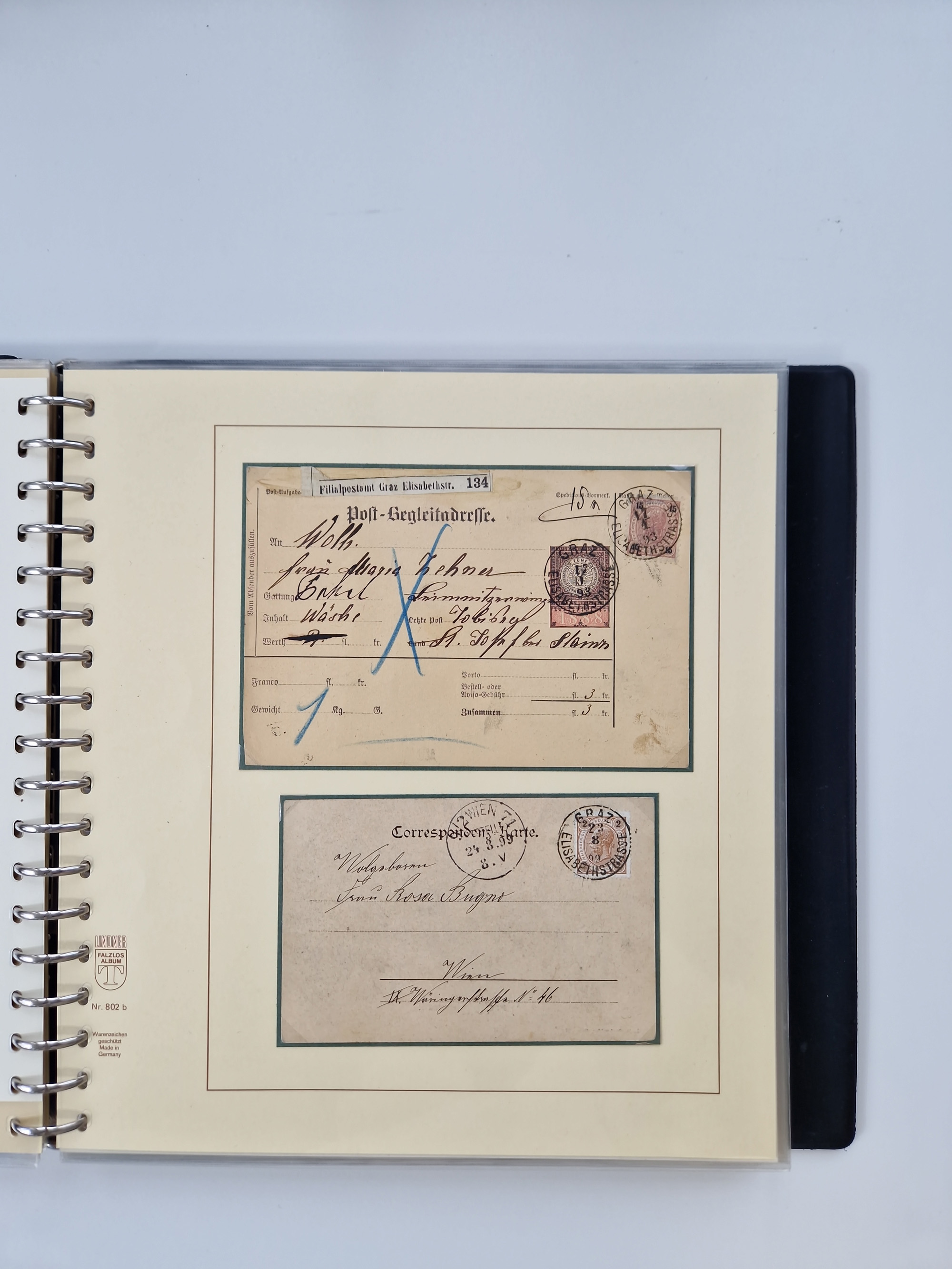 1850/1919 (ca.), zahlreiche aufgezogene Heimat-Sammlung “GRAZ” und Umgebung Andritz bis Zettling, mit über 220 Briefen und Karten, besseren Einzel- und Mehrfachfrankaturen, Buntfrankaturen sowie R-Briefen, Ansichtkarten mit Lithos und weiteren Besonderheiten, Schwerpunkt bei den Ausgaben 1883 bis 1899, dabei u.a. Destination Finnland, 1897 R-Brief auf “BRUXELLES” nach Graz weitergeleitet mit Mischfrankatur, ferner lose Marken und Briefstücke ab Ausgabe 1850 mit meist klaren Stempel-Abschlägen, “PUNTIGEN” auf 6 Kr. (Müller.-Nr. 2276a, 150 Punkte), etc., dabei auch Postscheine, Postanweisungen, Paketkarten oder Recepissen. Ein außerordentlich reichaltiges und interessantes Objekt, zusammen in 4 Alben