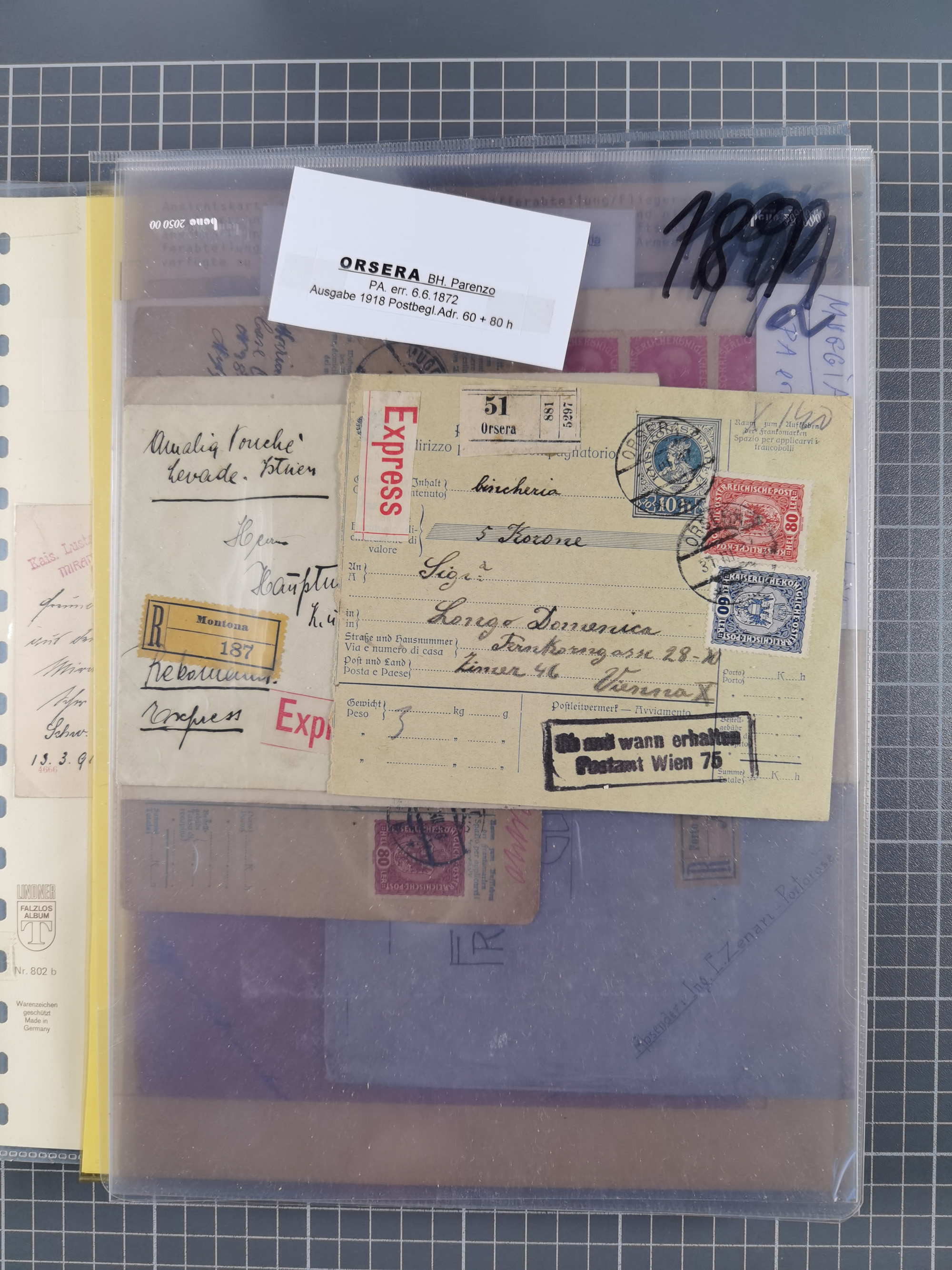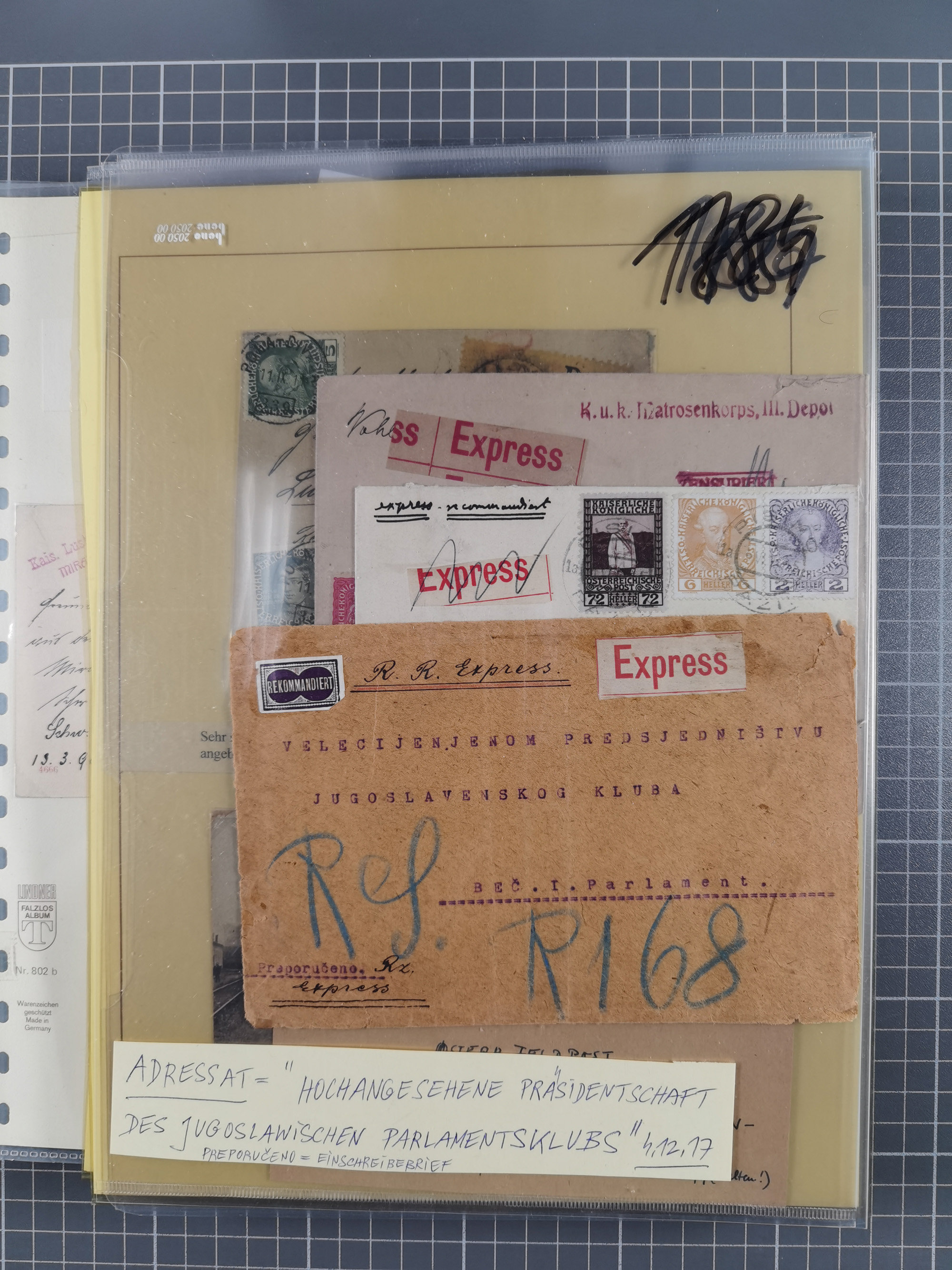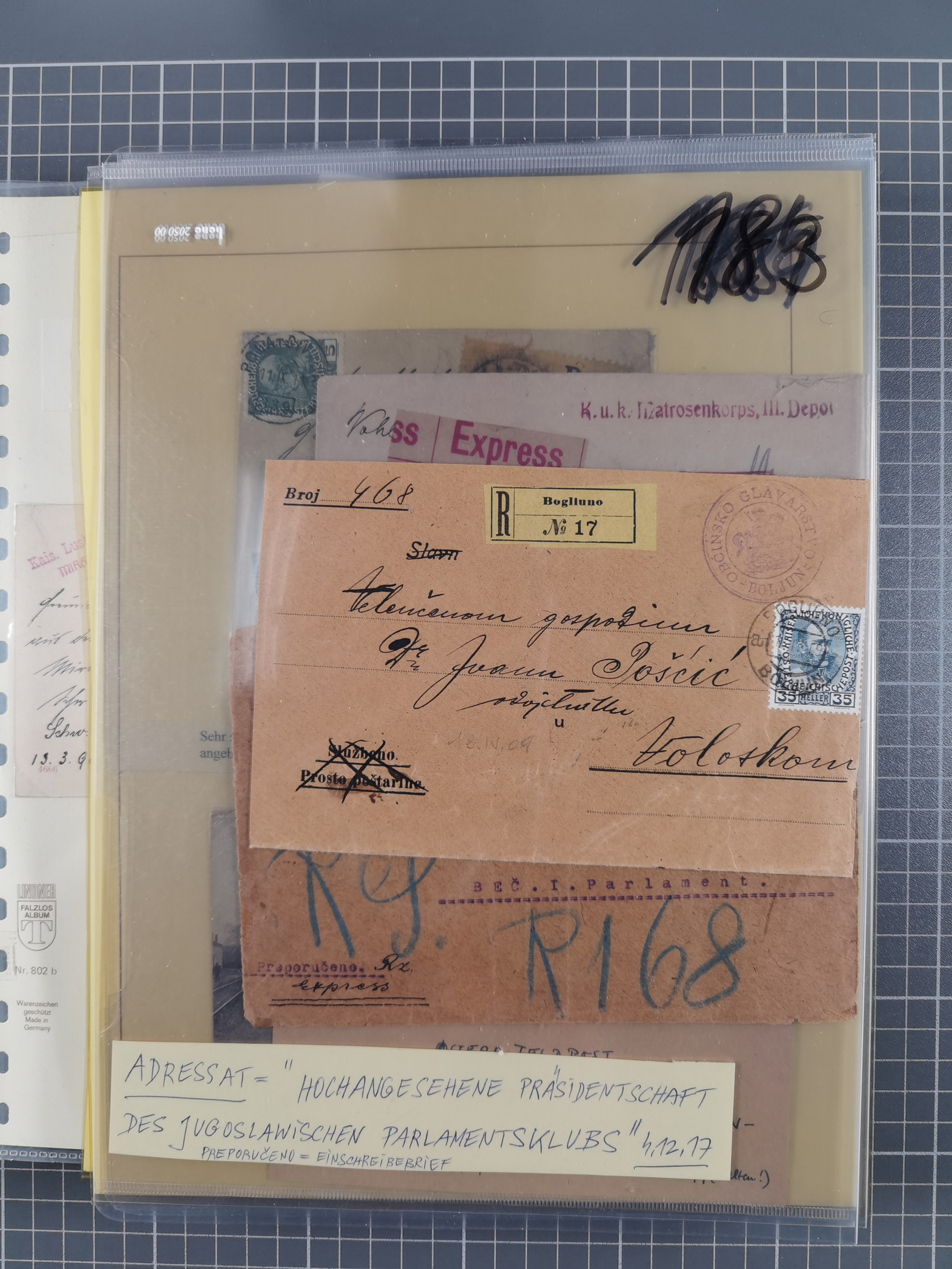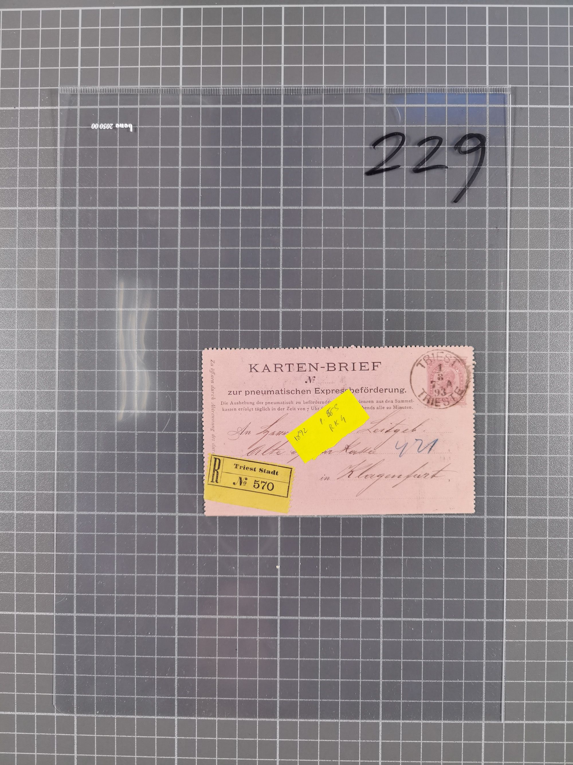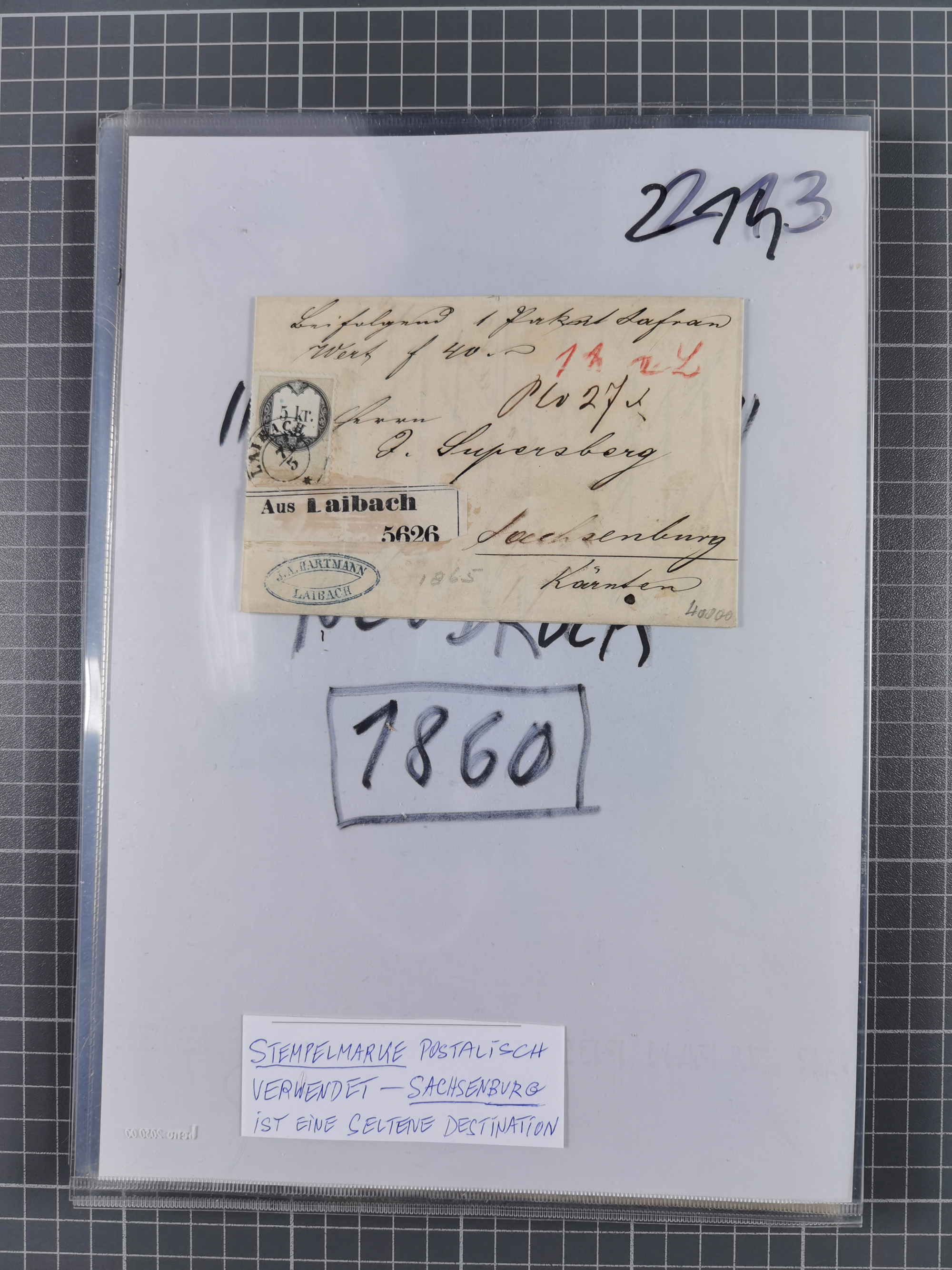 1756/1993 (ca.), reichhaltige Heimatsammlung “KLAGENFURT” mit über 650 Briefen und Karten, ab Vorphilatelie, dabei auch Postscheine, Postanweisungen, Paketkarten, Recepissen, etc., mit vielen interessanten Stücken, angefangen mit u.a. Briefhülle vom 14.9.1756 nach Salzburg mit rückseitigem Ra. “V. Clagenfurth”, “KLAGENFURT / FRANCO” in rot (2), EKr. rückseitig auf recommandiertem Brief, sog. Bienenkorbstempel in schwarz und in blau je auf R-Brief, EKr. auf Postanweisung mit Zufrankatur, EKr. auf R-Brief mit Mi.-Nr. 4, sowie R-Brief mit Mi.-Nr. 15, ferner slowenische Besetzung von Klagenfurt mit L1 “SHS Celovec” in blau auf Ganzsachenkarte, “VOJASKI POSTNI URAD CELOVEC” auf Karte, Postanweisung über 40,4 M. mit Mi.-Nr. 747, etc., ferner einige Lose Marken aus Mi.-Nr. 1-5, in acht Ordnern