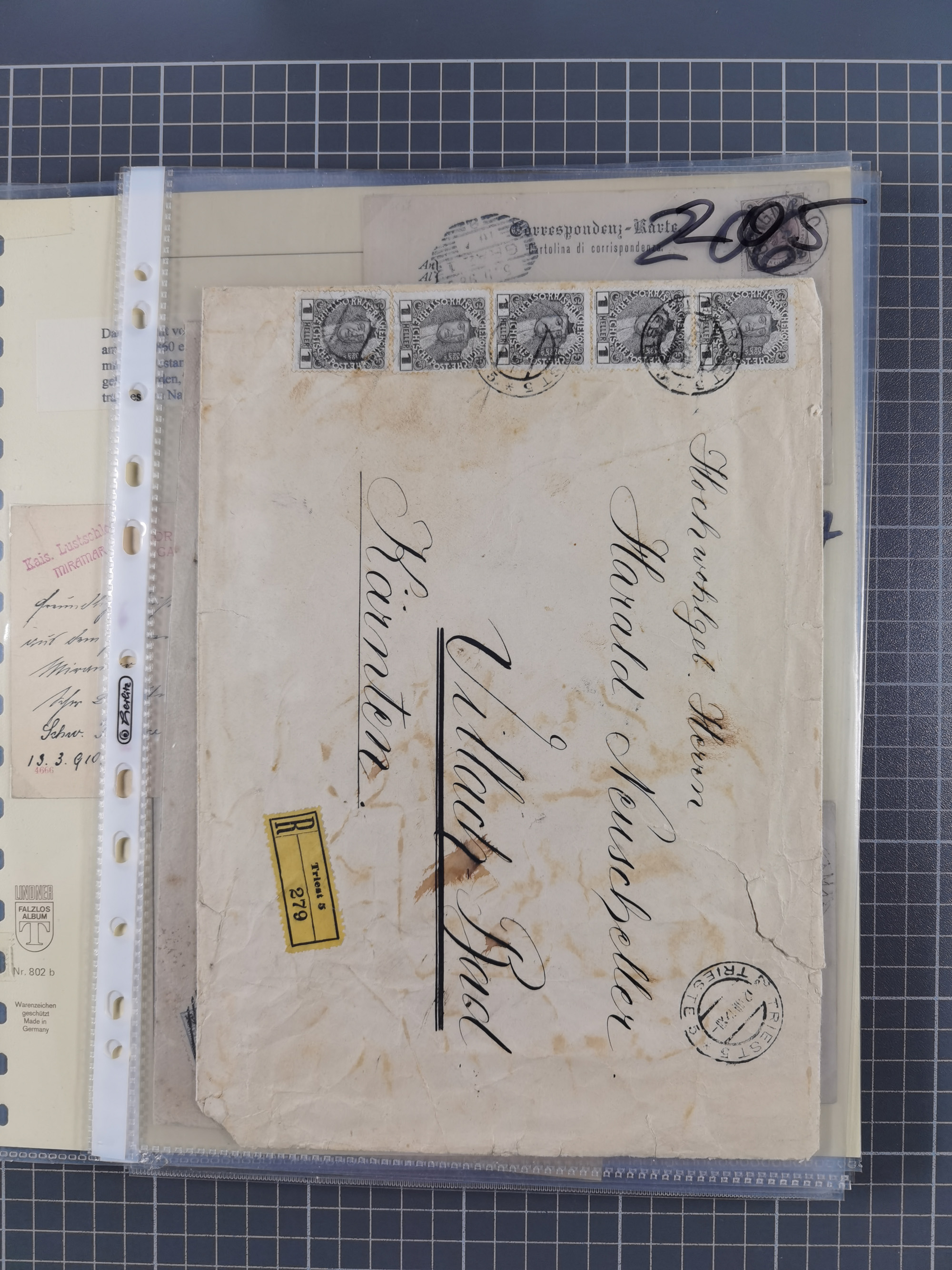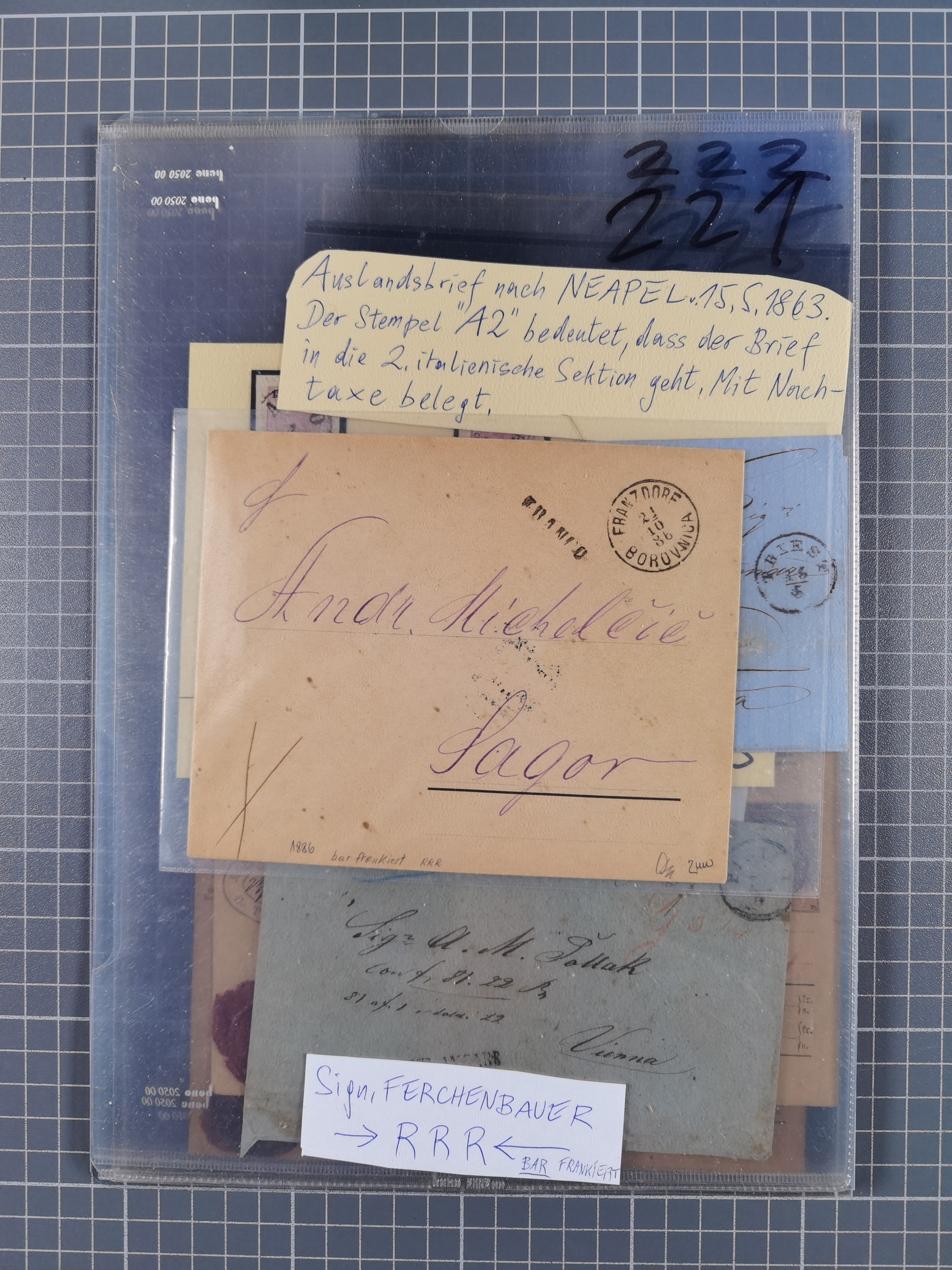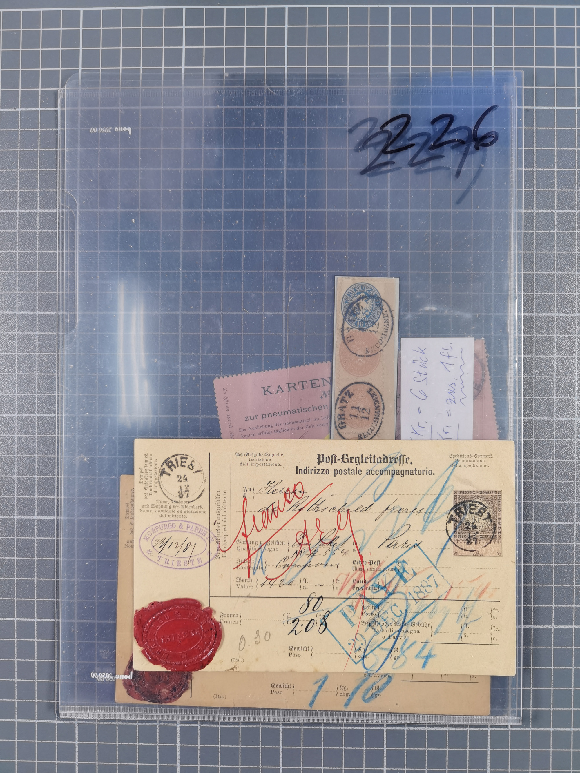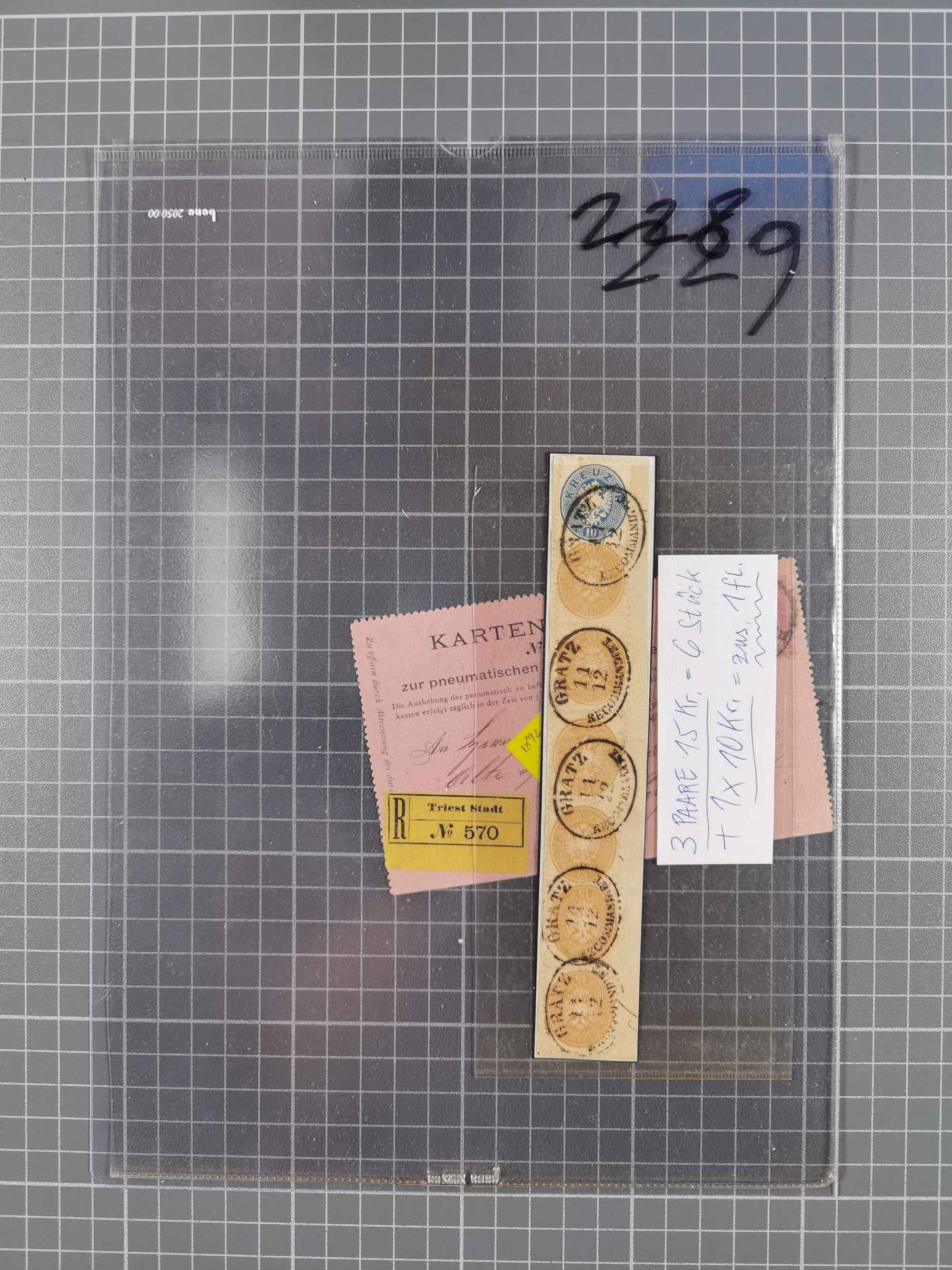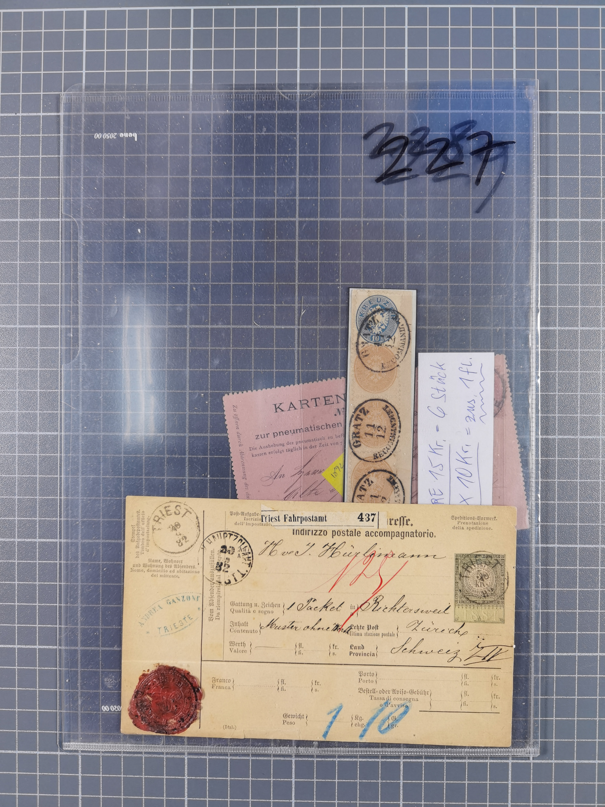 1850/1919 (ca.), zahlreiche aufgezogene Heimat-Sammlung “GRAZ” und Umgebung Andritz bis Zettling, mit über 220 Briefen und Karten, besseren Einzel- und Mehrfachfrankaturen, Buntfrankaturen sowie R-Briefen, Ansichtkarten mit Lithos und weiteren Besonderheiten, Schwerpunkt bei den Ausgaben 1883 bis 1899, dabei u.a. Destination Finnland, 1897 R-Brief auf “BRUXELLES” nach Graz weitergeleitet mit Mischfrankatur, ferner lose Marken und Briefstücke ab Ausgabe 1850 mit meist klaren Stempel-Abschlägen, “PUNTIGEN” auf 6 Kr. (Müller.-Nr. 2276a, 150 Punkte), etc., dabei auch Postscheine, Postanweisungen, Paketkarten oder Recepissen. Ein außerordentlich reichaltiges und interessantes Objekt, zusammen in 4 Alben