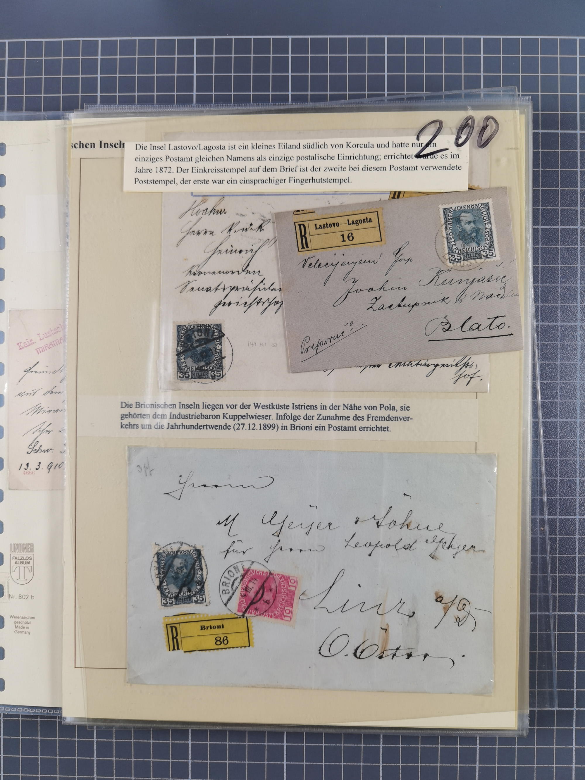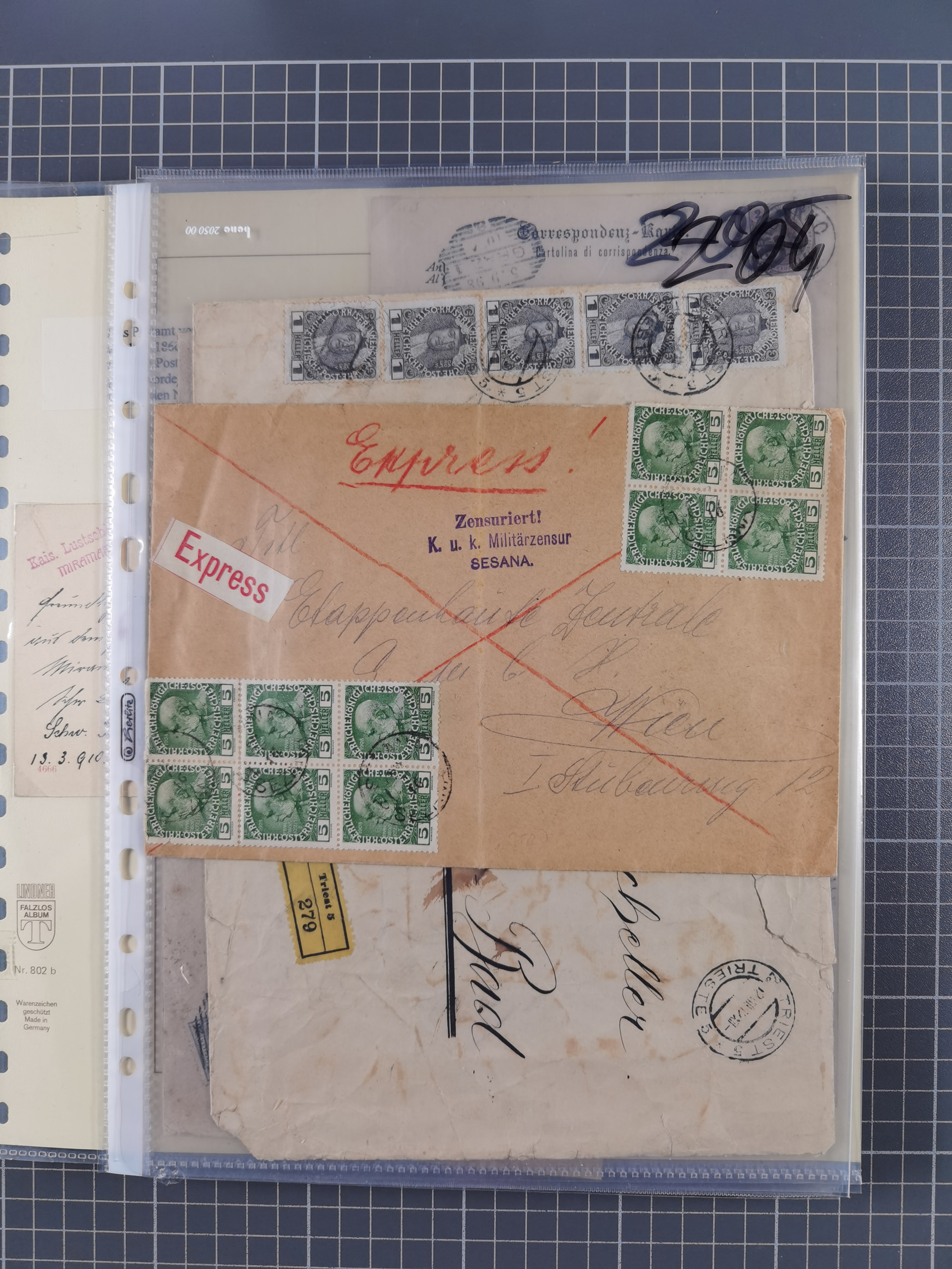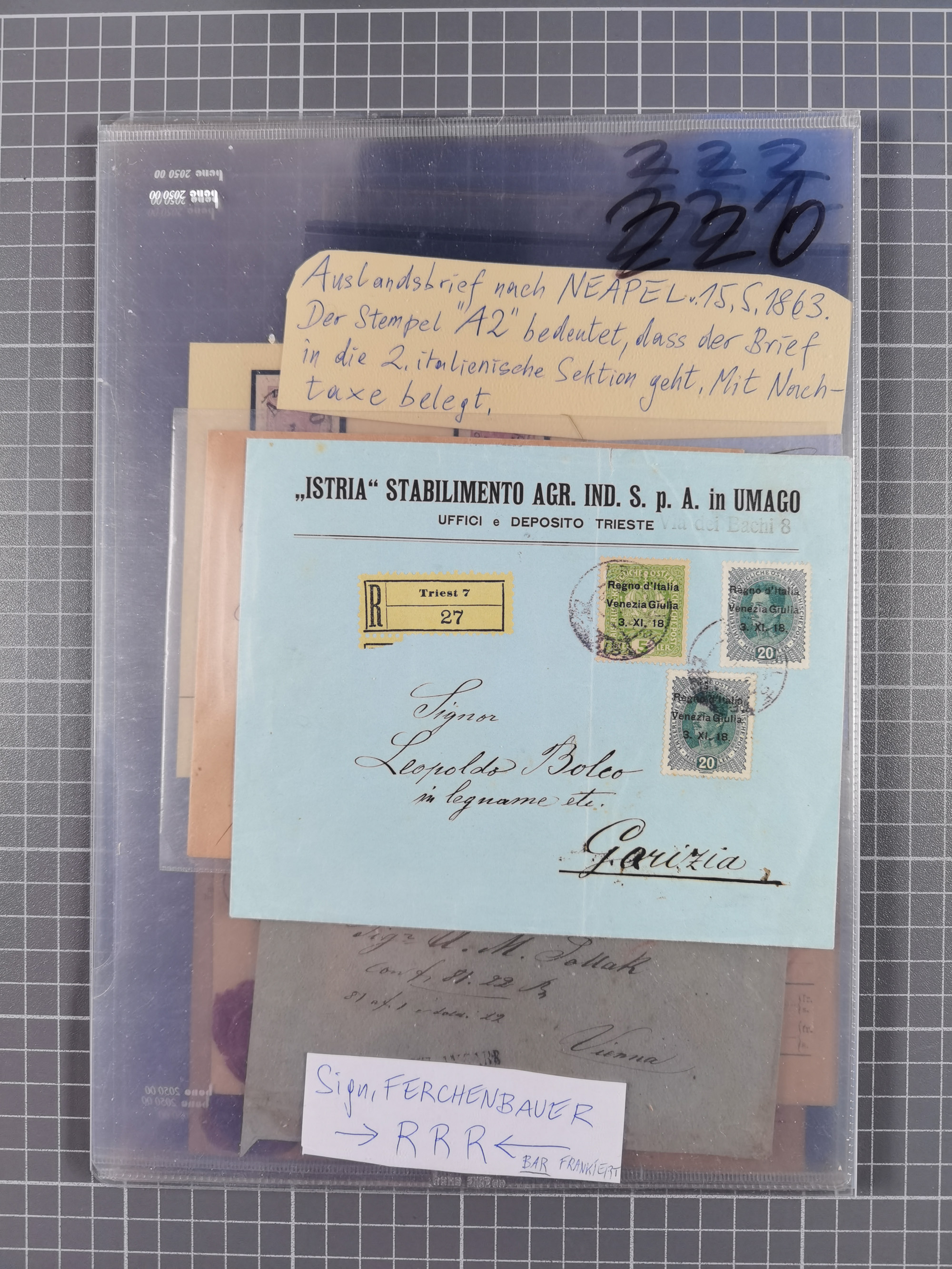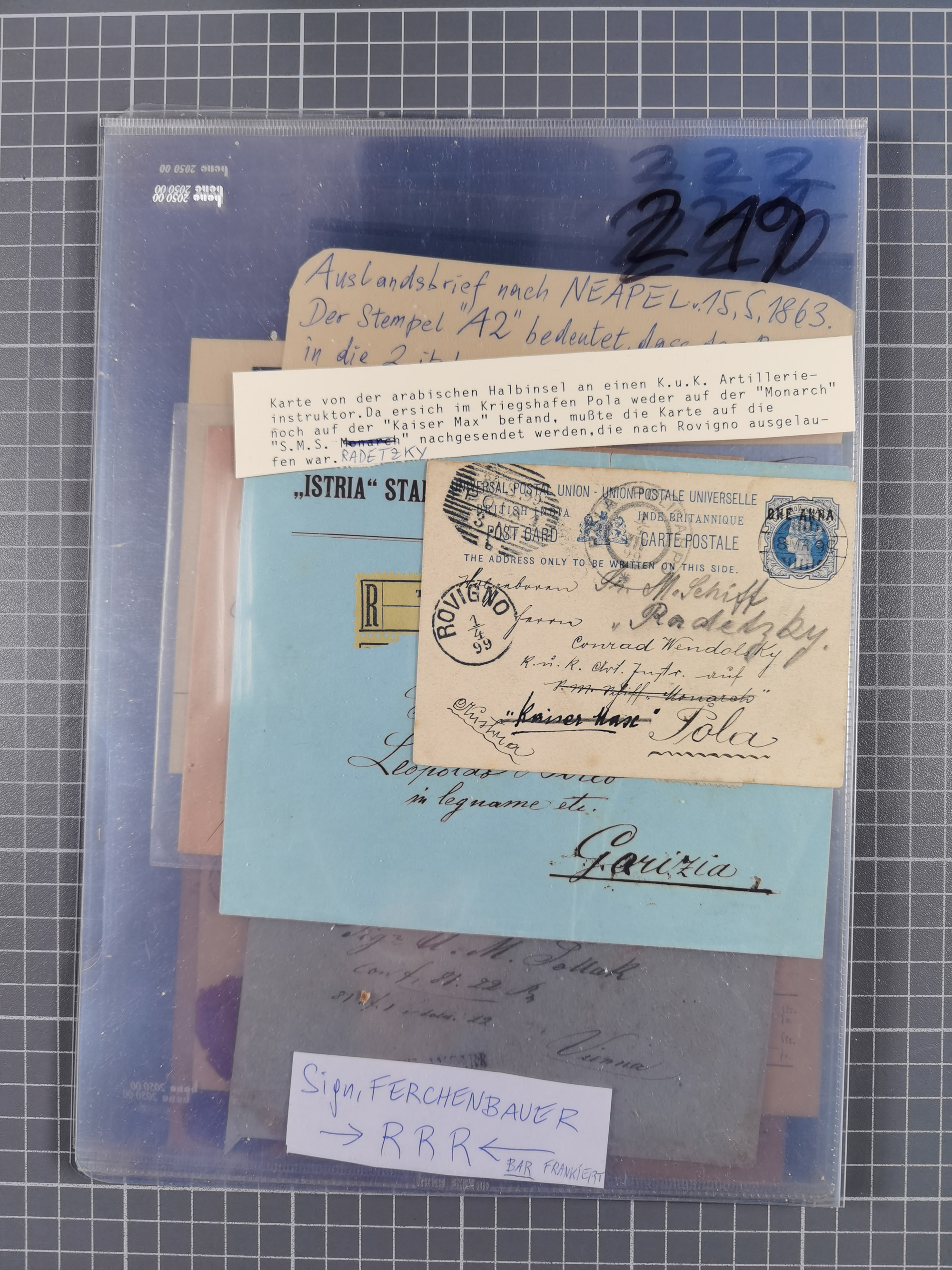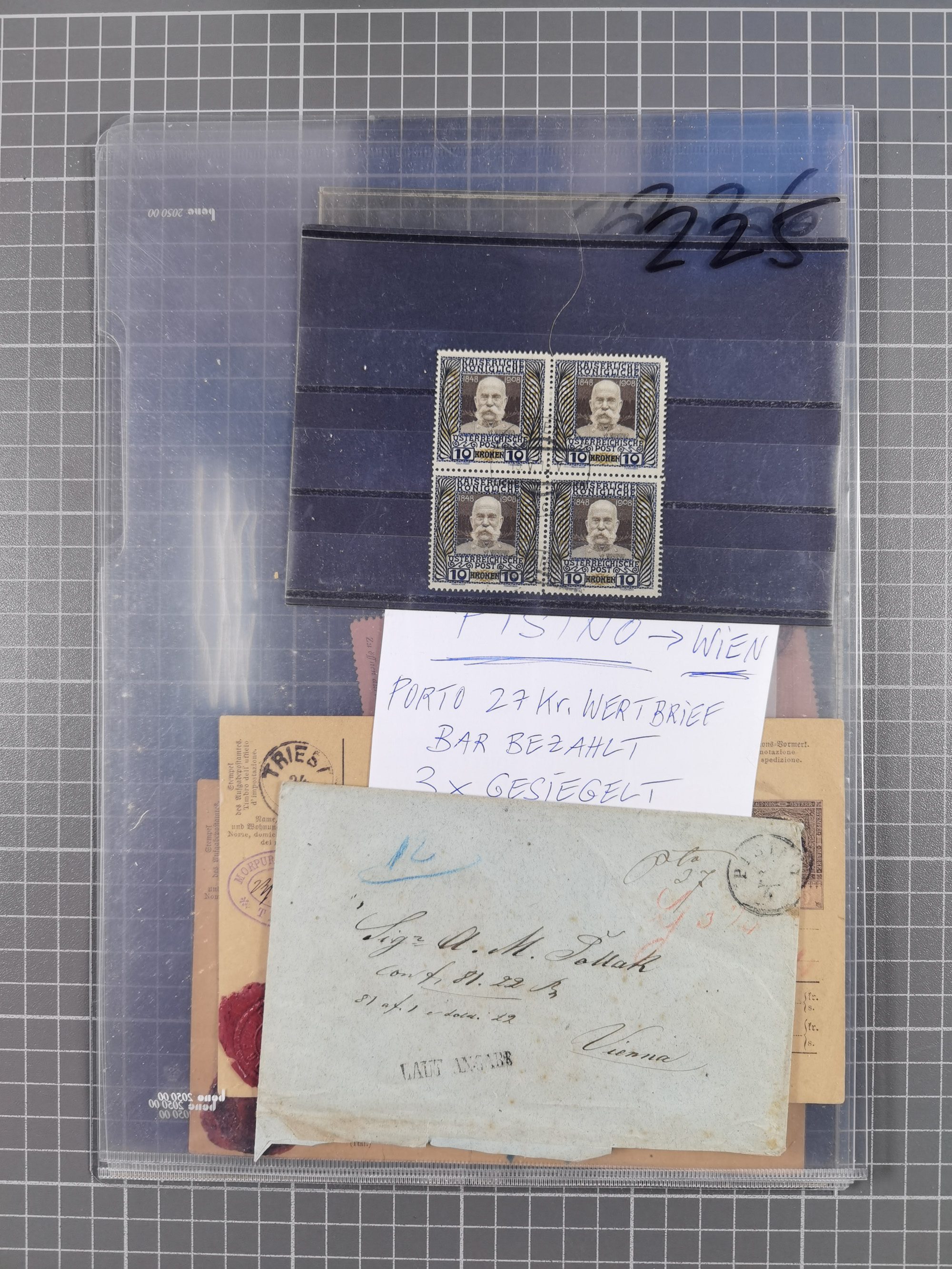 1850/1914, kleine gestempelte Partie mit 16 Briefen und Karten, dabei bessere Stücke mit u.a. Mi.-Nr. 3X (gefaltet) mit “LEOBEN 4. JUNI (1850)” auf Faltbrief nach Vordernberg (erste Woche der Verwendung), Mi.-Nr. 1 mit blauem “HRASTINGO” auf Drucksache-Streifband nach Pesth, Schiffspost mit “METKOVIC-TRIEST 16 III 14 32” auf R-zettel auf Umschlag nach Triest, etc., die Erhaltung etwas leicht unterschiedlich