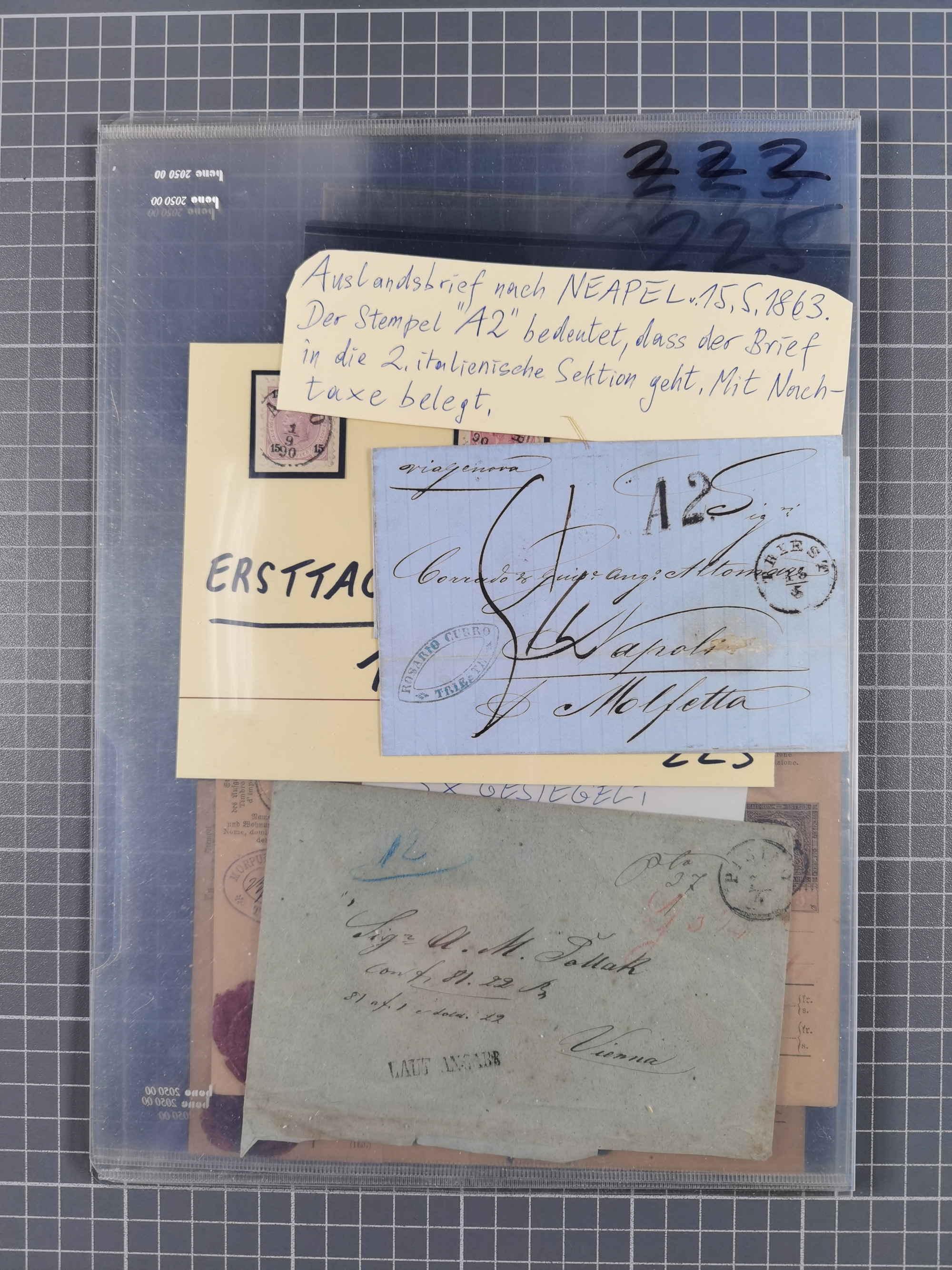 1822/1860 (ca.), über 200 Briefe mit Schwerpunkt Vorphilatelie, dabei Recepissen, recommandierte Briefe, Franco-Briefe, viele mit unterschiedlichen Stempeltypen, dabei kleine Orte, Zusatzstempel, Ovalstempel, Zierstempel, Wiener Stadtpost, etc., sehr reichhaltig, teils aufgezogen, im großen Karton