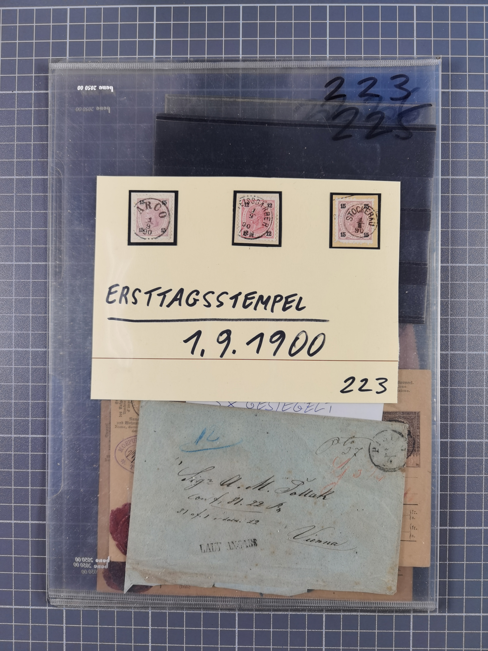 1883/90 (ca.), große aufgezogene Sammlung “Stempeltypen auf den Ausgaben 1883/90” mit über 320 Briefen und Karten, viele lose Marken und Briefstücke mit meist klaren Abstempelungen, dabei u.a. Langstempeln mit “KORSZÓW” in blau auf Briefstück, Ovalstempel “K.K. POSTAMT WOLFSBERG” auf 5 Kr. auf Brief nach Graz, “DNESPEK” auf Briefstück, etc., schöne Auswahl an Fingerhutstempeln, einige R-Briefe. Ein interessantes Objekt, sauber sortiert auf selbst gestalteten Albenblättern, in 4 Alben