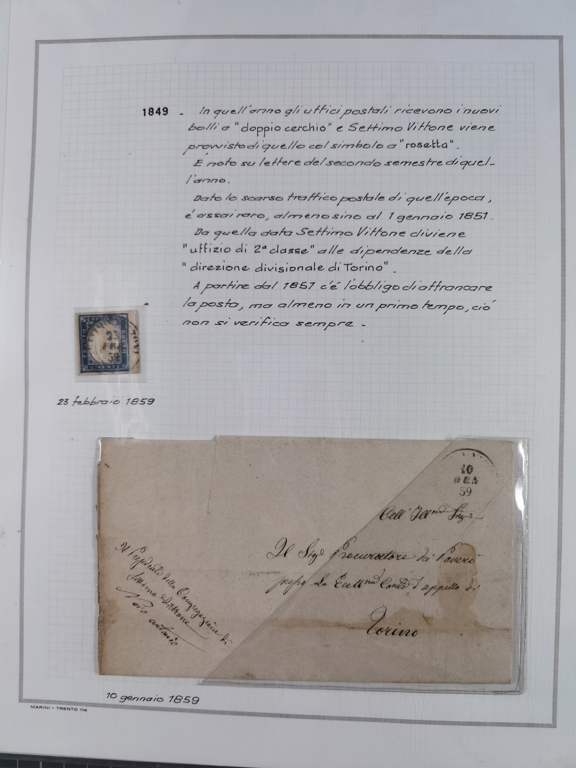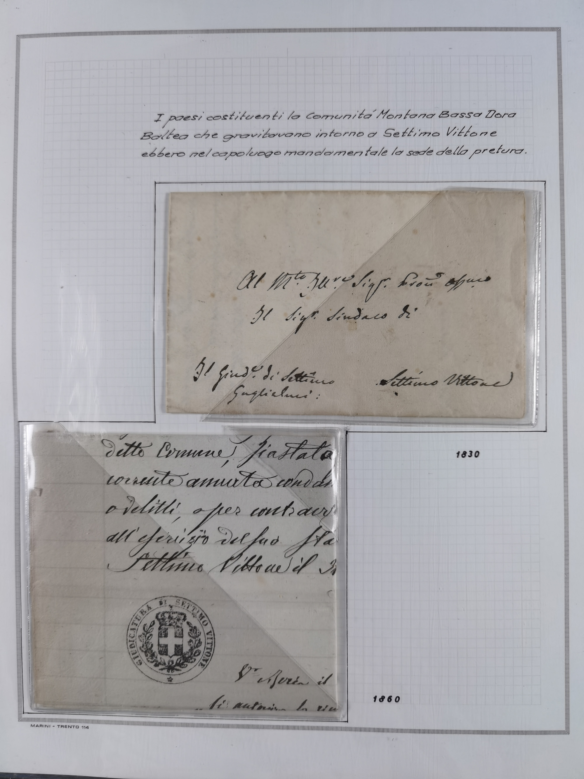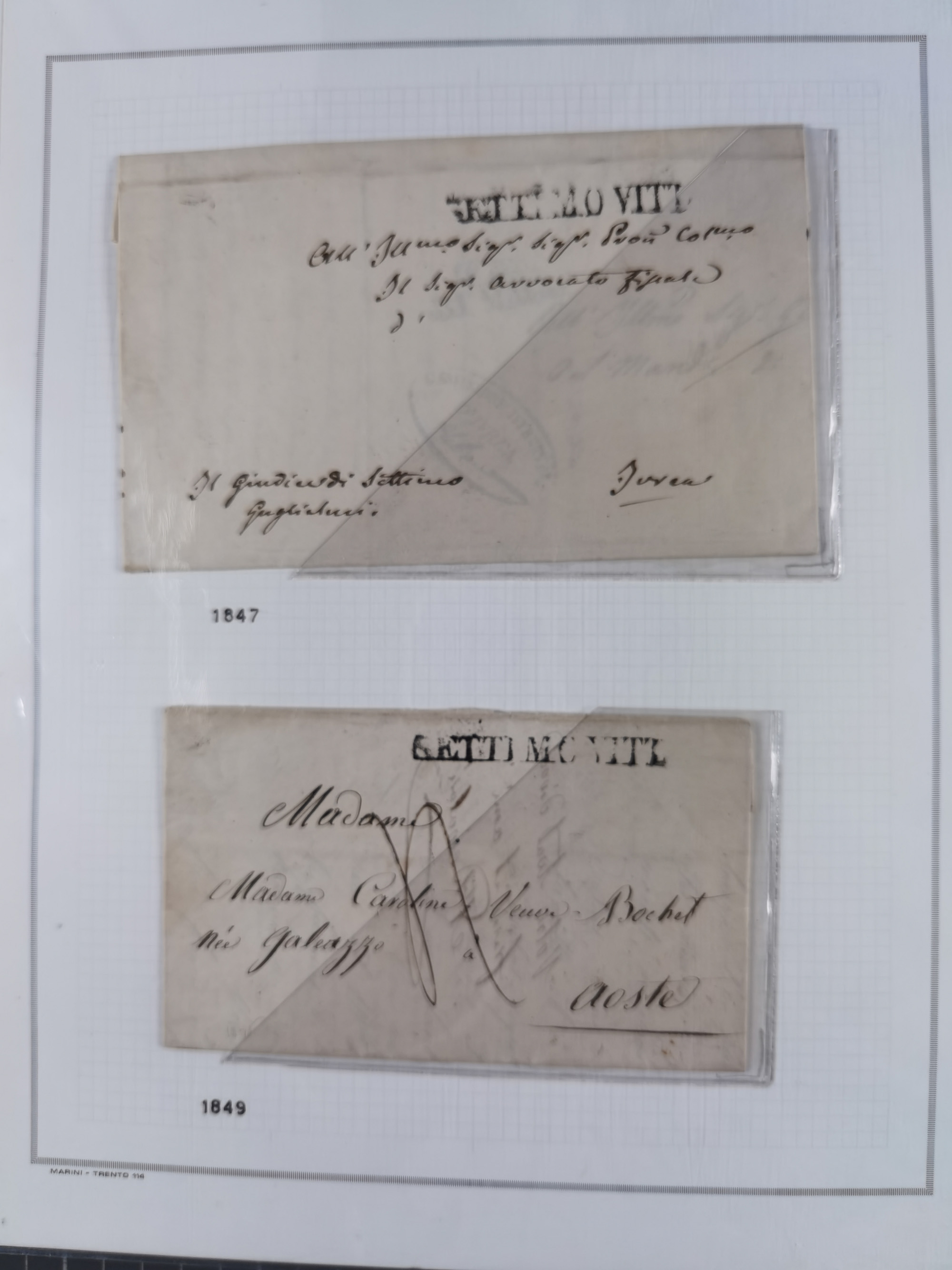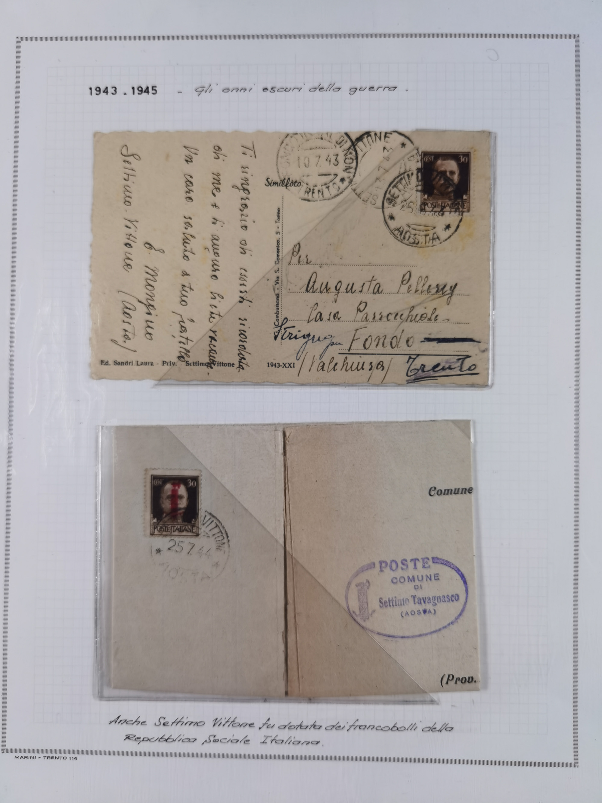 SARDINIEN: 1772/1960, Ausstellungssammlung “Die Stempel der Berggemeinschaft Bassa Dora Baltea” mit über 100 Briefen und Dokumente, Schwerpunkt mit ca. 80 Belegen ab der Napoleonischen Zeit bis ca. 1944, später einige frankierte Briefe, Ansichtskarten sowie Postscheine, sauber in drei Alben
