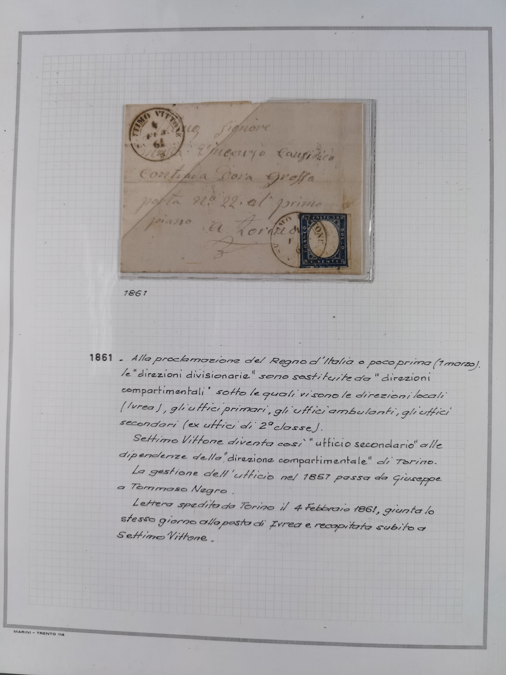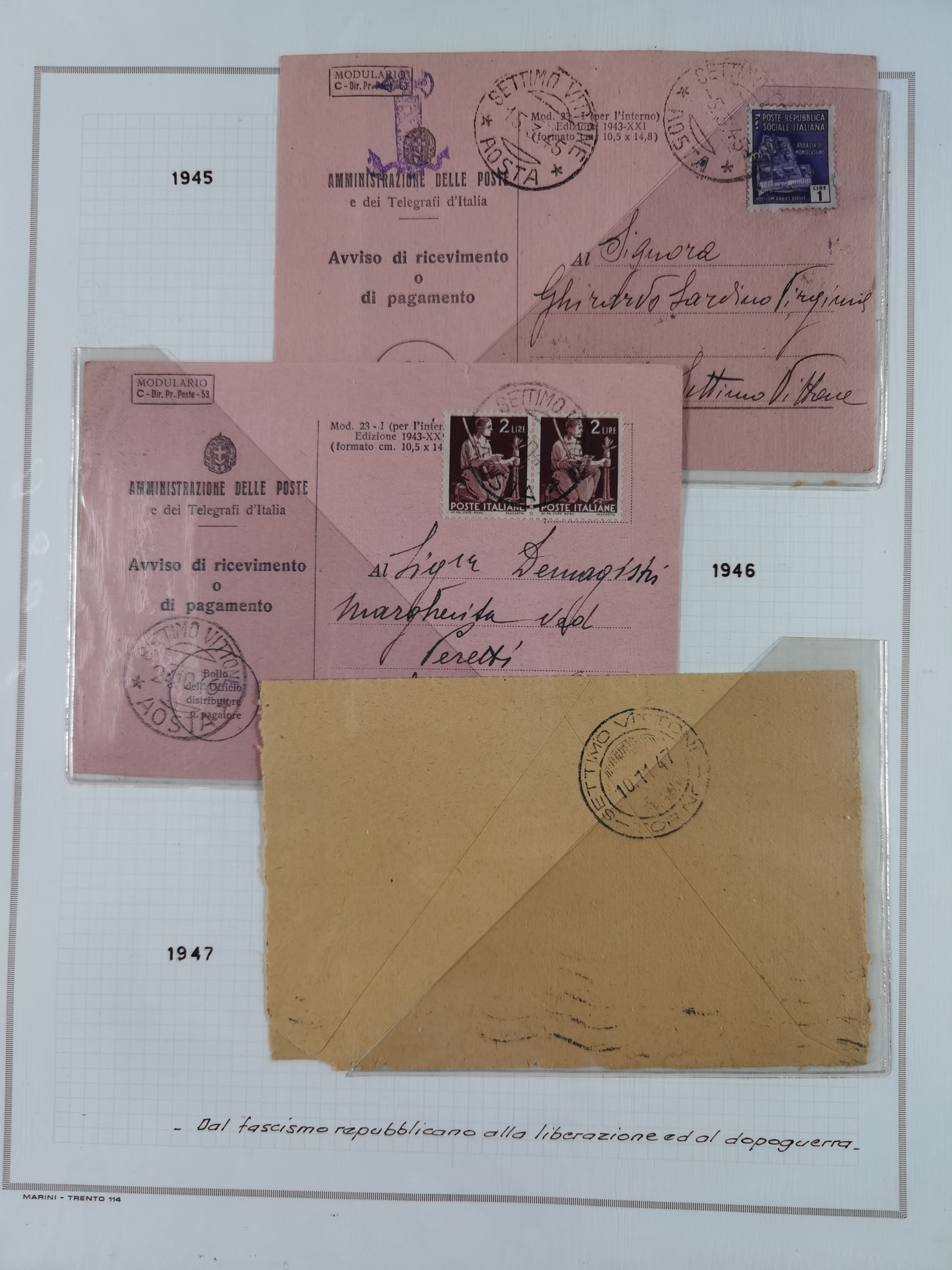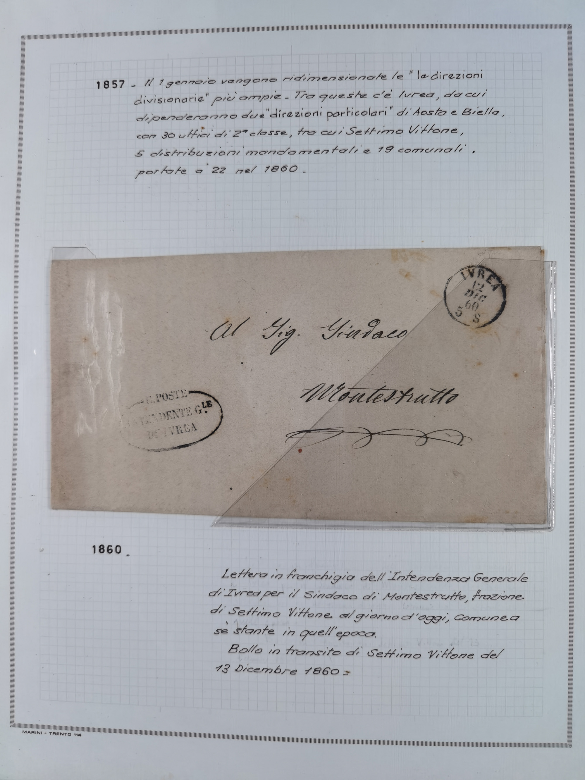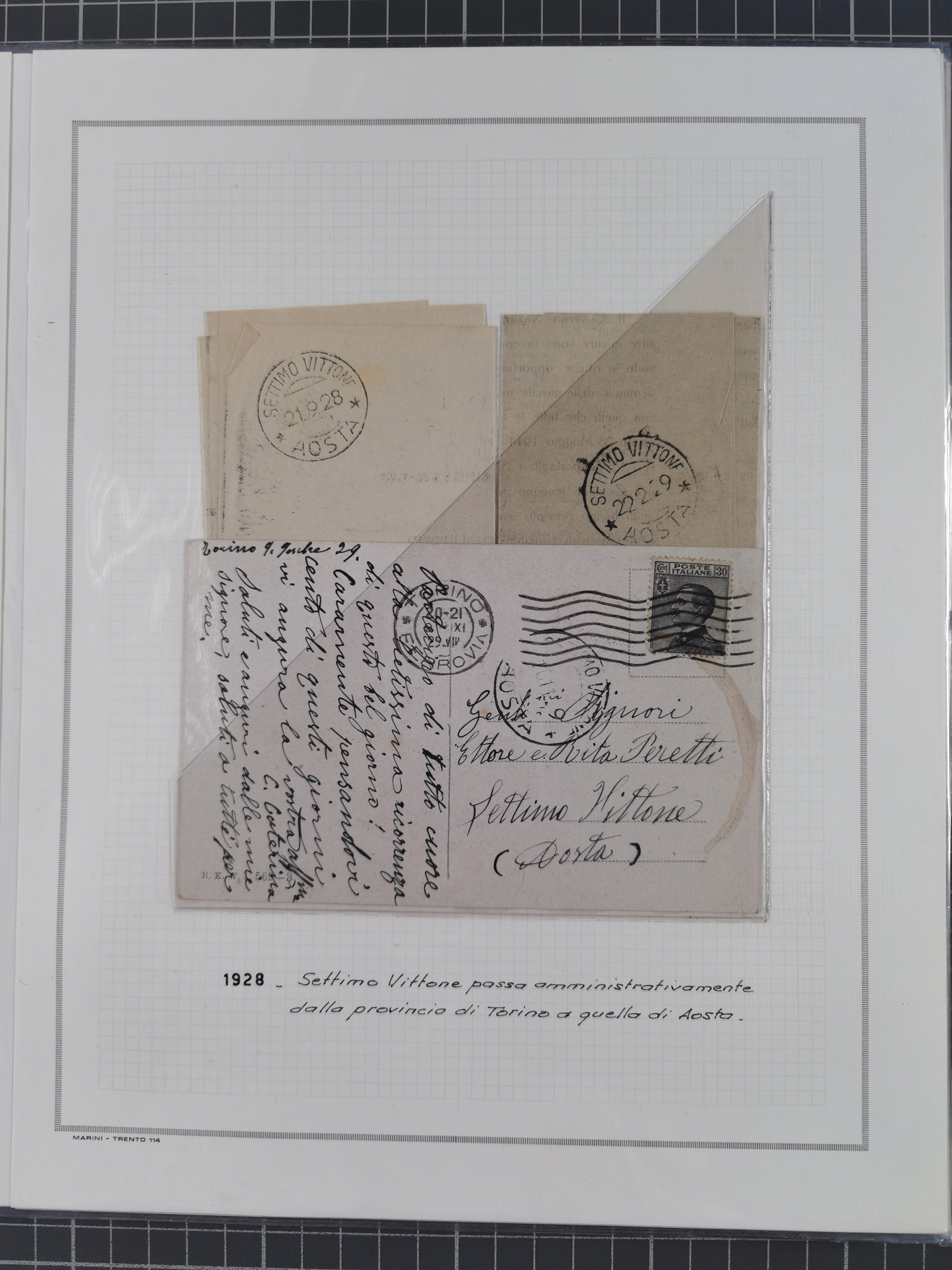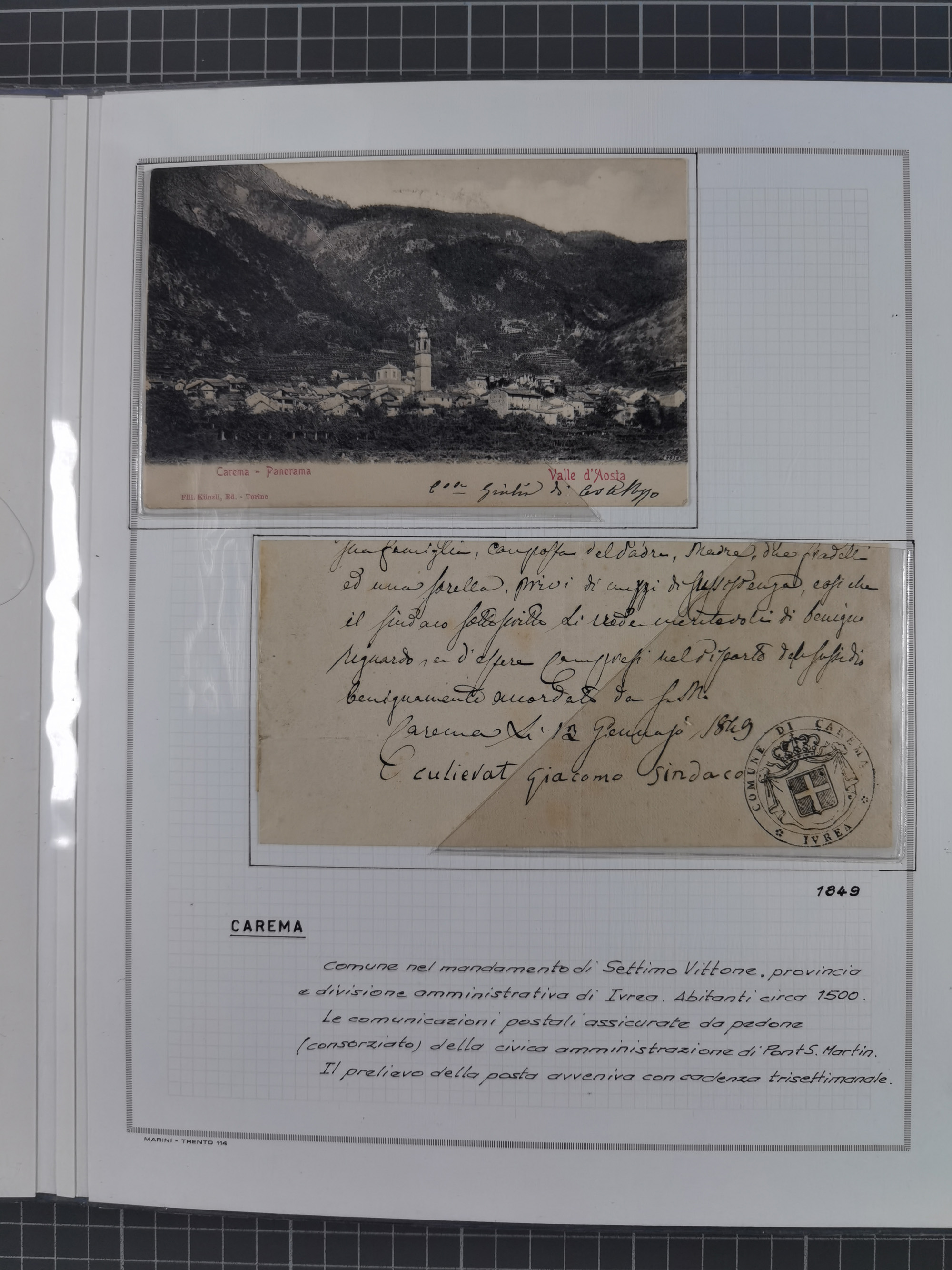 SARDINIEN: 1772/1960, Ausstellungssammlung “Die Stempel der Berggemeinschaft Bassa Dora Baltea” mit über 100 Briefen und Dokumente, Schwerpunkt mit ca. 80 Belegen ab der Napoleonischen Zeit bis ca. 1944, später einige frankierte Briefe, Ansichtskarten sowie Postscheine, sauber in drei Alben