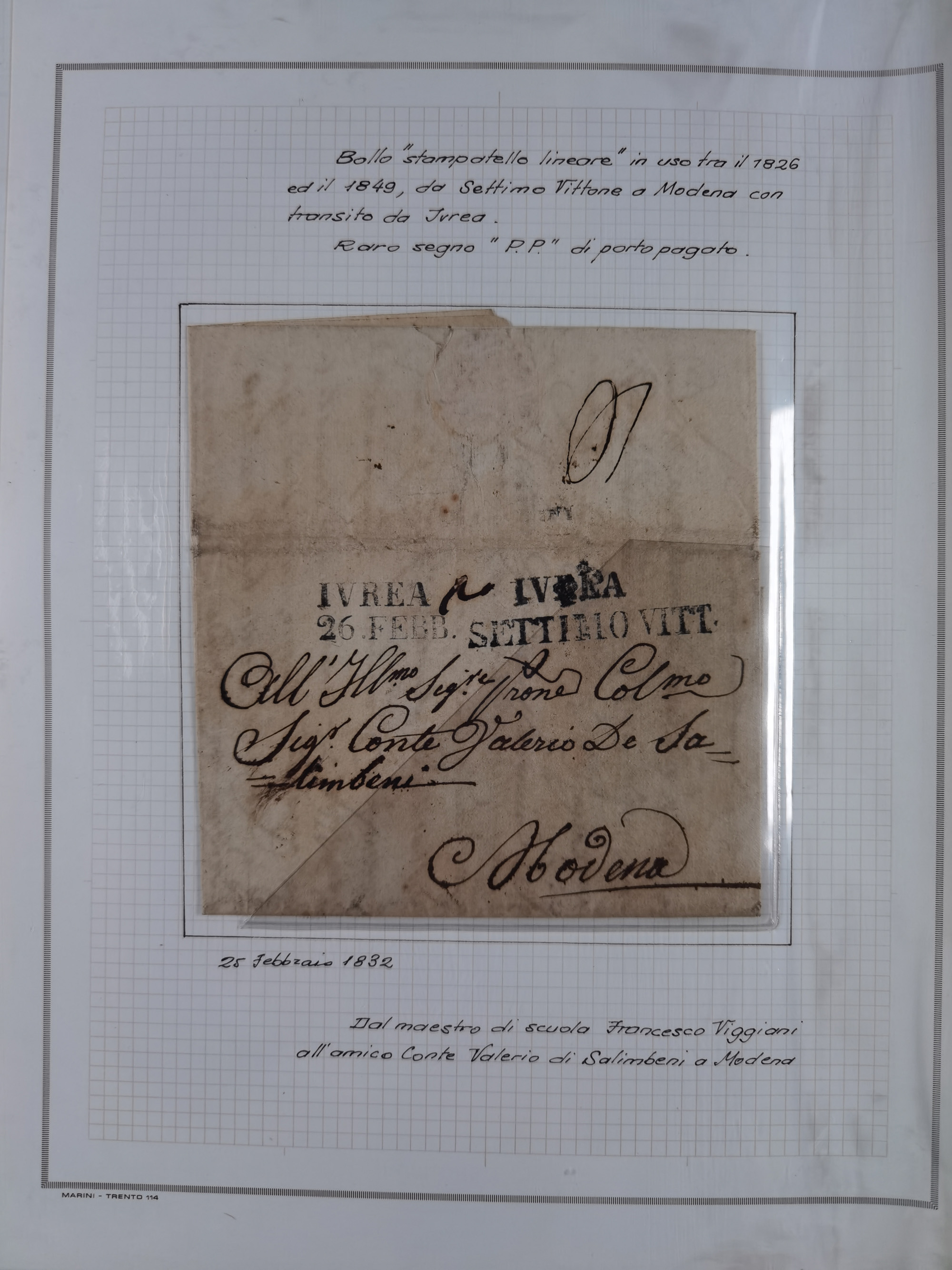 MODENA: 1691/1865, über 140 Briefe und Dokumente, viele mit seltenen Stempeln ab ca. 1806, dabei u.a. Expressbrief an den Bürgermeister von Reggio mit seltenem Stempel “S unter Kreuz”, 4 Belege mit Desinfektions-Etikette von Reggio (Juli-Oktober 1855), etc., sauber beschrieben in vier passenden Alben