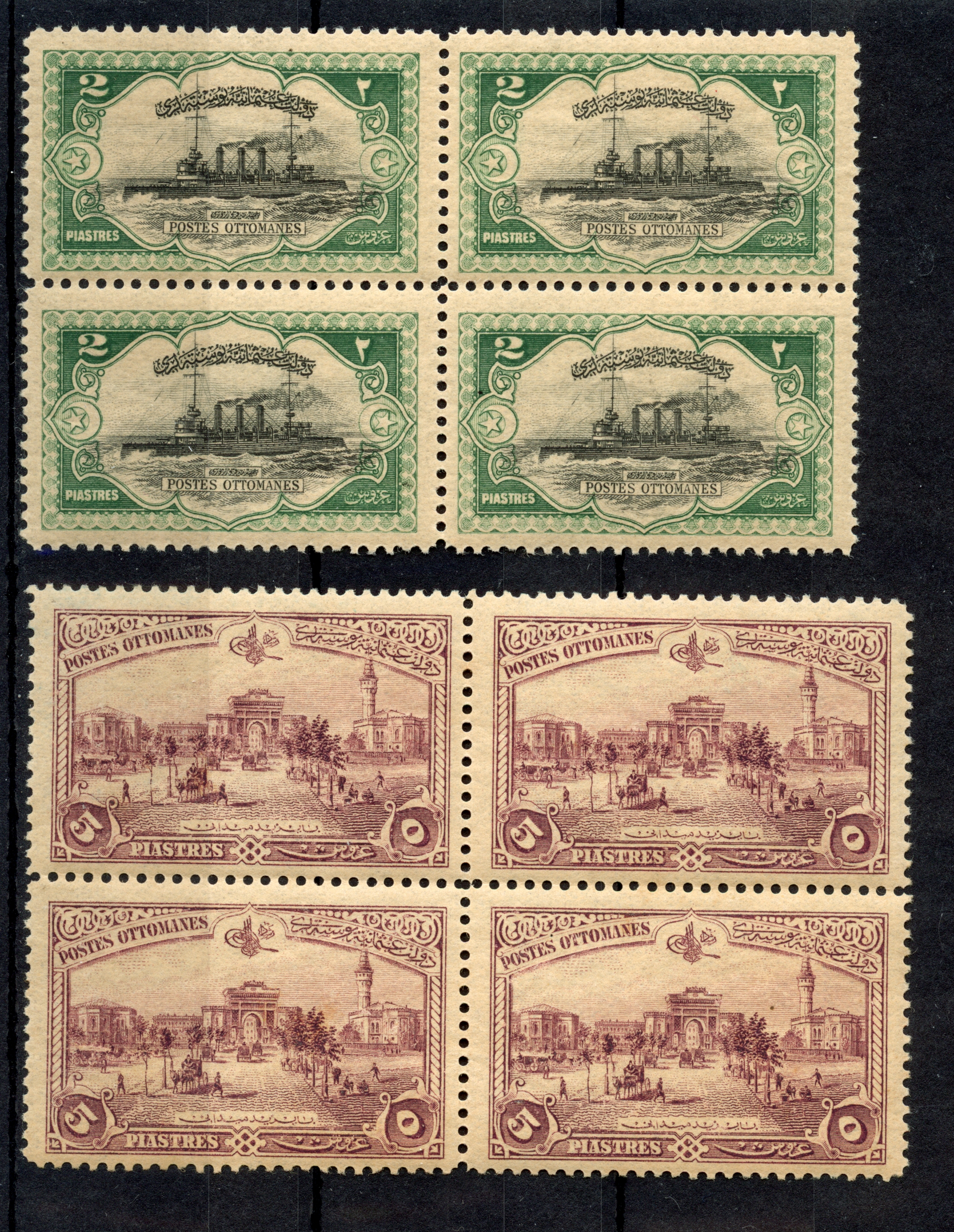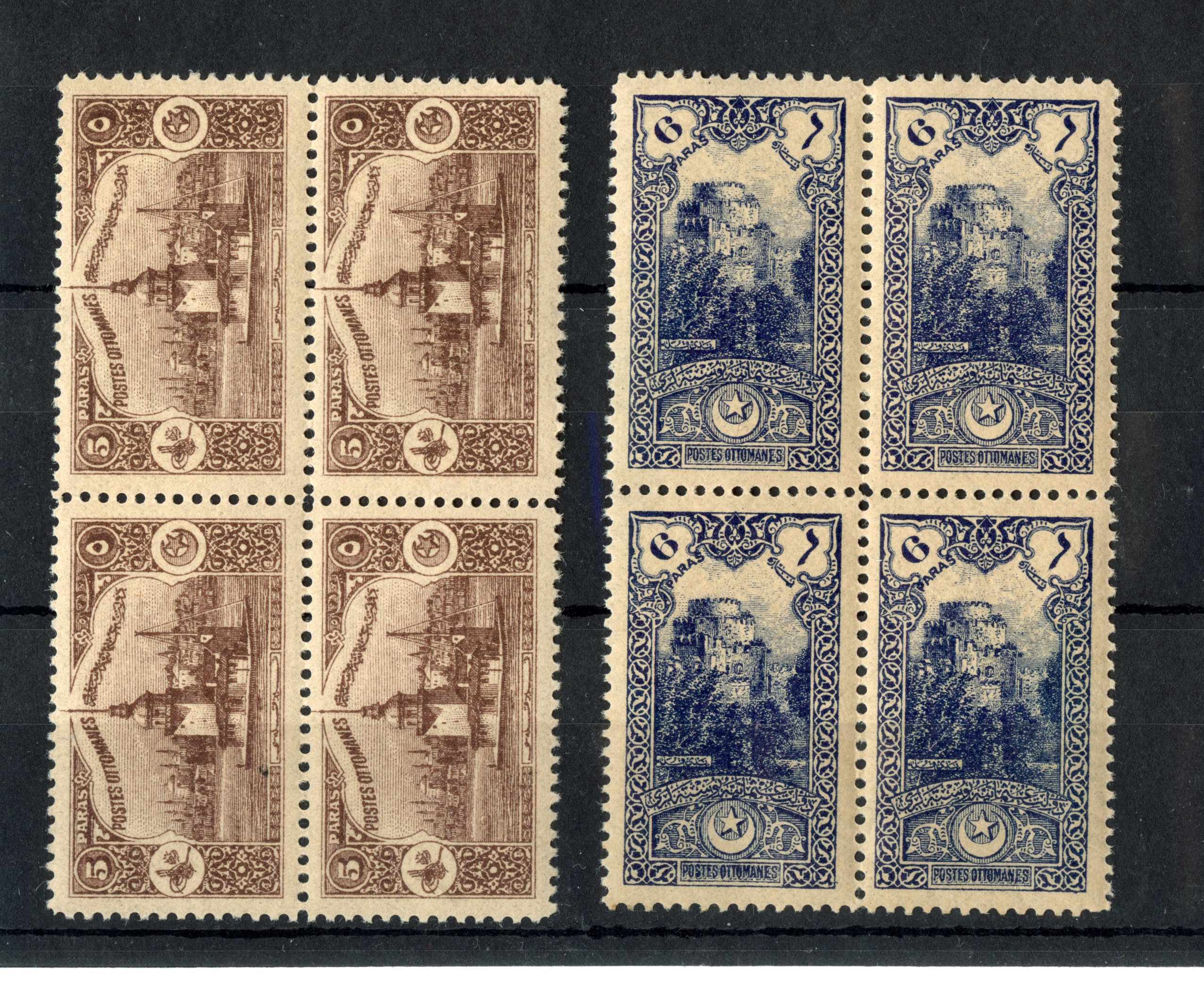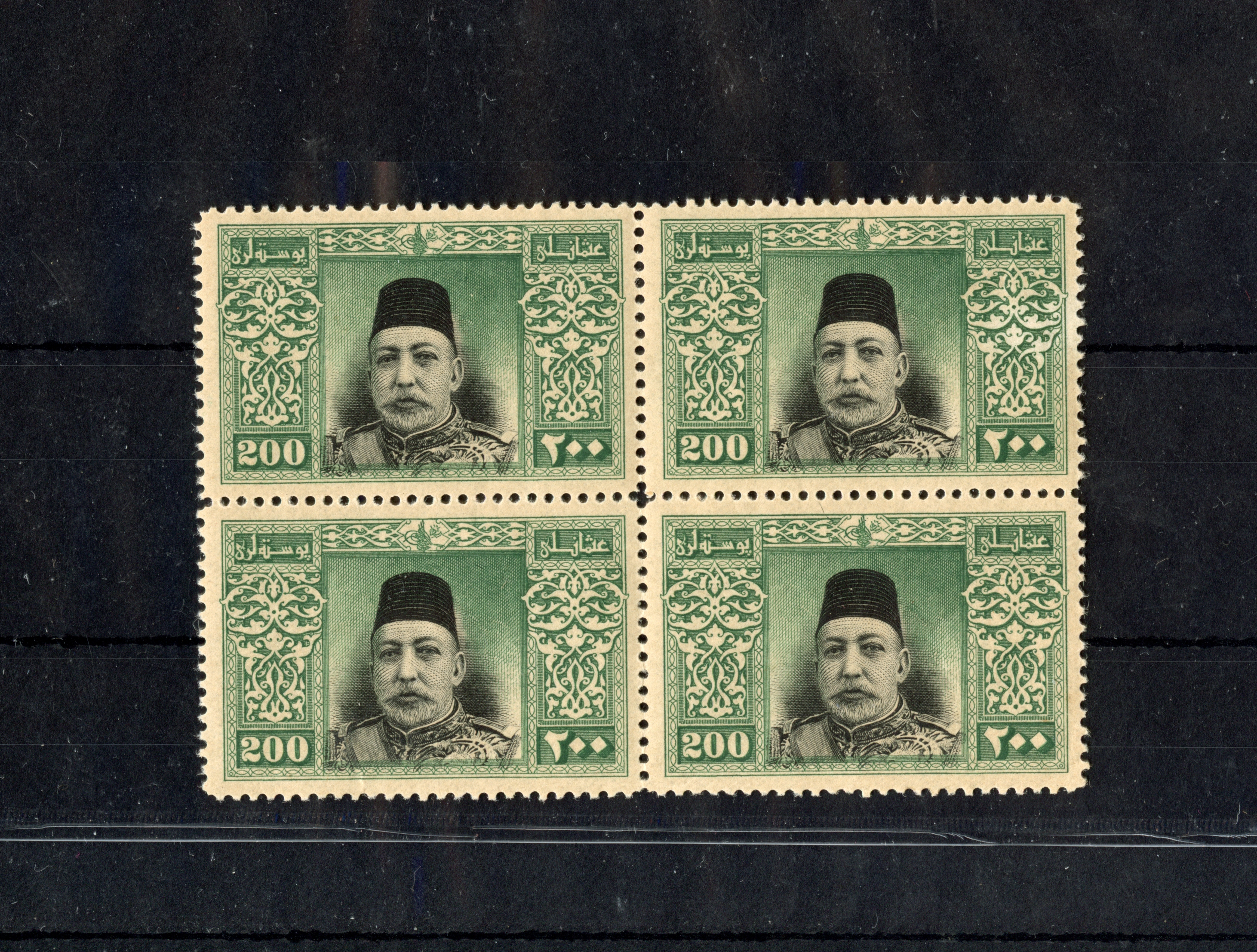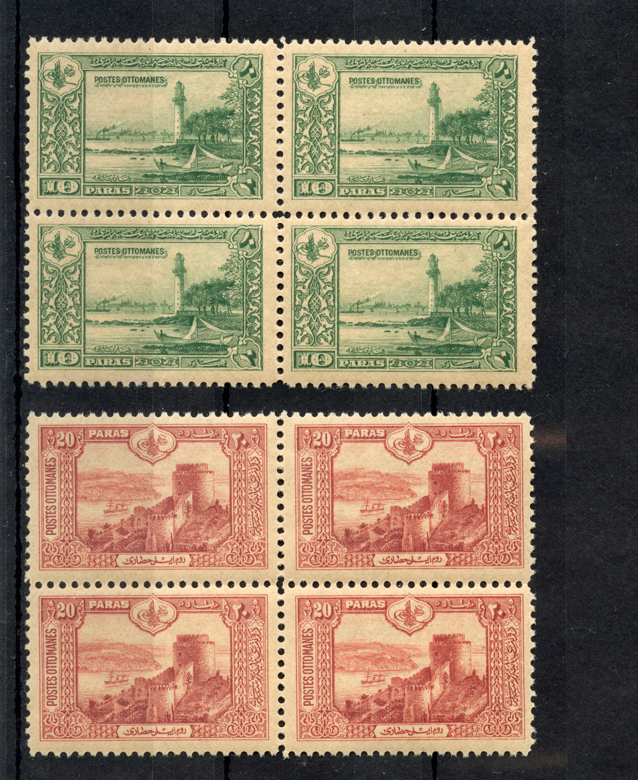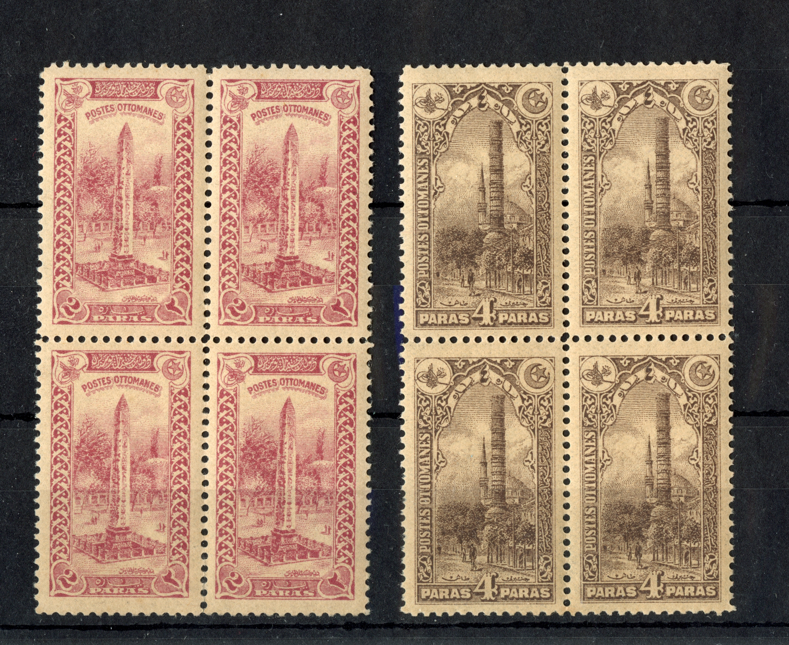 1921, Theatre Tax 20 pa. black, block of four, 1337 typo surcharged unused with tiny hinge remains, few perfs apart, otherwise very fine and fresh, signed T. Matuhin Istanbul (Isfila catalogue value 13.600,- Euro+). The rarest block of four stamps from the typographic print 1337. Only two blocks of four in PROFI archive recorded.