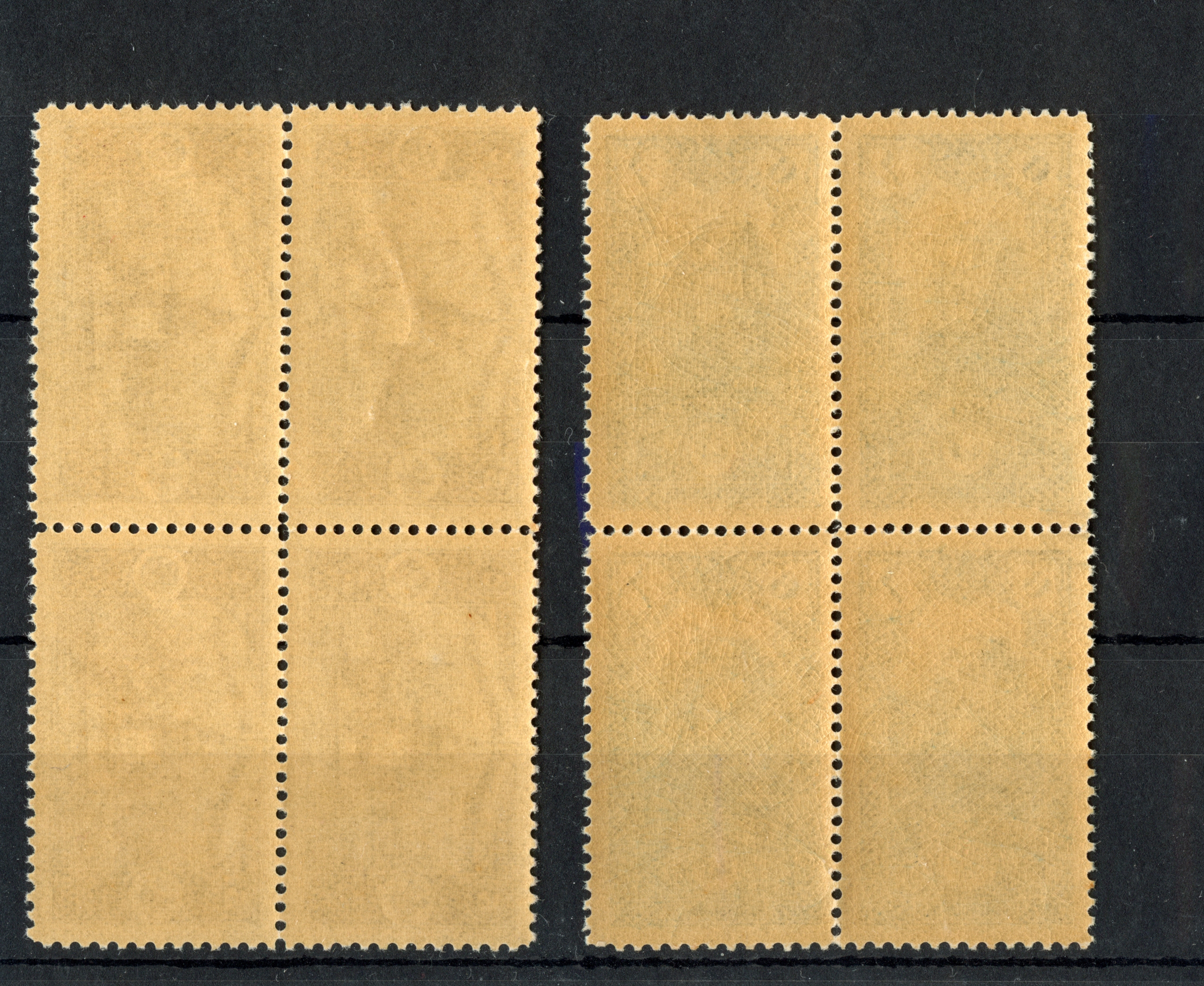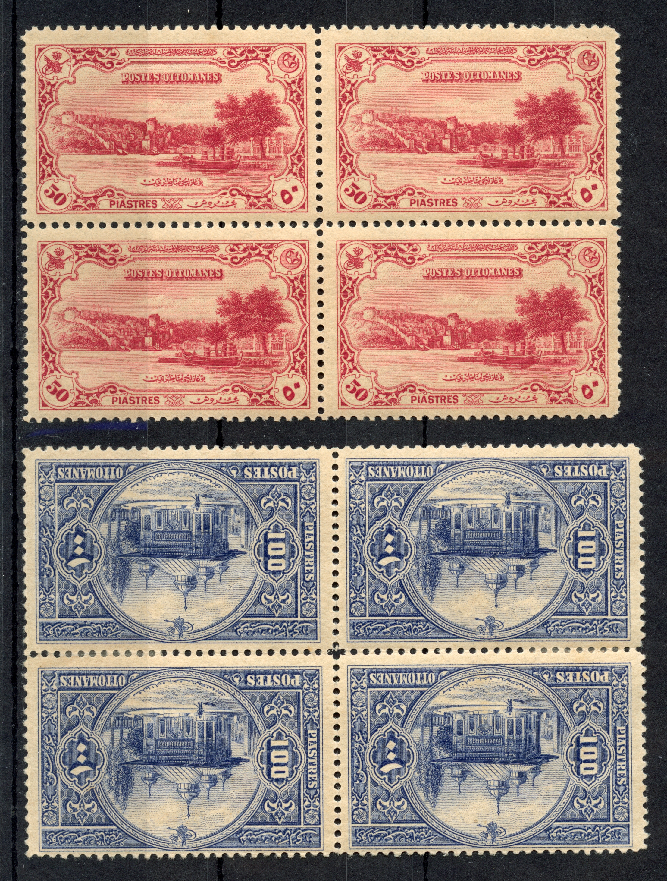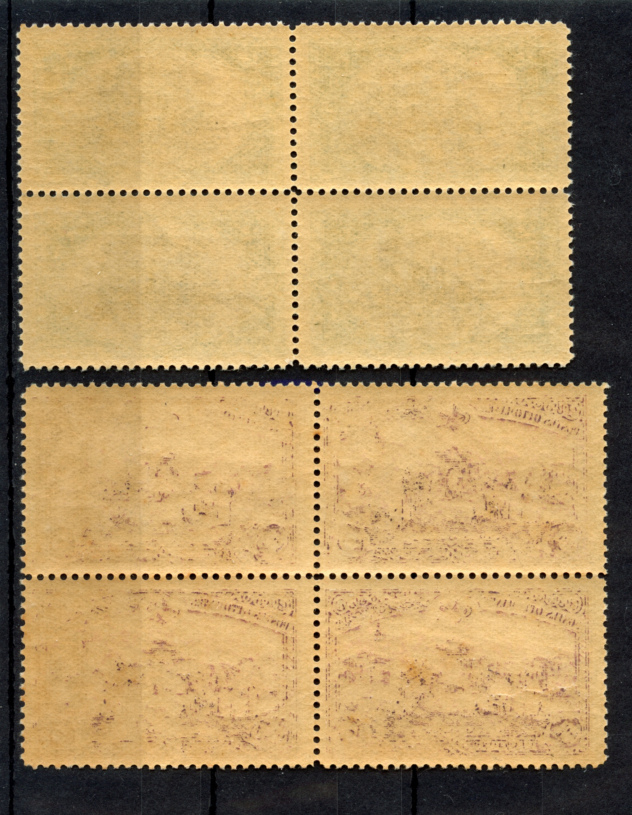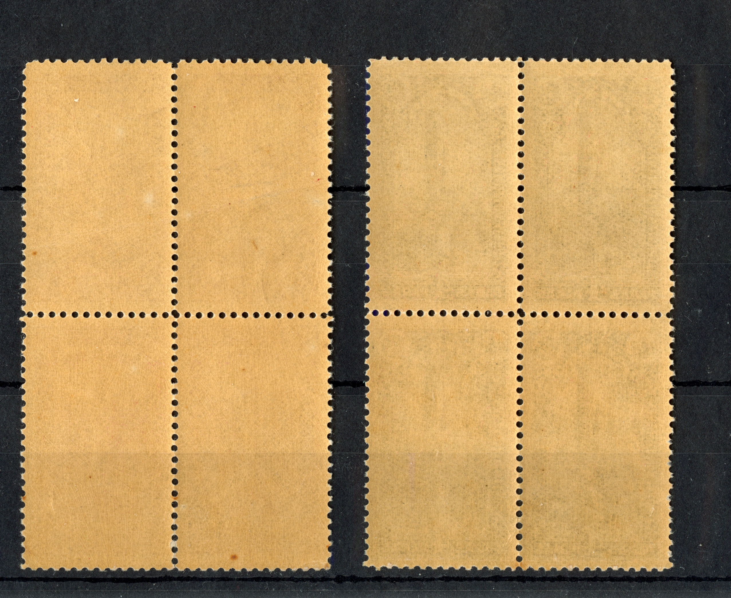 2 pa. – 200 ghr. in blocks of 4, unused with o.g.. few perfs split and strengthened by hinges, but generally very fine. A scarce set in this condition. 200 ghr. with certificate ISFILA (2012)