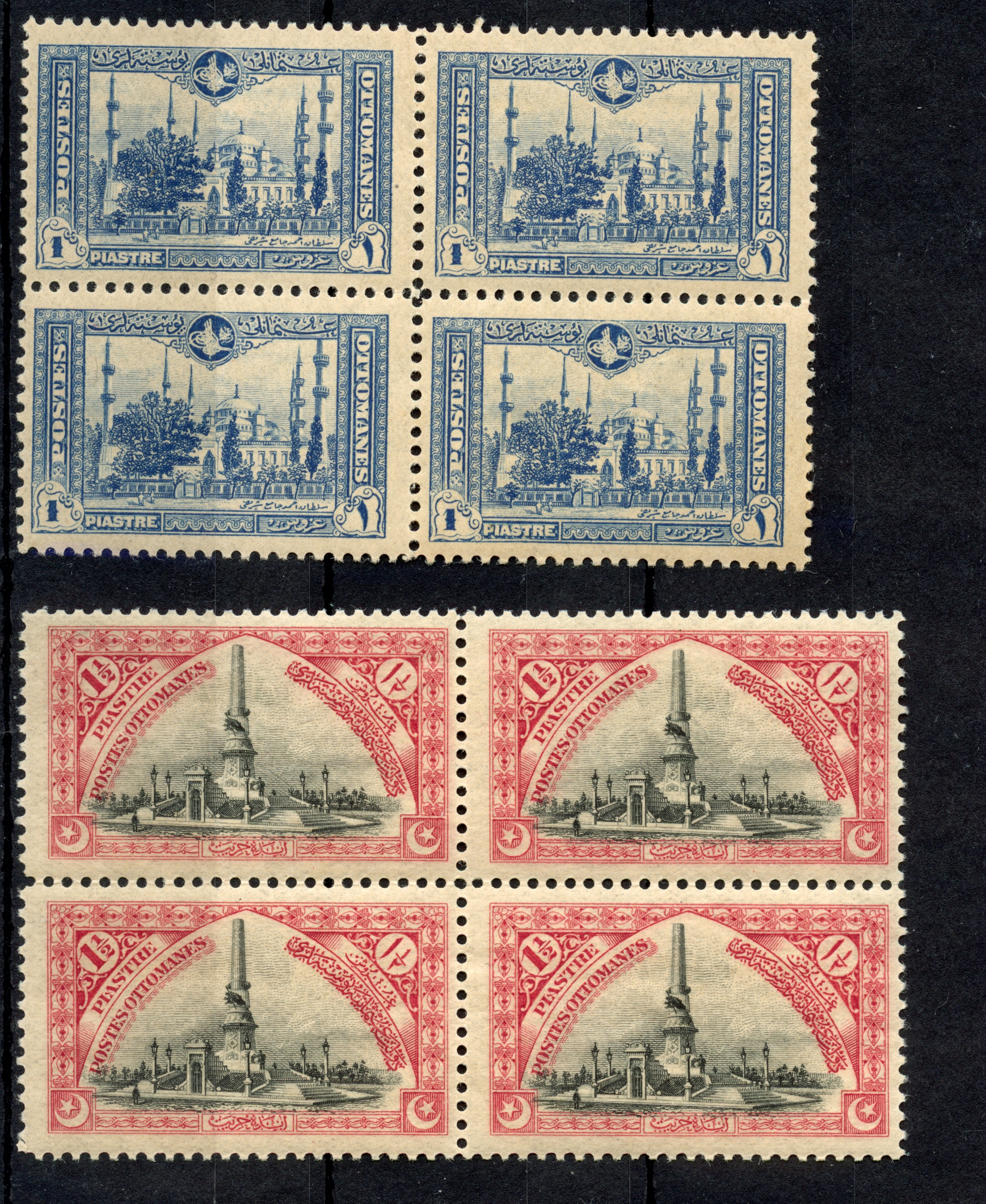 1921, Museum 1 Pia. ultramarine typo overprinted 1337 block of four, top stamps showing large 1337 typo variety, bottom stamps normal small type, all mint never hinged, tiny gum spot and crease at bottom left, otherwise very fine, fresh and scarce. For normal typo mint hinged stamps Isfila catalogue value 9.090,-€++
