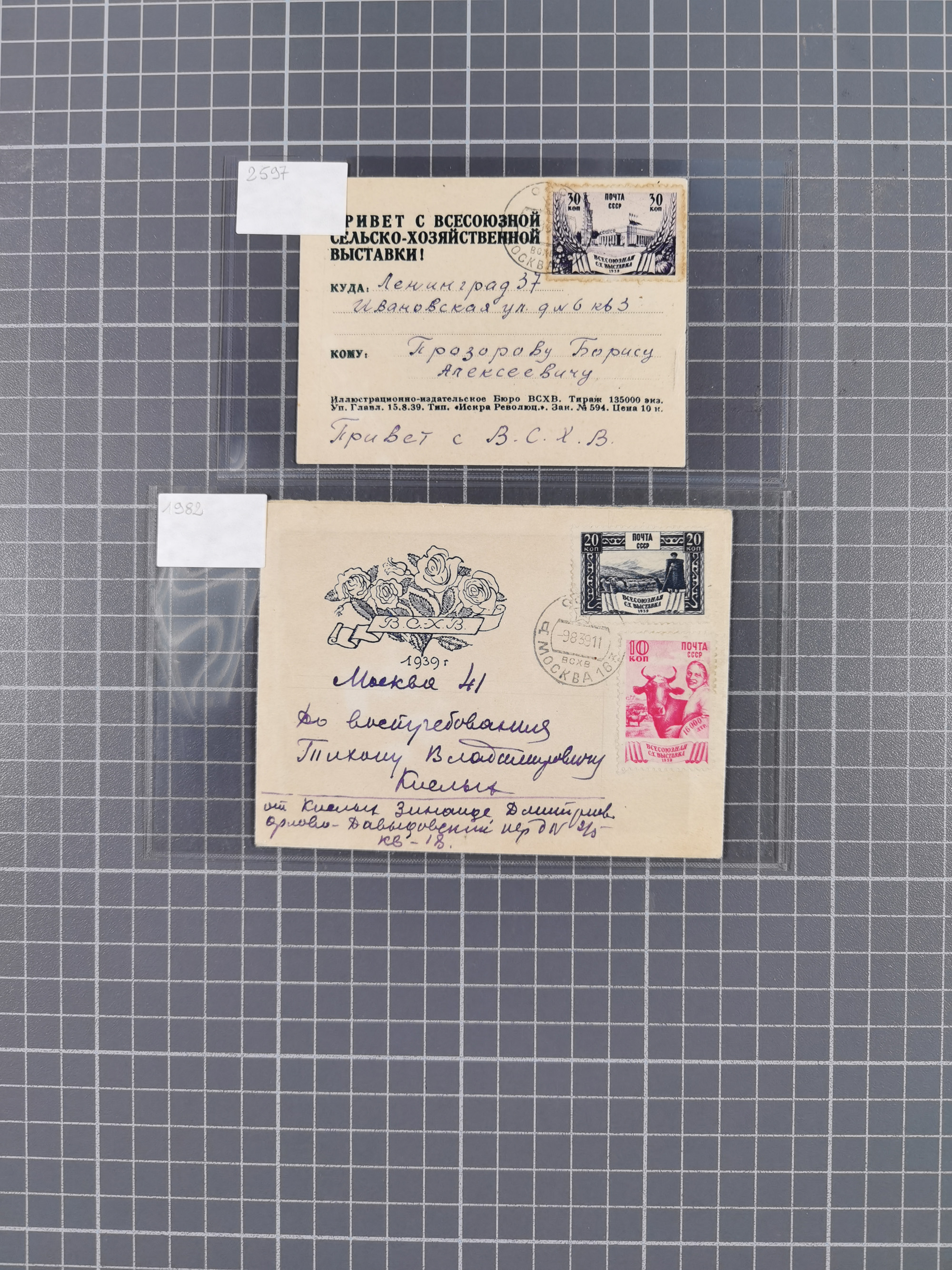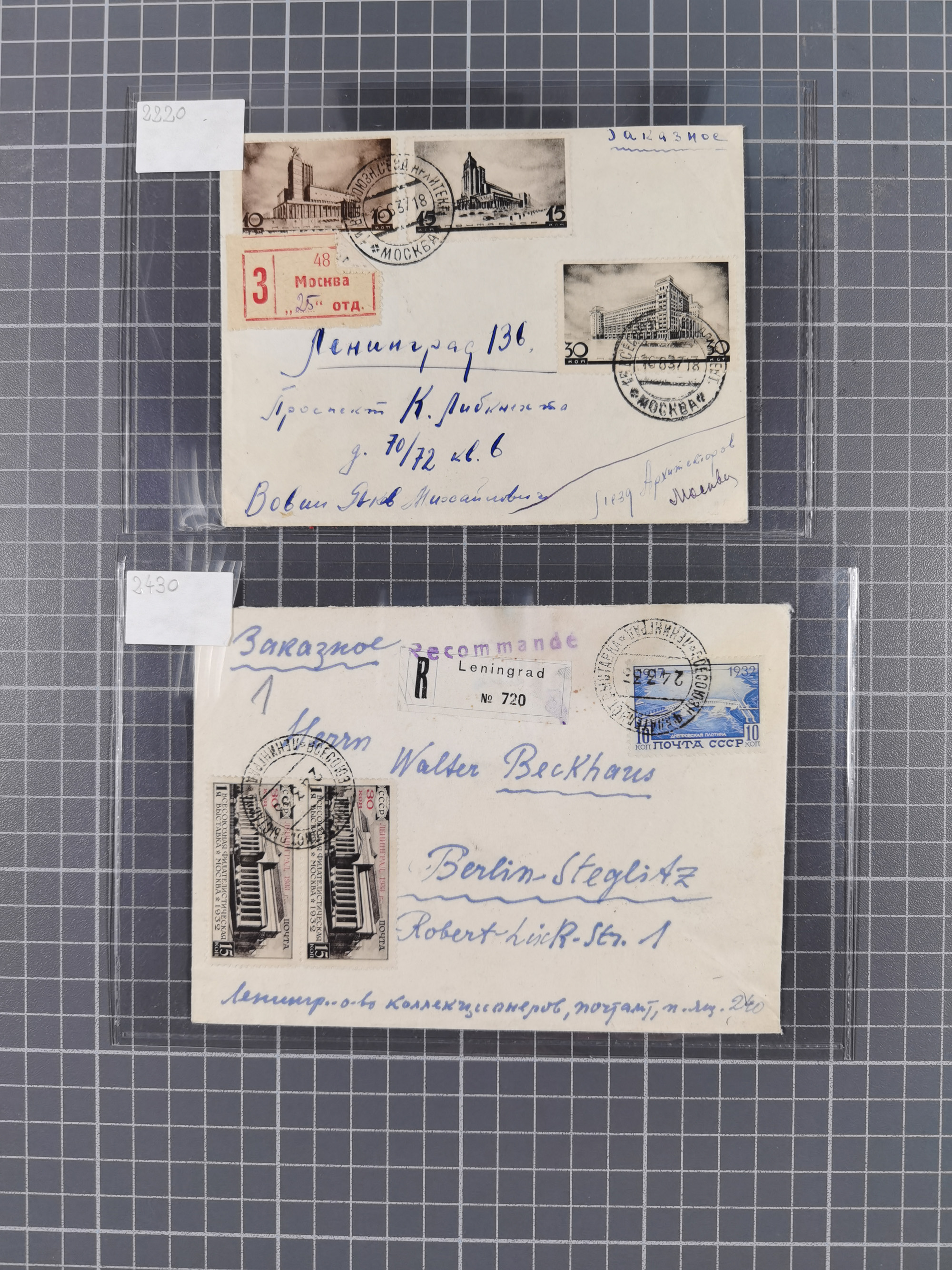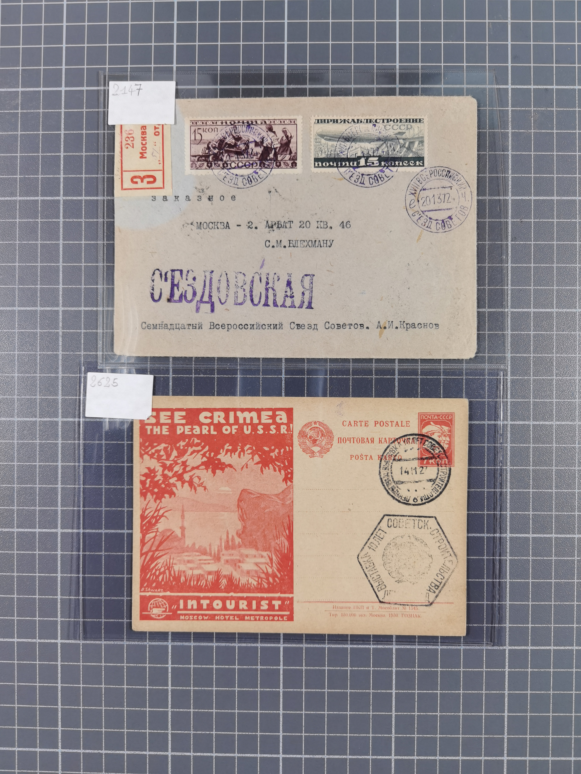 1927/39, Temporary Exhibition Special Postmarks, impressive group of 8 covers and cards, some from the famous Blekhman correspondence, many scarce items throughout, noted 1927 registered cover with rare “IV.(ANOVO)-VOZNESSENSK EXHIBIT”, 1937 envelope with very rare cds “XVIIth INTERNATIONAL GEOLOGICAL CONGRESS MOSCOW”, 1927 postal stationery card with very rare cds from the 10th Anniversary of Soviet Construction Exhibition, 1939 two illustrated card and special envelope with the All Union Agricultural Fair special cancellation “MOSCOW BCXB”, etc., mostly in very good condition. A rare specialist assembly