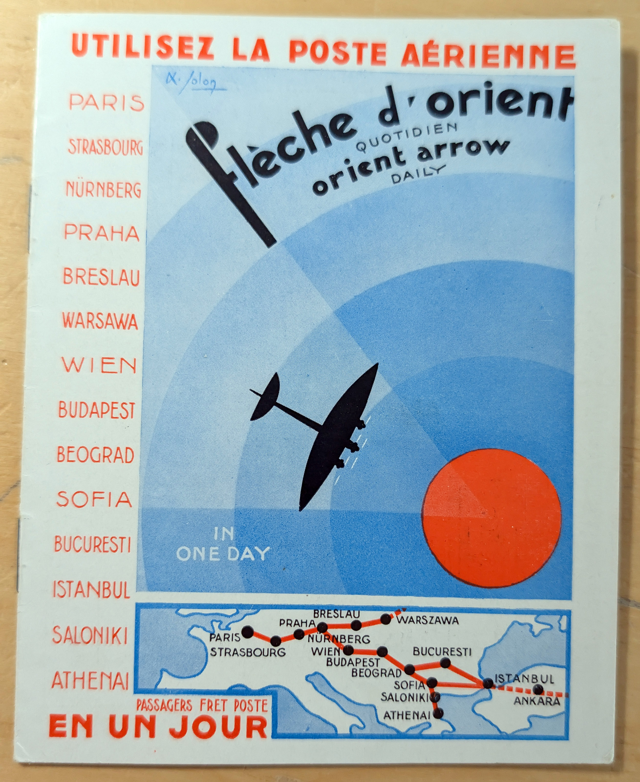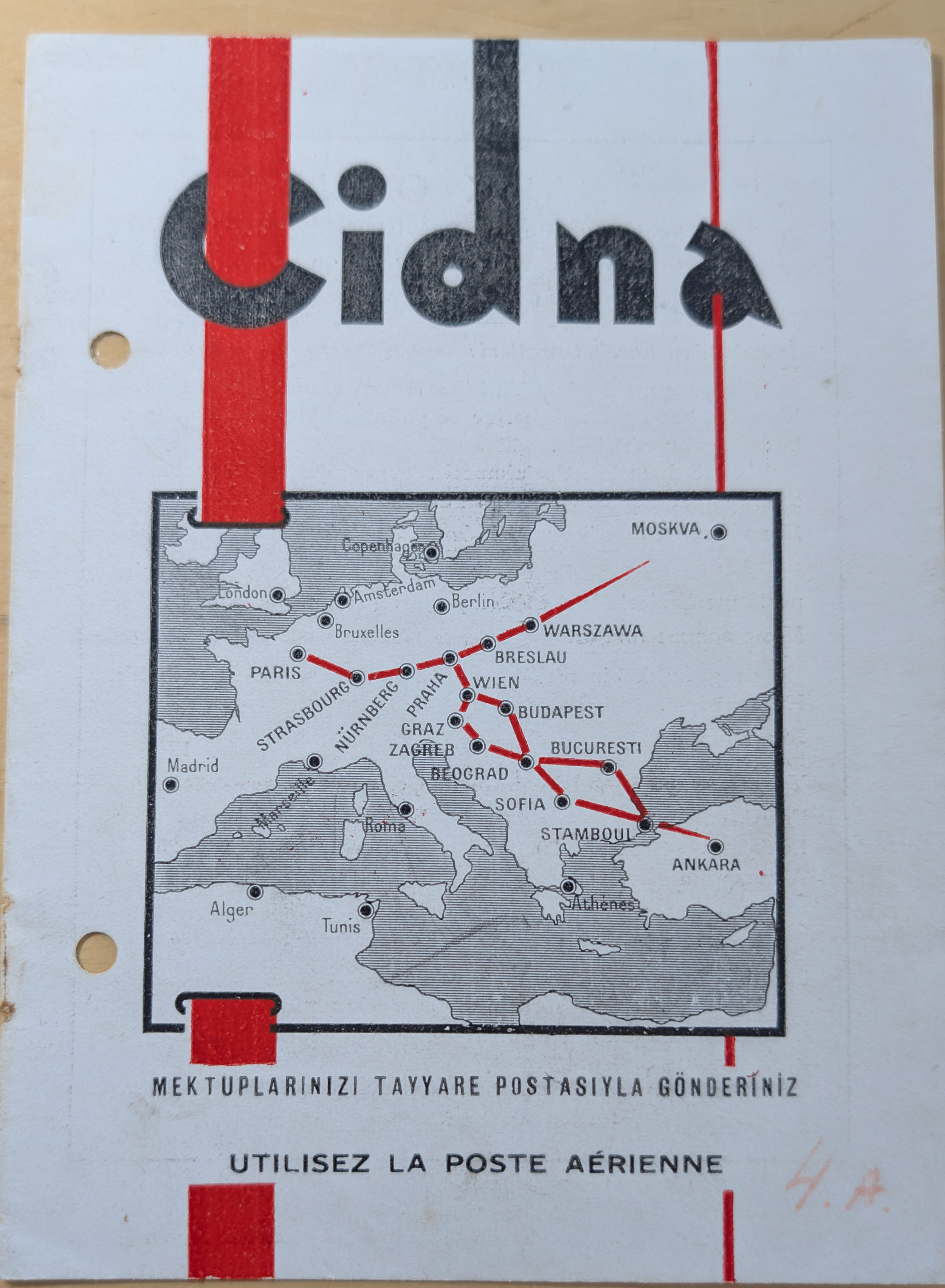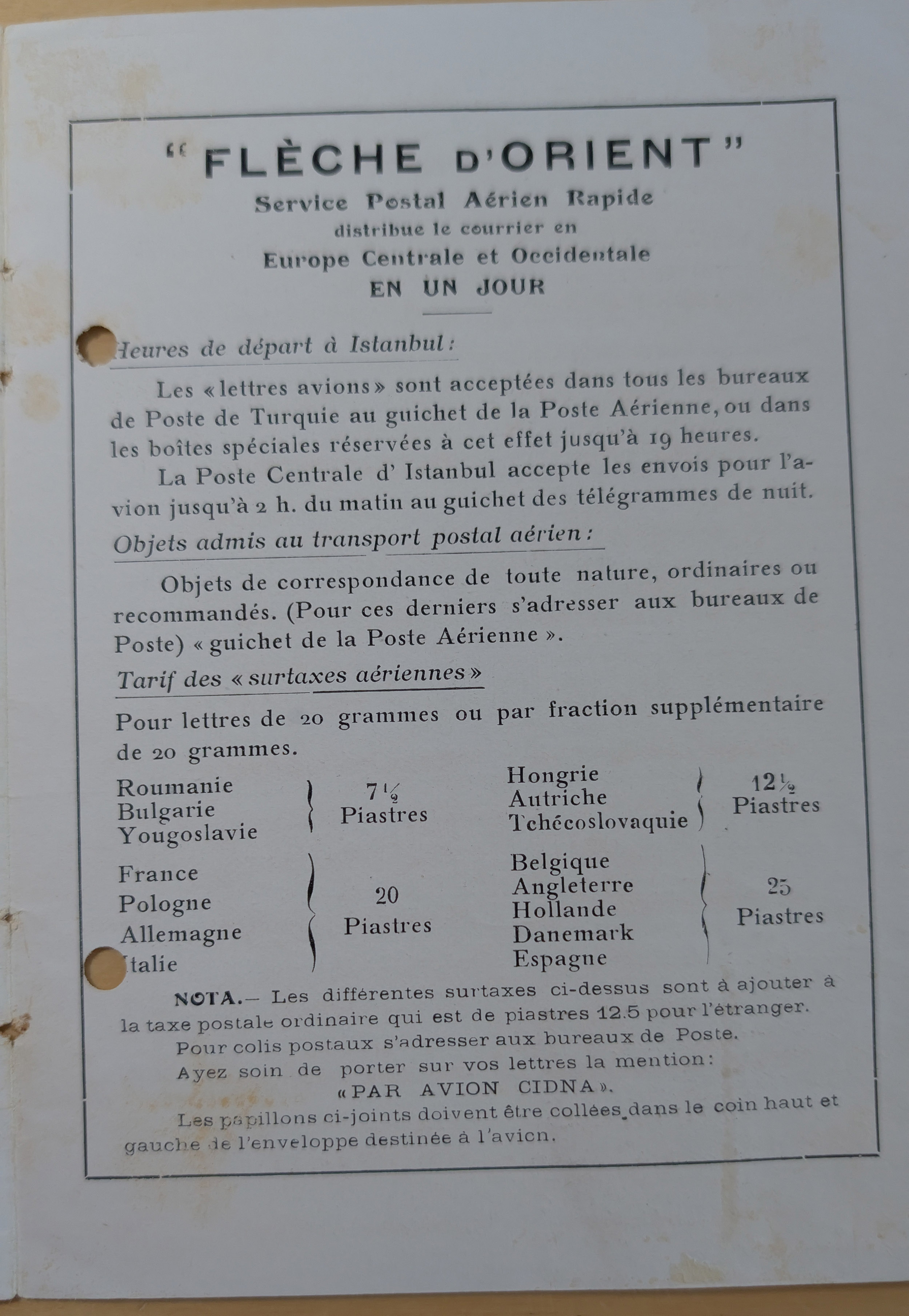 1931/32, CIDNA airmail post labels ‘PAR AVION’, two different booklets, one large size turkish-french bilingual, punched and without labels, with turkey revenues preprinted on reverse, the other small size containing 27 labels (missing 1) in french showing romanian air mail cover of 1931 imprint with tarifs for all countries on the route. The booklets advertise the 1 day flight from Paris, France to Turkey and retour. CIDNA was the name change from 1925 of CFRNA “The French-Romanian Company for Air Transport”. Fine and scarce.