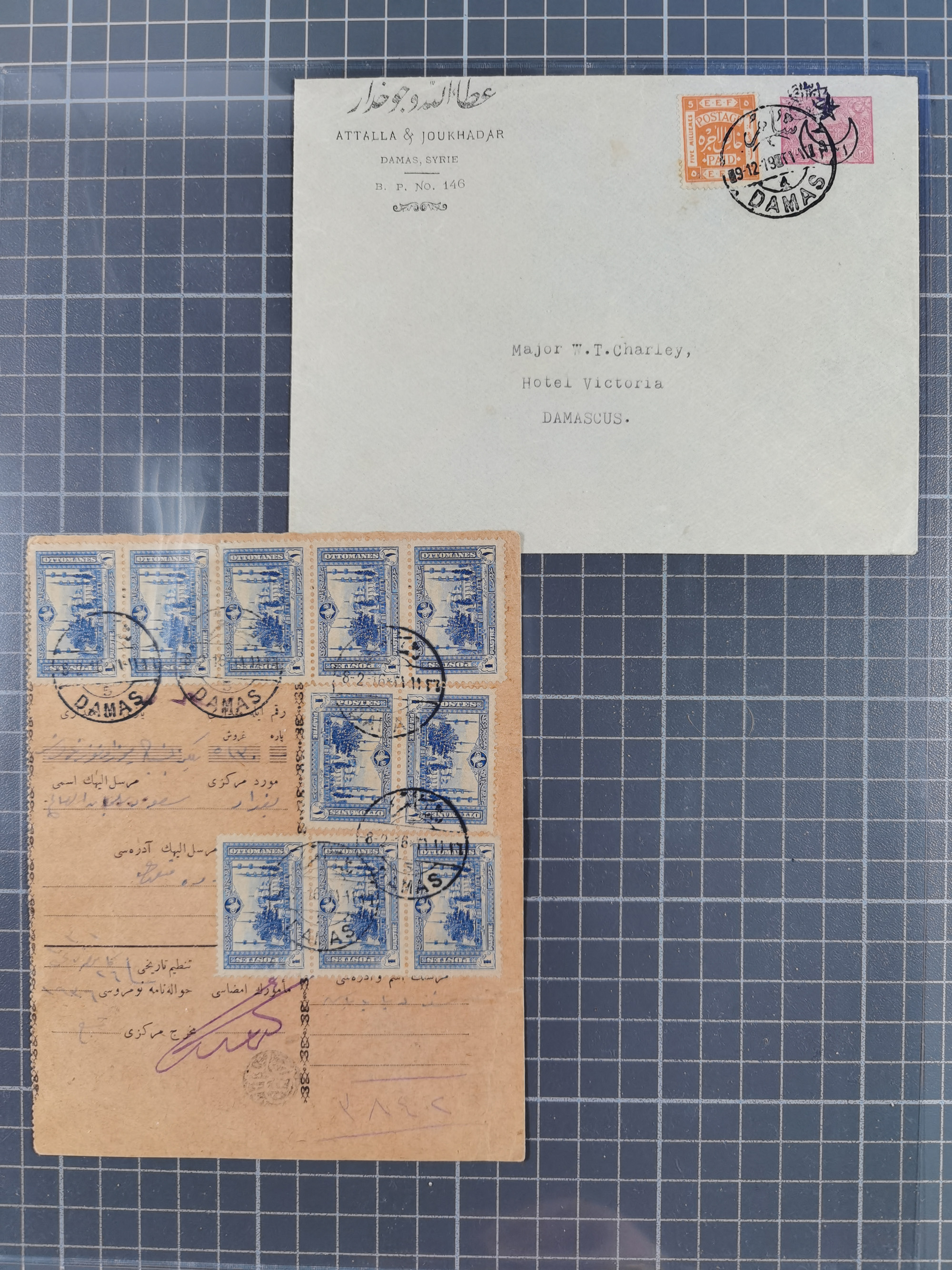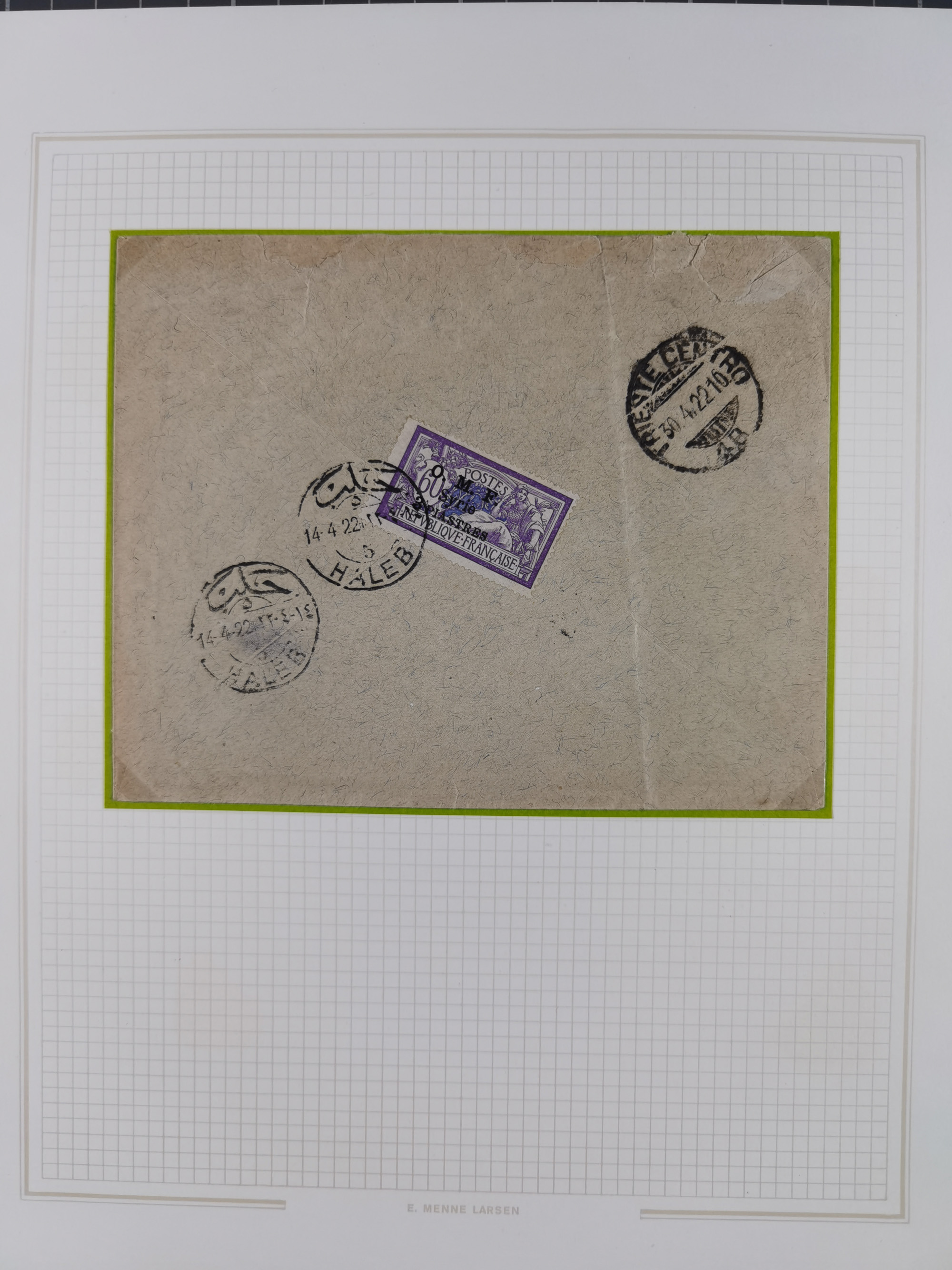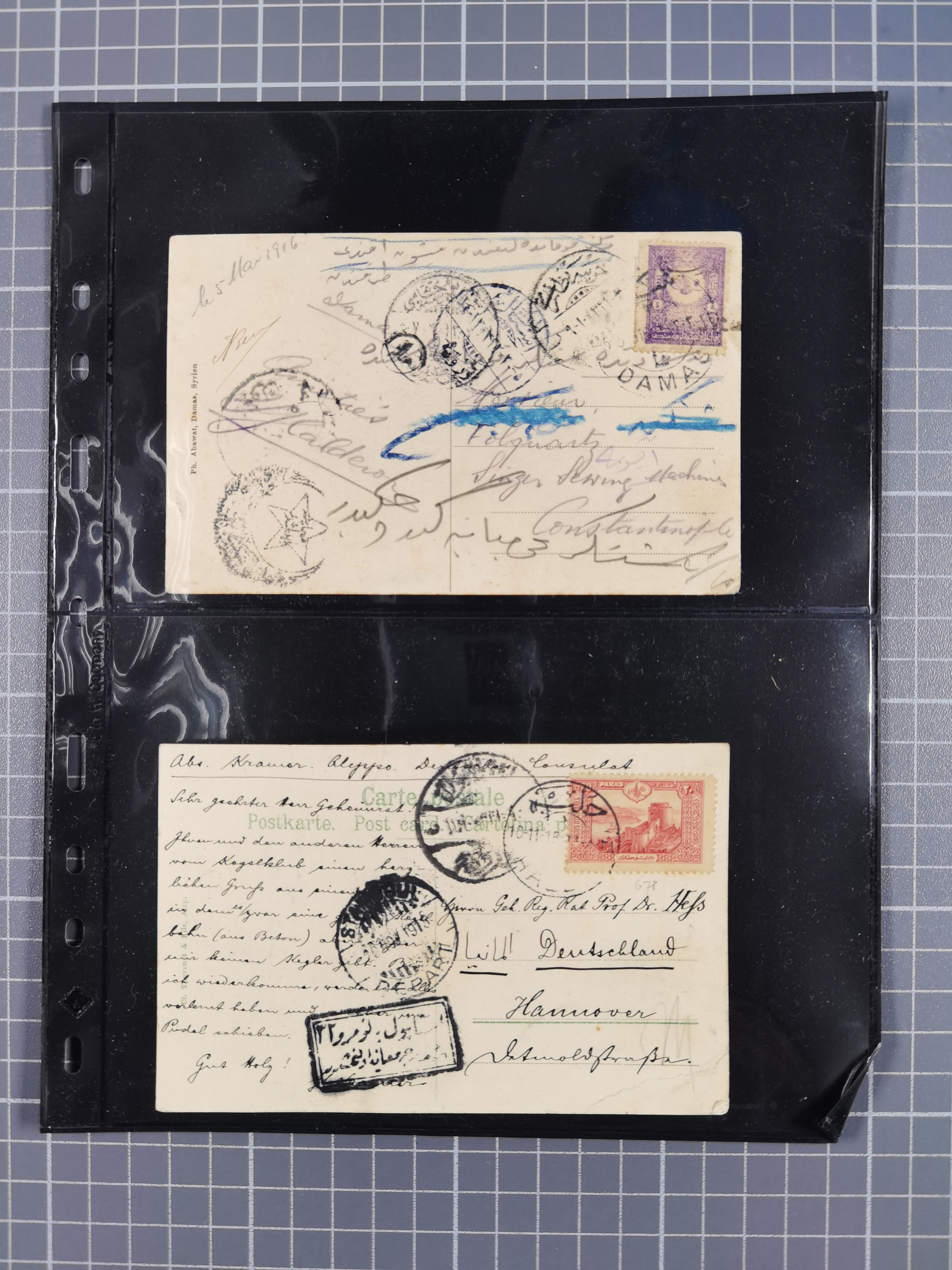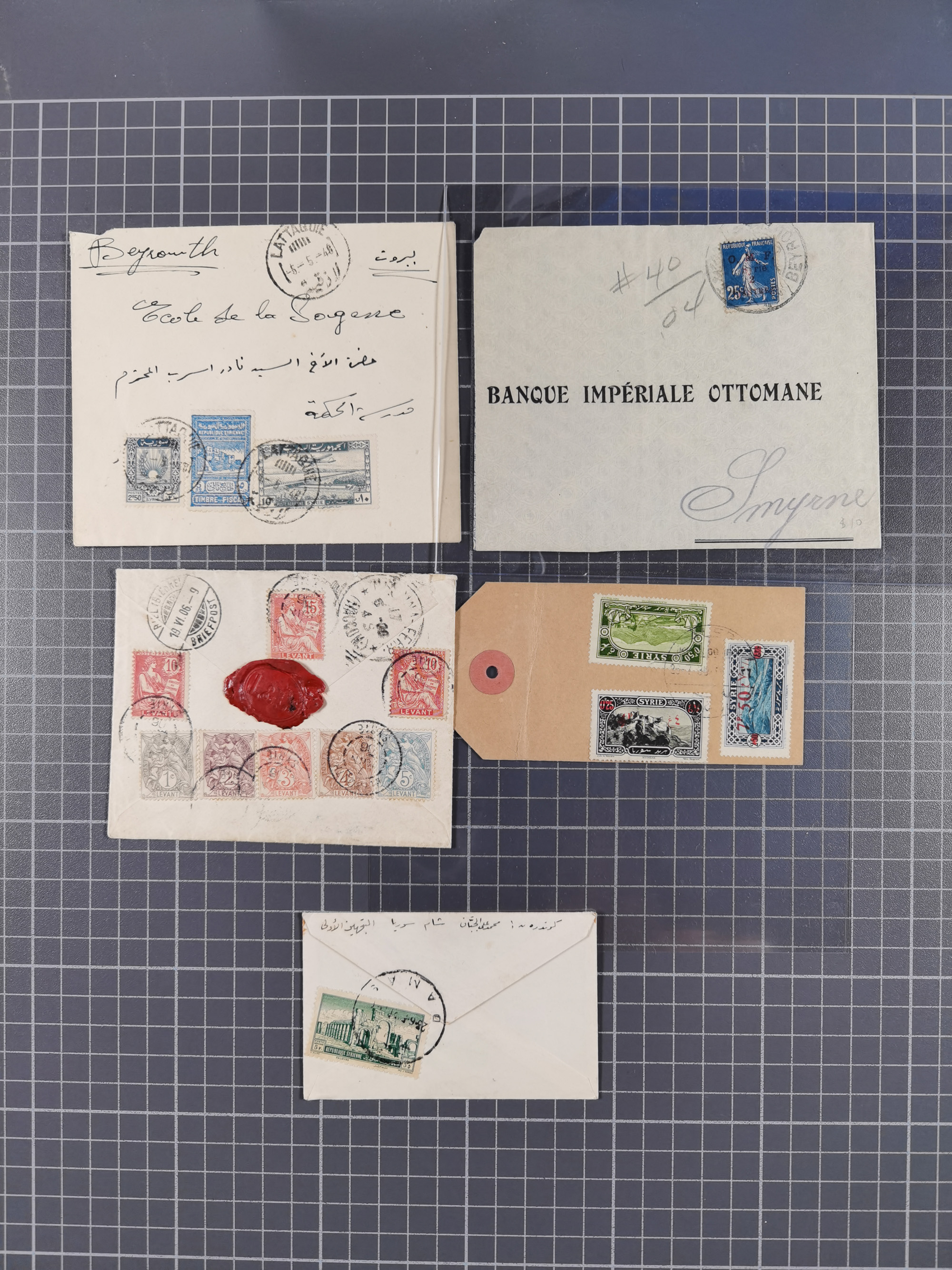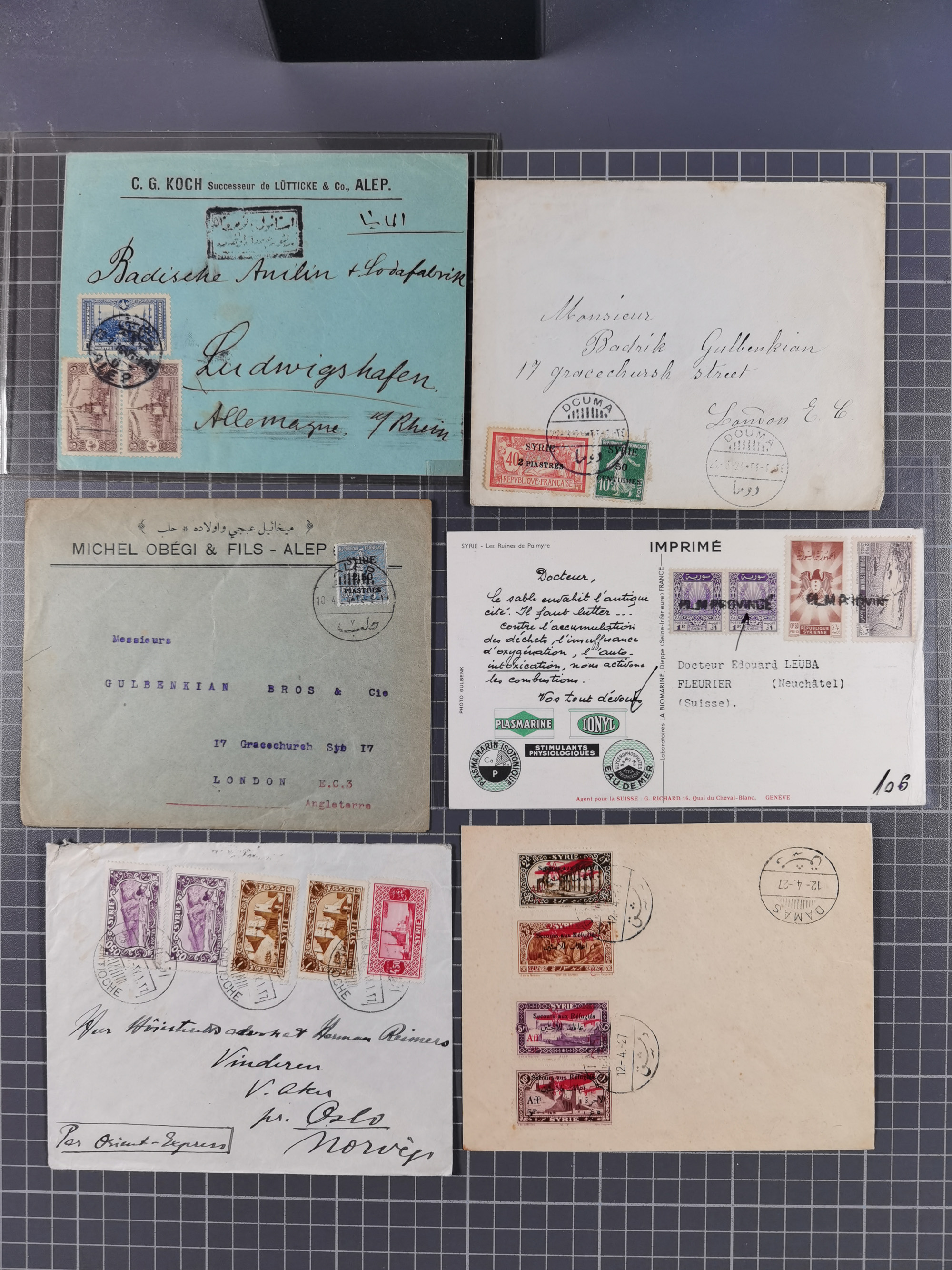 1915/57, 43 covers and cards from ottoman period to first fights, including WWI censor cards from Aleppo and Damas, parcel card cancelled Damas 5 to Bagdad overland mail, french mandate with T.E.P.528 and 614, several modern censor marks, parcel tag to USA, additional few old photos of Damas and Egypt ship at harbour, mainly fine.