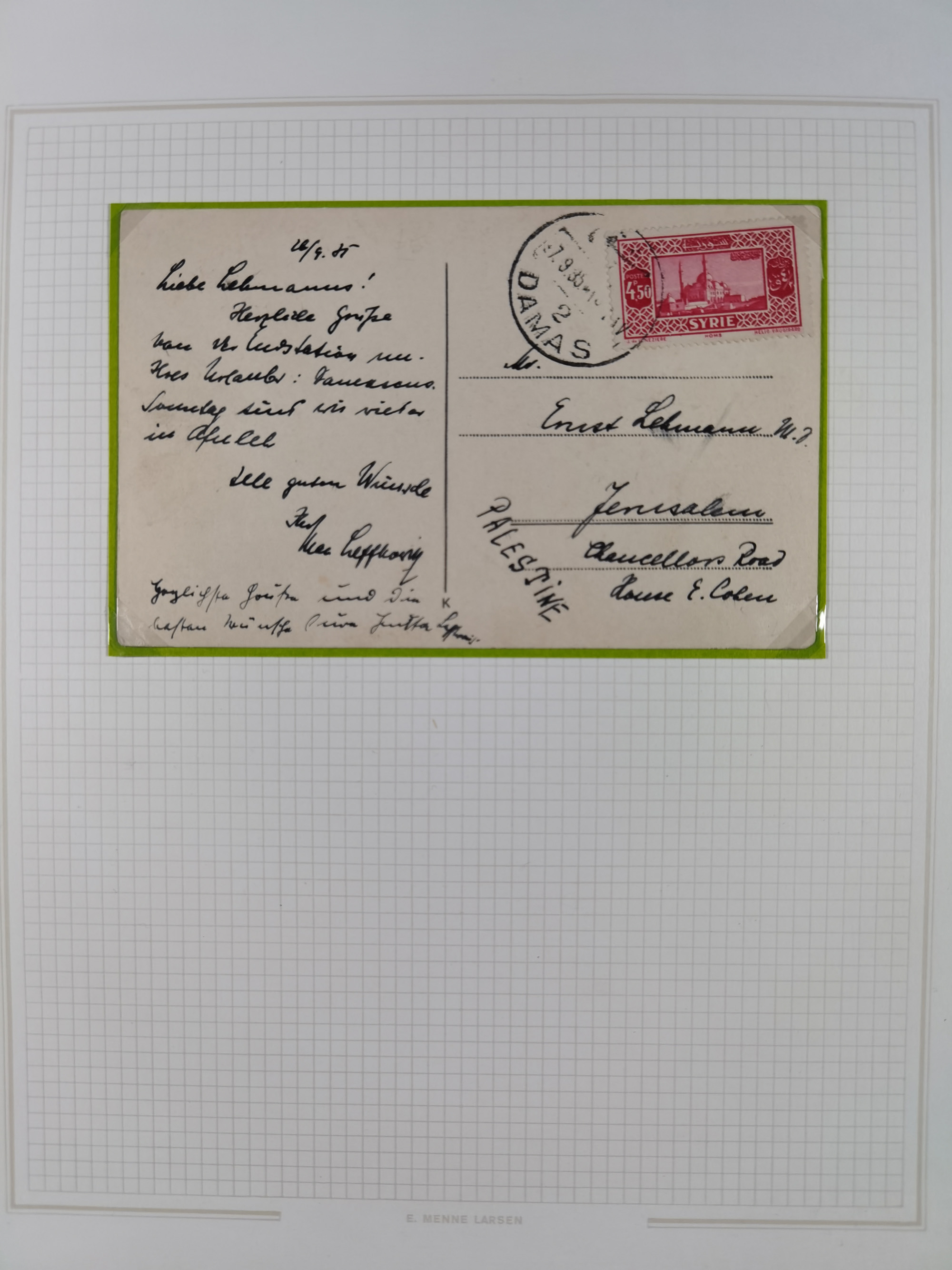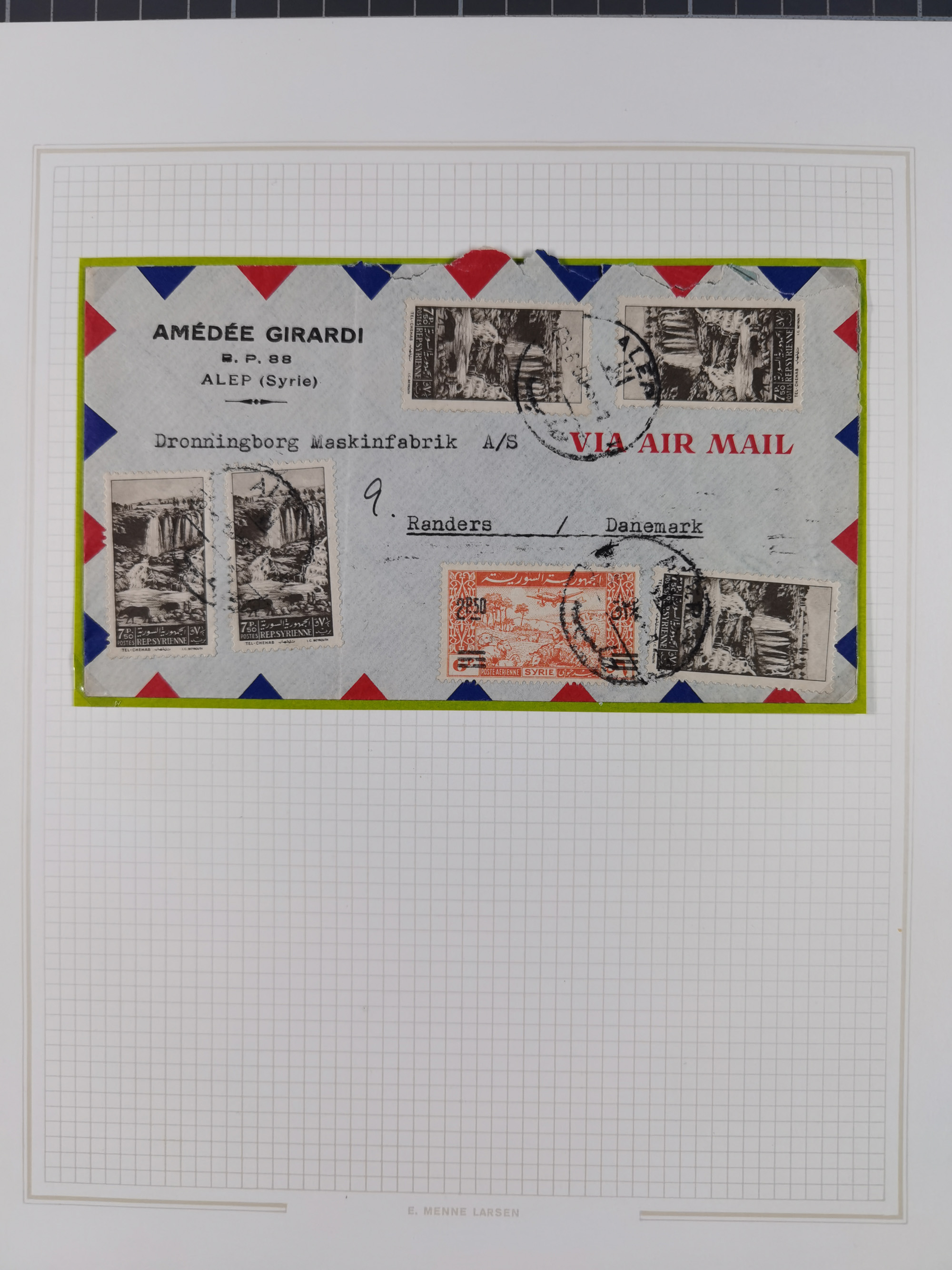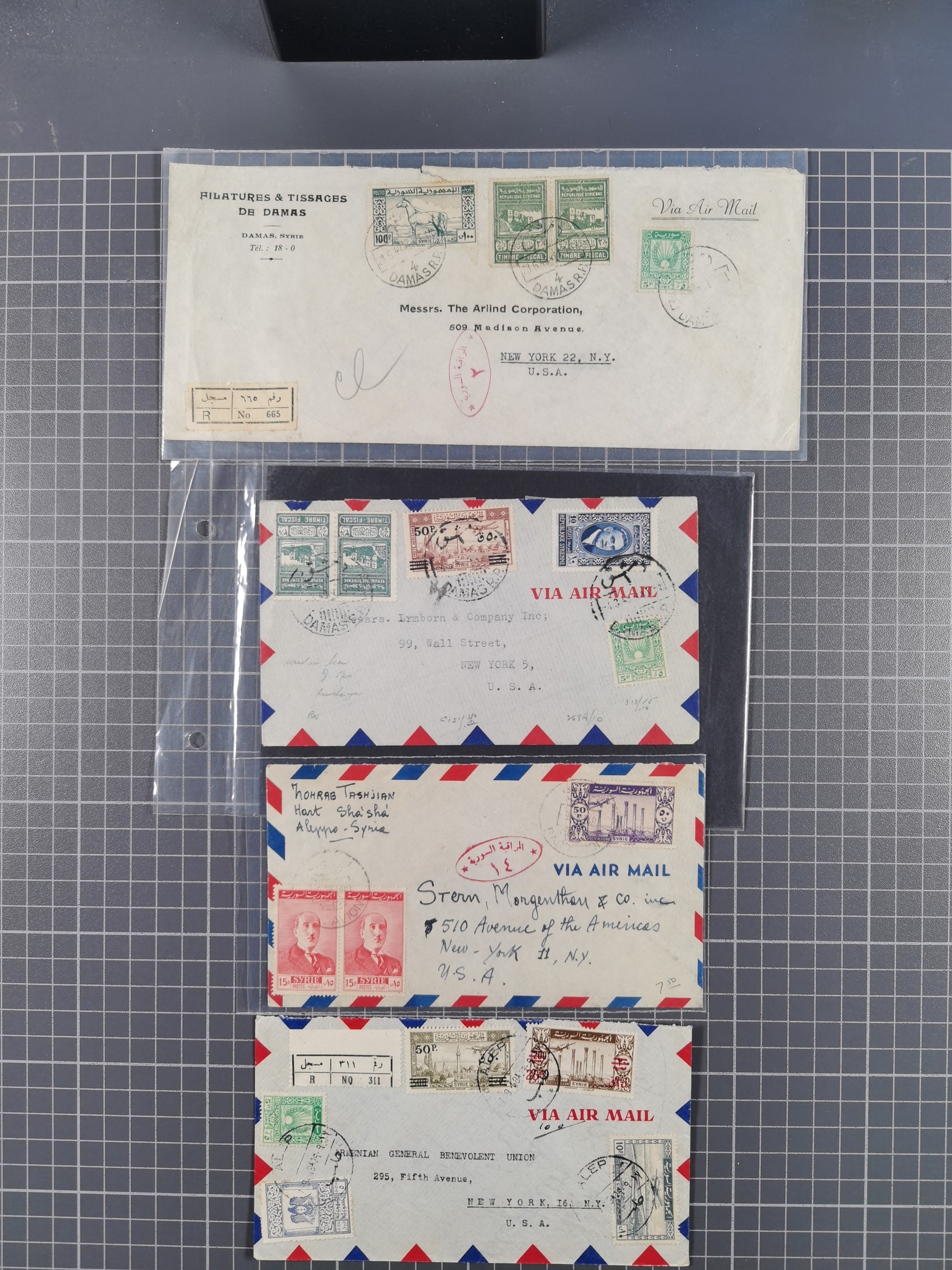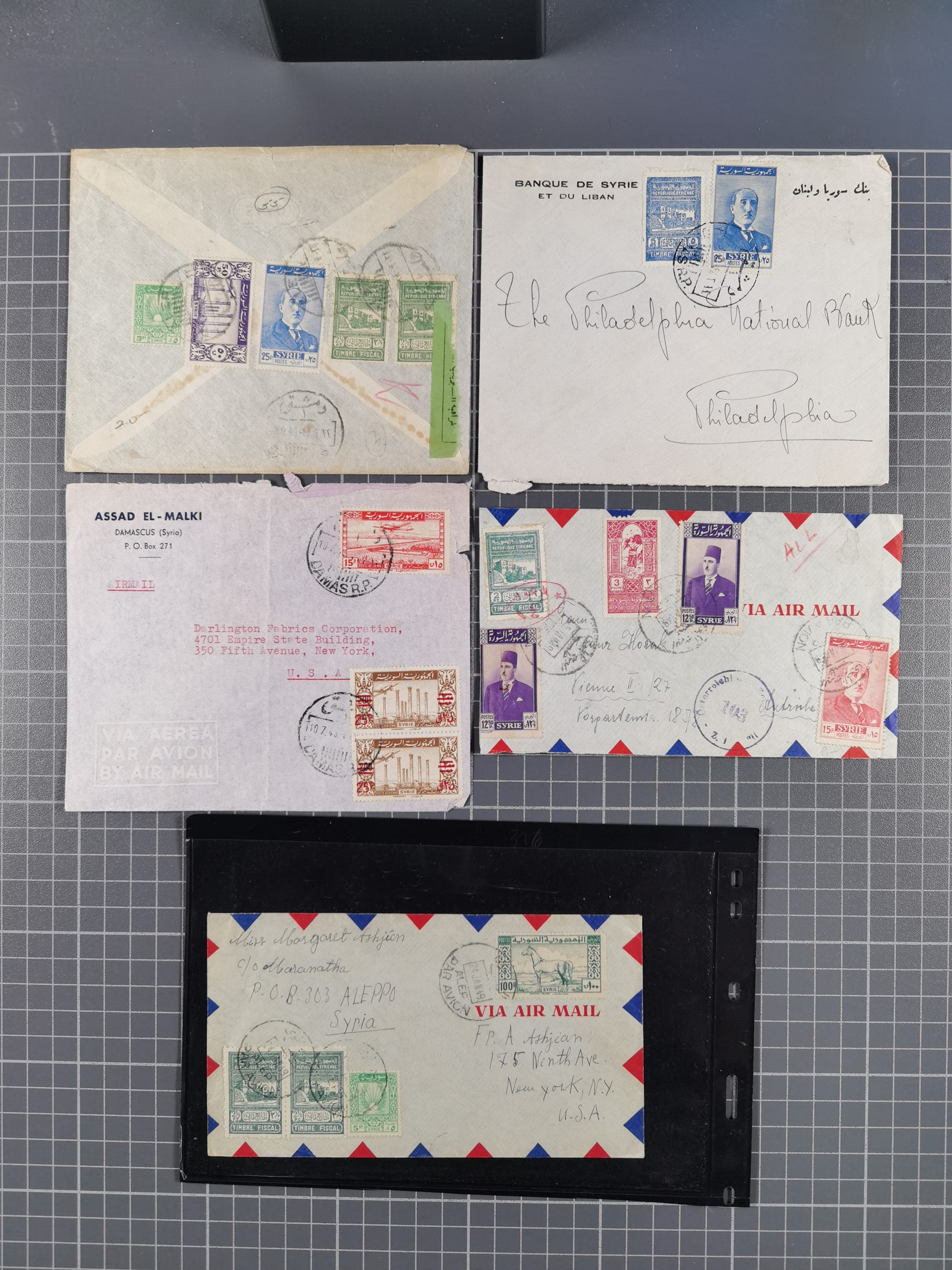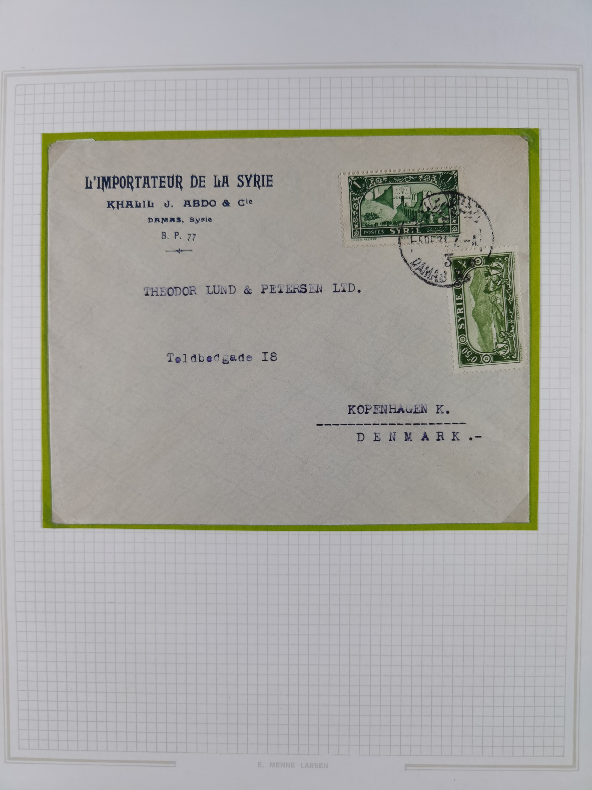 1915/57, 43 covers and cards from ottoman period to first fights, including WWI censor cards from Aleppo and Damas, parcel card cancelled Damas 5 to Bagdad overland mail, french mandate with T.E.P.528 and 614, several modern censor marks, parcel tag to USA, additional few old photos of Damas and Egypt ship at harbour, mainly fine.