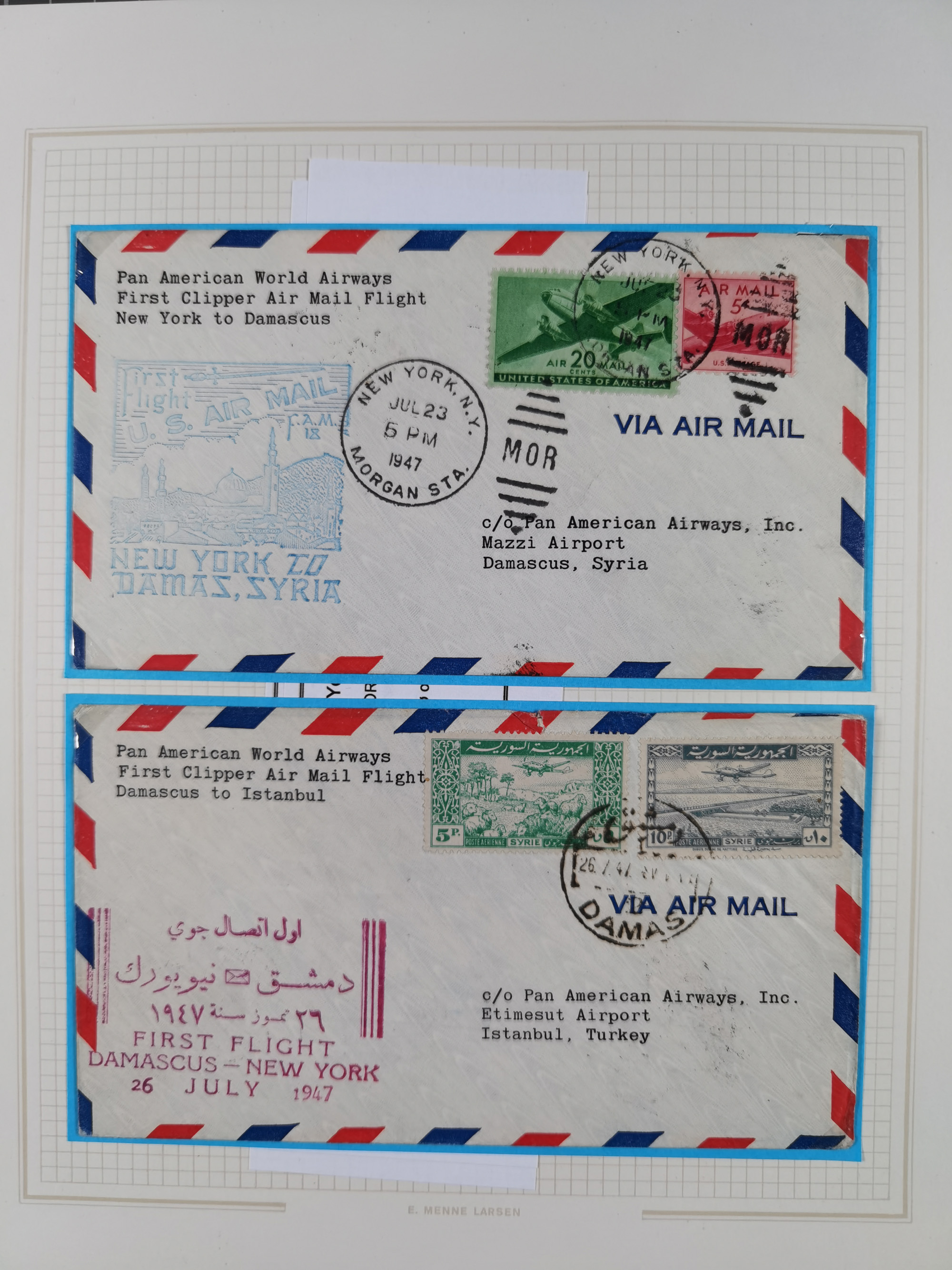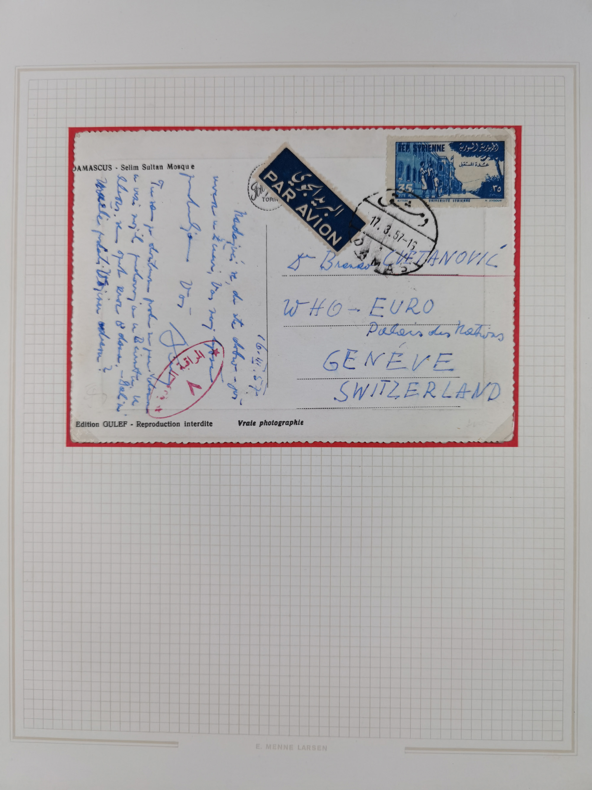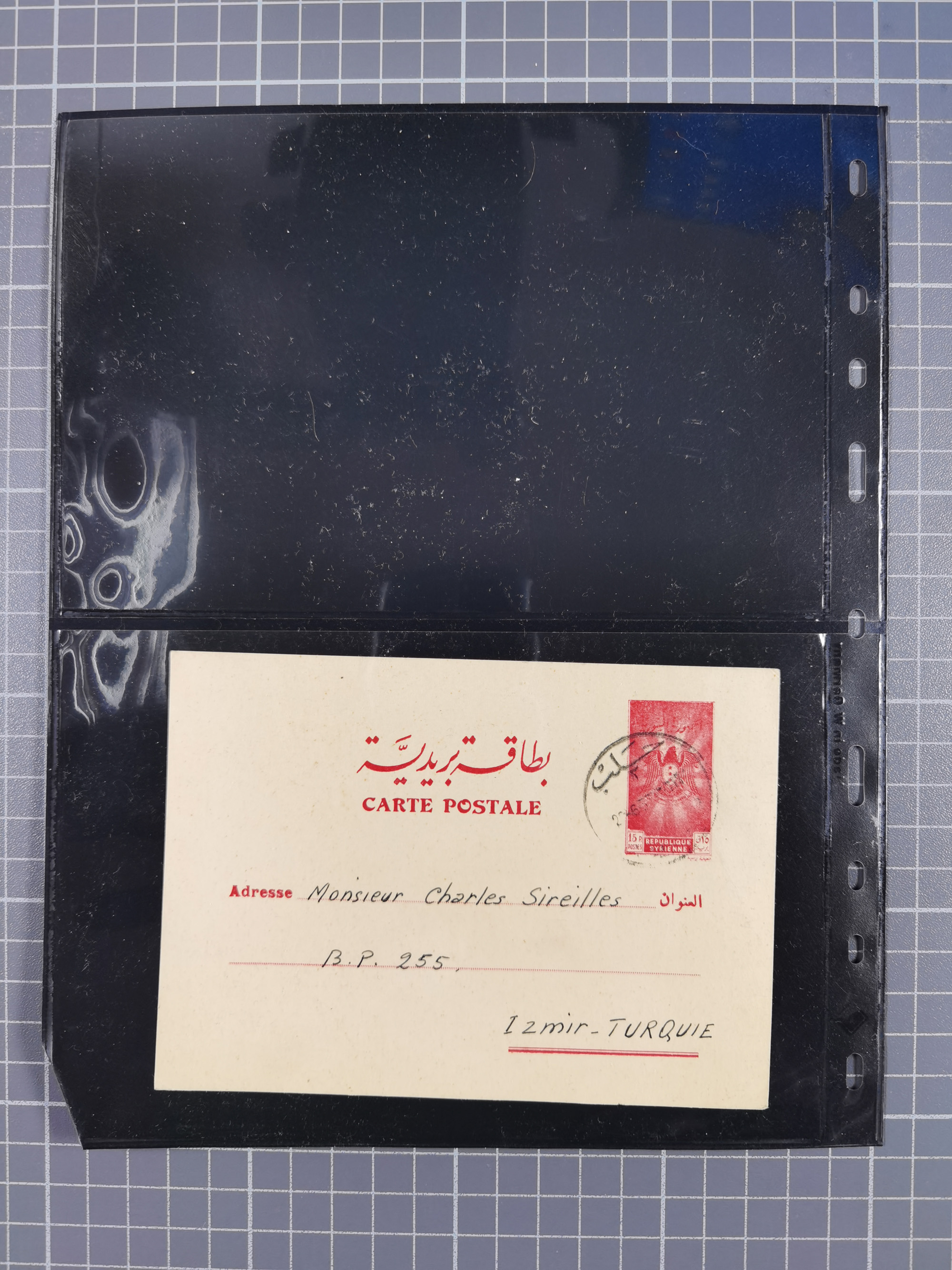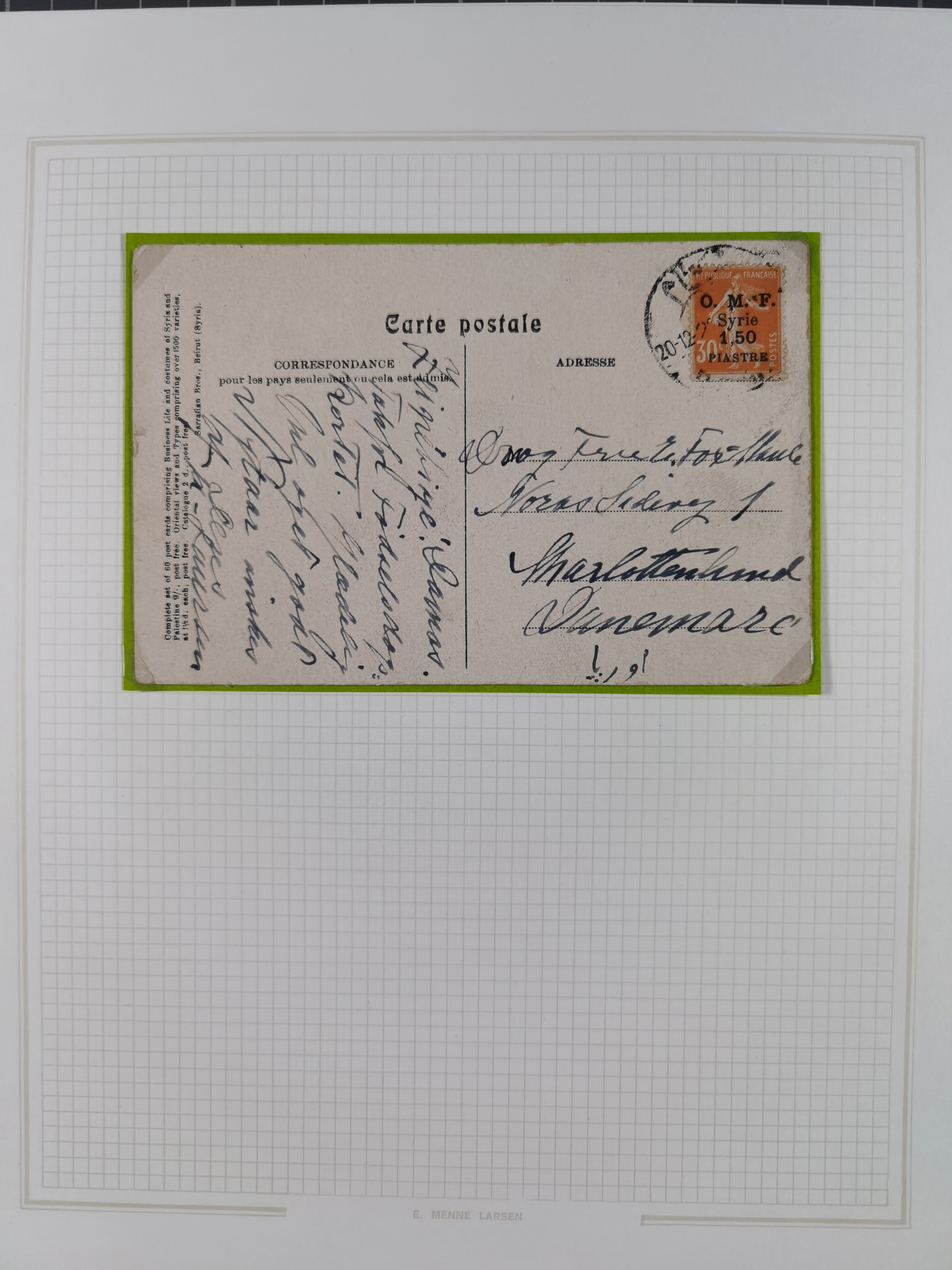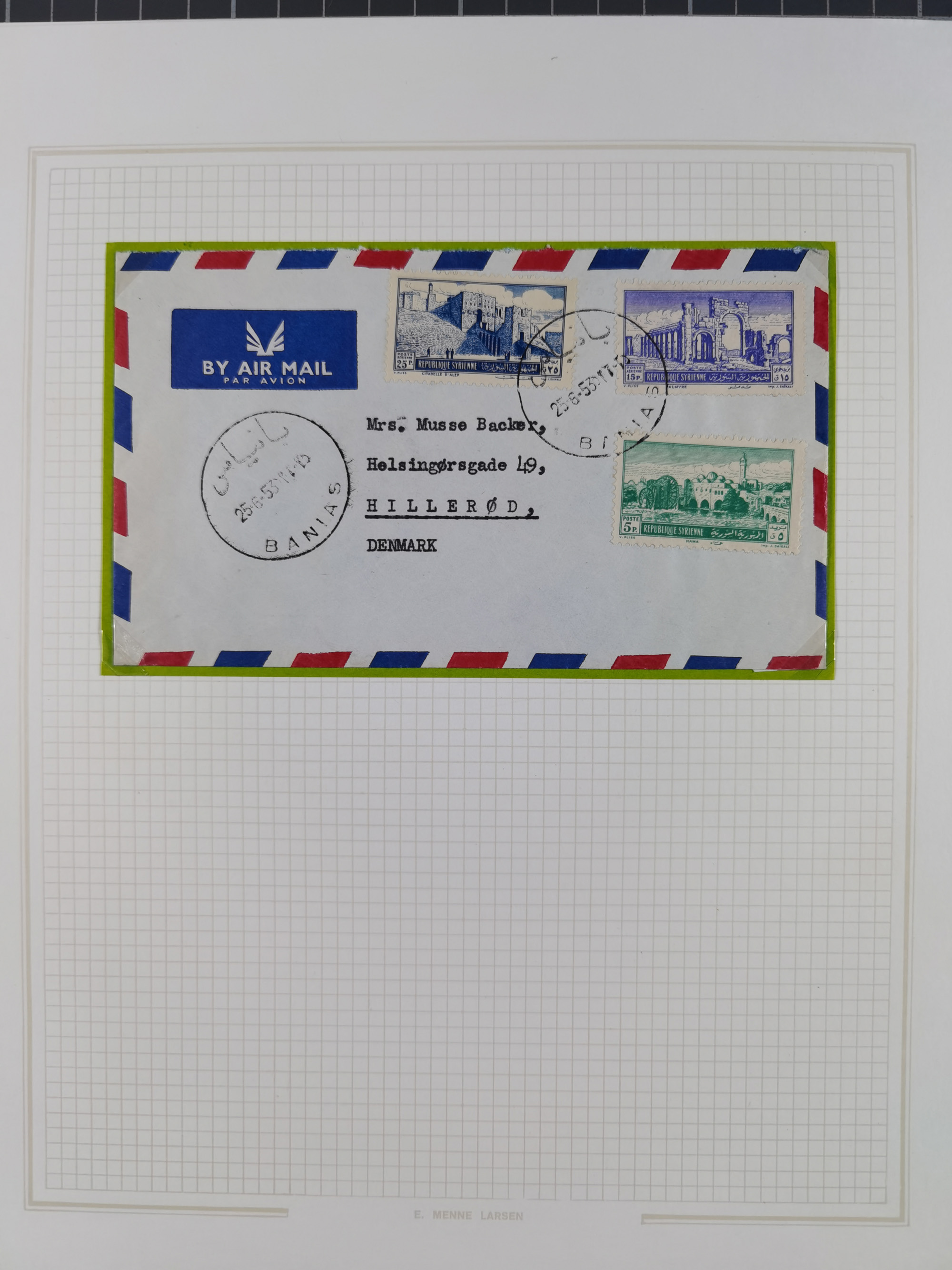 1915/57, 43 covers and cards from ottoman period to first fights, including WWI censor cards from Aleppo and Damas, parcel card cancelled Damas 5 to Bagdad overland mail, french mandate with T.E.P.528 and 614, several modern censor marks, parcel tag to USA, additional few old photos of Damas and Egypt ship at harbour, mainly fine.