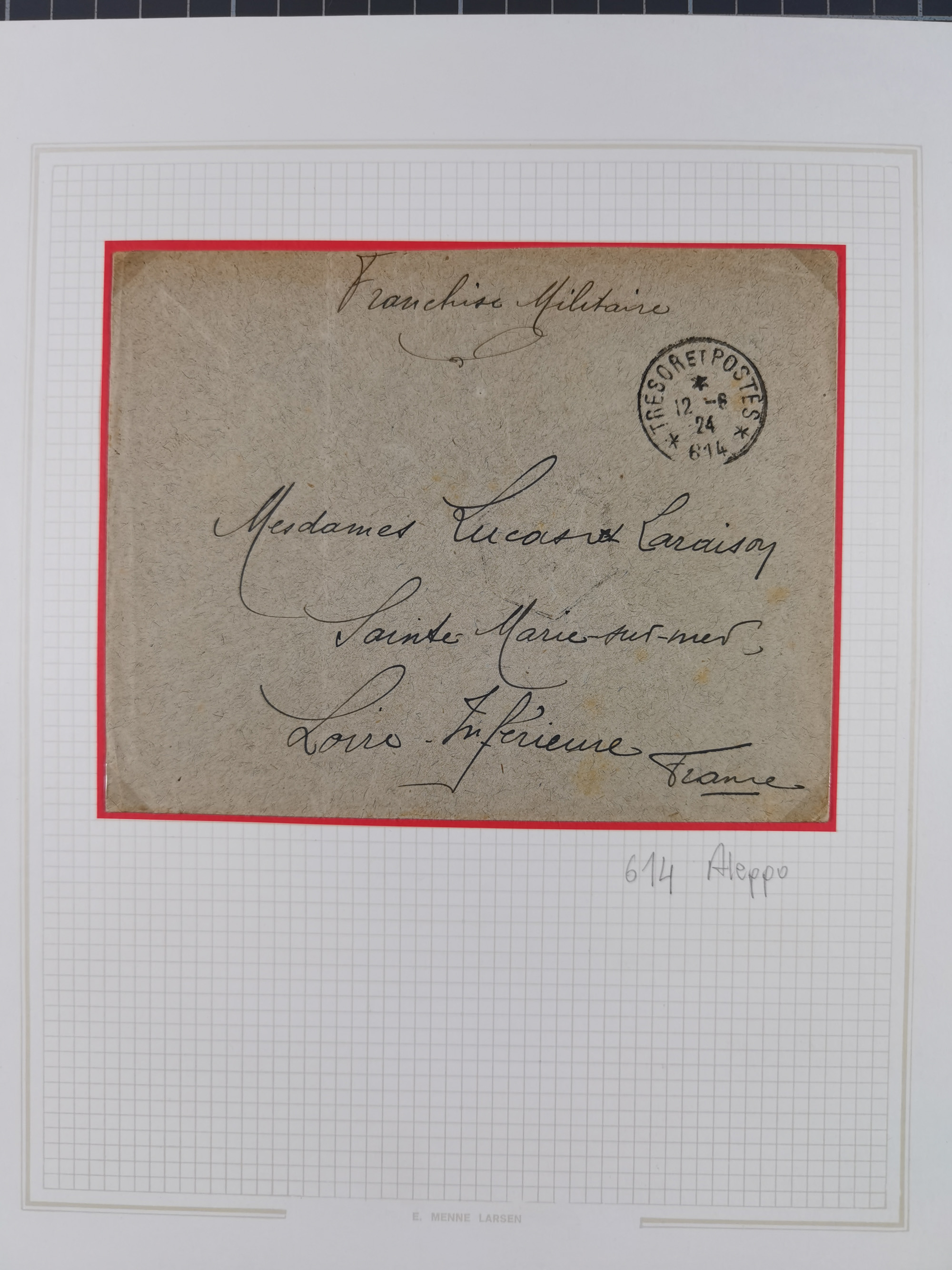 1856/1918, Postal History of Ottoman Syria (7), including prefilatelic cover Alep, Tatar post document with cancellations of Damas and Beyrouth, postcard 1890 from Aleppo via Alexandrette and Port-Said via french ship to France, censor marks of Aleppo and Damas,