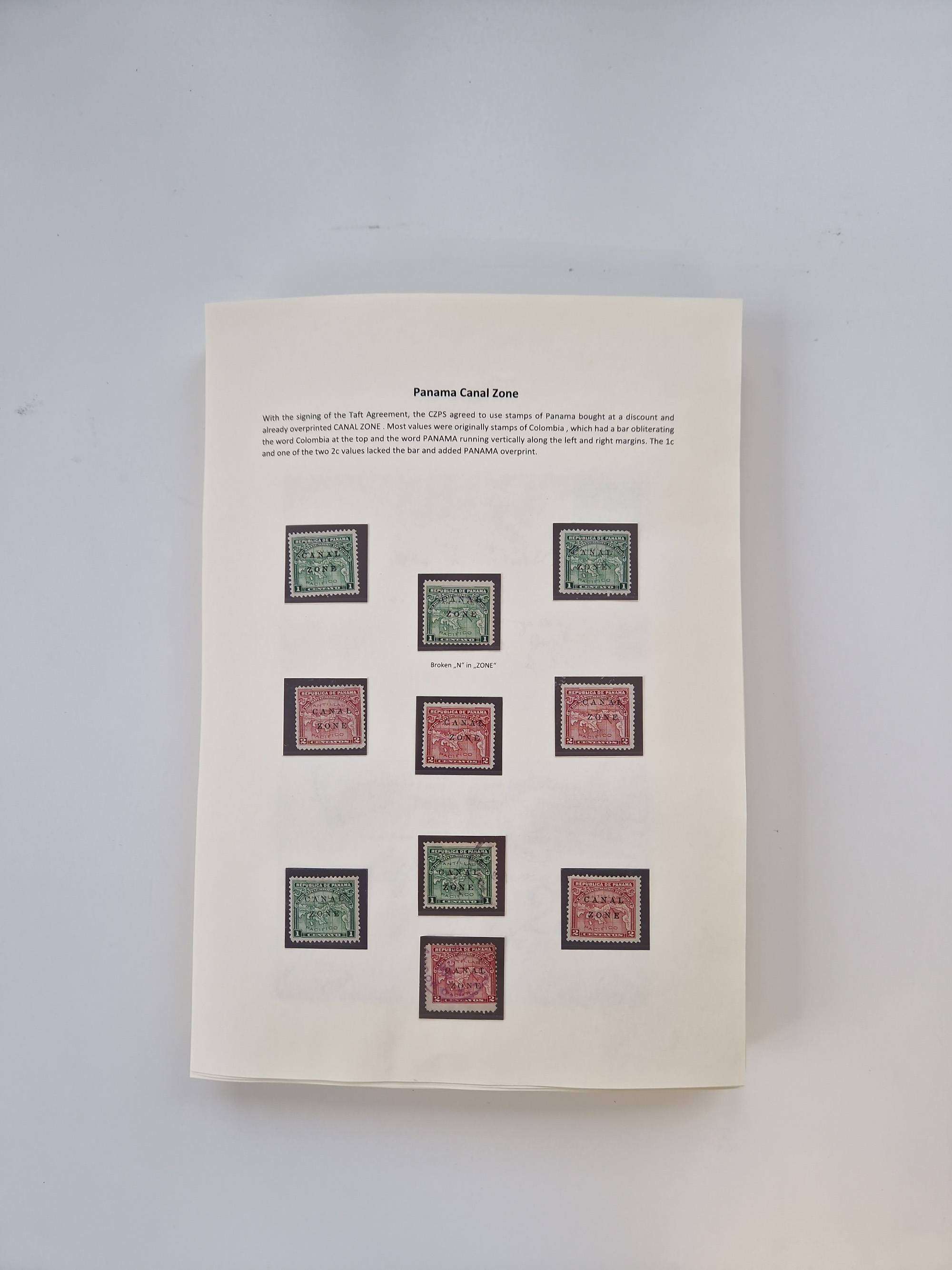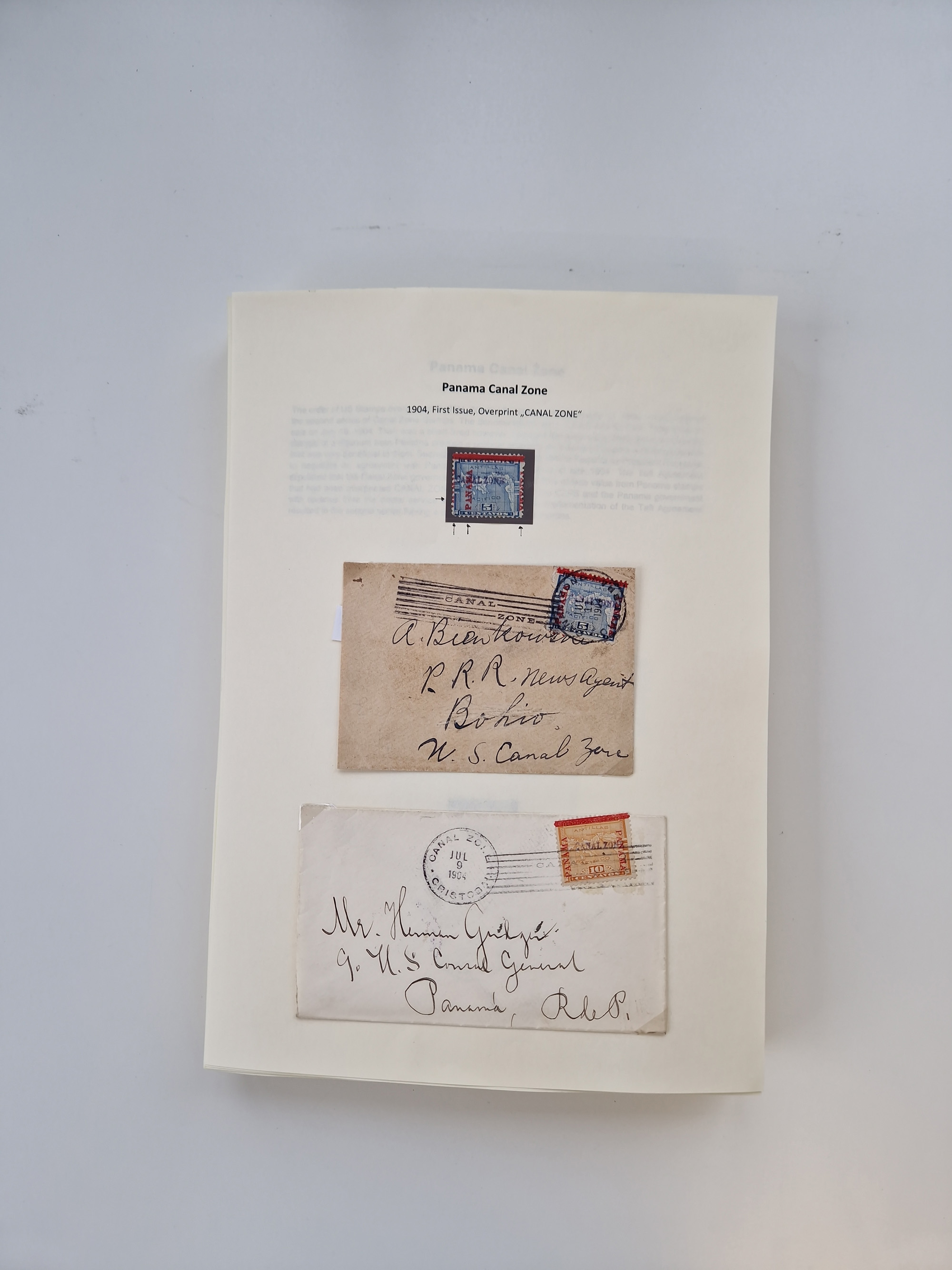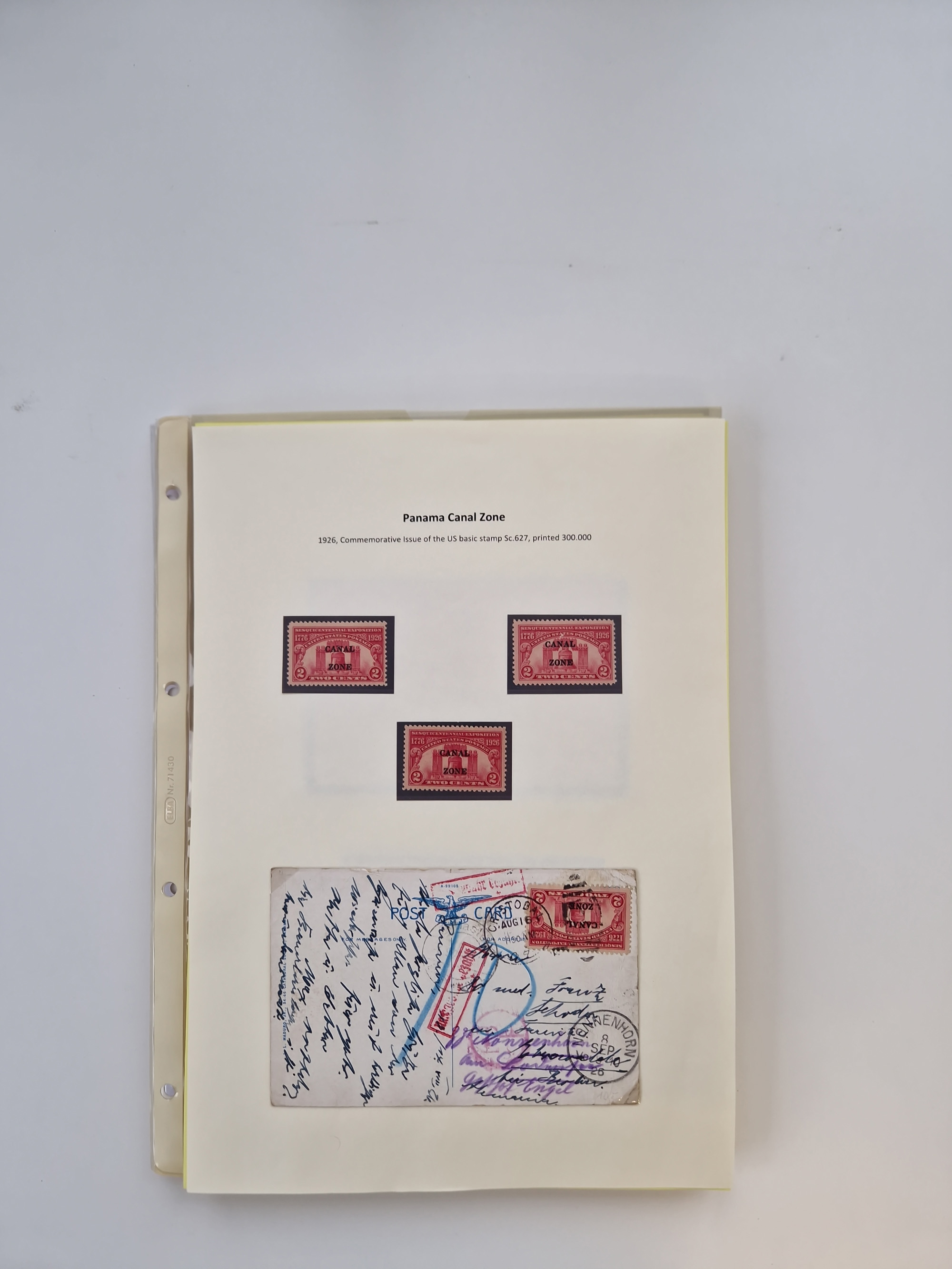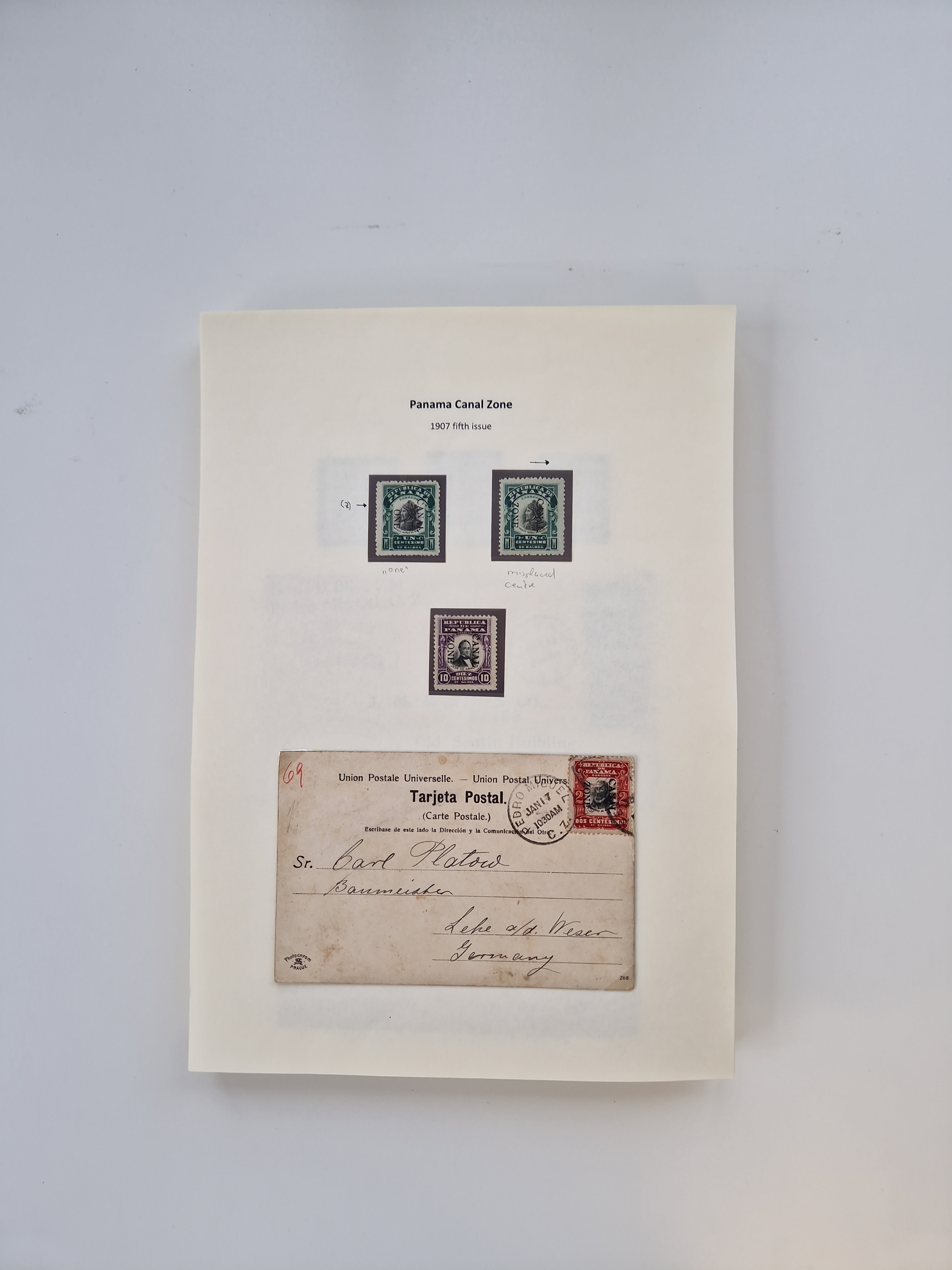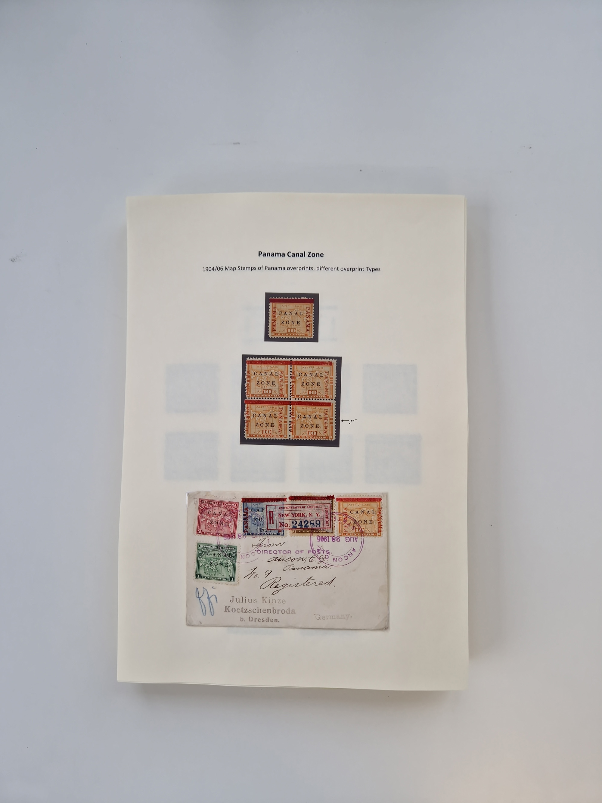 1904/78, very interesting and substantial unused and used collection with covers, starting with MI.-Nr. 1-3 unused and on cover, Mi.-Nr. 2 and 3 each on cover, Mi-.Nr. 4-8 unused and used, Mi.-Nr. 29-37, 54-68 unused, 1912/16 2c. inverted center, Unissued I-VII, many multiples including plate-numbers, overprint types and varities like Mi.-Nr. 59 as “tete-beche” pair with right stamp showing inverted “CANAL”, Specimen, booklet panes, different perforations, many varities throughout, also Officials and Postage Due, cards and covers, postal stationery including Cordoba 2 c. with variety “Vignette & CANAL ZONE” only, and a few items incoming mail, all neatly written up on pages, some certificates and literature, mostly good condition