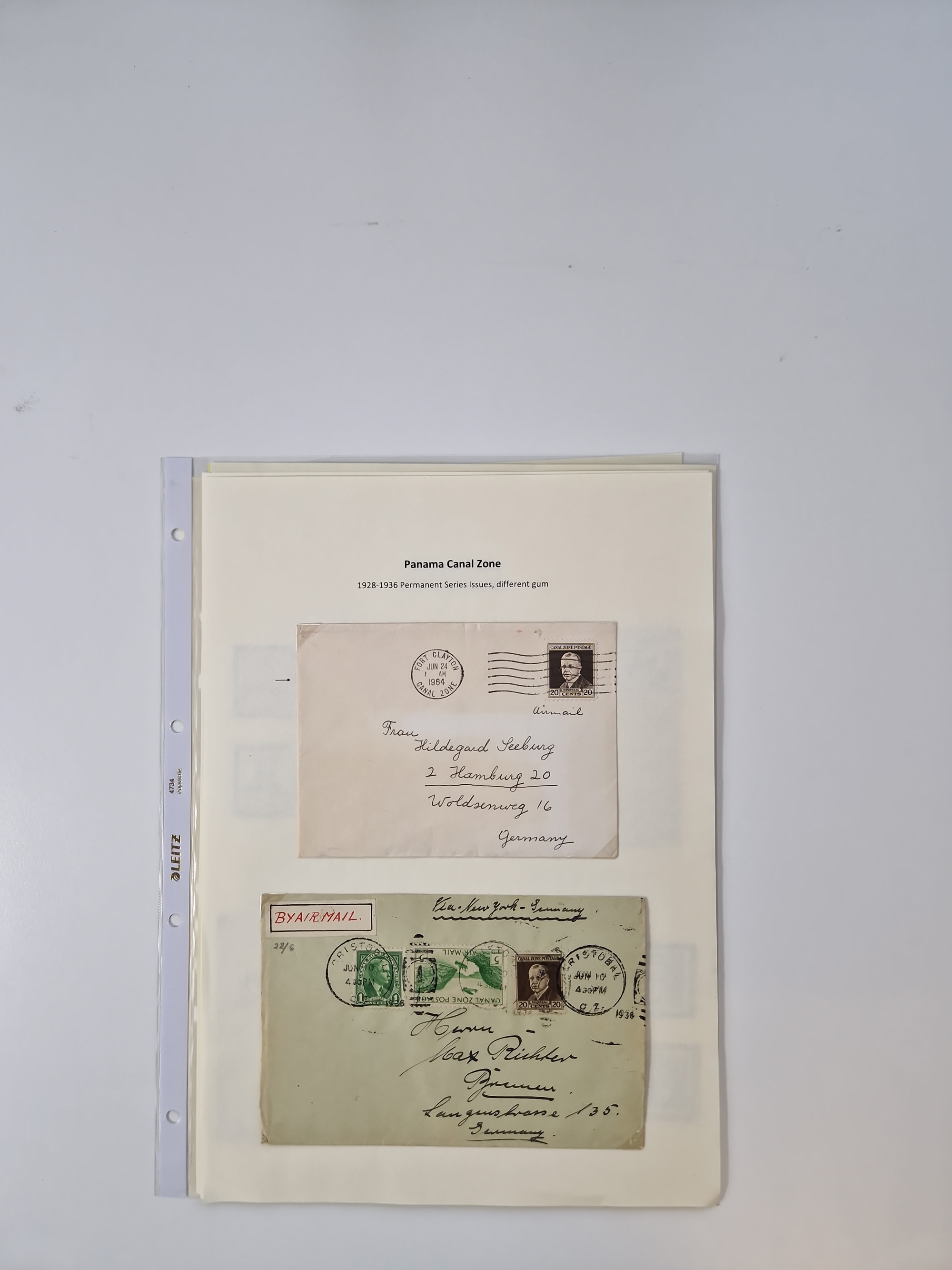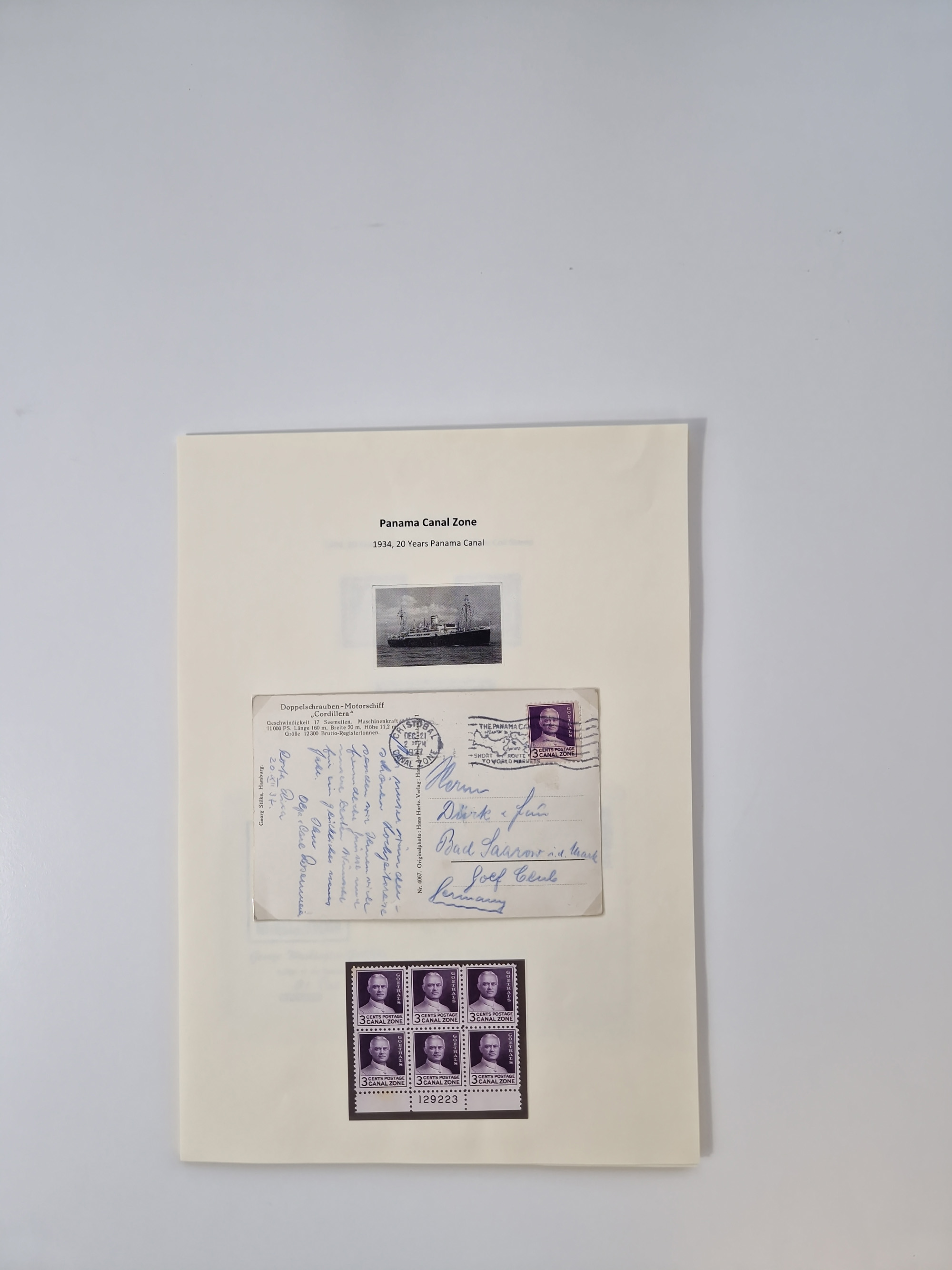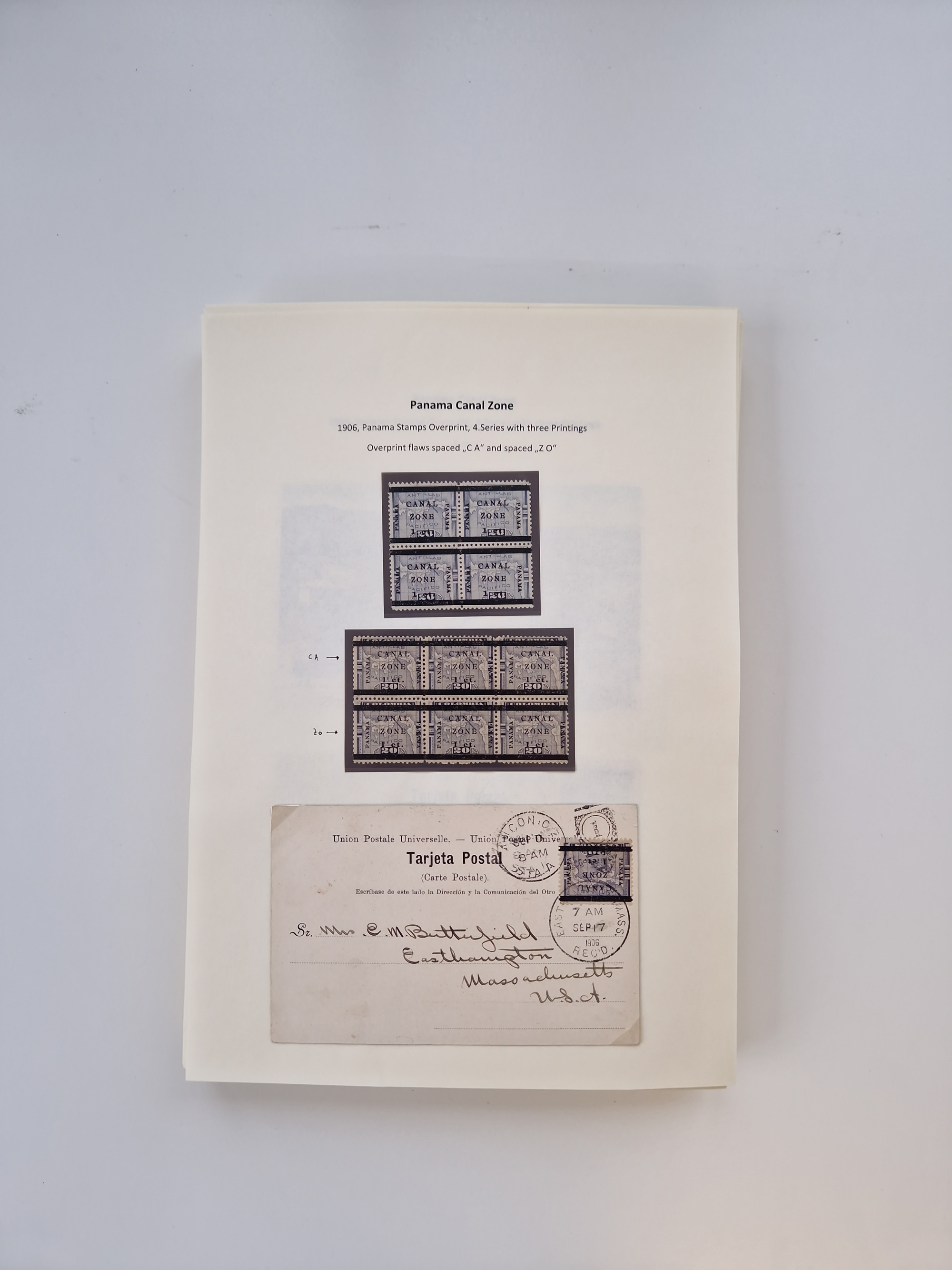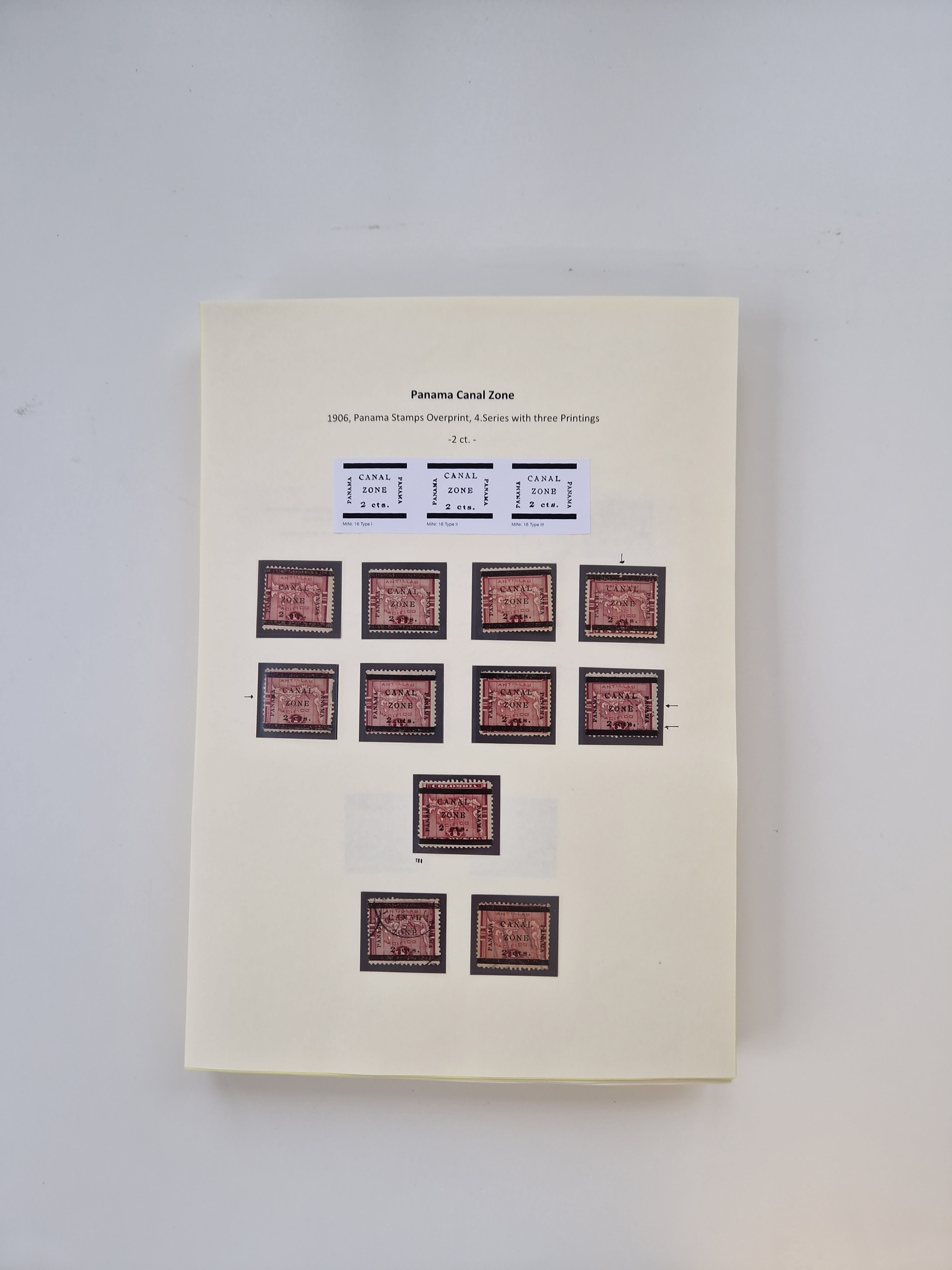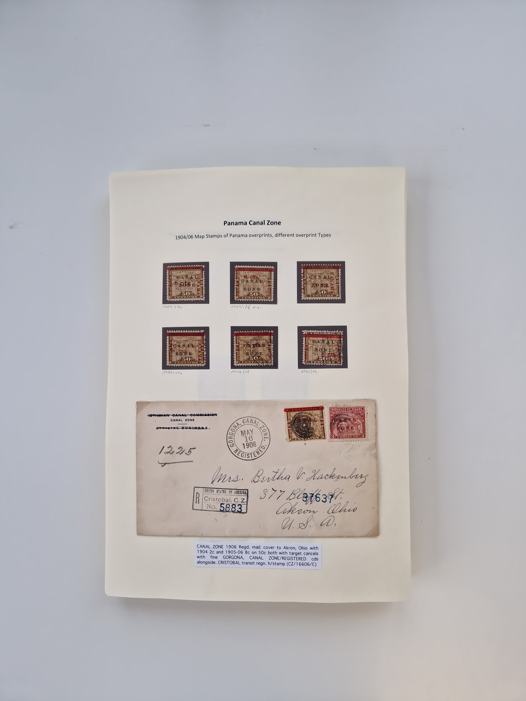 1904/78, very interesting and substantial unused and used collection with covers, starting with MI.-Nr. 1-3 unused and on cover, Mi.-Nr. 2 and 3 each on cover, Mi-.Nr. 4-8 unused and used, Mi.-Nr. 29-37, 54-68 unused, 1912/16 2c. inverted center, Unissued I-VII, many multiples including plate-numbers, overprint types and varities like Mi.-Nr. 59 as “tete-beche” pair with right stamp showing inverted “CANAL”, Specimen, booklet panes, different perforations, many varities throughout, also Officials and Postage Due, cards and covers, postal stationery including Cordoba 2 c. with variety “Vignette & CANAL ZONE” only, and a few items incoming mail, all neatly written up on pages, some certificates and literature, mostly good condition