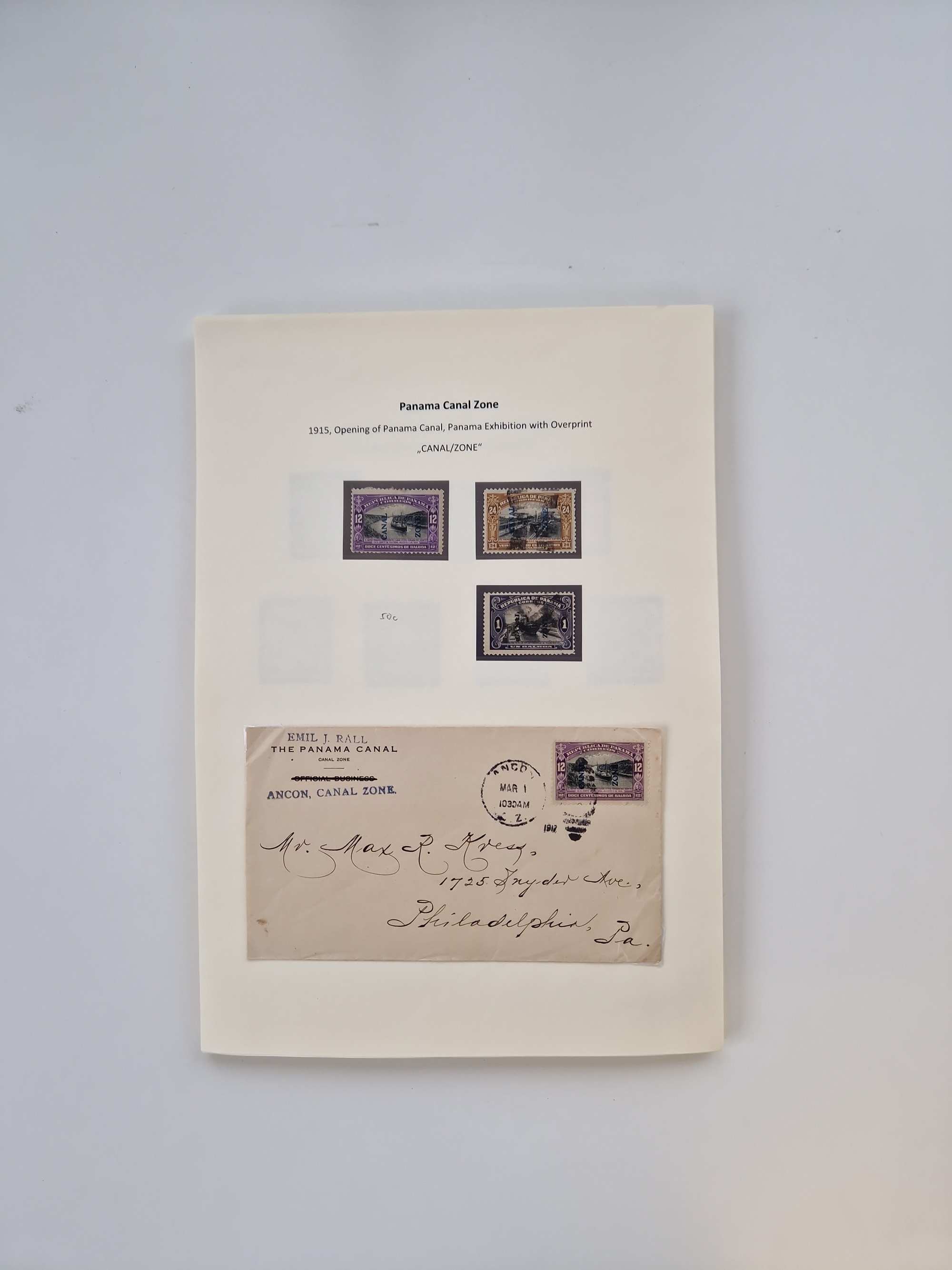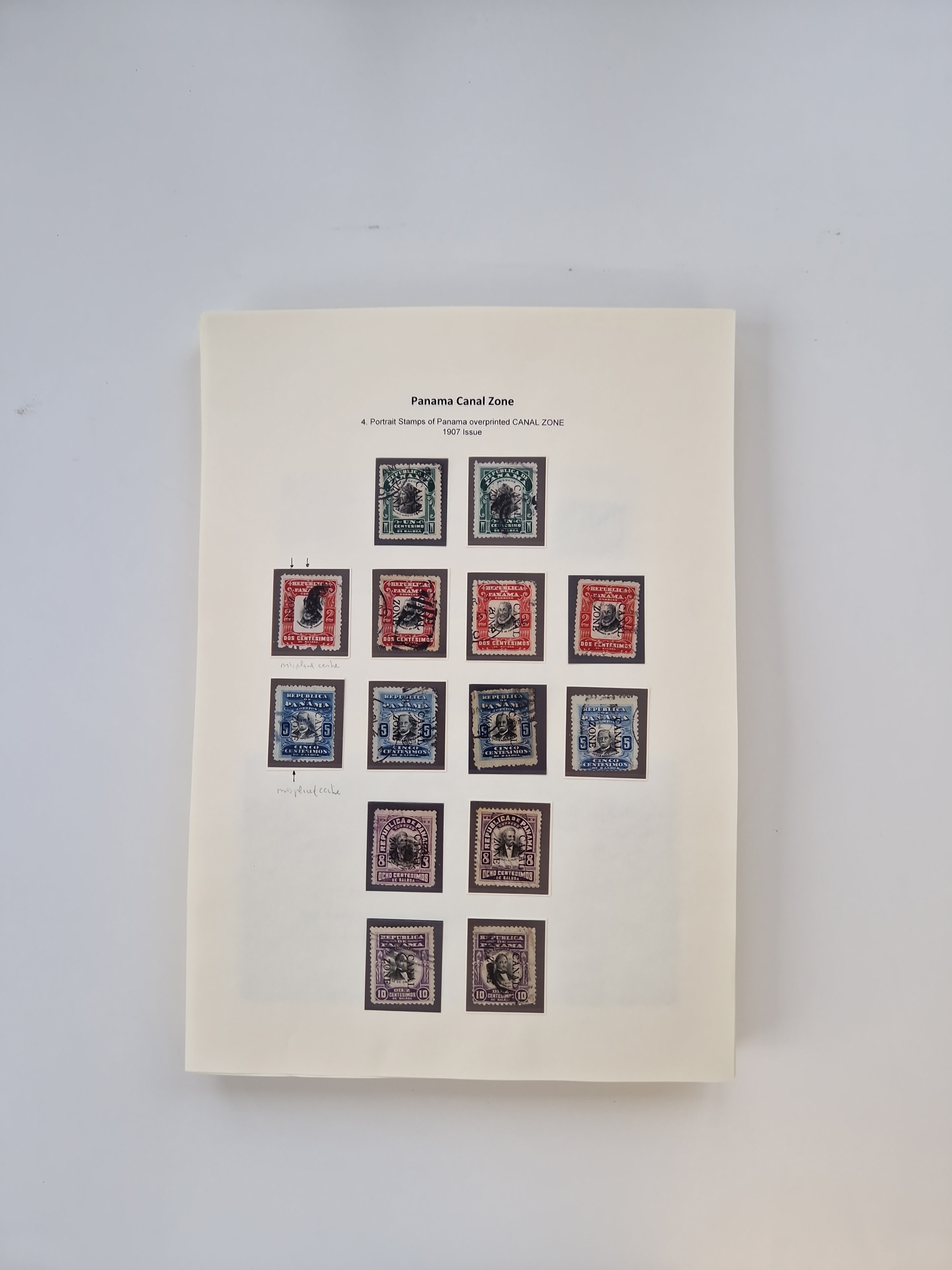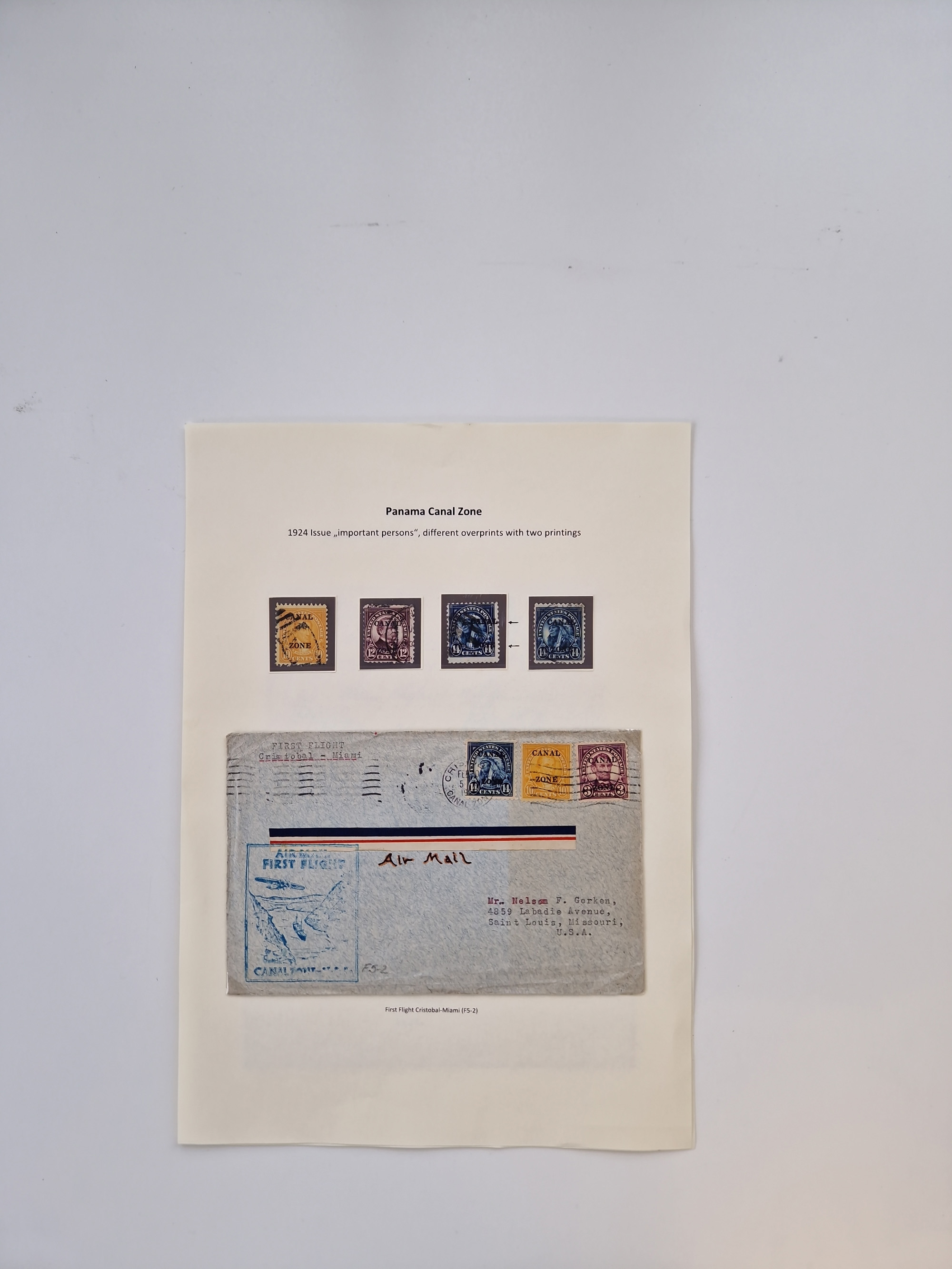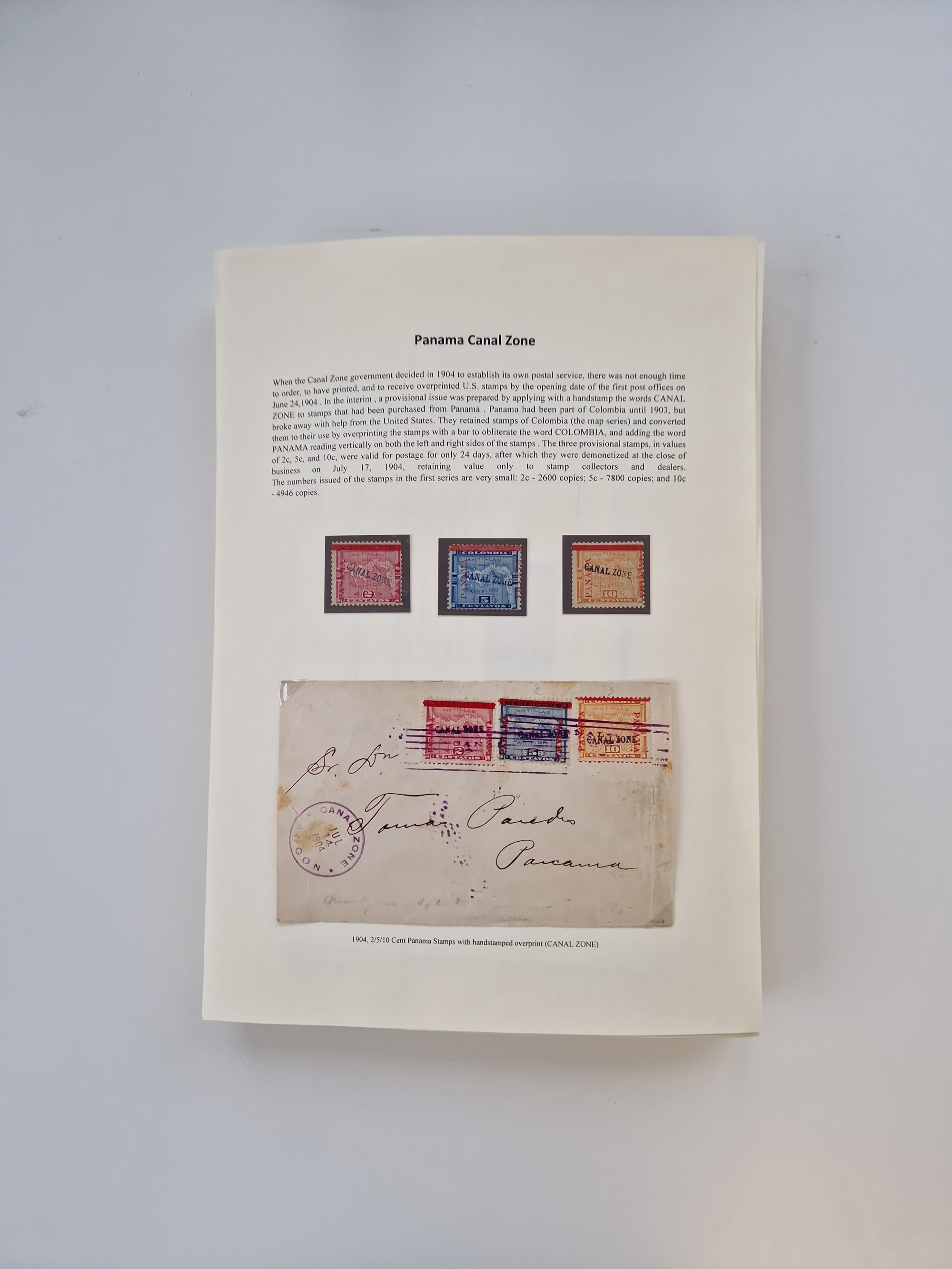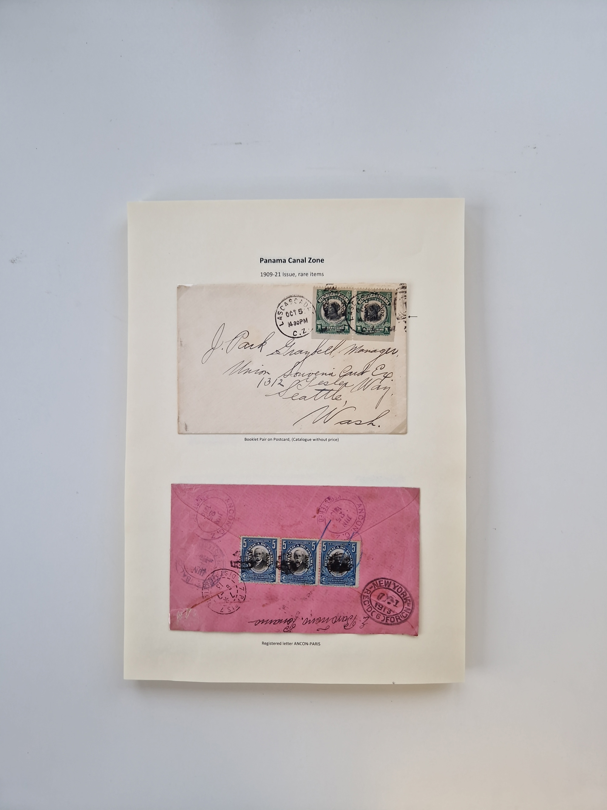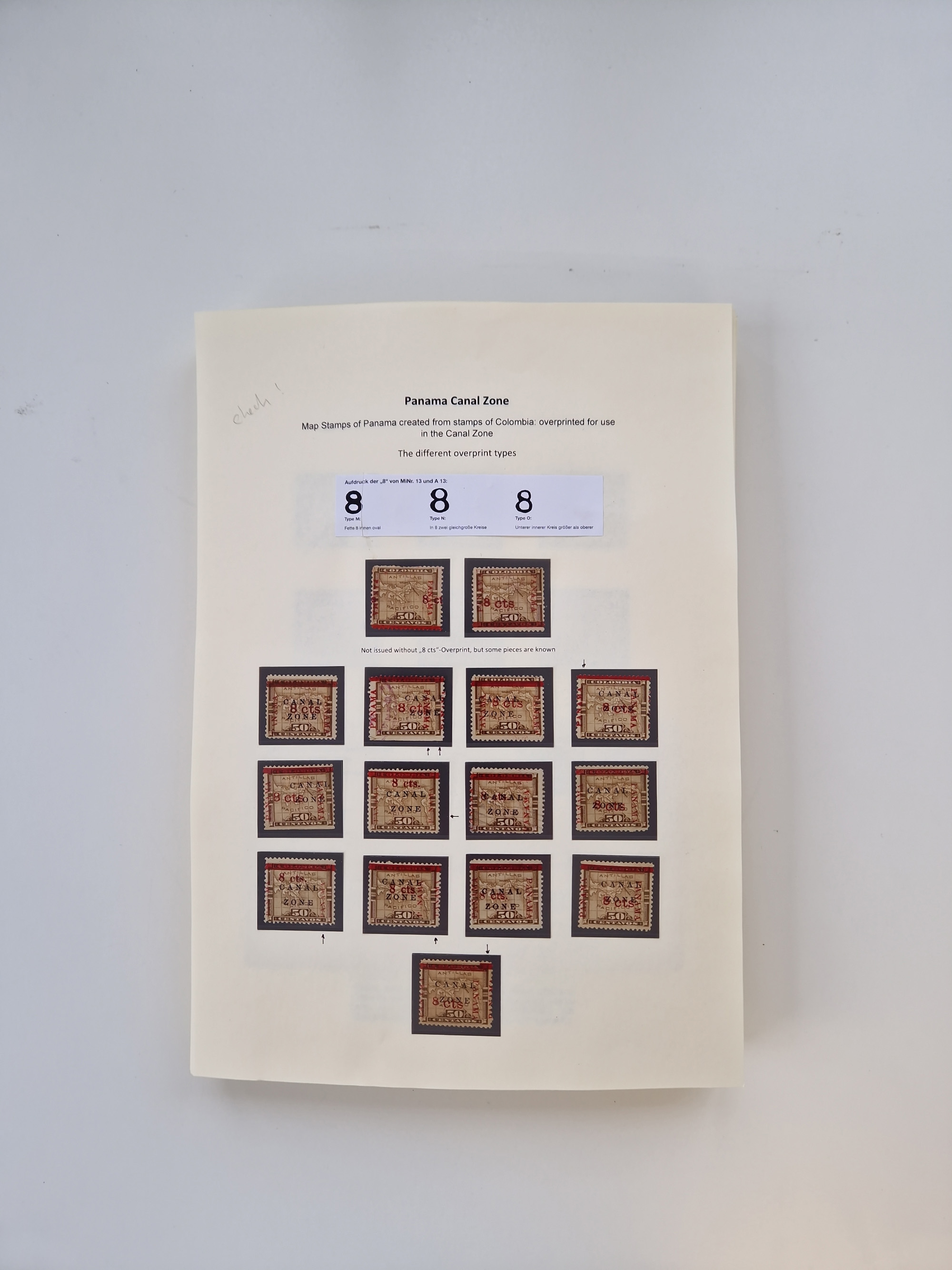 1904/78, very interesting and substantial unused and used collection with covers, starting with MI.-Nr. 1-3 unused and on cover, Mi.-Nr. 2 and 3 each on cover, Mi-.Nr. 4-8 unused and used, Mi.-Nr. 29-37, 54-68 unused, 1912/16 2c. inverted center, Unissued I-VII, many multiples including plate-numbers, overprint types and varities like Mi.-Nr. 59 as “tete-beche” pair with right stamp showing inverted “CANAL”, Specimen, booklet panes, different perforations, many varities throughout, also Officials and Postage Due, cards and covers, postal stationery including Cordoba 2 c. with variety “Vignette & CANAL ZONE” only, and a few items incoming mail, all neatly written up on pages, some certificates and literature, mostly good condition