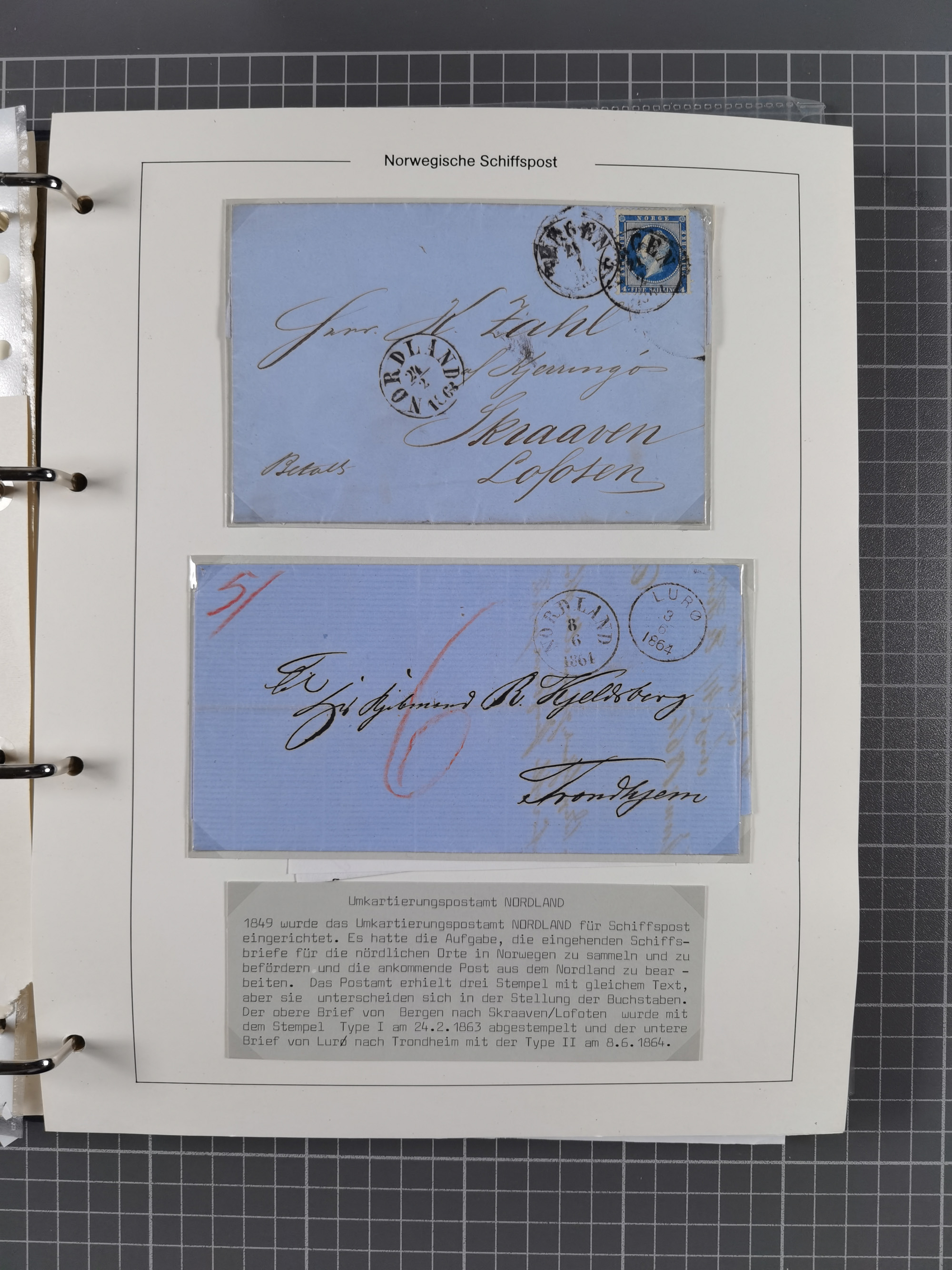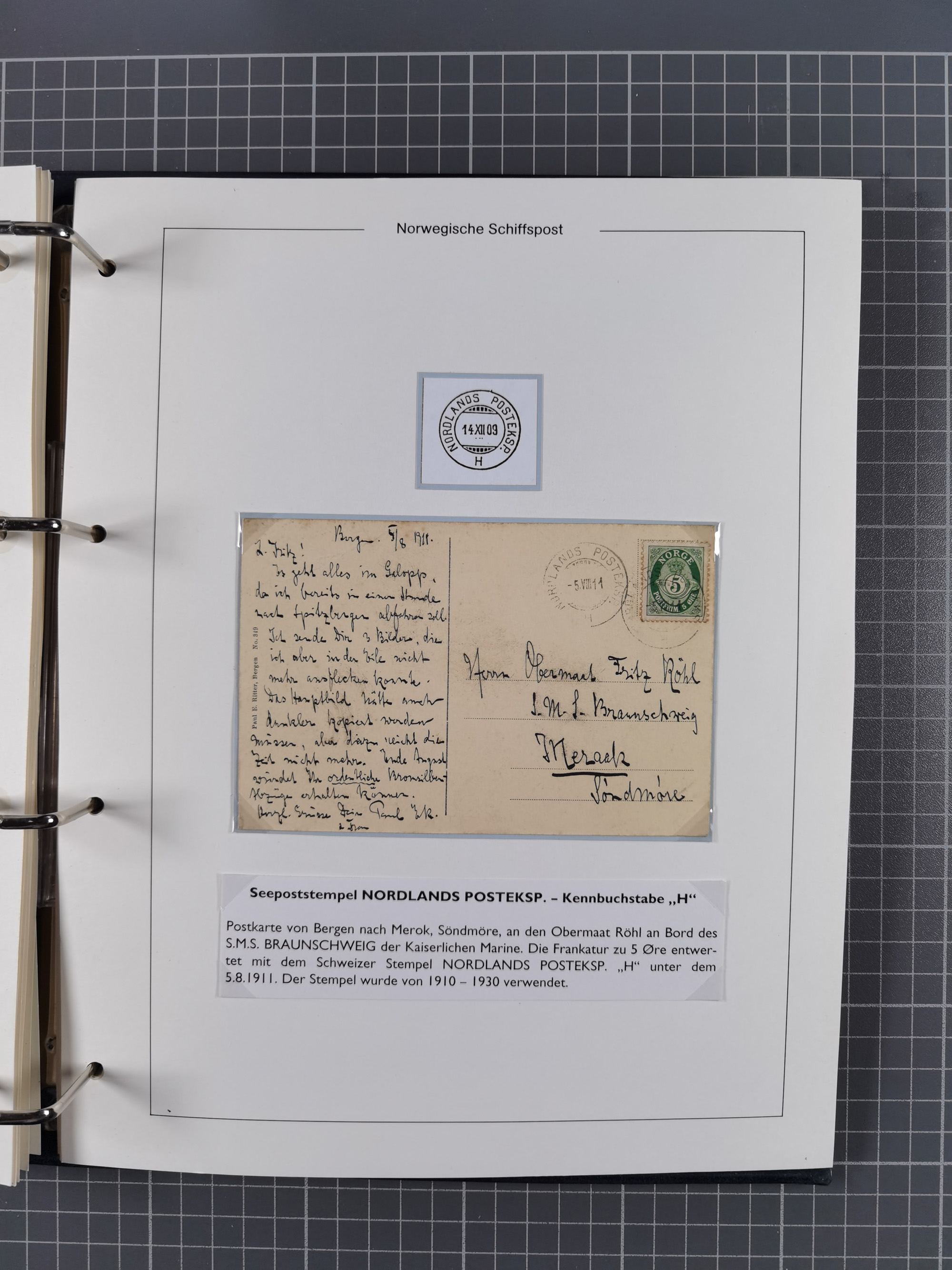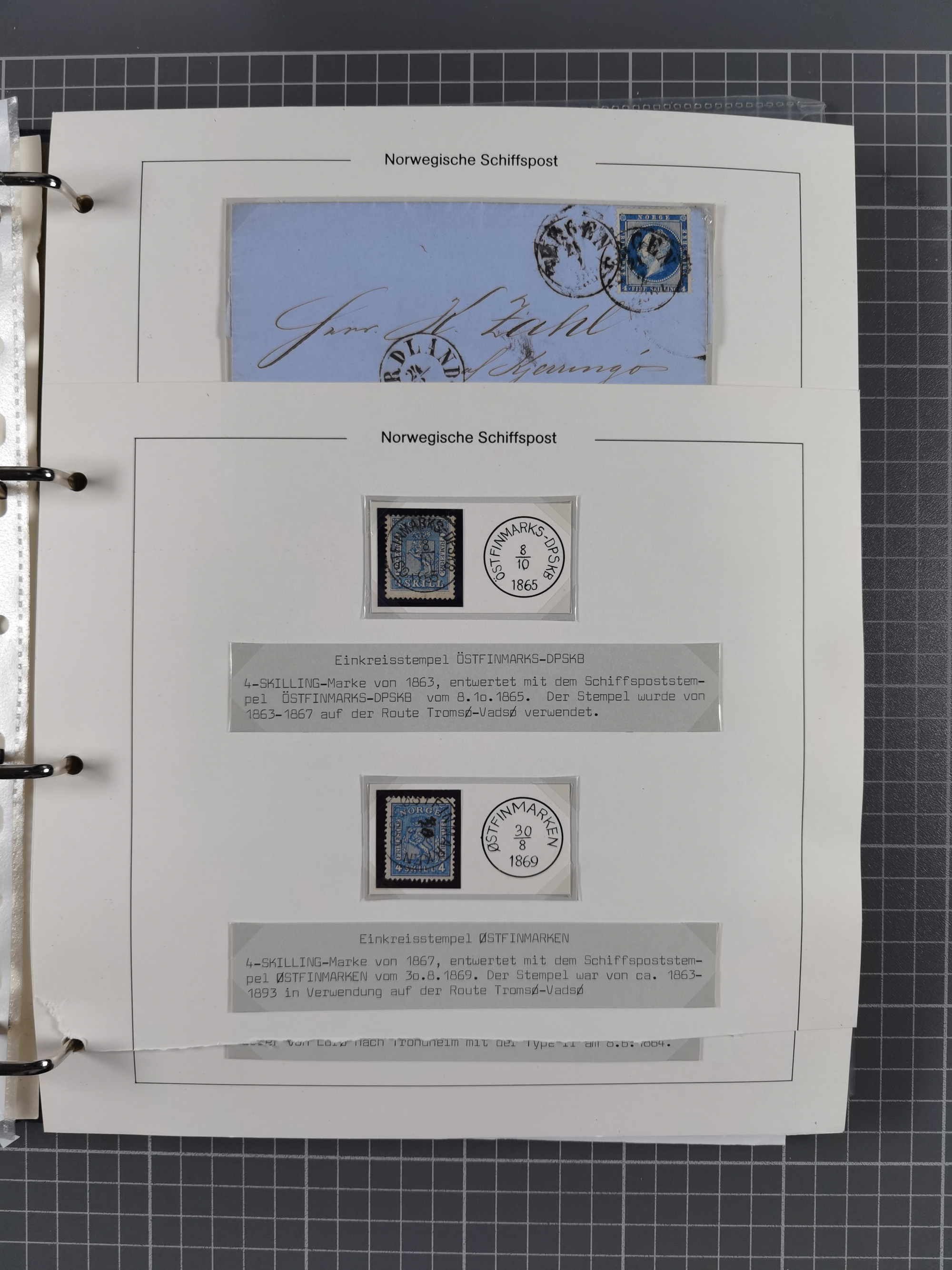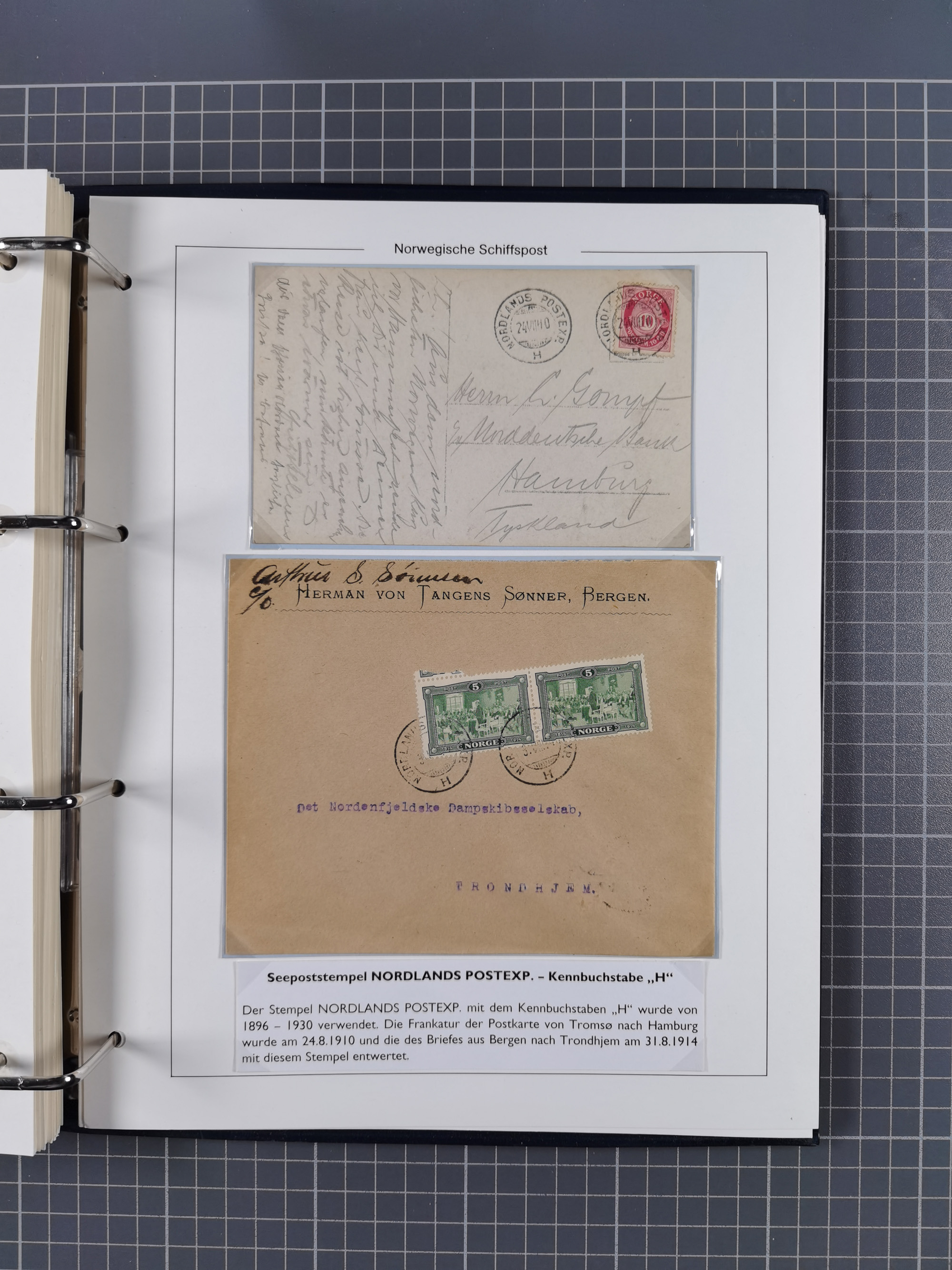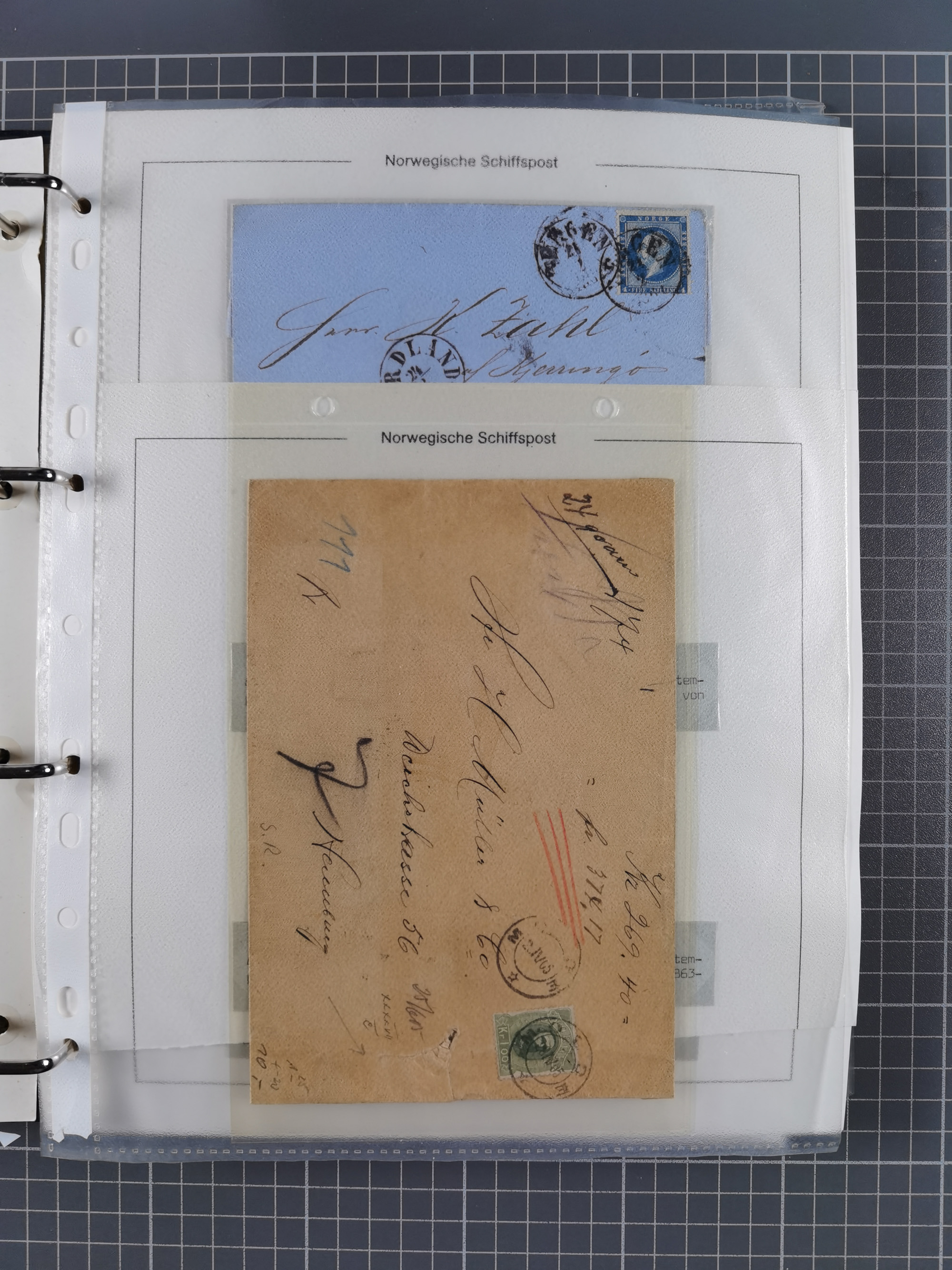 NORWEGEN: 1838/1980 (ca.), umfangreiche Sammlung “Norwegische Schiffspost” mit ca. fast 700 Briefen, Karten und GSK bis ca. 1960 inkl. Incoming Mail und etlichen nicht eingearbeiteten Belegen. Dabei frühe Post mit u.a. kpl. Faltbrief 1838 von Christiania mit ovalem Stempel “ALTONA SCHIFFSBRIEF” nach Schottland, kpl. Faltbrief 1863 mit handschriftlichem Aufgabevermerk “Foldin”, kpl. Faltbrief 1861 mit handschriftlichem Aufgabevermerk “Bjprn Farmand”, blauer EKr. “HALDEN 6.10.1854” auf kpl. Faltbrief und Briefhülle mit schwarzem EKr. “HAKON JARL 29.5.1861”. Danach u.a. zwei Briefe 1861/63 mit EKr. “NORDLAND”, Transitstempel “Norwegen direct” rückseitig auf Faltbrief mit zweimal 8 Sk. mit EKr. “STAVANGER 14.9.1864”, viele Nordlands Posteksp.-Stempel inkl. R-Briefen, Stempel “BÜREAU DE MER DE NORVEGE B 27.X.23” auf frankiertem R-Brief nach Schweden und 12 Briefe “NORSK SKIPSPOST HANDELSFLÄTEN” 1943/45 (6x mit Zensur). Dazu viele lose Marken und Briefstücke mit Schiffspost-Stempeln und zusätzlich viele Briefe nach 1960, alles auf Albenblättern mit Beschriftung in 24 Alben und ein mittlerer Karton mit nicht eingearbeitetem Material. Ein außergewöhnliches und empfehlenswertes Objekt