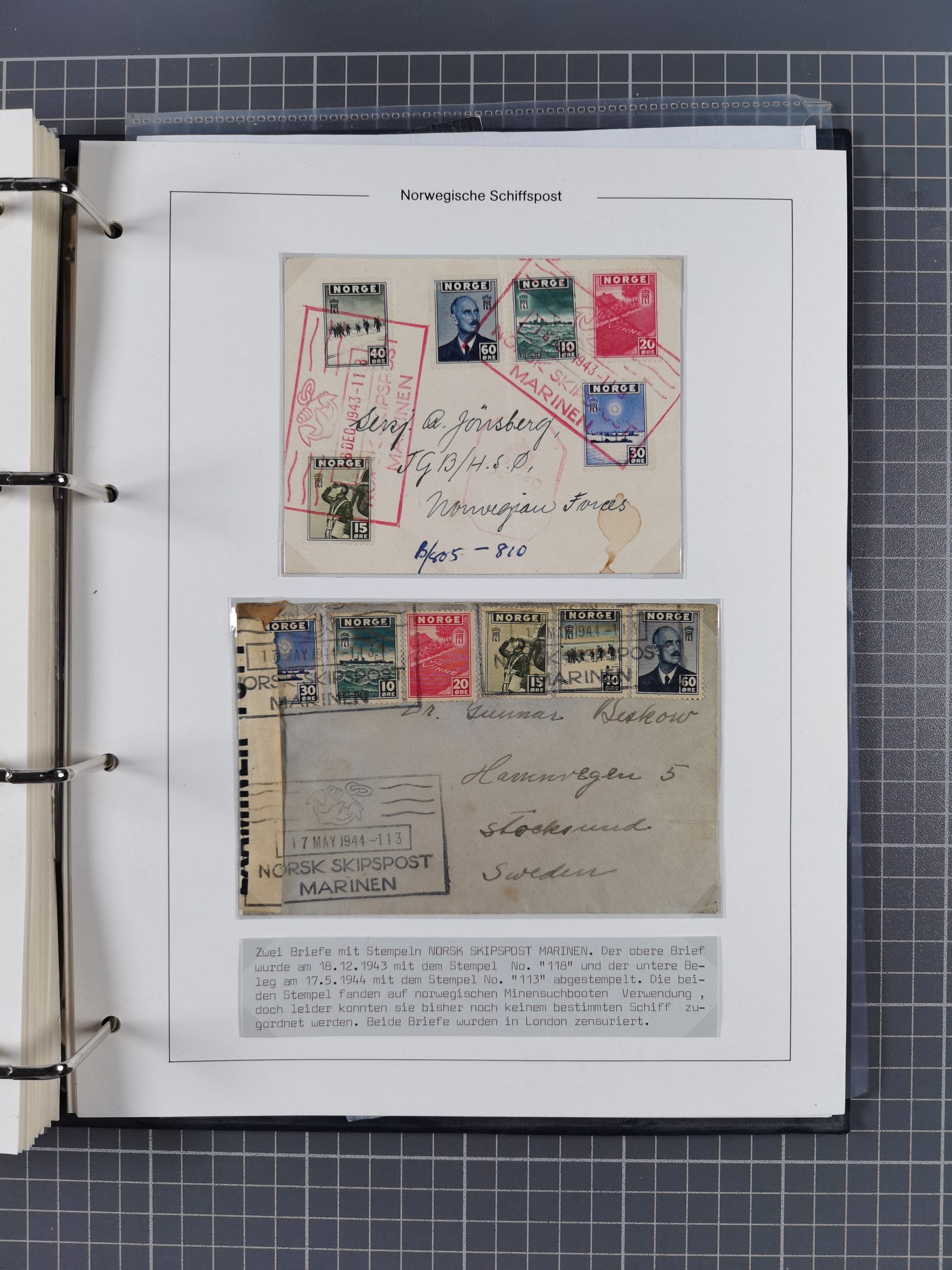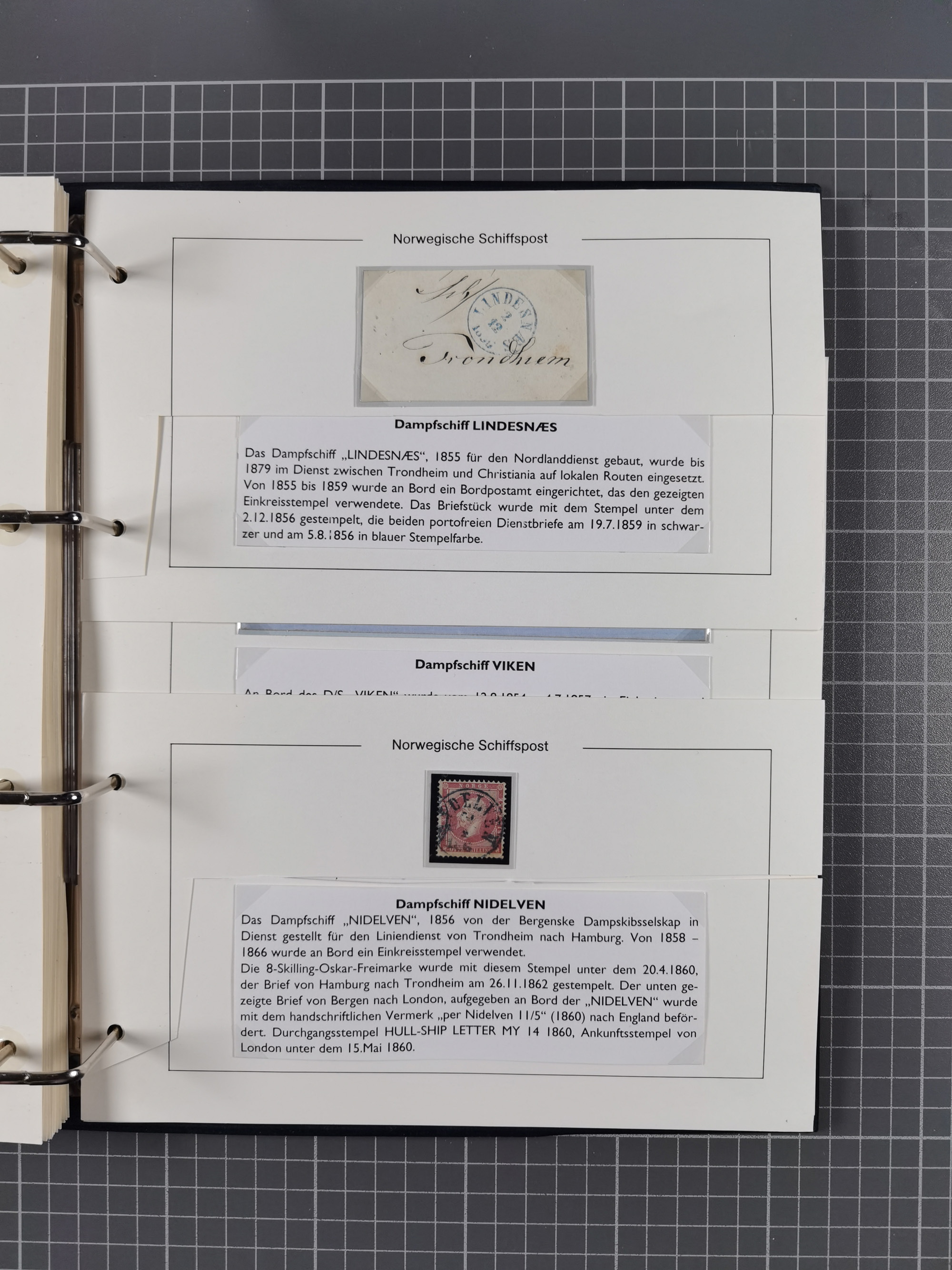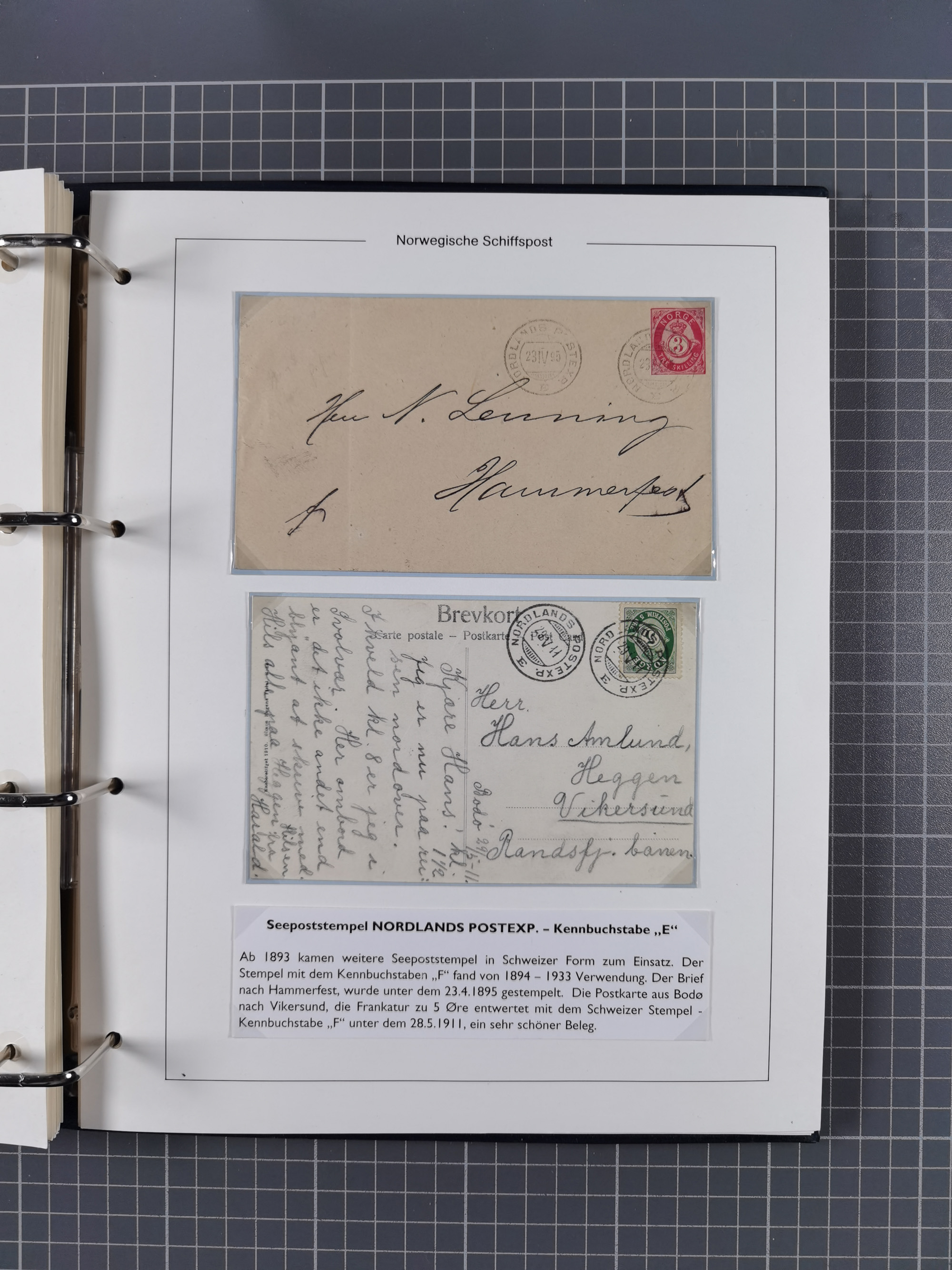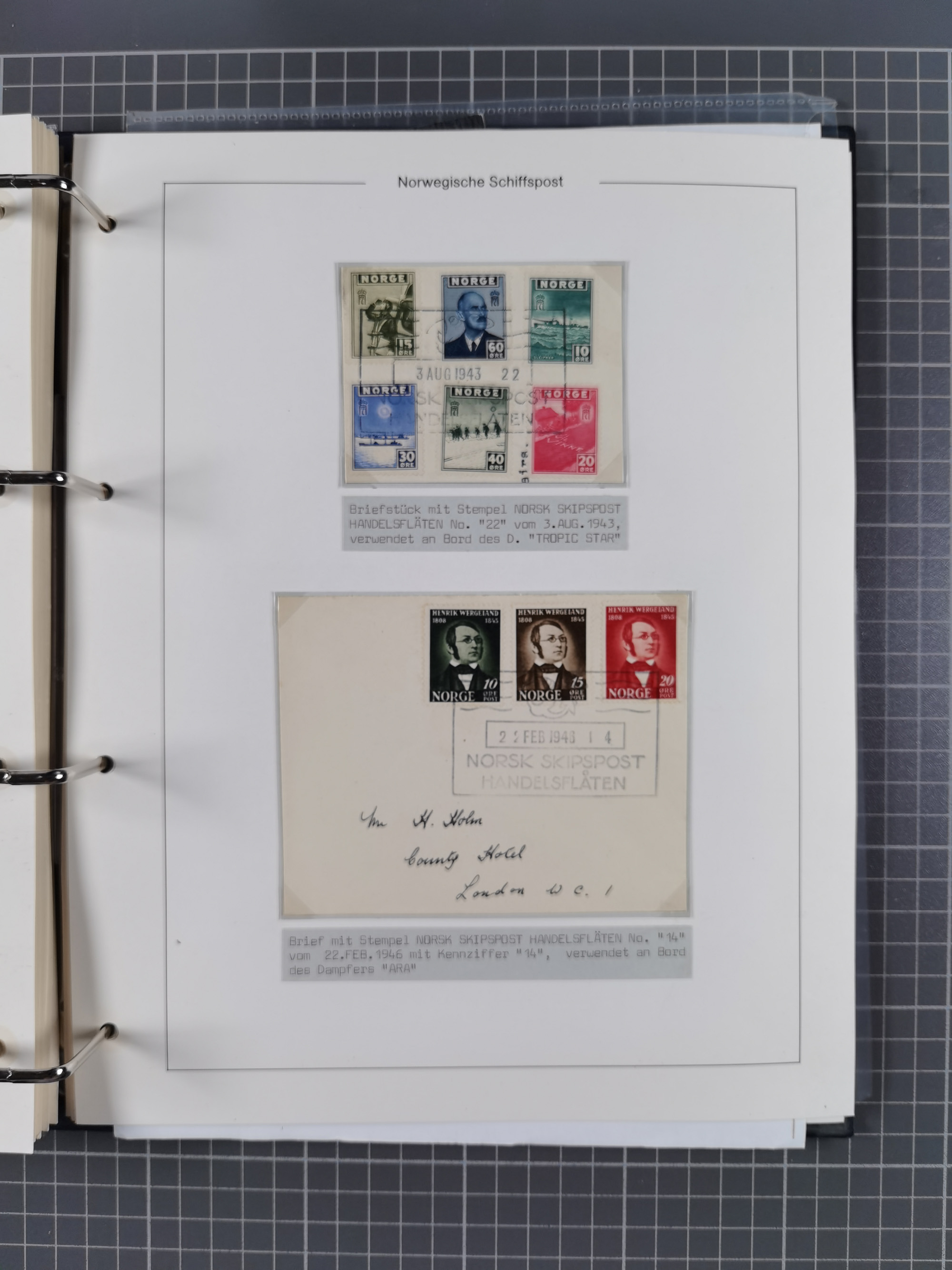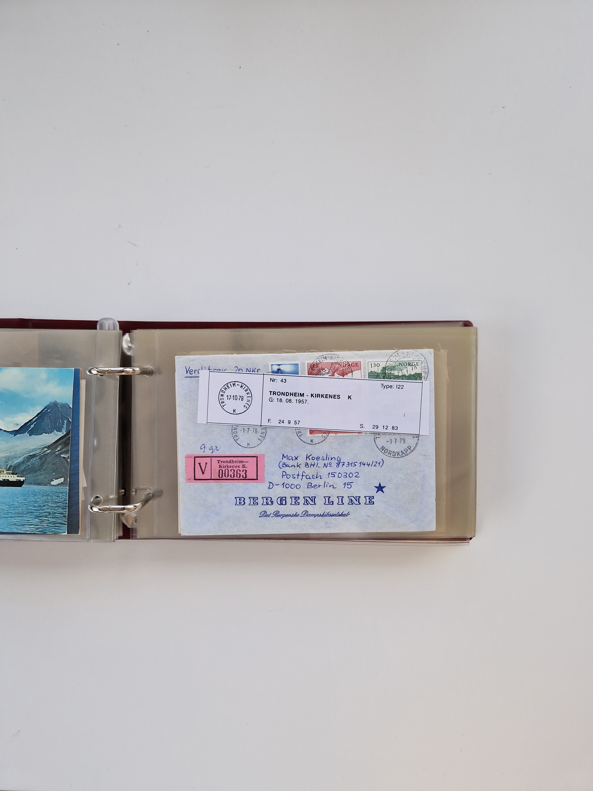 NORWEGEN: 1838/1980 (ca.), umfangreiche Sammlung “Norwegische Schiffspost” mit ca. fast 700 Briefen, Karten und GSK bis ca. 1960 inkl. Incoming Mail und etlichen nicht eingearbeiteten Belegen. Dabei frühe Post mit u.a. kpl. Faltbrief 1838 von Christiania mit ovalem Stempel “ALTONA SCHIFFSBRIEF” nach Schottland, kpl. Faltbrief 1863 mit handschriftlichem Aufgabevermerk “Foldin”, kpl. Faltbrief 1861 mit handschriftlichem Aufgabevermerk “Bjprn Farmand”, blauer EKr. “HALDEN 6.10.1854” auf kpl. Faltbrief und Briefhülle mit schwarzem EKr. “HAKON JARL 29.5.1861”. Danach u.a. zwei Briefe 1861/63 mit EKr. “NORDLAND”, Transitstempel “Norwegen direct” rückseitig auf Faltbrief mit zweimal 8 Sk. mit EKr. “STAVANGER 14.9.1864”, viele Nordlands Posteksp.-Stempel inkl. R-Briefen, Stempel “BÜREAU DE MER DE NORVEGE B 27.X.23” auf frankiertem R-Brief nach Schweden und 12 Briefe “NORSK SKIPSPOST HANDELSFLÄTEN” 1943/45 (6x mit Zensur). Dazu viele lose Marken und Briefstücke mit Schiffspost-Stempeln und zusätzlich viele Briefe nach 1960, alles auf Albenblättern mit Beschriftung in 24 Alben und ein mittlerer Karton mit nicht eingearbeitetem Material. Ein außergewöhnliches und empfehlenswertes Objekt