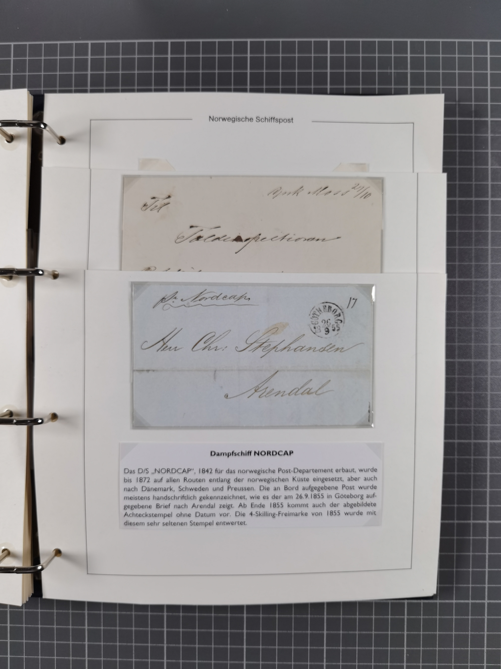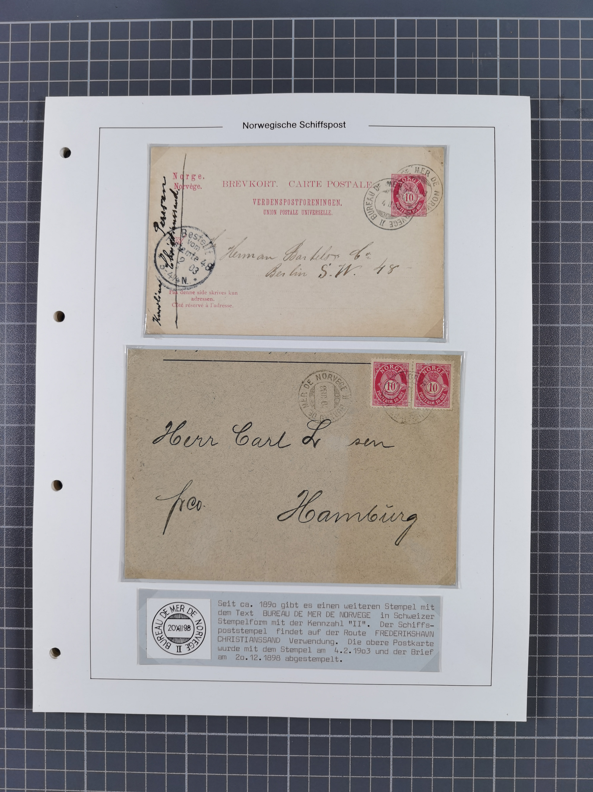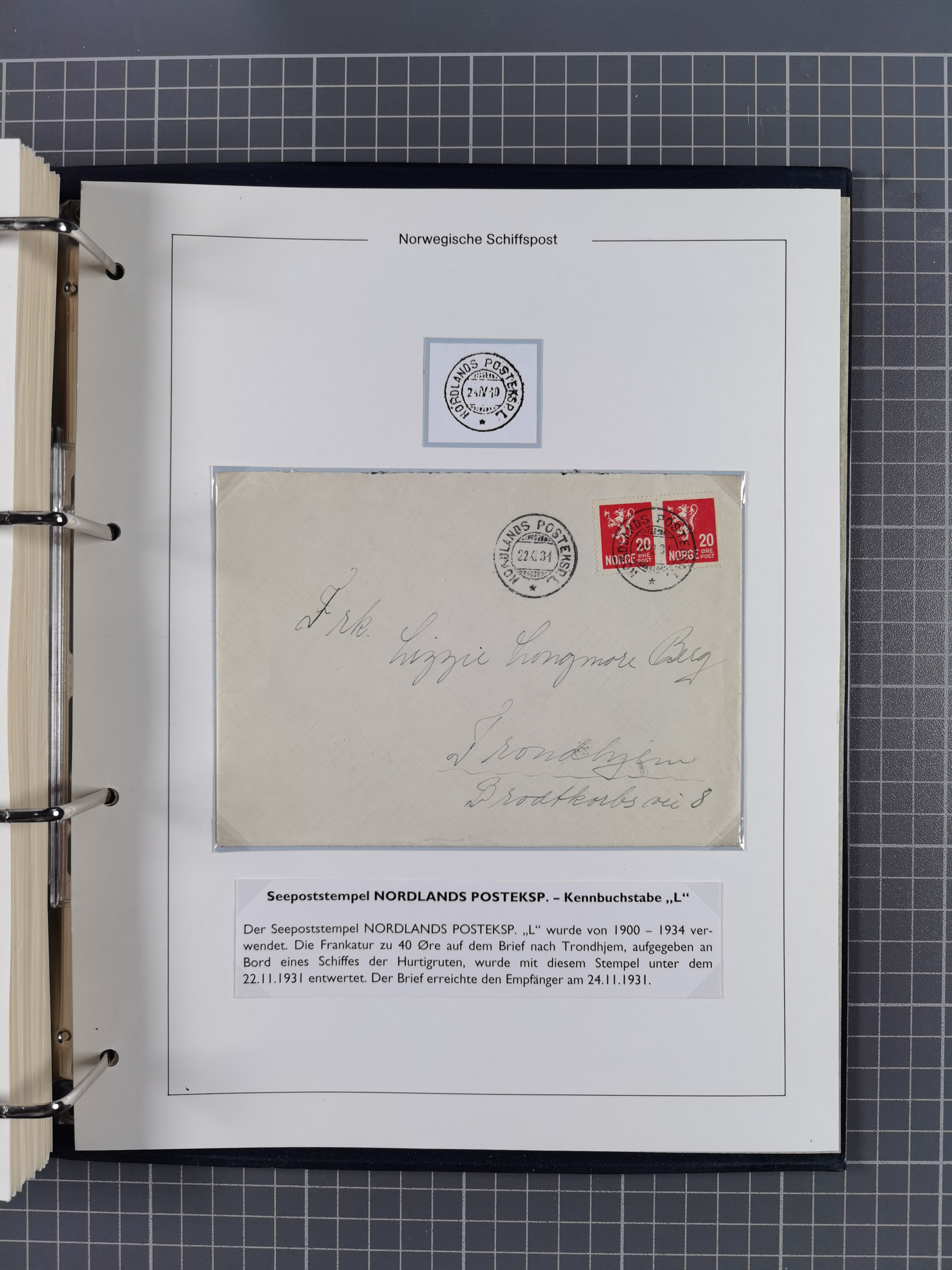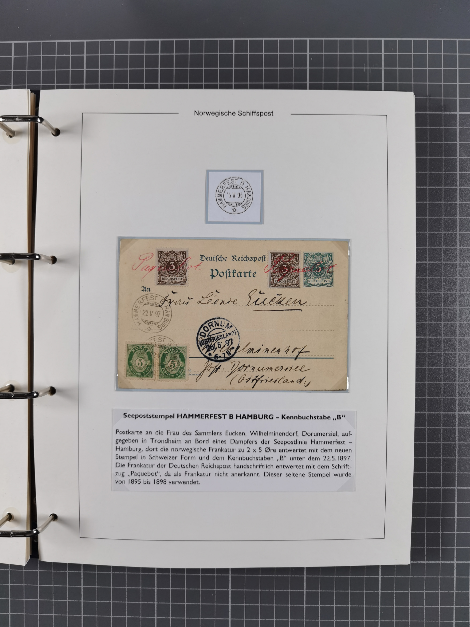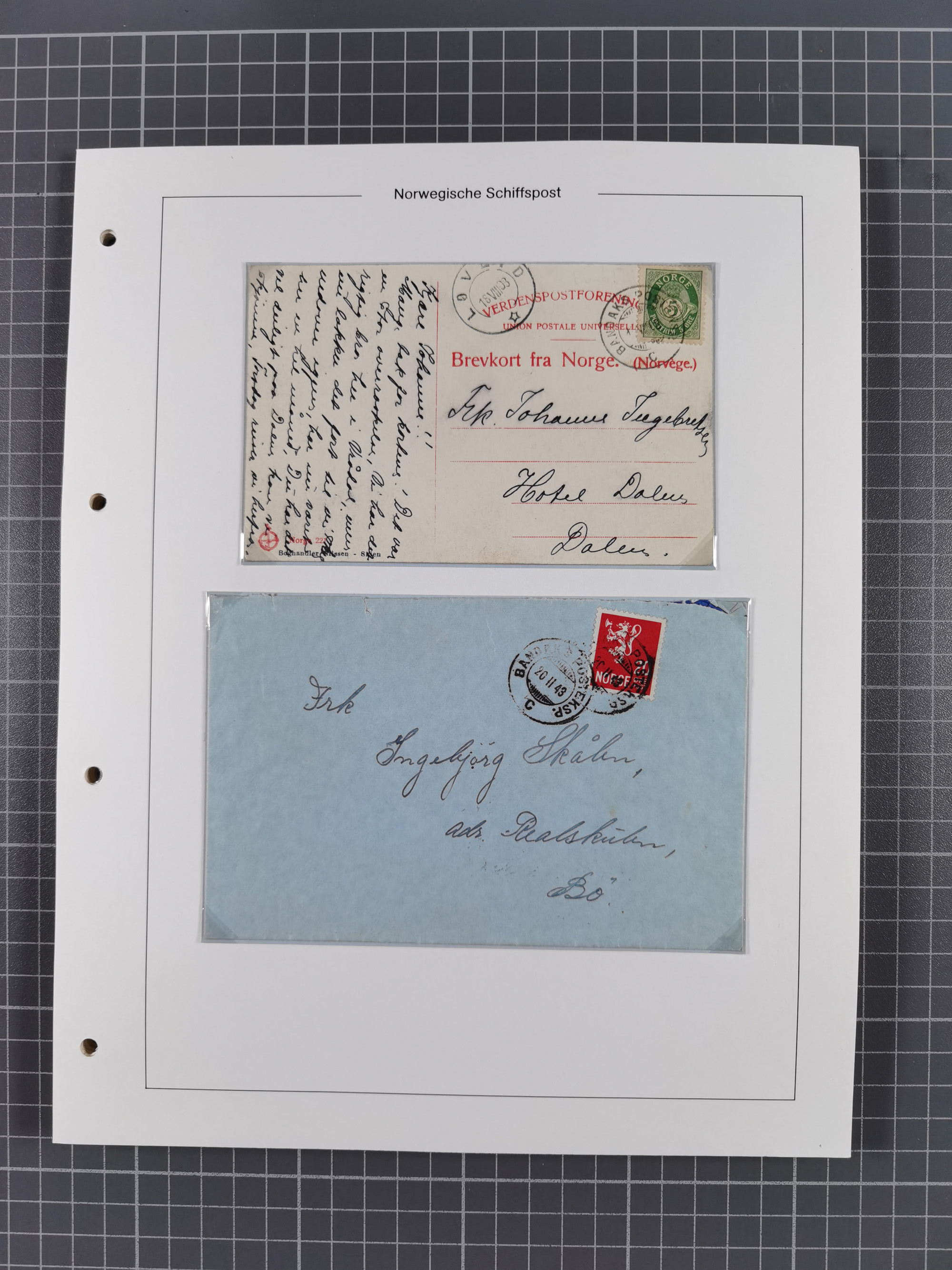 NORWEGEN: 1838/1980 (ca.), umfangreiche Sammlung “Norwegische Schiffspost” mit ca. fast 700 Briefen, Karten und GSK bis ca. 1960 inkl. Incoming Mail und etlichen nicht eingearbeiteten Belegen. Dabei frühe Post mit u.a. kpl. Faltbrief 1838 von Christiania mit ovalem Stempel “ALTONA SCHIFFSBRIEF” nach Schottland, kpl. Faltbrief 1863 mit handschriftlichem Aufgabevermerk “Foldin”, kpl. Faltbrief 1861 mit handschriftlichem Aufgabevermerk “Bjprn Farmand”, blauer EKr. “HALDEN 6.10.1854” auf kpl. Faltbrief und Briefhülle mit schwarzem EKr. “HAKON JARL 29.5.1861”. Danach u.a. zwei Briefe 1861/63 mit EKr. “NORDLAND”, Transitstempel “Norwegen direct” rückseitig auf Faltbrief mit zweimal 8 Sk. mit EKr. “STAVANGER 14.9.1864”, viele Nordlands Posteksp.-Stempel inkl. R-Briefen, Stempel “BÜREAU DE MER DE NORVEGE B 27.X.23” auf frankiertem R-Brief nach Schweden und 12 Briefe “NORSK SKIPSPOST HANDELSFLÄTEN” 1943/45 (6x mit Zensur). Dazu viele lose Marken und Briefstücke mit Schiffspost-Stempeln und zusätzlich viele Briefe nach 1960, alles auf Albenblättern mit Beschriftung in 24 Alben und ein mittlerer Karton mit nicht eingearbeitetem Material. Ein außergewöhnliches und empfehlenswertes Objekt