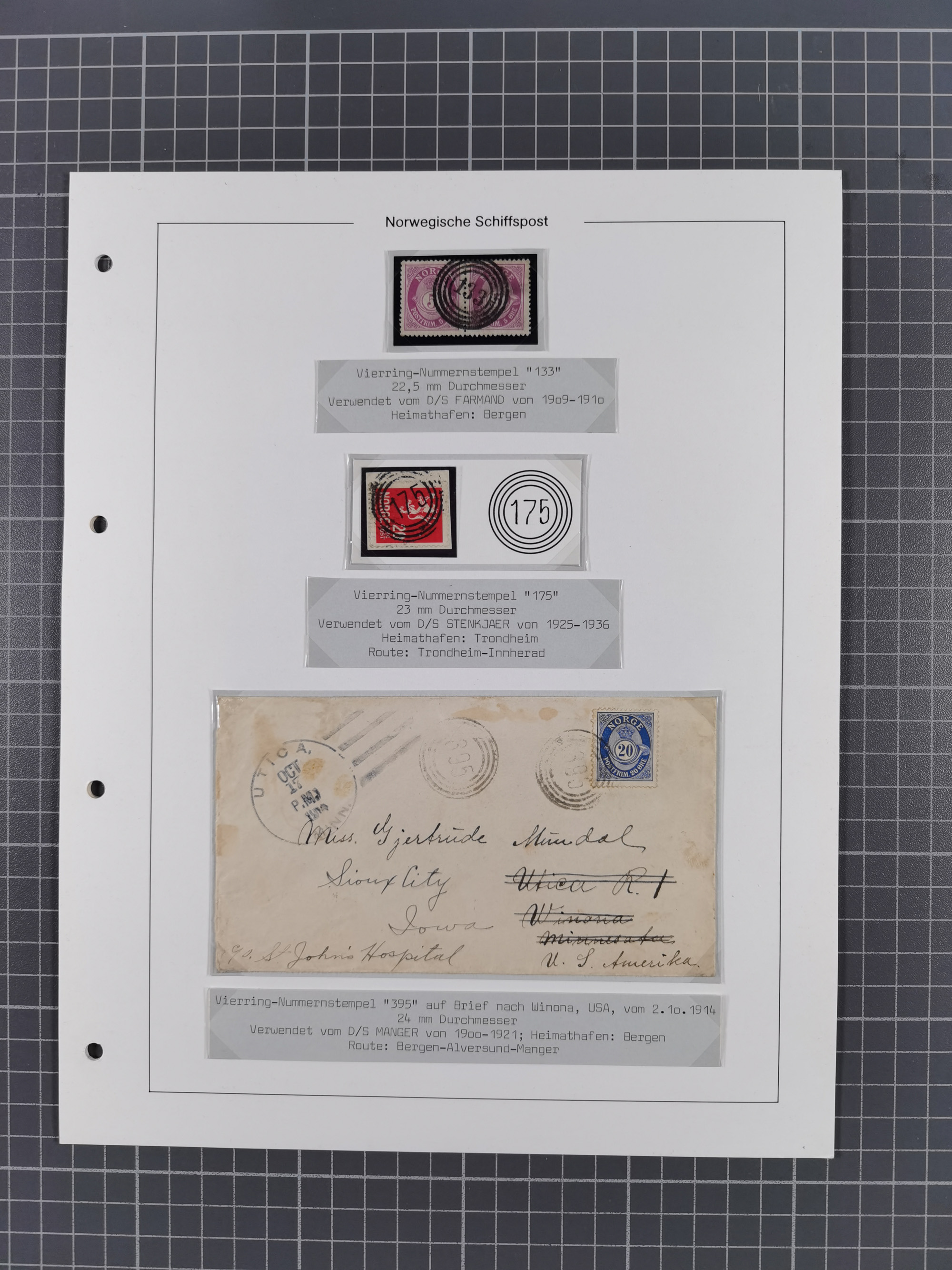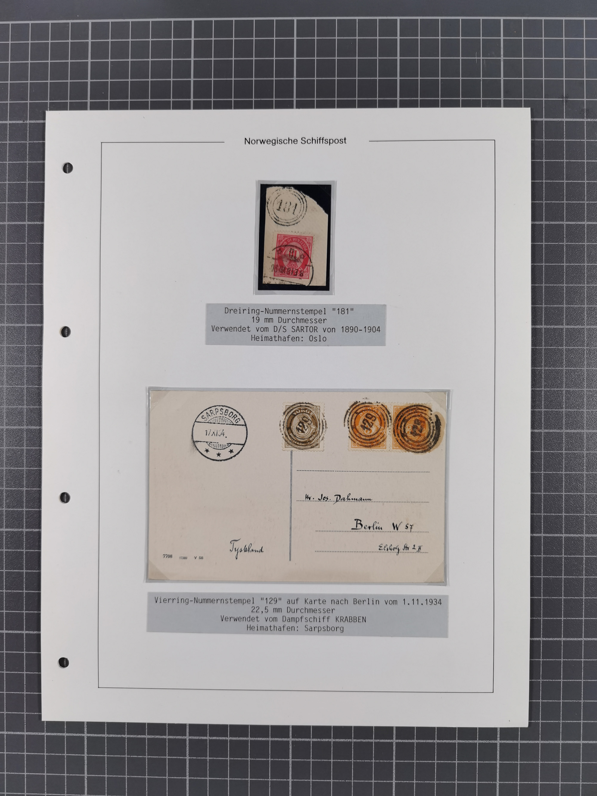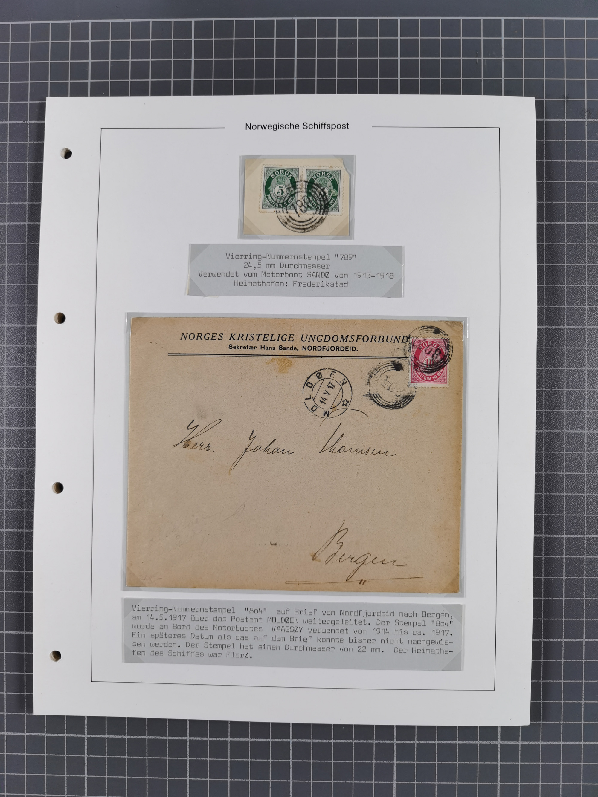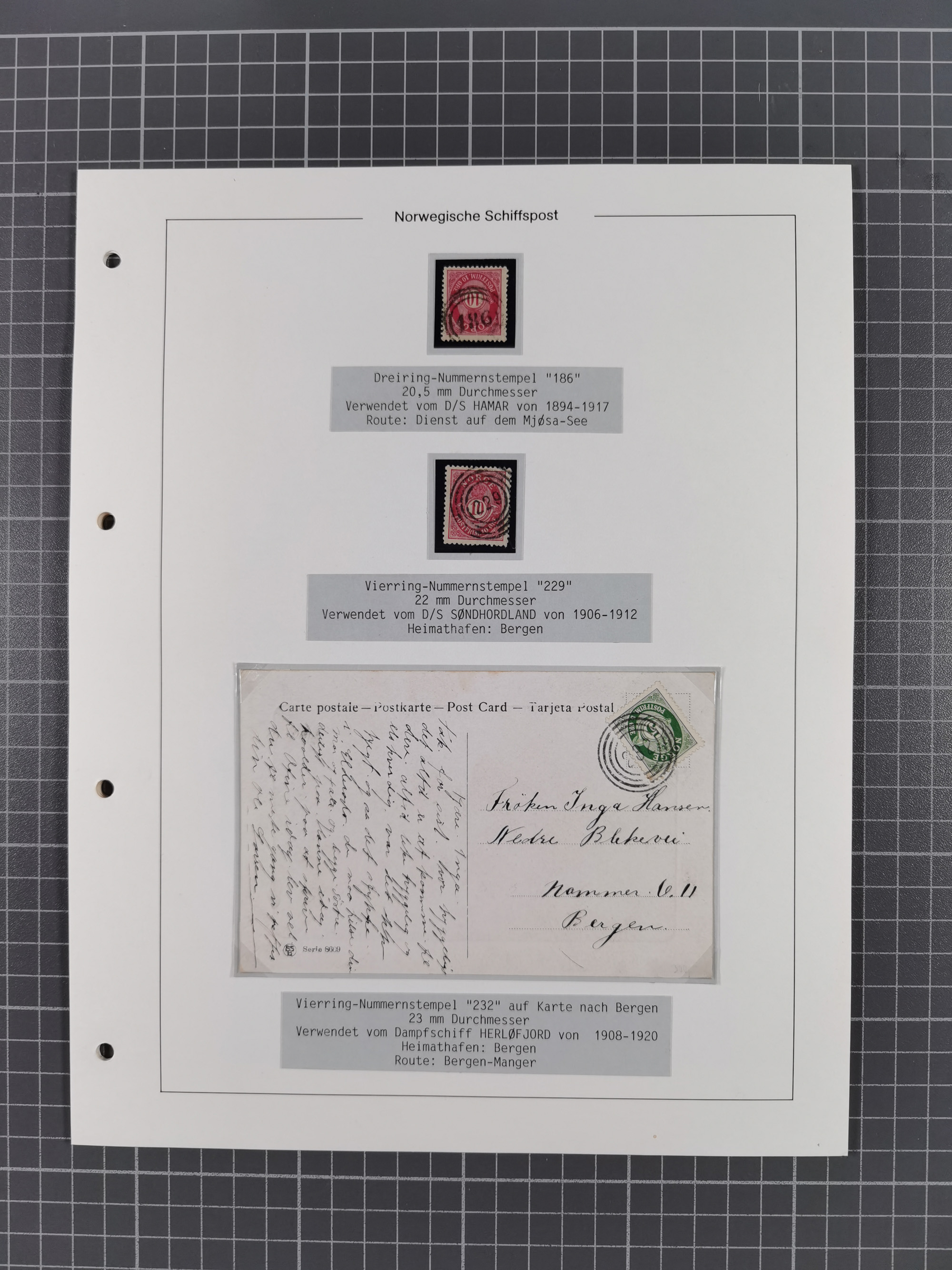 Norwegen: 1885/1934, Sammlung “Nummern-Stempel der Schiffspost ex 17/837” mit über 40 Briefen, Karten und GSK sowie einigen losenMarken dabei u.a. Brief 1885 mit violetter Nr. “31” als Entwerter, Ansichtskarte 1907 mit Nr. “229” als Entwerter, Faltbrief 1886 mit Nr. “249” als Entwerter und Ansichtskarte 1914 mit Nr. “525” als Entwerter, meist in guter Erhaltung, ex Steinmeyer