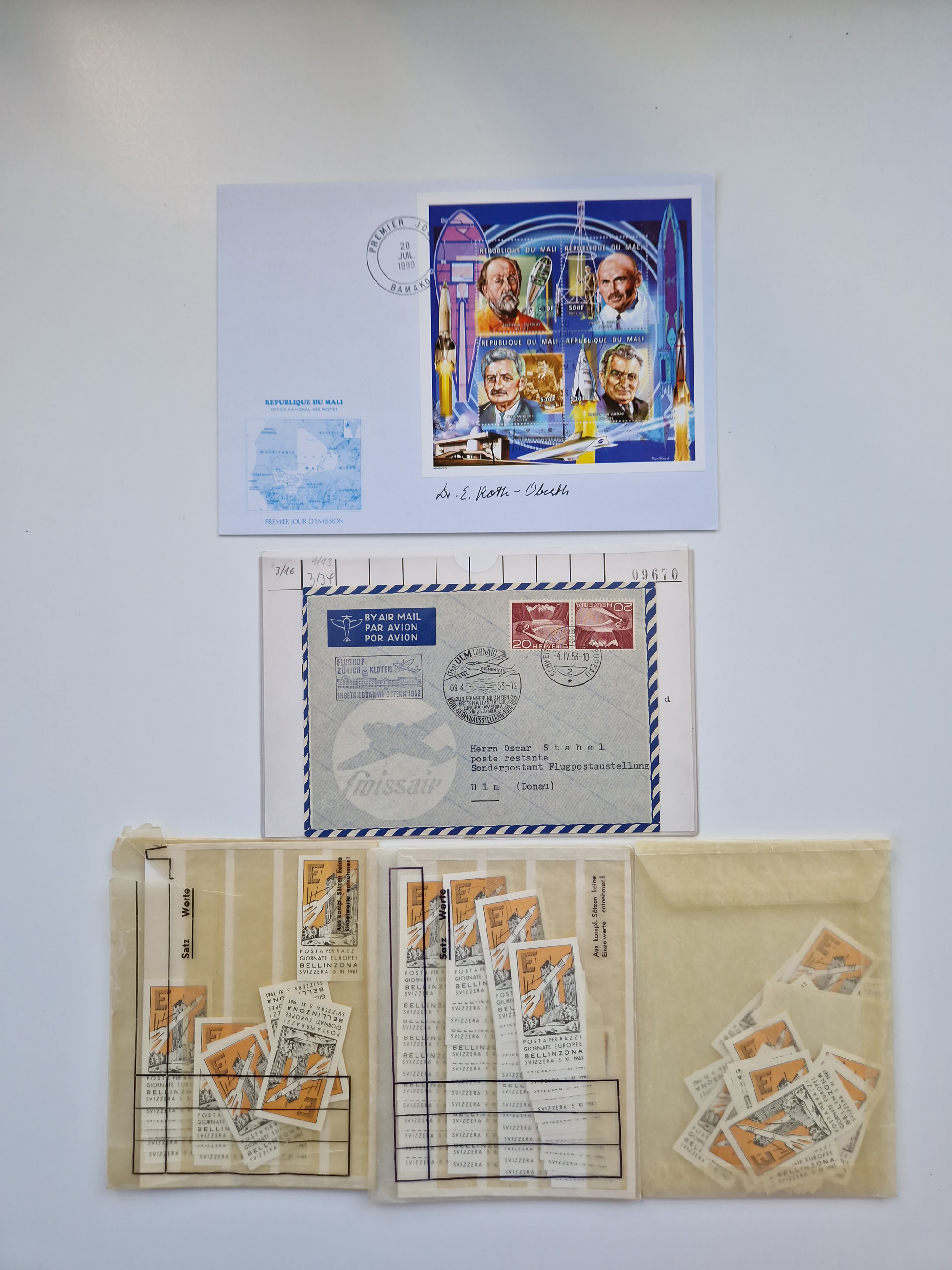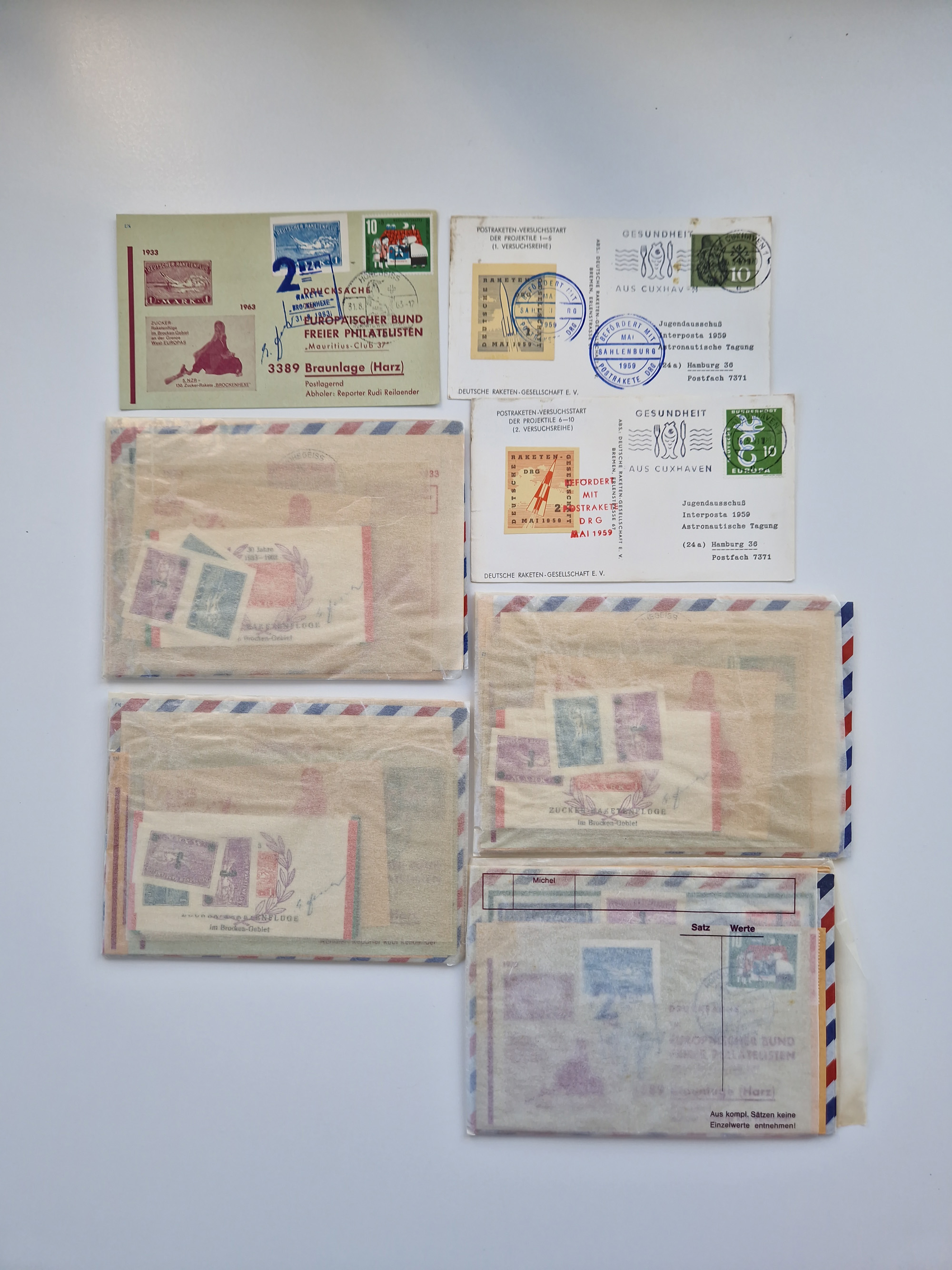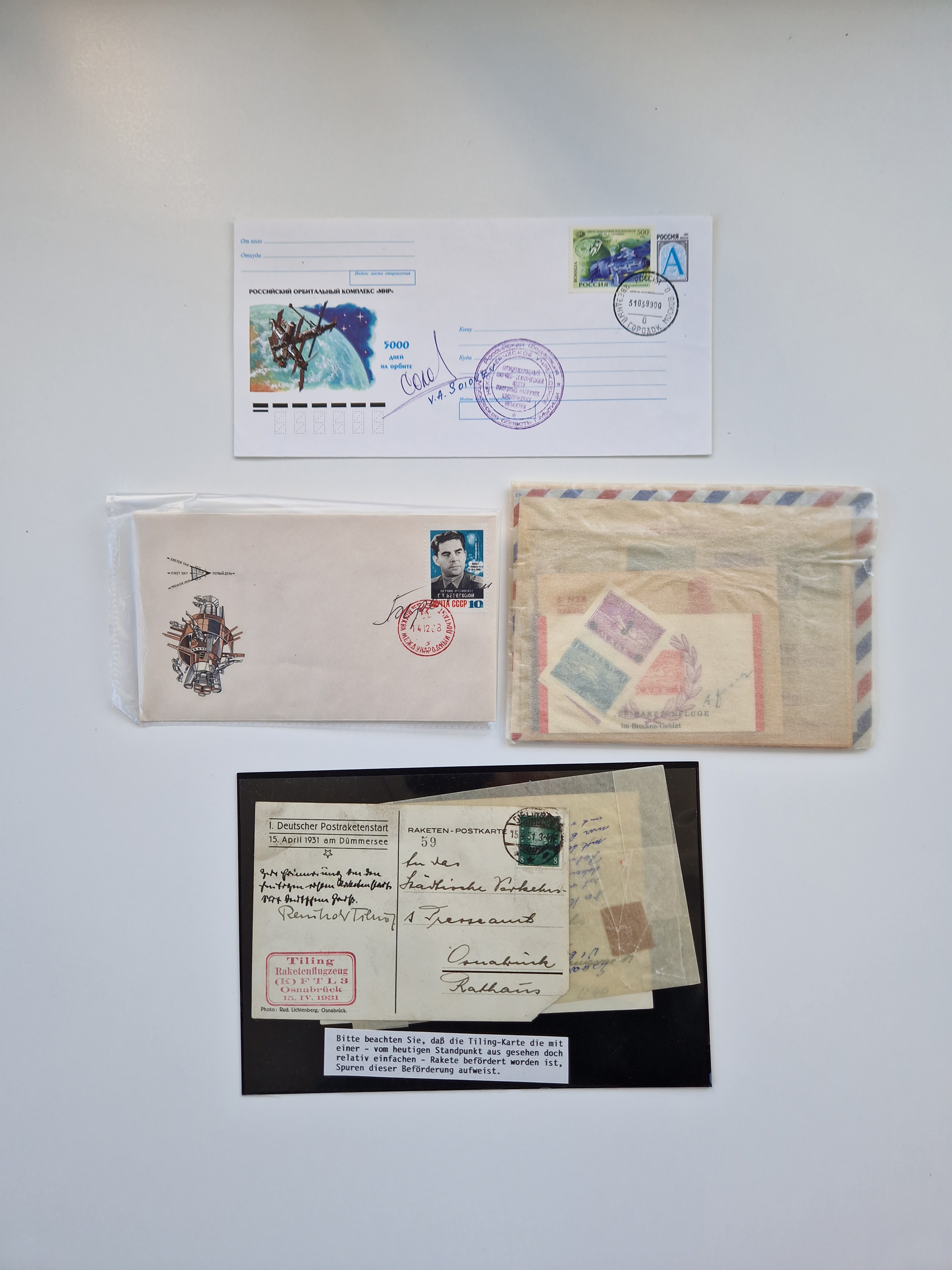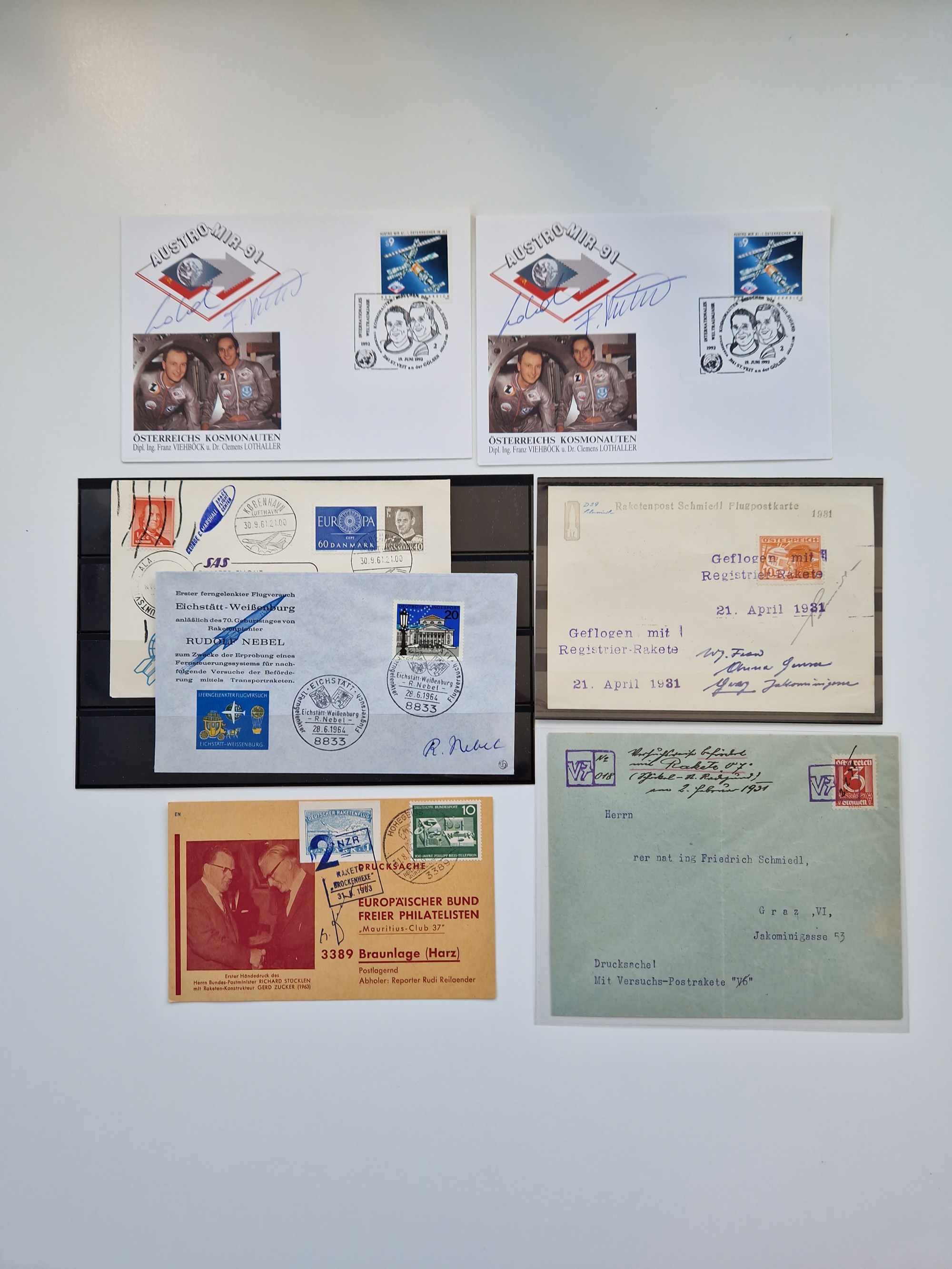 1931/2000 (ca.), interessanter Sammlungsbestand mit u.a. Postkarte “Tilling Raketenflugzeug” (Eckfehler), Österreich-Briefe mit Hopferwieser FS-08h, FS-10b und FS-28, Belege und Dokumente zu V1 und V2 mit u.a. “Heimatbriefe”-Vordruckfaltbrief 1943 an einen Oberleutnant bei der Heeresanstalt in Peenemünde, moderne Raketenpost-Sonderbelege und Weltraum-Post (zum Teil mit Original-Unterschriften