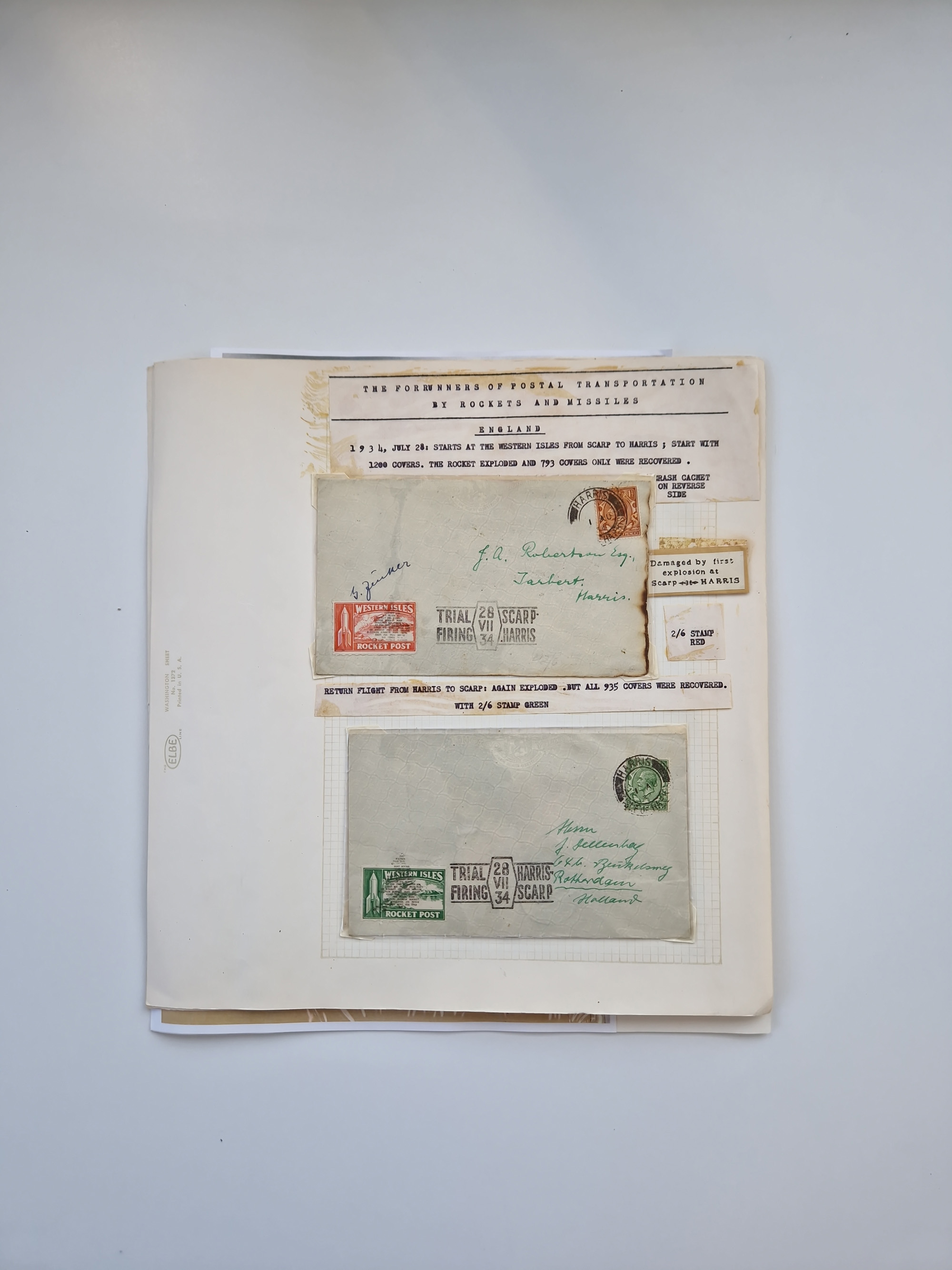 Indien: 1934, Rakete Nr. 1 vom 30.09., Brief mit grüner Vignette und Freimarke ½ A. mit Stempel “SAUGOR-ISLANDS 30.SEP.34” sowie rückseitiger e. Unterschrift von Stephen H. Smith, leicht fleckig