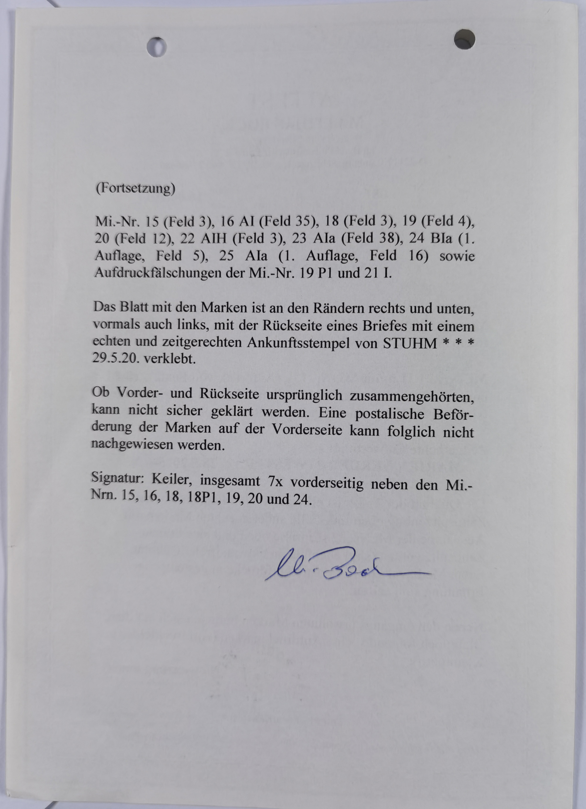 1920, Versuchsaufdrucke: 1 Mark karmin mit Mediävalaufdruck in rot, zusammen mit u.a. Germania 50 Pfennig, rotem Probeaufdruck auf 75 Pfg. sowie zwei falschen Werten mit Stempel "MARIENWERDER 28.5.20" auf Wertbriefvorderseite, montiert auf passende Rückseite, adressiert an Herrn Erich Hüttenhain in Stuhm, der Mediävalaufdruck mit einem fast unsichtbarem Zahnspitzenbug, in einwandfreier Erhaltung. Ein sehr seltenes, hochinteressantes und mehrfach in der Literatur erwähntes Ganzstück, sign. Keiler und ausführliches Fotoattest Bock BPP (2017)