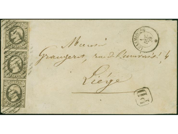 1852, William 10 c. grey-black, vertical strip of 3 with ample to mostly large margins, tied by circle of bars with adjacent "LUXEMBOURG 1 DEC. 59" to envelope to Liège, Belgium, with transit- and arrival marks. A very fine and scarce cover. Certificate Demuth BPP (1982)